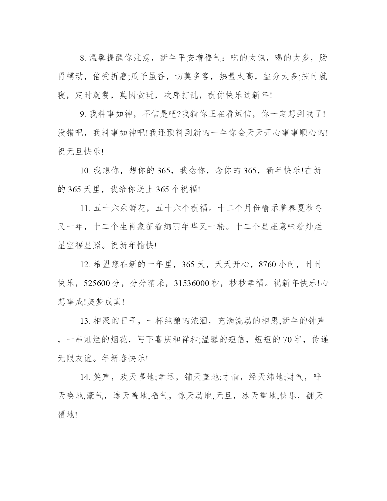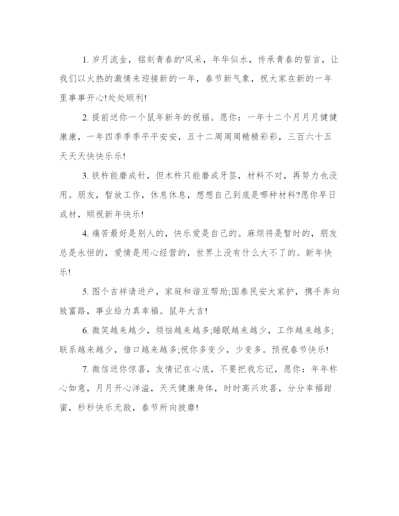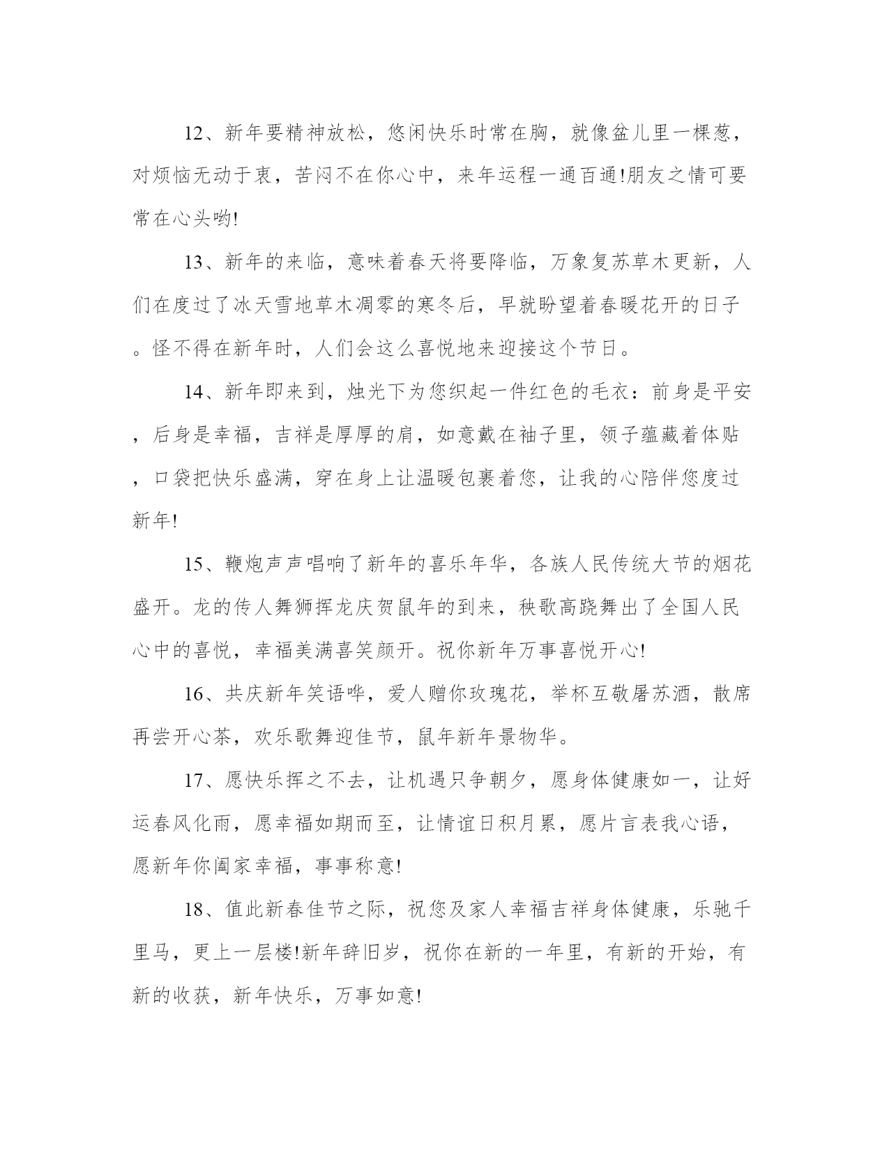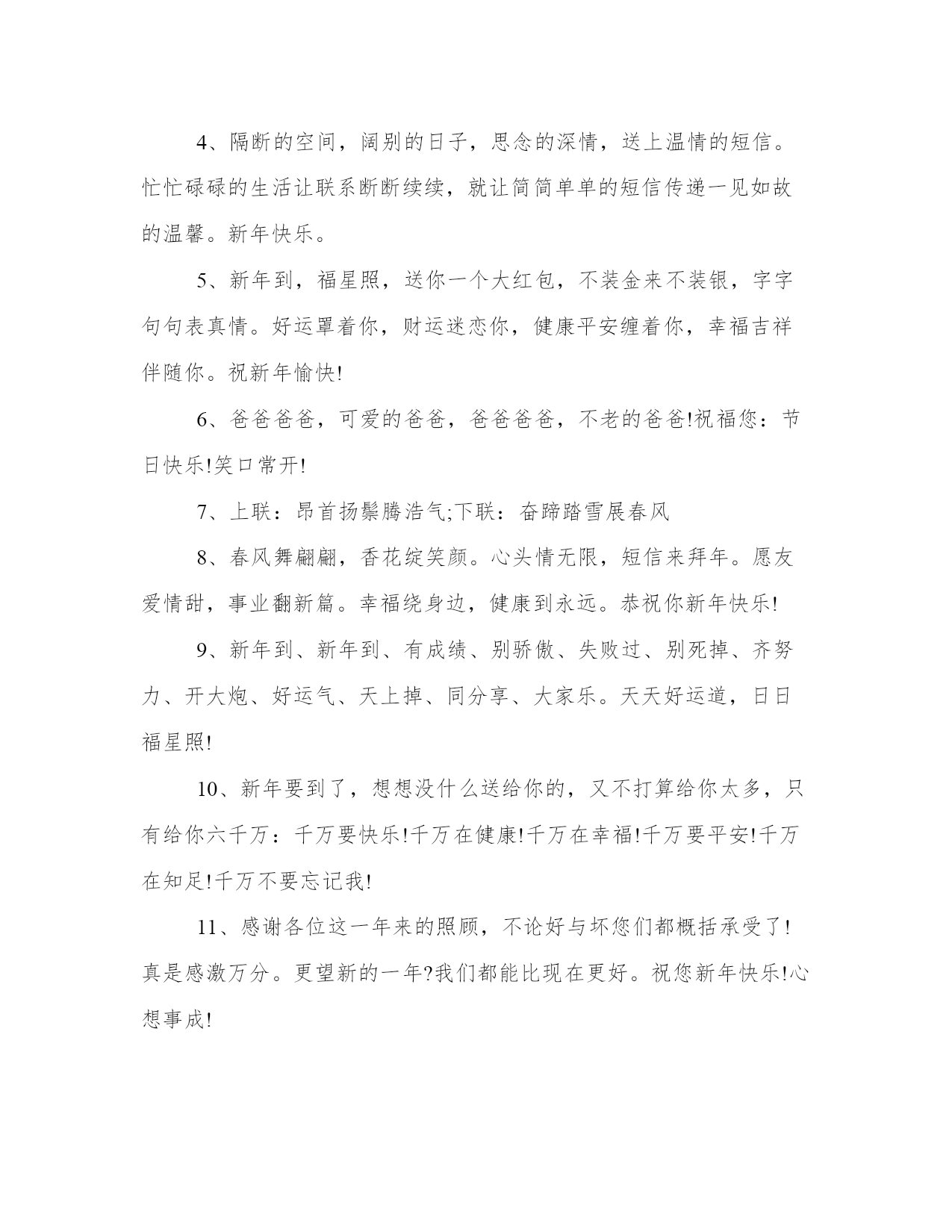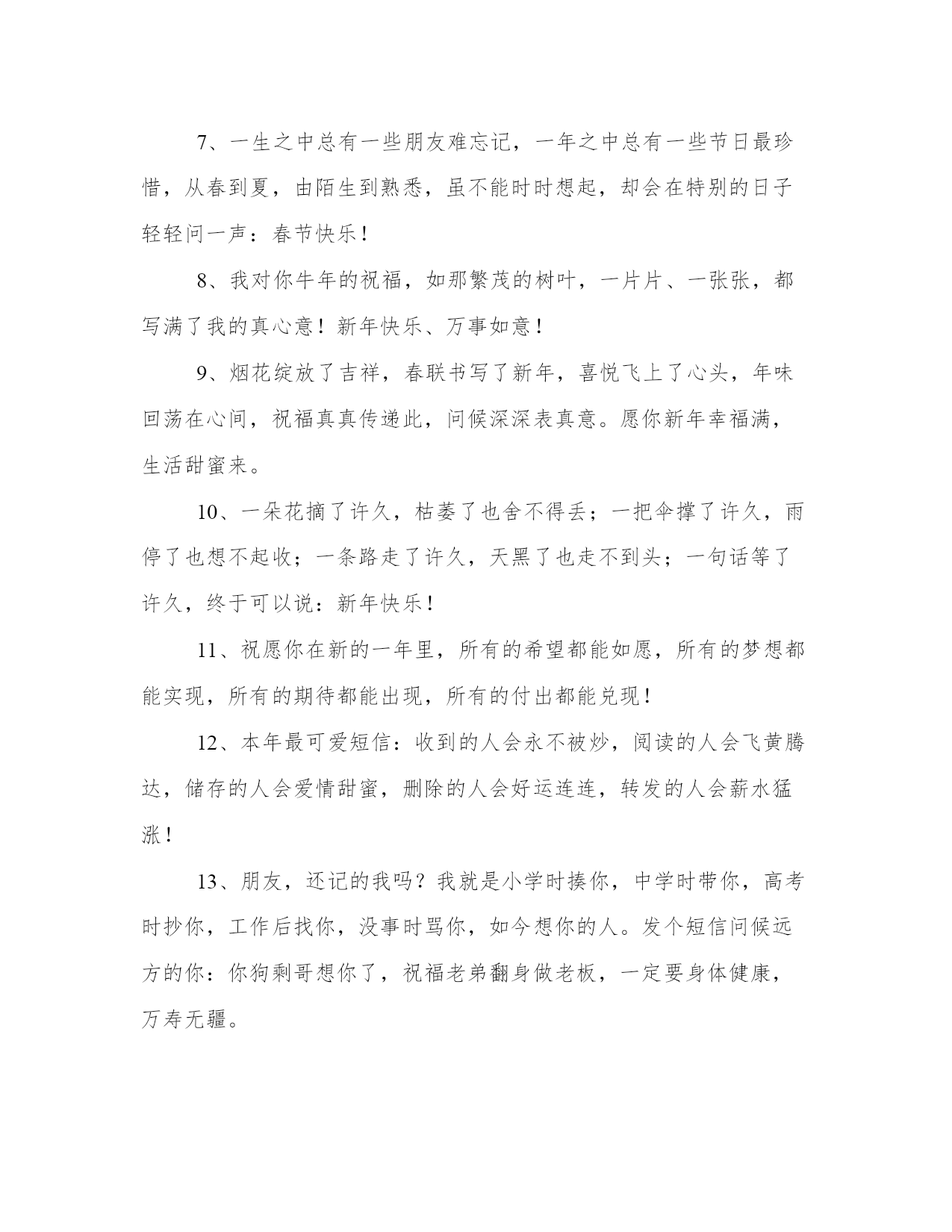 新年春节祝福词公务员(通用13篇)总结是一种不断学习和进步的过程,只有持之以恒才能取得持久的成效。在总结中适度展示个人感受和体验,使总结更具有个性化和独特性。这些总结范文凝练了大量的信息,可以帮助我们更好地理解总结的要点。新年春节祝福词公务员篇一1、我的祝福跨过重重高山,掠过条条小溪,跳过大马路,窜过小胡同,闪过卖冰糖葫芦的老太太,钻进你耳朵里,新年快乐!2、新年祝福无限,发财跨越20xx!恭喜发财,财源广进!3、今年过节不收礼,其实给点也可以。十块八块不嫌弃,十万八万过得去。你要真是没的送,短信一条也可以。新年快乐!4、堆积365天的想念,凝聚千丝万缕的柔情,拼却春夏秋冬的痴恋,采撷夜空的璀璨的星宿,淘尽碧千年的珠玑,只为传帝给你最精髓的祝愿,20xx春节快乐!5、新年快乐节了,重回童年的记忆。好怀念,你那性感的开裆裤,你那鼻涕当面膜的厚脸皮,你哭笑转换自如的演技,撒气泼来地上蹭个坑的耐力。愿你永葆童心!6、烟花的一瞬间是快乐;流星的一瞬是祈愿;思念的一瞬是感动。而我只想让你看到短信的一瞬能够明白:无论你天涯海角,都会深深祝福你春节快乐!7、一生之中总有一些朋友难忘记,一年之中总有一些节日最珍惜,从春到夏,由陌生到熟悉,虽不能时时想起,却会在特别的日子轻轻问一声:春节快乐!8、我对你牛年的祝福,如那繁茂的树叶,一片片、一张张,都写满了我的真心意!新年快乐、万事如意!9、烟花绽放了吉祥,春联书写了新年,喜悦飞上了心头,年味回荡在心间,祝福真真传递此,问候深深表真意。愿你新年幸福满,生活甜蜜来。10、一朵花摘了许久,枯萎了也舍不得丢;一把伞撑了许久,雨停了也想不起收;一条路走了许久,天黑了也走不到头;一句话等了许久,终于可以说:新年快乐!11、祝愿你在新的一年里,所有的希望都能如愿,所有的梦想都能实现,所有的期待都能出现,所有的付出都能兑现!12、本年最可爱短信:收到的人会永不被炒,阅读的人会飞黄腾达,储存的人会爱情甜蜜,删除的人会好运连连,转发的人会薪水猛涨!13、朋友,还记的我吗?我就是小学时揍你,中学时带你,高考时抄你,工作后找你,没事时骂你,如今想你的人。发个短信问候远方的你:你狗剩哥想你了,祝福老弟翻身做老板,一定要身体健康,万寿无疆。14、牛年告全国人民书:值此生活安康祖国强大之际,我挥一挥手,扬起满天祝福!15、新年的钟声已敲响,愿声声钟声能驱散晦气,赶走霉气,吓跑烦恼,振走愁云,带给你全新的生活,让快乐幸福入住,让健康平安相伴,朋友,新年快乐!16、层层往事在岁月沉淀,留下无尽回忆,亲情让我感到幸福无限。谢谢您给我生命,给我快乐,给了我又一个崭新的一年。17、无论我在哪里,我都希望离你只有一个转身的距离。在这个特别的日子里,让我的心陪你共同起舞。祝你新年快乐,平安健康!18、鞭炮声声迎新年,妙联横生贴门前。笑声处处传入耳,美味佳肴上餐桌。谈天论地成一片,灯光通明照残夜。稚童新衣相夸耀,旧去新来气象清。19、在春节来临之际,我送你五颗星:福星保你富贵荣耀,吉星保你大吉大利,财星保你财源滚滚,寿星保你与日月齐光,爱星保你得到的爱天长地久。20、新春好,好事全来了!朋友微微笑,喜气围你绕!欢庆节日里,生活美满又如意!喜气!喜气!一生平安如意!新年春节祝福词公务员篇二1.春节将至百花香,烟花爆竹飘四方,东方送你摇钱树,南方送你贵人扶,西方送你工作好,北方送你没烦恼,方方好运方方行;我短信送到你富贵门,祝你在新的一年里身体健康、工作顺利、家庭幸福、万事如意!2.20xx年注定是不平凡的一年。舞动蛇身唤民生;舞动蛇身唤春风;舞动蛇身唤彩虹;舞动蛇身唤乾坤!3.撕一缕阳光送给你;采一片朝霞送给你;捋一丝春风送给你;择一叶新绿送给你。我把新春的温暖送给你;我把新春的炫彩送给你;我把新春的明媚送给你;我把新春的祝福送给你。祝你新春快乐,生活幸福,万事顺意,猴年吉祥!4.它山之石,可以攻玉,它虫之蛇,可以祝福。白蛇重义,千年一回只为报恩;青蛇重情,千辛万苦只为姐妹;金蛇狂舞,万里迢迢只为足下。5.春节,是农历正月初一,又叫阴历年,俗称“过年”。这是我国民间最隆重、最热闹的一个传统节日。春节的历史很悠久,它起源于殷商时期年头岁尾的祭神祭祖活动。公历的一月一日称为元旦,把农历的一月一日叫春节。20xx年春节即将来临,一条春节祝福短信可以表达你的情意,你可以在这里找到一条满意的春节祝福短信。7.20xx年春节短信.朋友新年好啊!天增岁月人增寿,春满乾坤福满门!糖葫芦好吃,竹签儿穿,象征幸福和团圆!新年新气象,新年新希望,愿所有的新希望在新的一年实现。出自FanWEN.chAZIDiaN.COm8.猴年到了,想想没什么送给你的,又不打算给你太多,只有给你五千万:千万快乐!千万要
