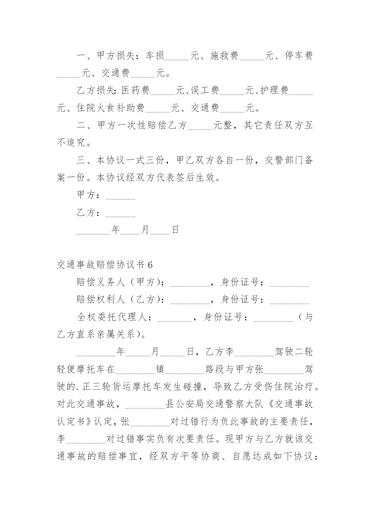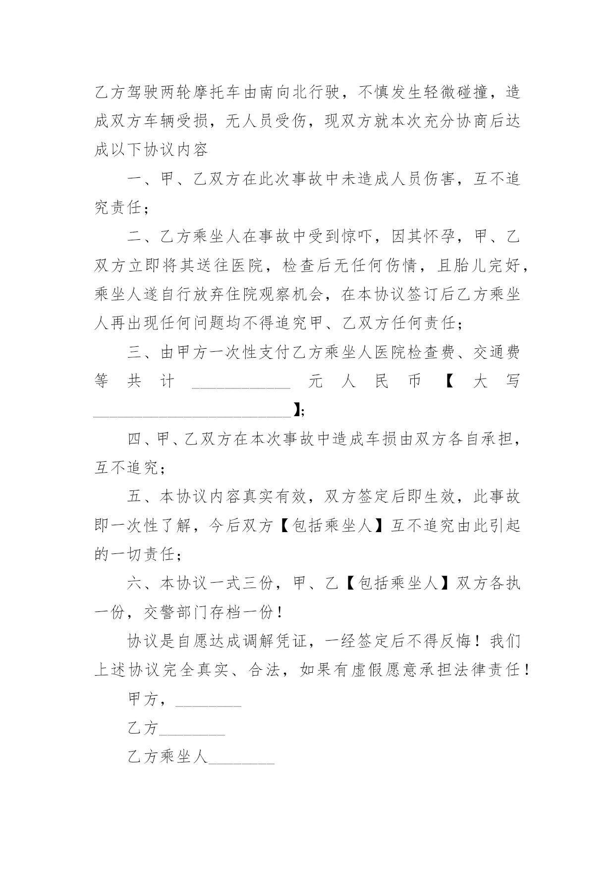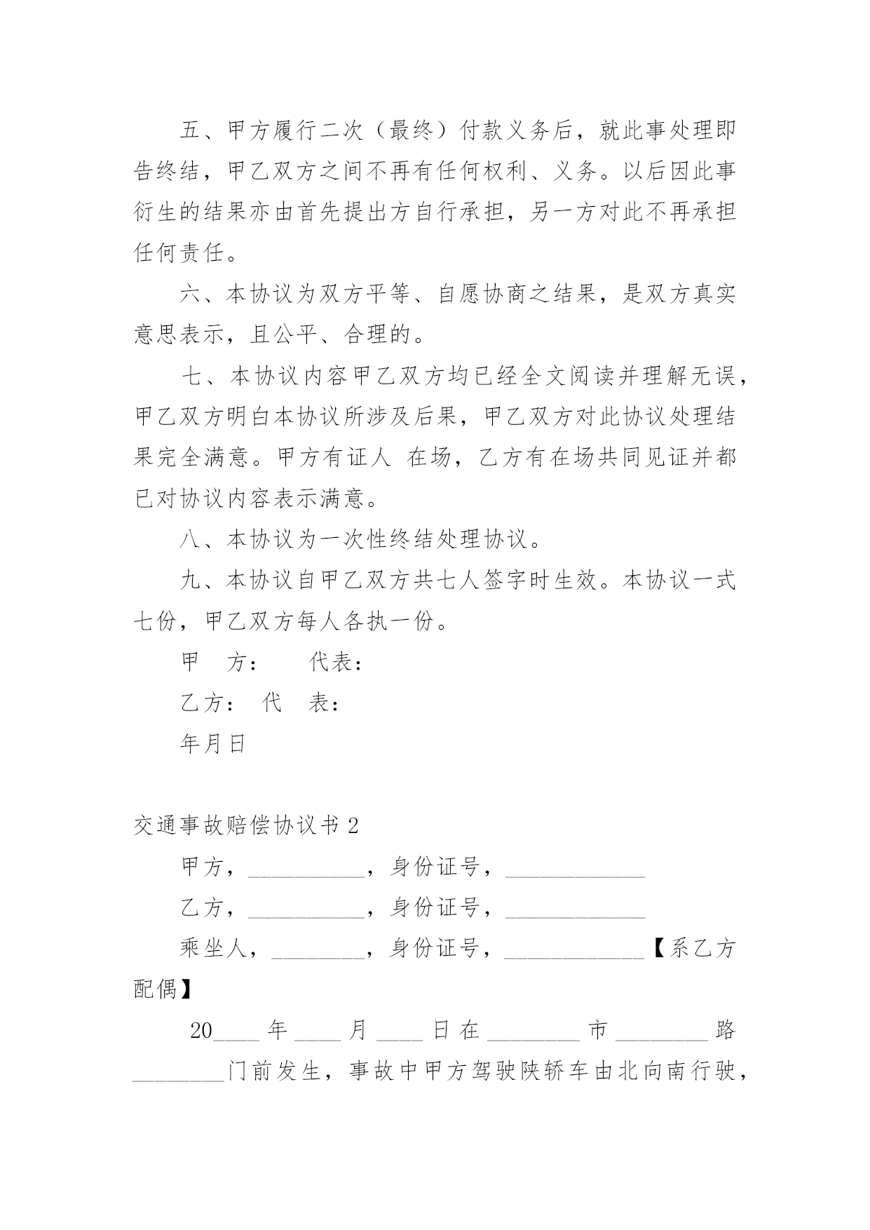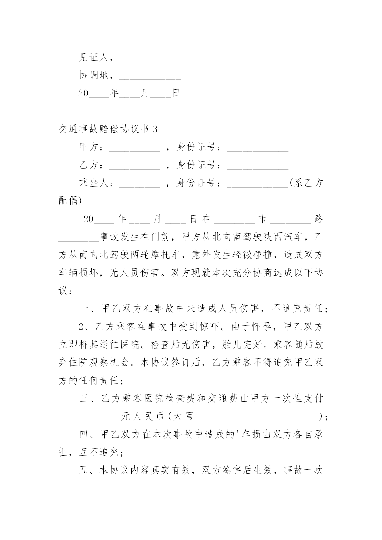 交通事故赔偿协议书[精品]交通事故赔偿协议书在学习、工作生活中,协议起到的作用越来越大,协议的签订是双方或数方之间权利义务的最好规范。那么什么样的协议才是有效的呢?以下是小编整理的交通事故赔偿协议书,欢迎阅读与收藏。交通事故赔偿协议书1甲方:姓名:性别:年龄:户籍所在地:现在住址:乙方:姓名:性别:年龄:户籍所在地:现在住址:事件概括:年月日时分,驾驶车(牌照号)由行至公路公里处处时,与前面正常行驶的车(牌照号)相撞,造成当场死亡。现(甲方)与(乙方)就死亡赔偿事宜,本着平等、自愿、公平原则,经友好协商,达成如下协议:一、甲方一次性支付给乙方死亡赔偿金、丧葬费、交通费、误工费等共计人民币万元,大写万元)。二、甲方将上述万元于本协议签订后当日付给乙方万元,剩余的万元于年月日前一次性付给乙方。三、上述费用支付给乙方后,由乙方二人内部自行分配、处理,其分配、处理的.方式、后果与甲方无关。四、甲方履行付款义务后,乙方任何一人就此事保证不以任何形式、任何理由就死亡一事向甲方要求其他任何费用。五、甲方履行二次(最终)付款义务后,就此事处理即告终结,甲乙双方之间不再有任何权利、义务。以后因此事衍生的结果亦由首先提出方自行承担,另一方对此不再承担任何责任。六、本协议为双方平等、自愿协商之结果,是双方真实意思表示,且公平、合理的。七、本协议内容甲乙双方均已经全文阅读并理解无误,甲乙双方明白本协议所涉及后果,甲乙双方对此协议处理结果完全满意。甲方有证人在场,乙方有在场共同见证并都已对协议内容表示满意。八、本协议为一次性终结处理协议。九、本协议自甲乙双方共七人签字时生效。本协议一式七份,甲乙双方每人各执一份。甲方:代表:乙方:代表:年月日交通事故赔偿协议书2甲方,__________,身份证号,____________乙方,__________,身份证号,____________乘坐人,________,身份证号,____________【系乙方配偶】20____年____月____日在________市________路________门前发生,事故中甲方驾驶陕轿车由北向南行驶,乙方驾驶两轮摩托车由南向北行驶,不慎发生轻微碰撞,造成双方车辆受损,无人员受伤,现双方就本次充分协商后达成以下协议内容一、甲、乙双方在此次事故中未造成人员伤害,互不追究责任;二、乙方乘坐人在事故中受到惊吓,因其怀孕,甲、乙双方立即将其送往医院,检查后无任何伤情,且胎儿完好,乘坐人遂自行放弃住院观察机会,在本协议签订后乙方乘坐人再出现任何问题均不得追究甲、乙双方任何责任;三、由甲方一次性支付乙方乘坐人医院检查费、交通费等共计____________元人民币【大写________________________】;四、甲、乙双方在本次事故中造成车损由双方各自承担,互不追究;五、本协议内容真实有效,双方签定后即生效,此事故即一次性了解,今后双方【包括乘坐人】互不追究由此引起的一切责任;六、本协议一式三份,甲、乙【包括乘坐人】双方各执一份,交警部门存档一份!协议是自愿达成调解凭证,一经签定后不得反悔!我们上述协议完全真实、合法,如果有虚假愿意承担法律责任!甲方,________乙方________乙方乘坐人________见证人,________协调地,____________20____年____月____日交通事故赔偿协议书3甲方:__________,身份证号:____________乙方:__________,身份证号:____________乘坐人:________,身份证号:____________(系乙方配偶)20____年____月____日在________市________路________事故发生在门前,甲方从北向南驾驶陕西汽车,乙方从南向北驾驶两轮摩托车,意外发生轻微碰撞,造成双方车辆损坏,无人员伤害。双方现就本次充分协商达成以下协议:一、甲乙双方在事故中未造成人员伤害,不追究责任;2、乙方乘客在事故中受到惊吓。由于怀孕,甲乙双方立即将其送往医院。检查后无伤害,胎儿完好。乘客随后放弃住院观察机会。本协议签订后,乙方乘客不得追究甲乙双方的任何责任;三、乙方乘客医院检查费和交通费由甲方一次性支付____________元人民币(大写________________________);四、甲乙双方在本次事故中造成的'车损由双方各自承担,互不追究;五、本协议内容真实有效,双方签字后生效,事故一次性了解。(包括乘坐人)不追究由此产生的一切责任;六、本协议一式三份,甲、乙(包括乘坐人)双方各执一份,交警部门存档一份。协议自愿达成调解凭证,签字后不得后悔。上述协议完全真实合法,有虚假意愿承担法律责任的。甲方:________乙方:________乙方乘客:_____