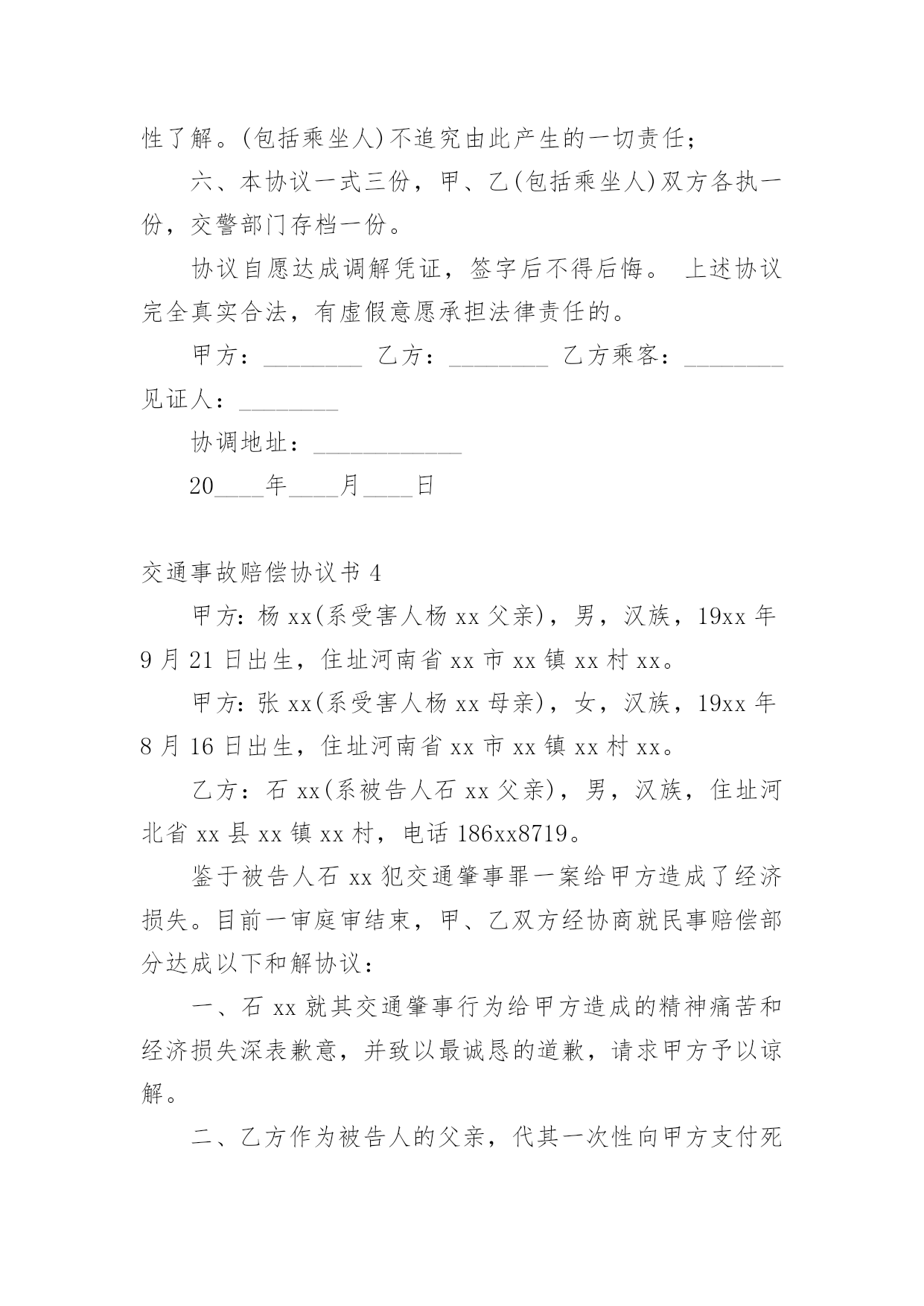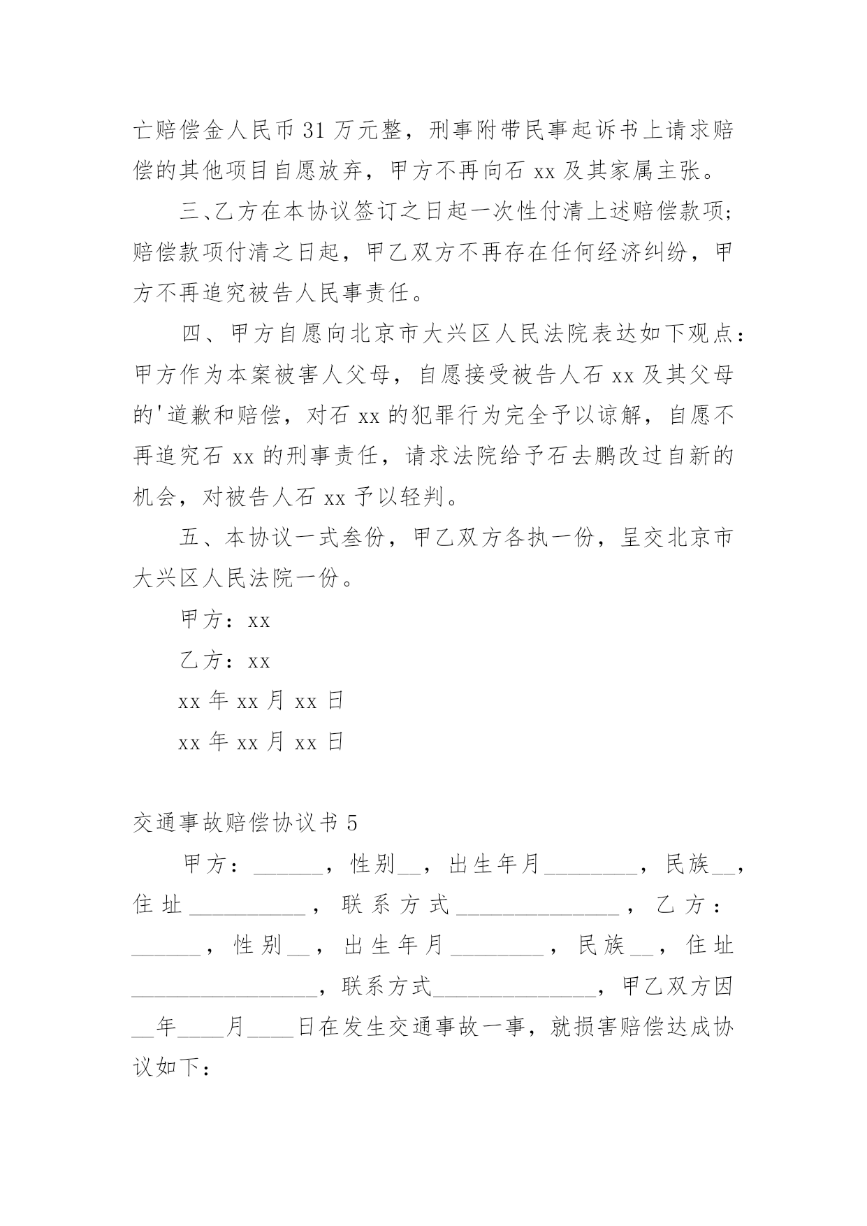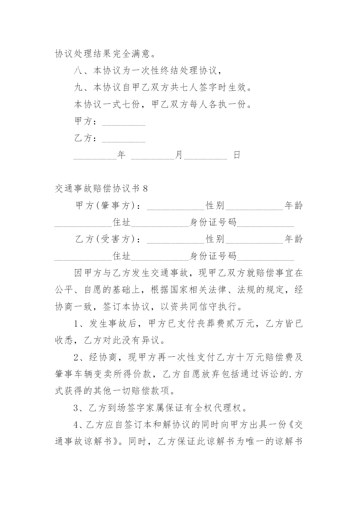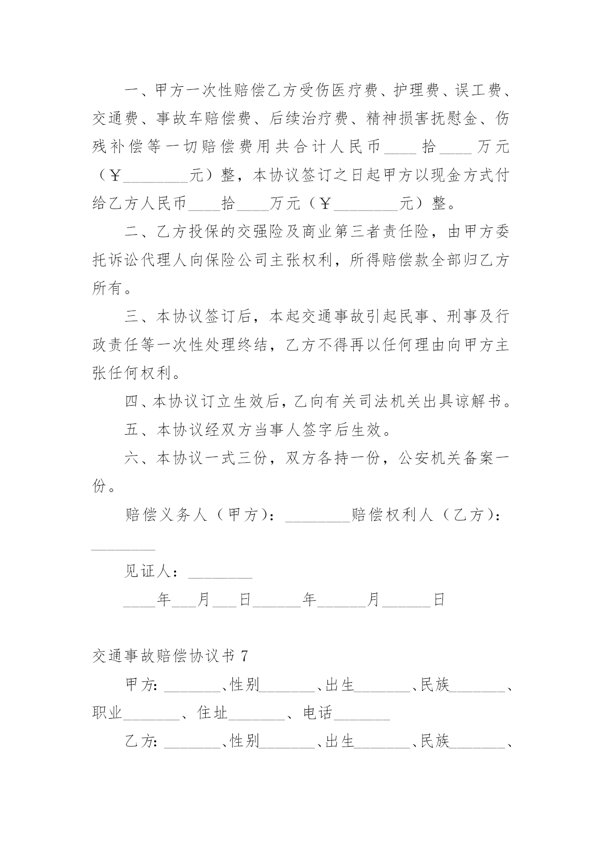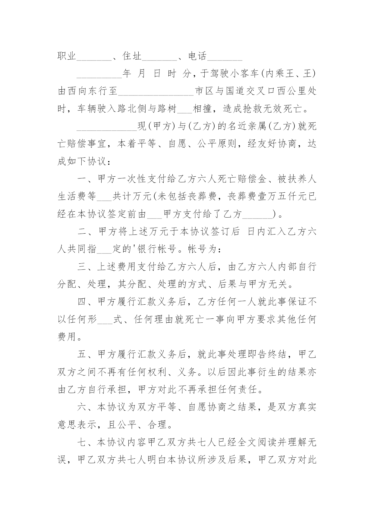 交通事故赔偿协议书[精品]交通事故赔偿协议书在学习、工作生活中,协议起到的作用越来越大,协议的签订是双方或数方之间权利义务的最好规范。那么什么样的协议才是有效的呢?以下是小编整理的交通事故赔偿协议书,欢迎阅读与收藏。交通事故赔偿协议书1甲方:姓名:性别:年龄:户籍所在地:现在住址:乙方:姓名:性别:年龄:户籍所在地:现在住址:事件概括:年月日时分,驾驶车(牌照号)由行至公路公里处处时,与前面正常行驶的车(牌照号)相撞,造成当场死亡。现(甲方)与(乙方)就死亡赔偿事宜,本着平等、自愿、公平原则,经友好协商,达成如下协议:一、甲方一次性支付给乙方死亡赔偿金、丧葬费、交通费、误工费等共计人民币万元,大写万元)。二、甲方将上述万元于本协议签订后当日付给乙方万元,剩余的万元于年月日前一次性付给乙方。三、上述费用支付给乙方后,由乙方二人内部自行分配、处理,其分配、处理的.方式、后果与甲方无关。四、甲方履行付款义务后,乙方任何一人就此事保证不以任何形式、任何理由就死亡一事向甲方要求其他任何费用。五、甲方履行二次(最终)付款义务后,就此事处理即告终结,甲乙双方之间不再有任何权利、义务。以后因此事衍生的结果亦由首先提出方自行承担,另一方对此不再承担任何责任。六、本协议为双方平等、自愿协商之结果,是双方真实意思表示,且公平、合理的。七、本协议内容甲乙双方均已经全文阅读并理解无误,甲乙双方明白本协议所涉及后果,甲乙双方对此协议处理结果完全满意。甲方有证人在场,乙方有在场共同见证并都已对协议内容表示满意。八、本协议为一次性终结处理协议。九、本协议自甲乙双方共七人签字时生效。本协议一式七份,甲乙双方每人各执一份。甲方:代表:乙方:代表:年月日交通事故赔偿协议书2甲方,__________,身份证号,____________乙方,__________,身份证号,____________乘坐人,________,身份证号,____________【系乙方配偶】20____年____月____日在________市________路________门前发生,事故中甲方驾驶陕轿车由北向南行驶,乙方驾驶两轮摩托车由南向北行驶,不慎发生轻微碰撞,造成双方车辆受损,无人员受伤,现双方就本次充分协商后达成以下协议内容一、甲、乙双方在此次事故中未造成人员伤害,互不追究责任;二、乙方乘坐人在事故中受到惊吓,因其怀孕,甲、乙双方立即将其送往医院,检查后无任何伤情,且胎儿完好,乘坐人遂自行放弃住院观察机会,在本协议签订后乙方乘坐人再出现任何问题均不得追究甲、乙双方任何责任;三、由甲方一次性支付乙方乘坐人医院检查费、交通费等共计____________元人民币【大写________________________】;四、甲、乙双方在本次事故中造成车损由双方各自承担,互不追究;五、本协议内容真实有效,双方签定后即生效,此事故即一次性了解,今后双方【包括乘坐人】互不追究由此引起的一切责任;六、本协议一式三份,甲、乙【包括乘坐人】双方各执一份,交警部门存档一份!协议是自愿达成调解凭证,一经签定后不得反悔!我们上述协议完全真实、合法,如果有虚假愿意承担法律责任!甲方,________乙方________乙方乘坐人________见证人,________协调地,____________20____年____月____日交通事故赔偿协议书3甲方:__________,身份证号:____________乙方:__________,身份证号:____________乘坐人:________,身份证号:____________(系乙方配偶)20____年____月____日在________市________路________事故发生在门前,甲方从北向南驾驶陕西汽车,乙方从南向北驾驶两轮摩托车,意外发生轻微碰撞,造成双方车辆损坏,无人员伤害。双方现就本次充分协商达成以下协议:一、甲乙双方在事故中未造成人员伤害,不追究责任;2、乙方乘客在事故中受到惊吓。由于怀孕,甲乙双方立即将其送往医院。检查后无伤害,胎儿完好。乘客随后放弃住院观察机会。本协议签订后,乙方乘客不得追究甲乙双方的任何责任;三、乙方乘客医院检查费和交通费由甲方一次性支付____________元人民币(大写________________________);四、甲乙双方在本次事故中造成的'车损由双方各自承担,互不追究;五、本协议内容真实有效,双方签字后生效,事故一次性了解。(包括乘坐人)不追究由此产生的一切责任;六、本协议一式三份,甲、乙(包括乘坐人)双方各执一份,交警部门存档一份。协议自愿达成调解凭证,签字后不得后悔。上述协议完全真实合法,有虚假意愿承担法律责任的。甲方:________乙方:________乙方乘客:_____