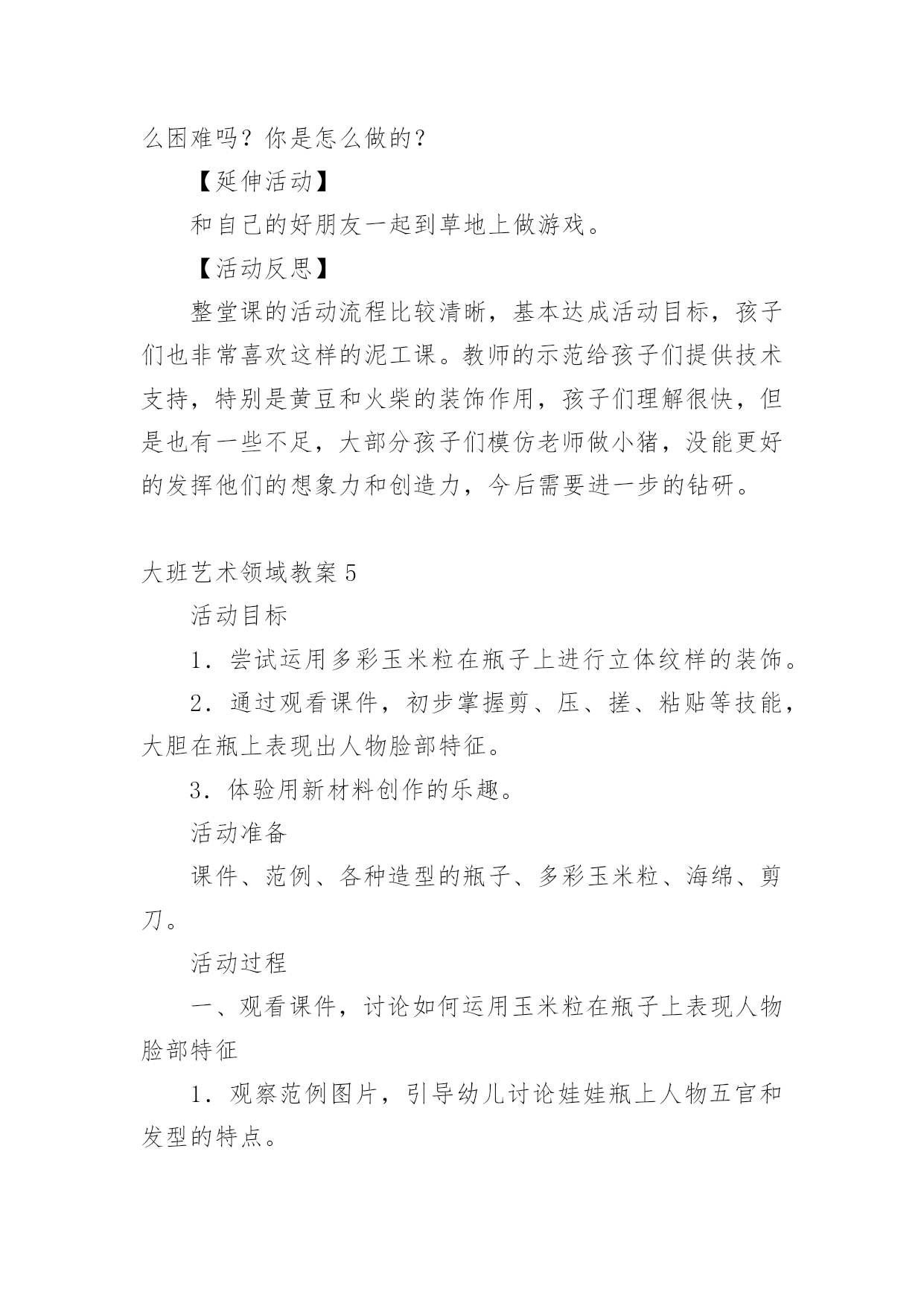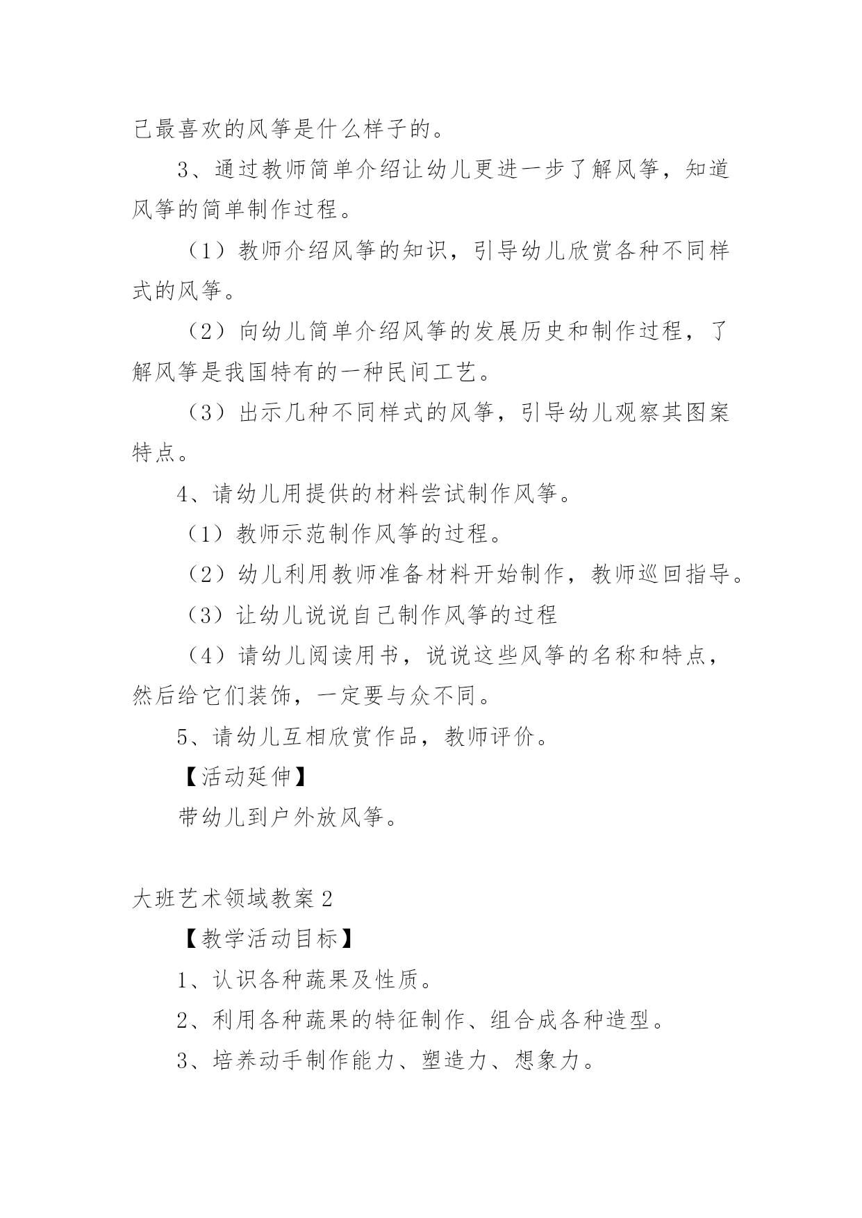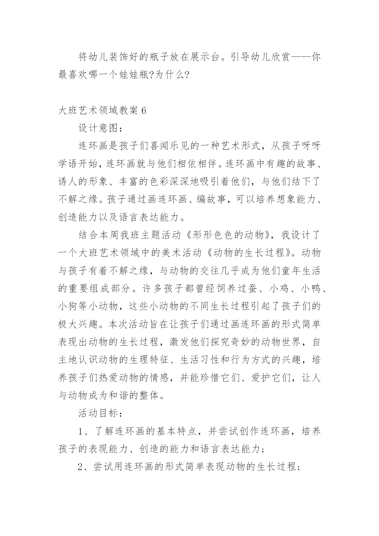 大班艺术领域教案作为一名优秀的教育工作者,有必要进行细致的教案准备工作,通过教案准备可以更好地根据具体情况对教学进程做适当的必要的调整。来参考自己需要的教案吧!以下是小编为大家整理的大班艺术领域教案,仅供参考,希望能够帮助到大家。大班艺术领域教案1【活动目标】1、了解风筝是我国特有的一种民间工艺。2、知道风筝的简单制作过程,尝试自己制作风筝并进行装饰。【活动准备】1、放风筝录像、图片、《春之声圆舞曲》背景音乐。2、绘画纸、卡纸、剪刀、胶水等。3、幼儿用书【活动过程】1、教师与谈话:你都见过什么样的风筝?让幼儿说一说2、请幼儿欣赏风筝图片,请幼儿说说这些风筝的特征。(1)引导幼儿观看潍坊风筝节漫天风筝的录像,并播放《春之声圆舞曲》背景音乐。(2)请幼儿互相交流看到了哪些不同样式的风筝,自己最喜欢的风筝是什么样子的。3、通过教师简单介绍让幼儿更进一步了解风筝,知道风筝的简单制作过程。(1)教师介绍风筝的知识,引导幼儿欣赏各种不同样式的风筝。(2)向幼儿简单介绍风筝的发展历史和制作过程,了解风筝是我国特有的一种民间工艺。(3)出示几种不同样式的风筝,引导幼儿观察其图案特点。4、请幼儿用提供的材料尝试制作风筝。(1)教师示范制作风筝的过程。(2)幼儿利用教师准备材料开始制作,教师巡回指导。(3)让幼儿说说自己制作风筝的过程(4)请幼儿阅读用书,说说这些风筝的名称和特点,然后给它们装饰,一定要与众不同。5、请幼儿互相欣赏作品,教师评价。【活动延伸】带幼儿到户外放风筝。大班艺术领域教案2【教学活动目标】1、认识各种蔬果及性质。2、利用各种蔬果的特征制作、组合成各种造型。3、培养动手制作能力、塑造力、想象力。【活动准备】1、各种蔬菜、水果、牙签、及时贴、剪刀。2、教师制作的各种蔬果造型。【活动过程】一、兴趣导入。教师:小朋友带来的水果真多,大家互相瞧一瞧,都有什么?教室:今天,我们就来和水果、蔬菜交朋友。二、观察各种蔬菜、水果。1、分组观察带来的蔬果。教师:说一说你喜欢什么蔬菜和水果?它是什么颜色,有什么味道?看谁说的生动形象,让人了解这种蔬果的鲜嫩、美丽、可爱以及它的营养价值所在。2、教师:蔬果除了可以食用外,还可以做什么?3、教师:我们平时吃的蔬果还可以做出很多可爱的造型,一起欣赏一下。三、制作蔬果造型。1、教师:小朋友,说一说你刚才都看到了什么?幼儿:香蕉做的小狗,萝卜做的茶壶,青豆做的蚂蚁,菜花做的绵羊......2、你想做什么?用什么材料来做?(幼儿自由探索、摆弄,创新不同的造型。)3、幼儿选材、自由创作。对个别幼儿在插接方面给予帮助。4、幼儿相互交流、自主创新。四、畅想未来的蔬果。未来的蔬果有不同形状的,颜色也是五颜六色的,一种蔬果可以有很多种口味。请幼儿发挥想象力,畅想未来的蔬果会是什么样子、什么口味的?(幼儿讲述、畅想。)五、展示、欣赏作品。幼儿相互欣赏、讲述自己的创作。大班艺术领域教案3活动目标:1、能够模仿并创造不同的花的造型。2、能够准确的按音乐的节奏舞蹈。3、喜欢韵律活动,能大胆的表现自对花朵的情感和体验。活动重难点:能够准确的按音乐的节奏舞蹈。活动准备:各种花朵造型图片、音乐活动过程:一、轻音乐入场。教师带领幼儿跟着轻音乐入场。二、出示花园的花,并学习花的各种姿态。师:有一个叫小意达的小姑娘,他有一个美丽的花园,花园里面有水仙花、玫瑰花等等,可是有一天小意达发现花园里的花都枯萎饿了,他非常伤心,妈妈看到后说你不用伤心,花们都很开心,因为在枯萎前他们举行了一场盛大的舞会,他们都摆出了自己最美的姿态,都跳了自己最美的舞蹈,他们要争夺舞王。我们一起来看小意达的花都有哪些呢?(播放音乐,教师将各种各样的花摆在中间)师:这些花都长得一样吗?有什么不一样?(姿态不一样)师:现在请小朋友一个挨着一个跳舞跳到你喜欢的花面前,学一学花的姿态。看谁学的最像。师:谁来学一学你刚选择的小花是什么姿态?师:现在我们要摆出跟刚才不一样的花朵的姿态,看谁摆的花最漂亮?(跟音乐摆花的姿态)三、与花共舞师:刚才我发现小朋友一直摆一个姿势有点累,现在有一个小伙伴给我们讲一个不累的办法,小黄花他也参加了舞会,他一直在舞动,所以就不累了。我们一起来学一学小黄花跳舞吧。师:小黄花都在哪些地方跳舞了呢?谁来学一学小黄花在空中跳舞是什么样的?在地下跳舞呢?师:我们和小黄花一起跳舞吧!(播放音乐)师:现在四个小朋友一组,变成一个大花。看哪一组大花的姿态和别的组不一样?(跟音乐跳舞)四、音乐停止,自然结束。大班艺术领域教案4【设计意图】对于孩子们来说,玩泥巴是他们最喜欢做的事情了。一团软软的泥,到了孩子手里,不一会儿就摆弄出各种各样的东西来,虽然有的还比较粗糙,但孩子们还是乐此不疲的玩着。对于大班的孩子来说,对周围的事物有了一定的了解和观察,也掌握了一些基本的