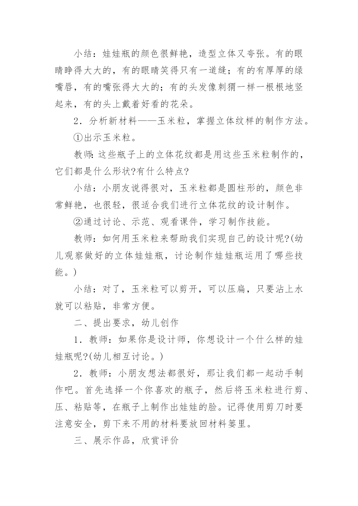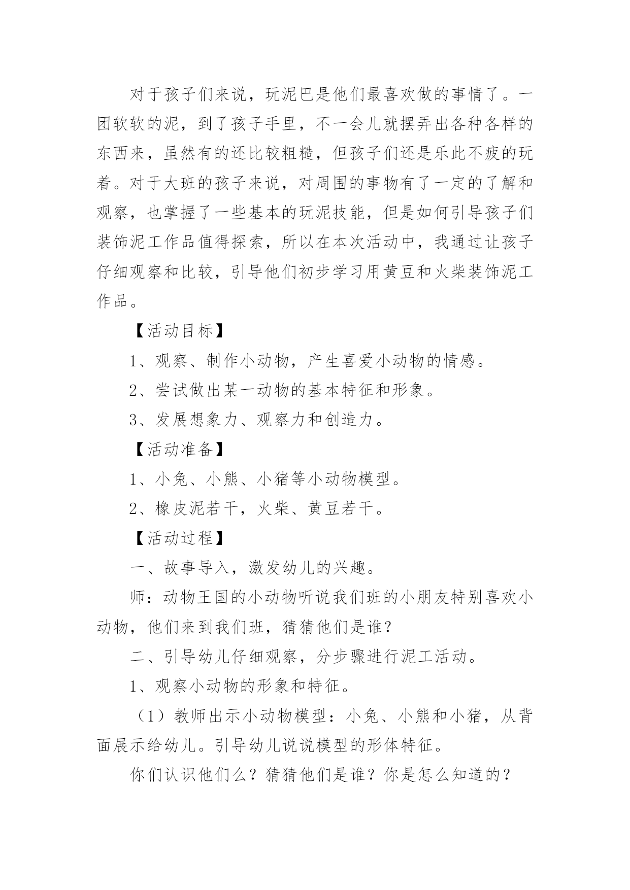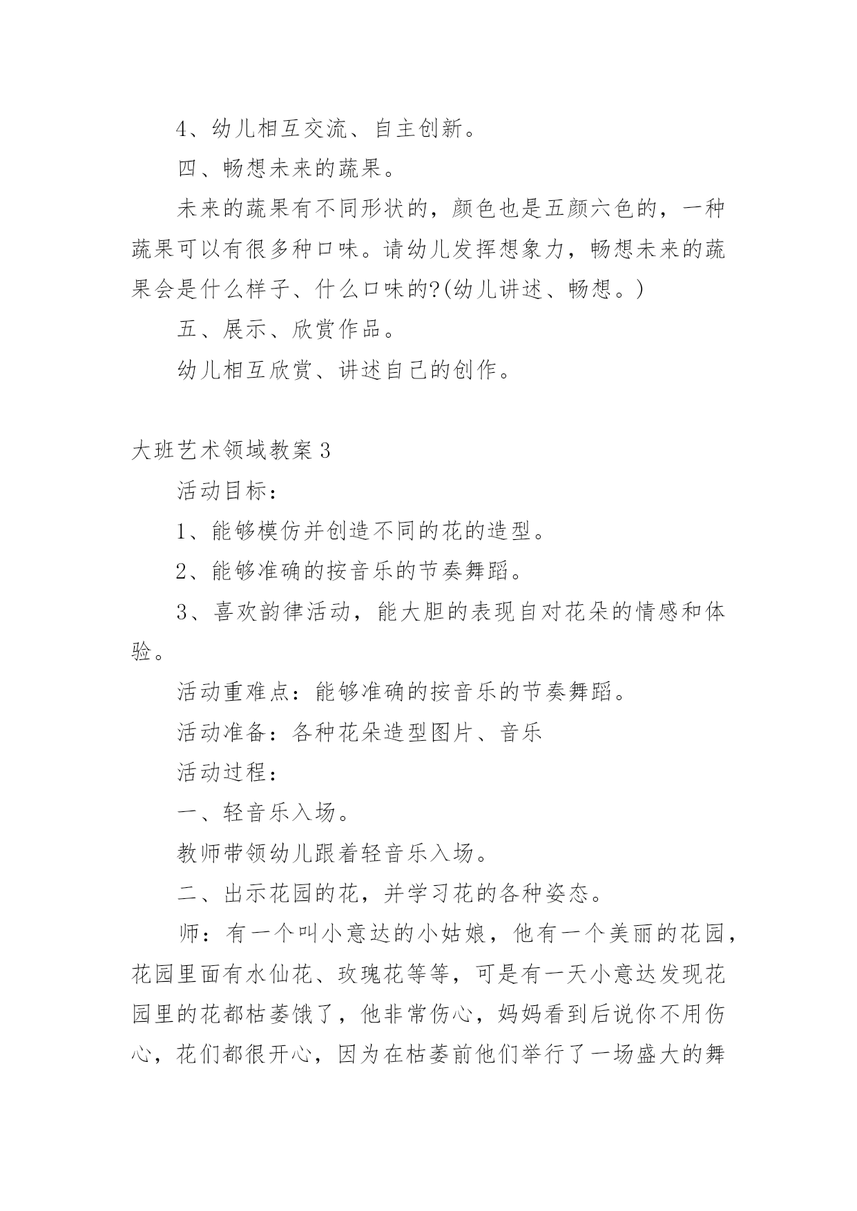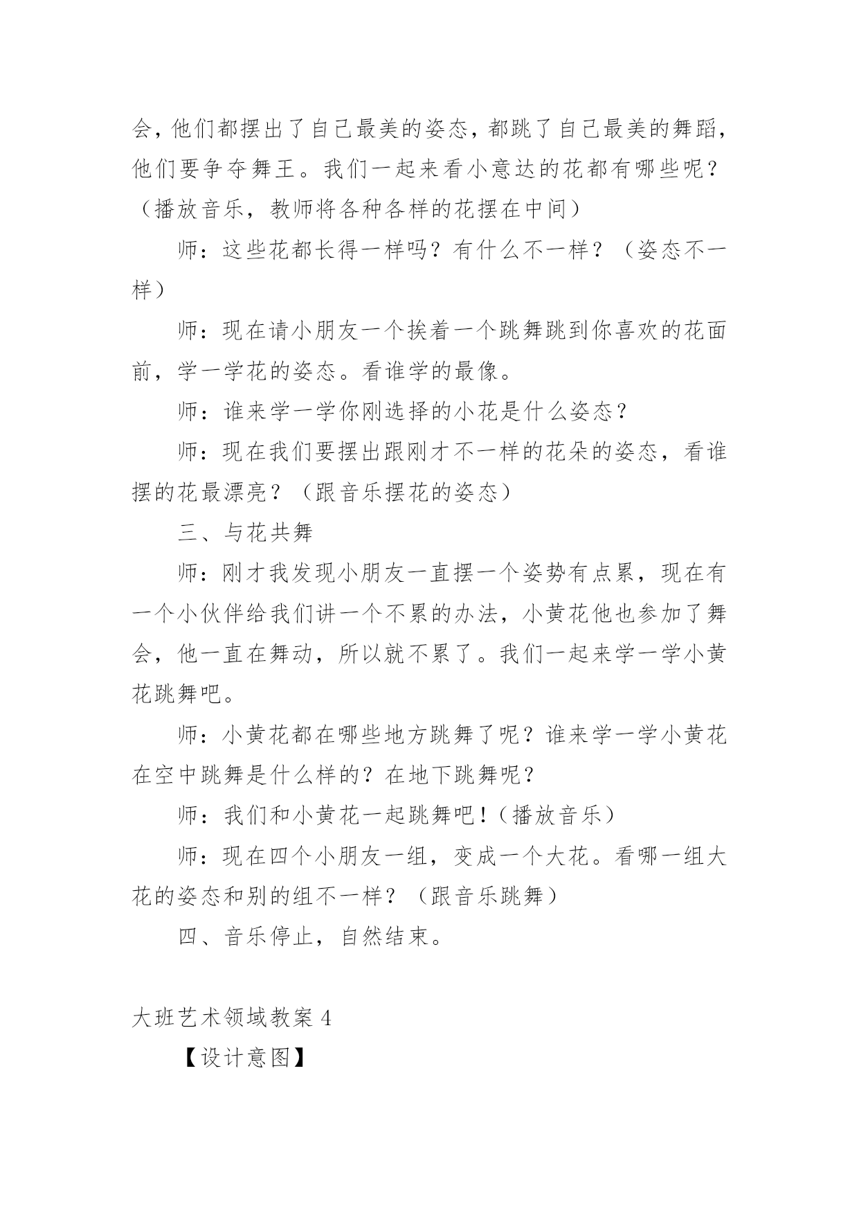 大班艺术领域教案作为一名优秀的教育工作者,有必要进行细致的教案准备工作,通过教案准备可以更好地根据具体情况对教学进程做适当的必要的调整。来参考自己需要的教案吧!以下是小编为大家整理的大班艺术领域教案,仅供参考,希望能够帮助到大家。大班艺术领域教案1【活动目标】1、了解风筝是我国特有的一种民间工艺。2、知道风筝的简单制作过程,尝试自己制作风筝并进行装饰。【活动准备】1、放风筝录像、图片、《春之声圆舞曲》背景音乐。2、绘画纸、卡纸、剪刀、胶水等。3、幼儿用书【活动过程】1、教师与谈话:你都见过什么样的风筝?让幼儿说一说2、请幼儿欣赏风筝图片,请幼儿说说这些风筝的特征。(1)引导幼儿观看潍坊风筝节漫天风筝的录像,并播放《春之声圆舞曲》背景音乐。(2)请幼儿互相交流看到了哪些不同样式的风筝,自己最喜欢的风筝是什么样子的。3、通过教师简单介绍让幼儿更进一步了解风筝,知道风筝的简单制作过程。(1)教师介绍风筝的知识,引导幼儿欣赏各种不同样式的风筝。(2)向幼儿简单介绍风筝的发展历史和制作过程,了解风筝是我国特有的一种民间工艺。(3)出示几种不同样式的风筝,引导幼儿观察其图案特点。4、请幼儿用提供的材料尝试制作风筝。(1)教师示范制作风筝的过程。(2)幼儿利用教师准备材料开始制作,教师巡回指导。(3)让幼儿说说自己制作风筝的过程(4)请幼儿阅读用书,说说这些风筝的名称和特点,然后给它们装饰,一定要与众不同。5、请幼儿互相欣赏作品,教师评价。【活动延伸】带幼儿到户外放风筝。大班艺术领域教案2【教学活动目标】1、认识各种蔬果及性质。2、利用各种蔬果的特征制作、组合成各种造型。3、培养动手制作能力、塑造力、想象力。【活动准备】1、各种蔬菜、水果、牙签、及时贴、剪刀。2、教师制作的各种蔬果造型。【活动过程】一、兴趣导入。教师:小朋友带来的水果真多,大家互相瞧一瞧,都有什么?教室:今天,我们就来和水果、蔬菜交朋友。二、观察各种蔬菜、水果。1、分组观察带来的蔬果。教师:说一说你喜欢什么蔬菜和水果?它是什么颜色,有什么味道?看谁说的生动形象,让人了解这种蔬果的鲜嫩、美丽、可爱以及它的营养价值所在。2、教师:蔬果除了可以食用外,还可以做什么?3、教师:我们平时吃的蔬果还可以做出很多可爱的造型,一起欣赏一下。三、制作蔬果造型。1、教师:小朋友,说一说你刚才都看到了什么?幼儿:香蕉做的小狗,萝卜做的茶壶,青豆做的蚂蚁,菜花做的绵羊......2、你想做什么?用什么材料来做?(幼儿自由探索、摆弄,创新不同的造型。)3、幼儿选材、自由创作。对个别幼儿在插接方面给予帮助。4、幼儿相互交流、自主创新。四、畅想未来的蔬果。未来的蔬果有不同形状的,颜色也是五颜六色的,一种蔬果可以有很多种口味。请幼儿发挥想象力,畅想未来的蔬果会是什么样子、什么口味的?(幼儿讲述、畅想。)五、展示、欣赏作品。幼儿相互欣赏、讲述自己的创作。大班艺术领域教案3活动目标:1、能够模仿并创造不同的花的造型。2、能够准确的按音乐的节奏舞蹈。3、喜欢韵律活动,能大胆的表现自对花朵的情感和体验。活动重难点:能够准确的按音乐的节奏舞蹈。活动准备:各种花朵造型图片、音乐活动过程:一、轻音乐入场。教师带领幼儿跟着轻音乐入场。二、出示花园的花,并学习花的各种姿态。师:有一个叫小意达的小姑娘,他有一个美丽的花园,花园里面有水仙花、玫瑰花等等,可是有一天小意达发现花园里的花都枯萎饿了,他非常伤心,妈妈看到后说你不用伤心,花们都很开心,因为在枯萎前他们举行了一场盛大的舞会,他们都摆出了自己最美的姿态,都跳了自己最美的舞蹈,他们要争夺舞王。我们一起来看小意达的花都有哪些呢?(播放音乐,教师将各种各样的花摆在中间)师:这些花都长得一样吗?有什么不一样?(姿态不一样)师:现在请小朋友一个挨着一个跳舞跳到你喜欢的花面前,学一学花的姿态。看谁学的最像。师:谁来学一学你刚选择的小花是什么姿态?师:现在我们要摆出跟刚才不一样的花朵的姿态,看谁摆的花最漂亮?(跟音乐摆花的姿态)三、与花共舞师:刚才我发现小朋友一直摆一个姿势有点累,现在有一个小伙伴给我们讲一个不累的办法,小黄花他也参加了舞会,他一直在舞动,所以就不累了。我们一起来学一学小黄花跳舞吧。师:小黄花都在哪些地方跳舞了呢?谁来学一学小黄花在空中跳舞是什么样的?在地下跳舞呢?师:我们和小黄花一起跳舞吧!(播放音乐)师:现在四个小朋友一组,变成一个大花。看哪一组大花的姿态和别的组不一样?(跟音乐跳舞)四、音乐停止,自然结束。大班艺术领域教案4【设计意图】对于孩子们来说,玩泥巴是他们最喜欢做的事情了。一团软软的泥,到了孩子手里,不一会儿就摆弄出各种各样的东西来,虽然有的还比较粗糙,但孩子们还是乐此不疲的玩着。对于大班的孩子来说,对周围的事物有了一定的了解和观察,也掌握了一些基本的