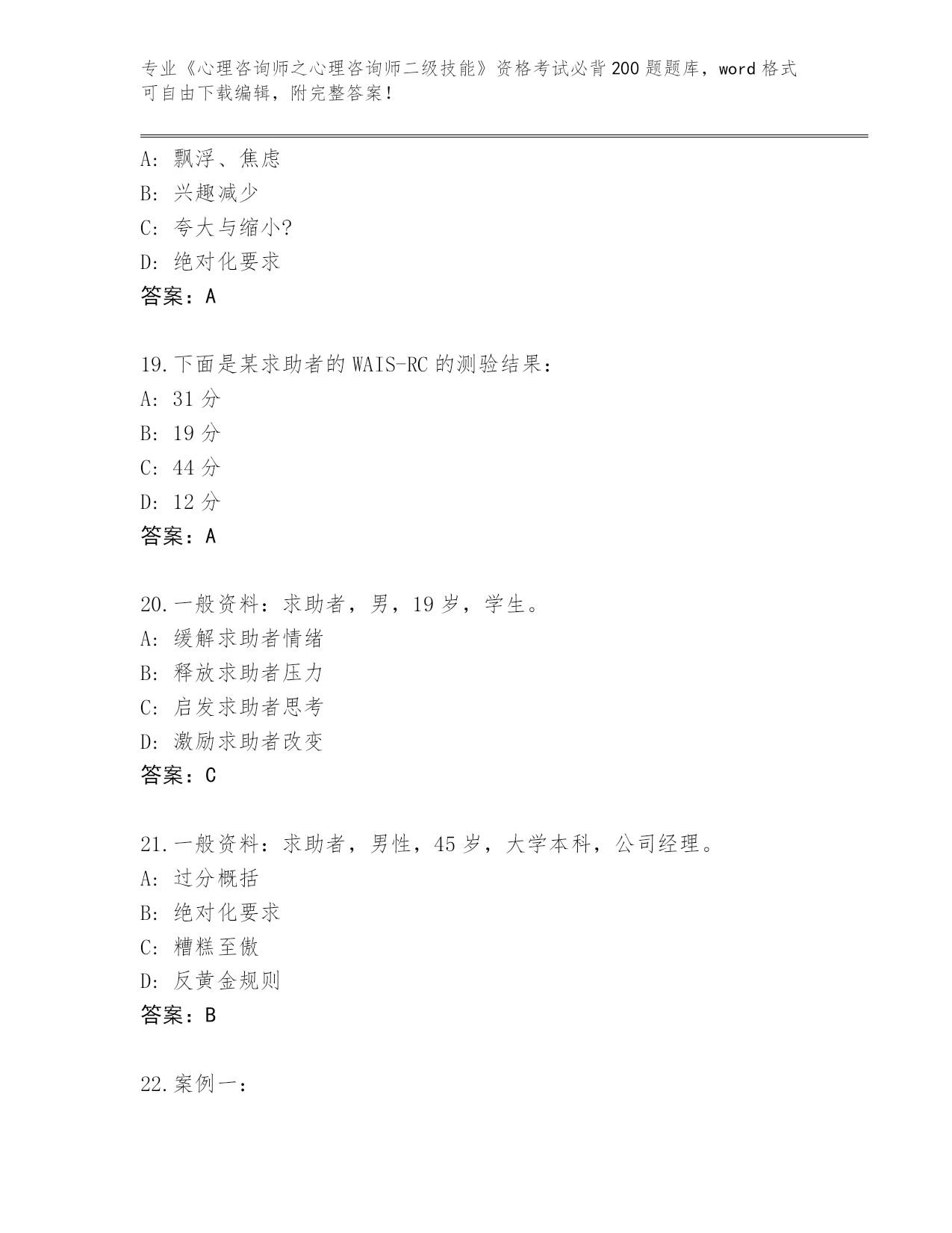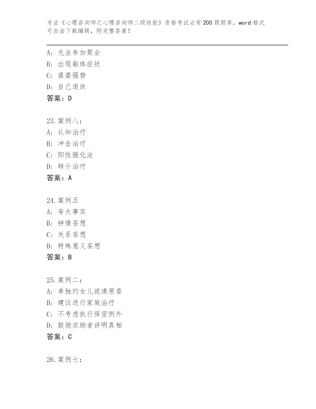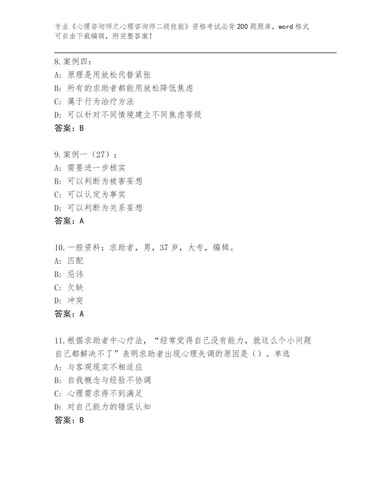 黑龙江省萨尔图区整理《心理咨询师之心理咨询师二级技能》资格考试必背200题大全及答案(全国通用)