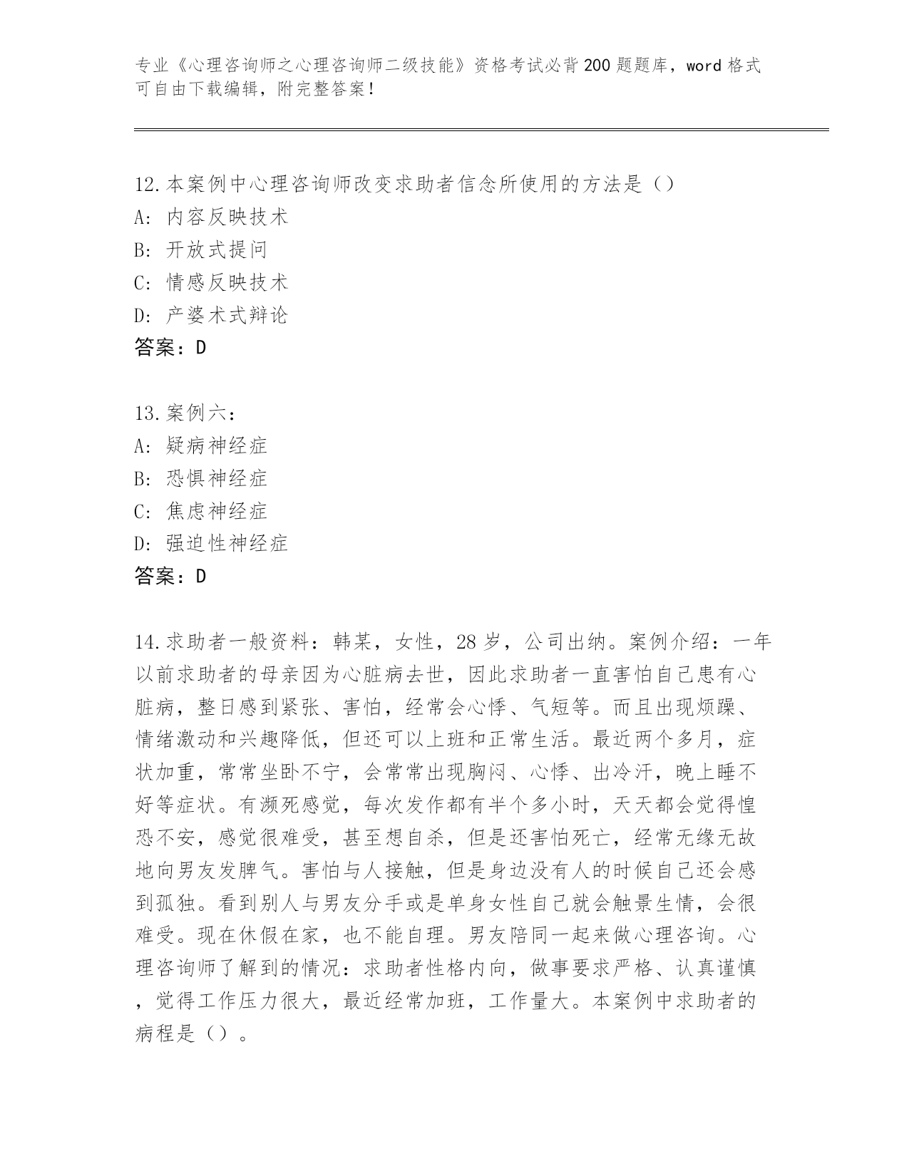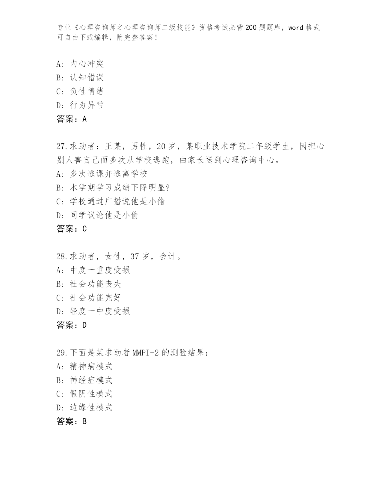 完整版河北省《心理咨询师之心理咨询师二级技能》资格考试必背200题及完整答案