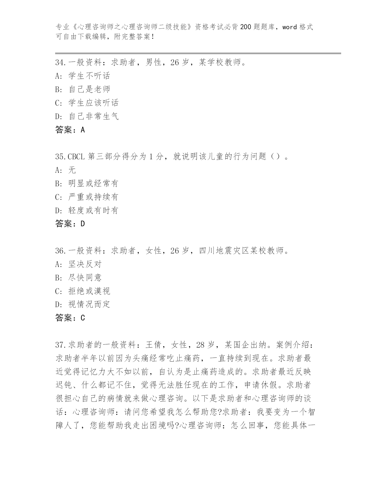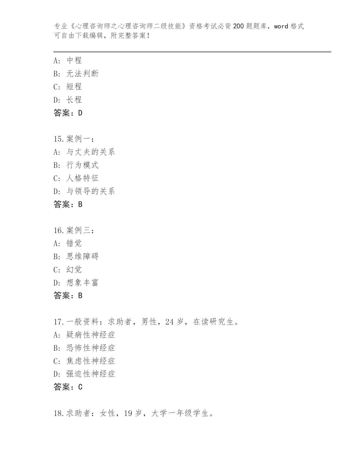 河南省《心理咨询师之心理咨询师二级技能》资格考试必背200题真题题库及答案()
