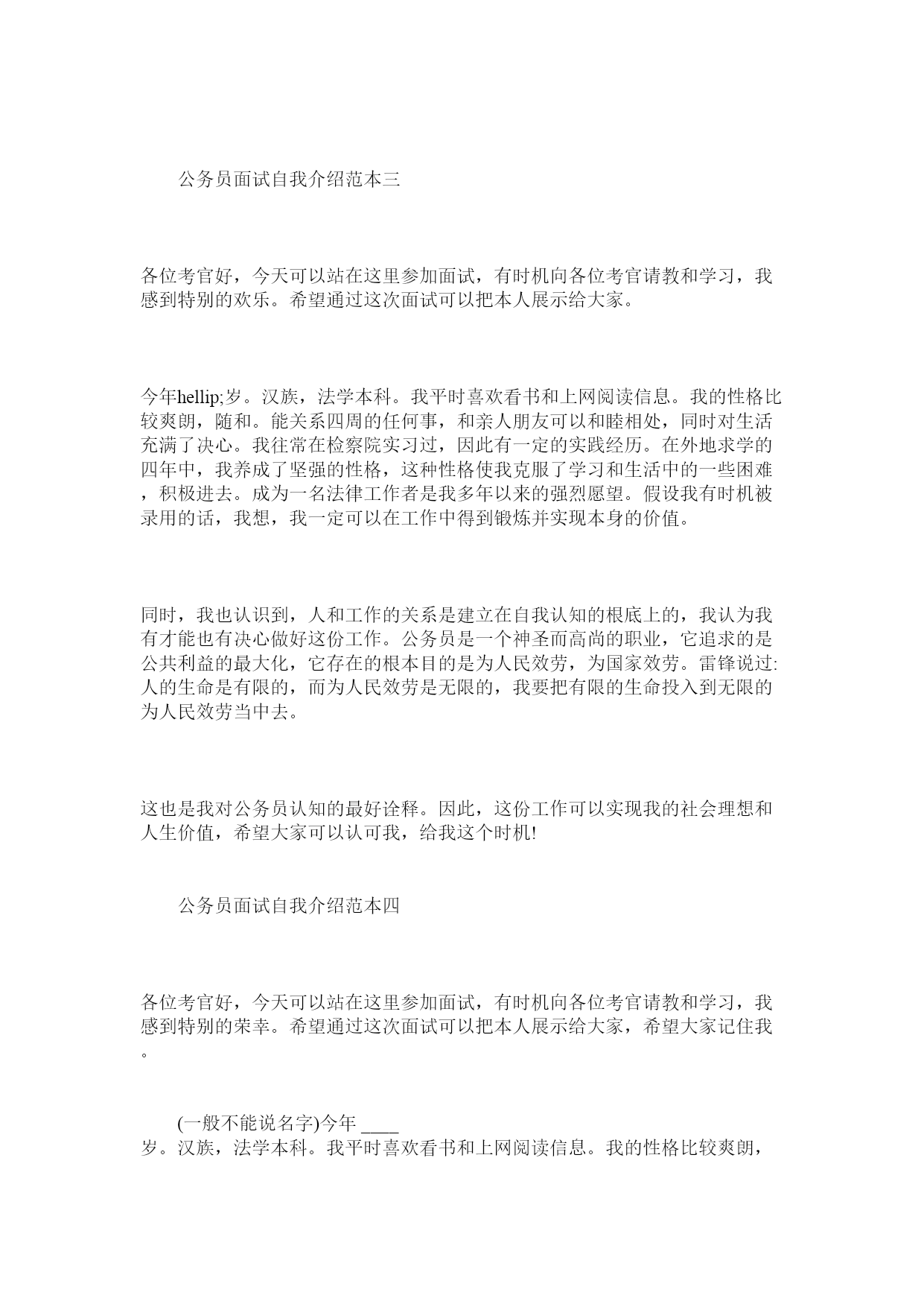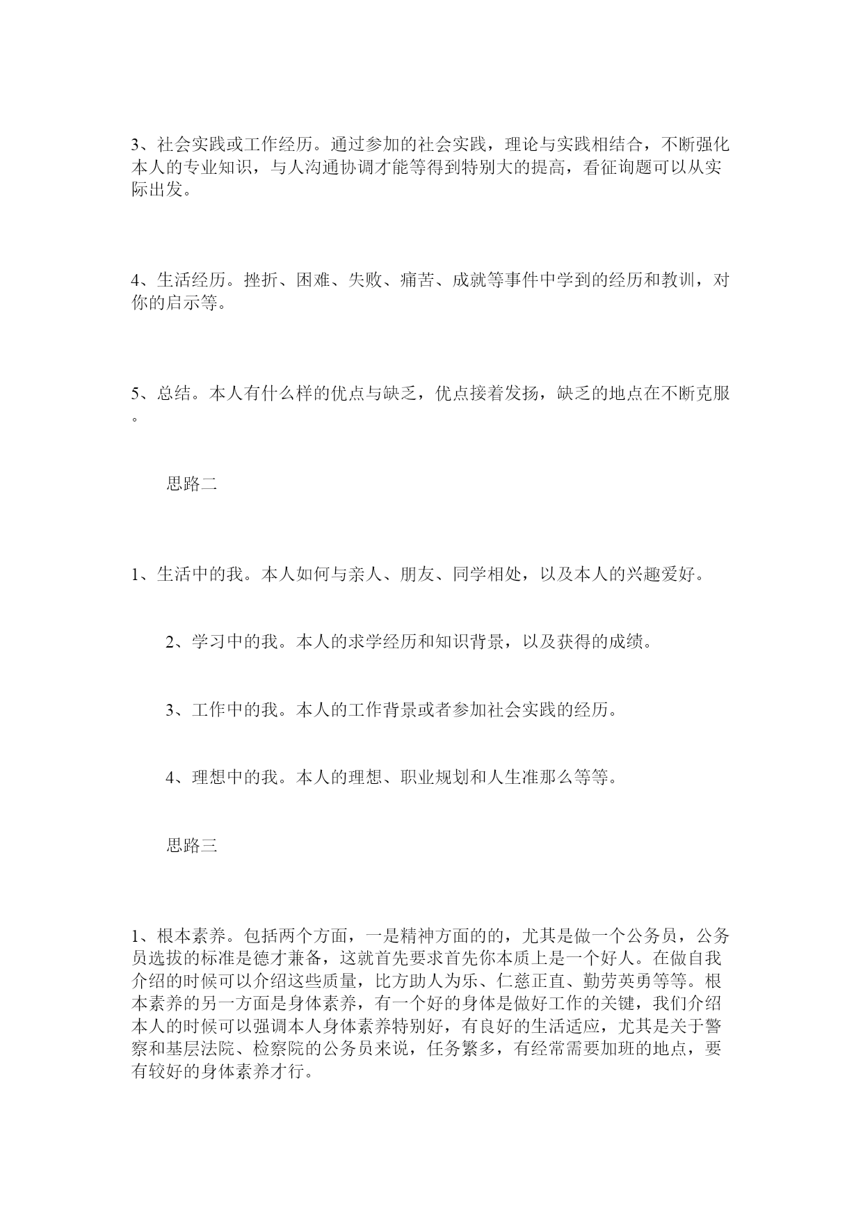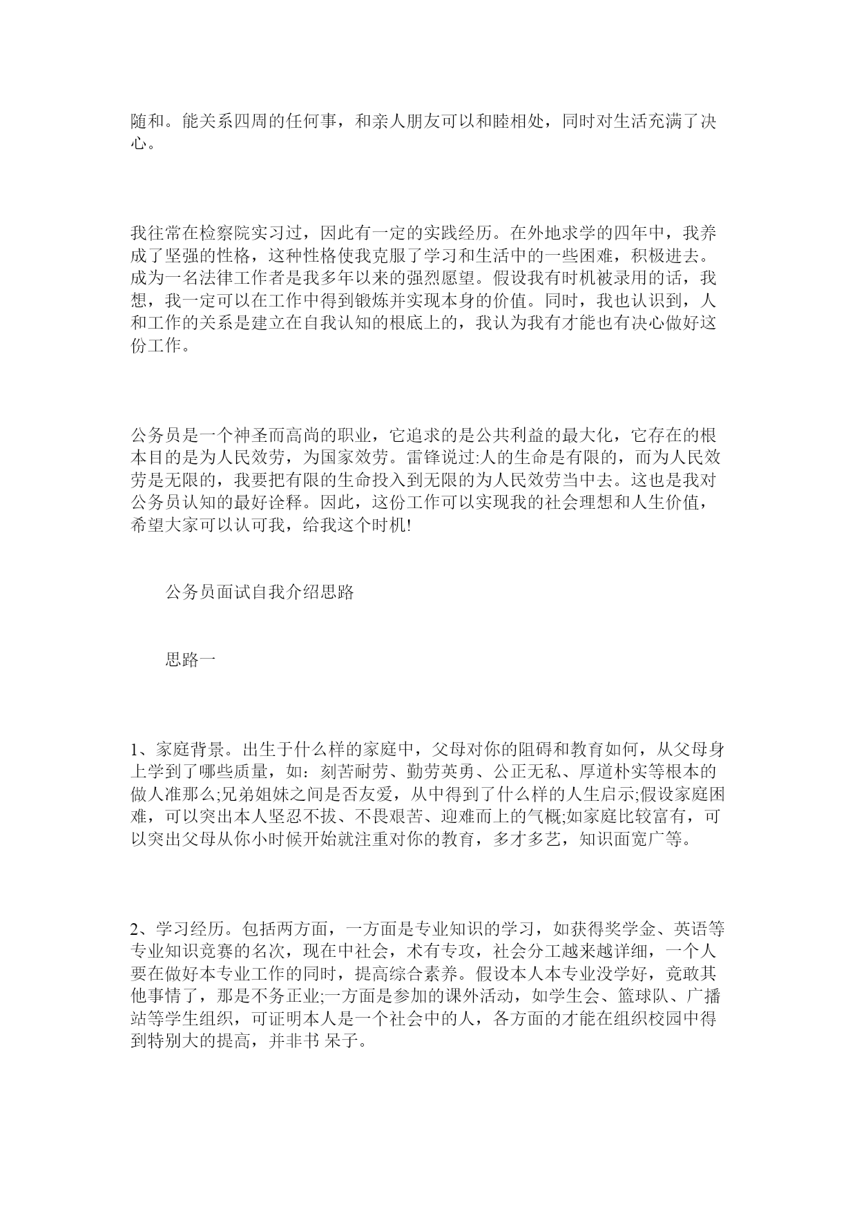 公务员面试自我介绍范本与思路自我介绍是公务员面试中特别常见的一种征询题,我们要加以注重。小编搜集整理了公务员面试自我介绍范本与思路,欢迎阅读,供大家参考,预祝大家顺利通过面试。公务员面试自我介绍范本一各位考官早上好!下面我将简单介绍一下我本人。我今年____岁,大学本科学历。金融专业硕士。参加银监会系统工作不断是我的梦想。大学期间,除了学好本专业的课程外,我还选修了治理学等非专业的学科,丰富了本人的知识面。同时,我还通过了银行从业资历、会计从业资历等考试,获得了必备的技能证书。在硕士研究生阶段,主要研究金融治理方向,发表金融方面EI文章5篇,省级优秀论文一篇。我还担任校学生会办公室主任一职,负责组织并参与起草学生会的各种文件材料。我曾经在某银行实习6个月,实习期间,曾协助处理近千笔银行业务,保持了零投诉的记录,并获得当年实习单位的优秀实习生“称号。这段实习生活也让我觉察了本人是确实有兴趣也有才能从事银监系统相关工作,因此也更加坚决了我本人的方法。今天特别欢乐可以参加银监系统的面试,感激!公务员面试自我介绍范本二我叫XXX,我毕业于XX学校XX专业下面我做一下自我介绍.可以劈波斩浪,从无数应聘者中脱颖而出进入面试,自决心让我感遭到离成功的间隔又近了一步!坦白地说,假设我为本人的理想奋斗了,即便是失败,我也不会后悔由于我收获了!我生于农村,父母勤劳仁慈品德的熏陶、学校老师的教育,使我对公务员产生了一股羡慕与仰慕之情;2004年高考时,我毫不犹豫选择了XX专业,四年的大学生涯,培育了我和气、和睦、和谐的处世态度.在思想上,我也积极向党组织靠拢,一方面,加强本身的思想道德建立,从思想上武装本人;另一方面,本着为人民效劳的主旨,坚持协助别人,效劳社会,以党员的要求严格要求本人。终于在大三开始的时候荣耀的参加了中国,并在一年后顺利转正。在校期间,学习成绩优秀,大一通过全国计算机等级考试(二级c语言)大二通过大学英语四、六级考试,同年,获得全国大学生英语竞赛三等奖,大三,自学acca(英国特许公认会计师),现为第二阶段考生,大四,开始对金融投资特别感兴趣,报名了6月的cfa(charteredfinancialanalyst)考试。此外我积极参加社会实践活动,锻炼本人的专业技能,增长本人的专业知识,并到达了一定的效果。通过一系列的校内外活动,我也逐步把握了人交往和沟通的技巧,学会了如何使本人处于一个融洽的人际关系中。通过在校的学习我深深体会到理论指导实践的含义,同时确实以这个准那么要求本人。在学习和活动之余我也积极充实本人,博览群书,丰富知识,而且掌握了一定的计算机应用技巧足以应付工作需要。作为应届大学生,我还特别稚嫩,但我明白:一个青年人,可以通过不断的学习来完善本人,在实践中证明本人。我相信,良好的自学才能和不懈的研究精神一定能使我特别快胜任我的工作。我性格爽朗、大方,有较强的沟通组织才能和实际动手才能,擅长人际交往。掌握良好的礼仪知识和接待工作经历,头脑灵敏尊敬的考官,难与青松比碧翠,愿做梅花傲雪霜;给我一次时机,我会用实际效果来证明给你们看.公务员面试自我介绍范本三各位考官好,今天可以站在这里参加面试,有时机向各位考官请教和学习,我感到特别的欢乐。希望通过这次面试可以把本人展示给大家。今年hellip;岁。汉族,法学本科。我平时喜欢看书和上网阅读信息。我的性格比较爽朗,随和。能关系四周的任何事,和亲人朋友可以和睦相处,同时对生活充满了决心。我往常在检察院实习过,因此有一定的实践经历。在外地求学的四年中,我养成了坚强的性格,这种性格使我克服了学习和生活中的一些困难,积极进去。成为一名法律工作者是我多年以来的强烈愿望。假设我有时机被录用的话,我想,我一定可以在工作中得到锻炼并实现本身的价值。同时,我也认识到,人和工作的关系是建立在自我认知的根底上的,我认为我有才能也有决心做好这份工作。公务员是一个神圣而高尚的职业,它追求的是公共利益的最大化,它存在的根本目的是为人民效劳,为国家效劳。雷锋说过:人的生命是有限的,而为人民效劳是无限的,我要把有限的生命投入到无限的为人民效劳当中去。这也是我对公务员认知的最好诠释。因此,这份工作可以实现我的社会理想和人生价值,希望大家可以认可我,给我这个时机!公务员面试自我介绍范本四各位考官好,今天可以站在这里参加面试,有时机向各位考官请教和学习,我感到特别的荣幸。希望通过这次面试可以把本人展示给大家,希望大家记住我。(一般不能说名字)今年____岁。汉族,法学本科。我平时喜欢看书和上网阅读信息。我的性格比较爽朗,随和。能关系四周的任何事,和亲人朋友可以和睦相处,同时对生