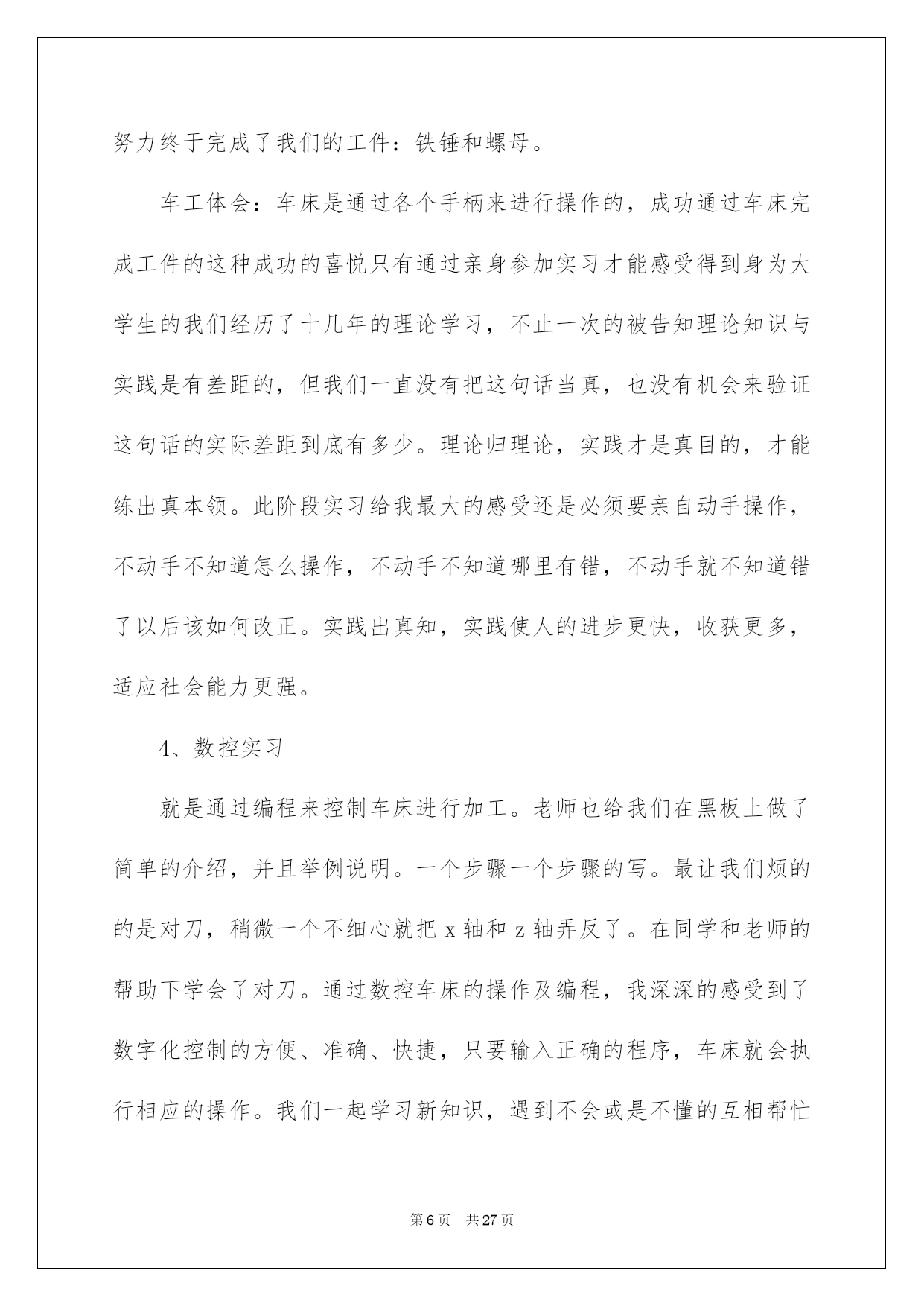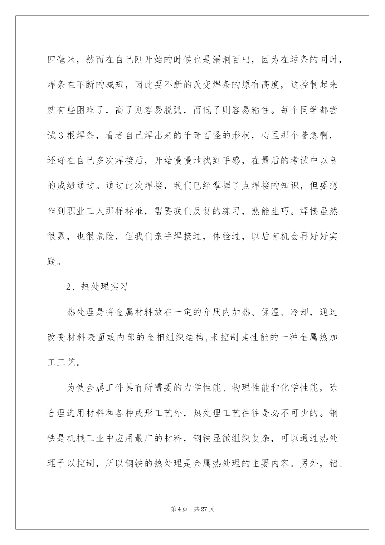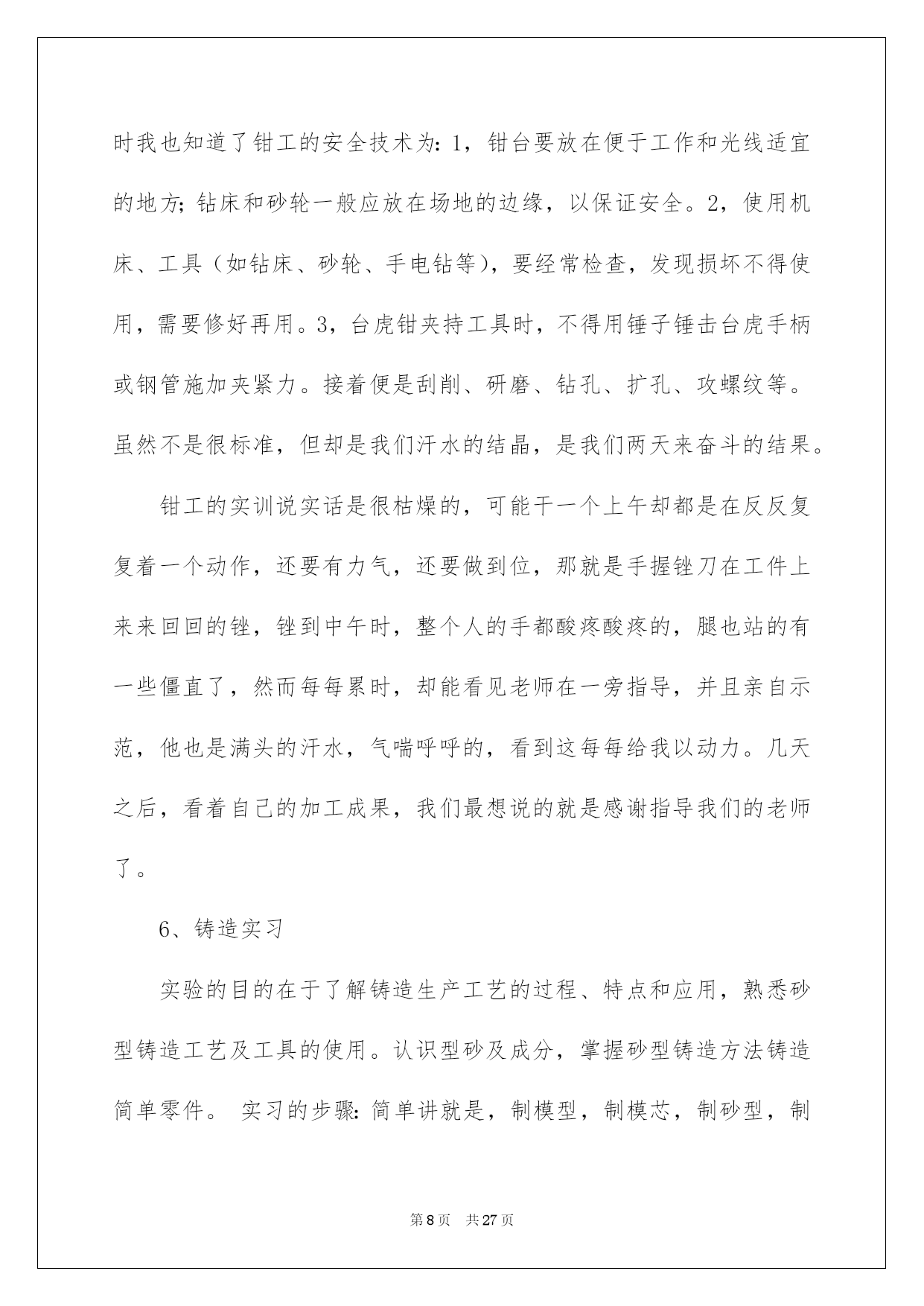 第PAGE\*Arabic\*MERGEFORMAT27页共NUMPAGES\*Arabic\*MERGEFORMAT27页第PAGE\*MERGEFORMAT27页共NUMPAGES\*MERGEFORMAT27页第PAGE\*MERGEFORMAT27页共NUMPAGES\*MERGEFORMAT27页第PAGE\*MERGEFORMAT27页共NUMPAGES\*MERGEFORMAT27页第PAGE\*MERGEFORMAT27页共NUMPAGES\*MERGEFORMAT27页第PAGE\*MERGEFORMAT27页共NUMPAGES\*MERGEFORMAT27页第PAGE\*MERGEFORMAT27页共NUMPAGES\*MERGEFORMAT27页第PAGE\*MERGEFORMAT27页共NUMPAGES\*MERGEFORMAT27页第PAGE\*MERGEFORMAT27页共NUMPAGES\*MERGEFORMAT27页第PAGE\*MERGEFORMAT27页共NUMPAGES\*MERGEFORMAT27页第PAGE\*MERGEFORMAT27页共NUMPAGES\*MERGEFORMAT27页2022机电类实习报告3篇机电类实习报告随着人们自身素质提升,接触并使用报告的人越来越多,我们在写报告的时候要注意语言要准确、简洁。你还在对写报告感到一筹莫展吗?以下是我整理的机电类实习报告3篇,希望能够帮助到大家。机电类实习报告篇1为期两周的金工实习在金属的回响中落下了大幕,总的来说这次为期两周的实习活动是一次有趣且必将影响我今后的学习工作的重要的经验。我想在将来的岁月里恐怕不会再有这样的机会,在短短的时间内那么完整的体验到当今工业界普遍所应用的方法;也恐怕难有这样的幸运去体验身边的每一样东西到底是如何制造出来的了。“金工实习”是一门实践性的技术基础课,是高等院校工科学生学习机械制造的基本工艺方法和技术,完成工程基本训练的重要必修课。它不仅可以让我们获得了机械制造的基础知识,了解了机械制造的一般操作,提高了自己的操作技能和动手能力,而且加强了理论联系实际的锻炼,提高了工程实践能力,培养了工程素质。这是一次我们学习,锻炼的好机会!通过这次虽短而充实的实习我懂得了很多???在工业生产中,安全要摆在第一位,是至关重要的!这是每个老师给我们的第一忠告。在工业安全科目中,我们便被安排轮流去看一个实习安全方面的录像。录像里详尽的播放了许多工种的实习要求和安全处理,像电焊气焊,热处理等。看着那么复杂生于操作的机器还有许多因不按要求操作机器而发生的事故,我们都吓了一跳。真是不看不知道,一看吓一跳!一个无意的动作或是一个小小的疏忽,都可能导致机械事故甚至人身安全事故。在未发生安全事故前,许多人对安全教育不重视,认为太烦琐,太枯燥。一旦发生了事故,事后诸葛亮就很多。看完录像后,我们在车间里,听老师讲解有关工业安全方面的知识。看着发下来的资料,我才明白工业安全的重要性,工业安全知识是工业高层管理人员和开发人员的必备知识,对于草拟或一个企业的安全条例,减少工业污染,防火防爆等方面来说是非常重要的知识,如果不掌握的话,不但会被人斥为无知,有时还会发生重大事故。所以安全总是第一位的,我们深深牢记于心,做起事来认真,严肃。我很庆幸我对它有了足够的重视,所以我安全的度过了实习的两周!一、实习目的了解各工种的作用及使用方法,锻炼自己的动手能力,将学习的理论知识运用于实践当中,进一步巩固、深化已经学过的理论知识,提高综合运用所学过的知识缩短我们从一名大学生到一名工作人员之间的思想与距离,为以后进一步走向社会打下坚实的基础。二、实习内容1、焊接实习曾无数次看到建筑工地里闪烁的电火花,我知道那就是焊接,这次,我们也要接触到令很多同学畏惧的焊接,本想着操作起来很容易,然而事实却并非那样,比我想象的要难的多了。今天,老师给我们详细介绍焊接的相关操作和一些注意事项,焊接所产生的气味和刺眼的光对人体都是有害的,我们在操作时要懂得保护自己,穿上工作服,带上面罩。从老师的讲解中我了解到:焊条的角度一般在七十到八十之间,运条的速度,要求当然是匀速,然而在实际操作中,我们往往是不快则慢,很难保持匀速,因此焊出来的结果是很不流畅的,有的地方停留时间短则当然没有焊好,还有裂纹,停留时间长的地方,则经常会出现被焊透的毛病,出现了漏洞;焊条的高度要求保持在二至四毫米,然而在自己刚开始的时候也是漏洞百出,因为在运条的同时,焊条在不断的减短,因此要不断的改变焊条的原有高度,这控制起来就有些困难了,高了则容易脱弧,