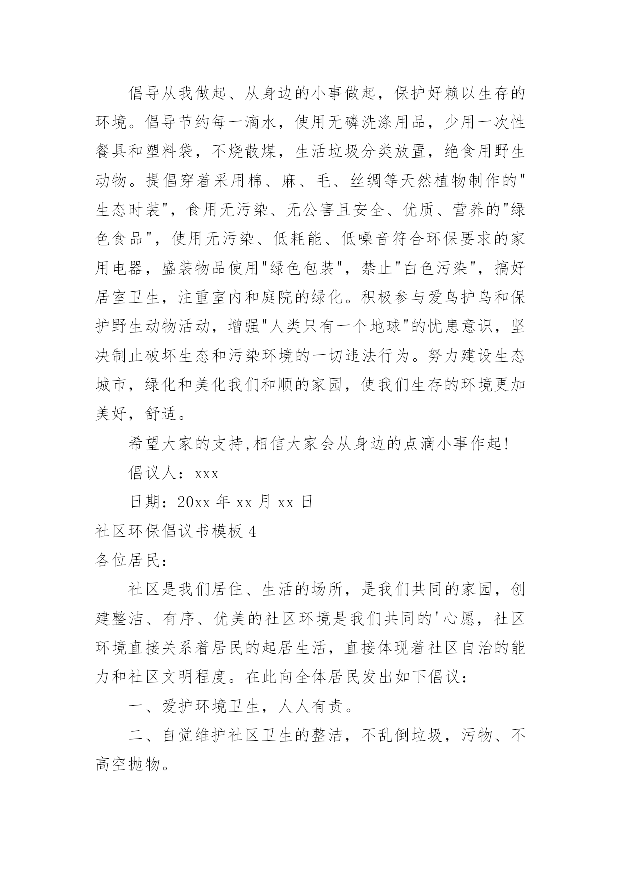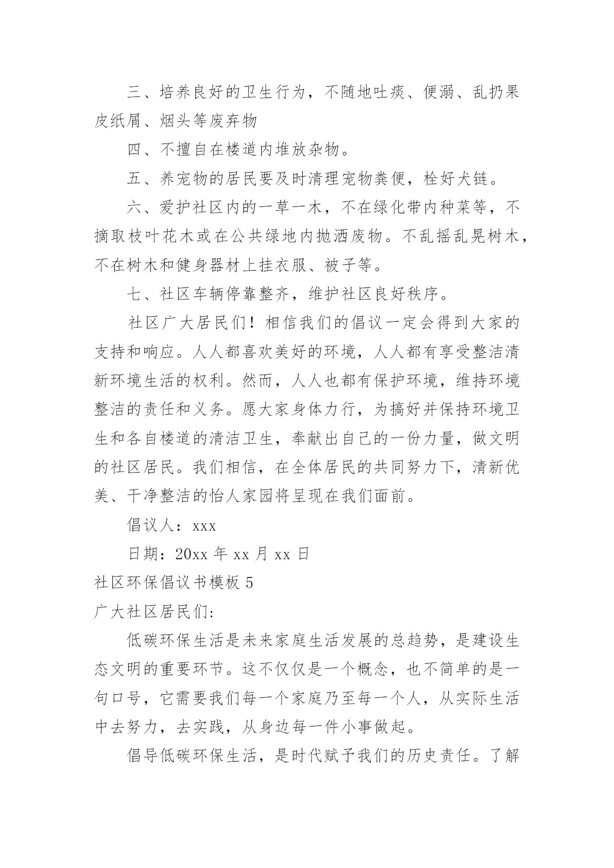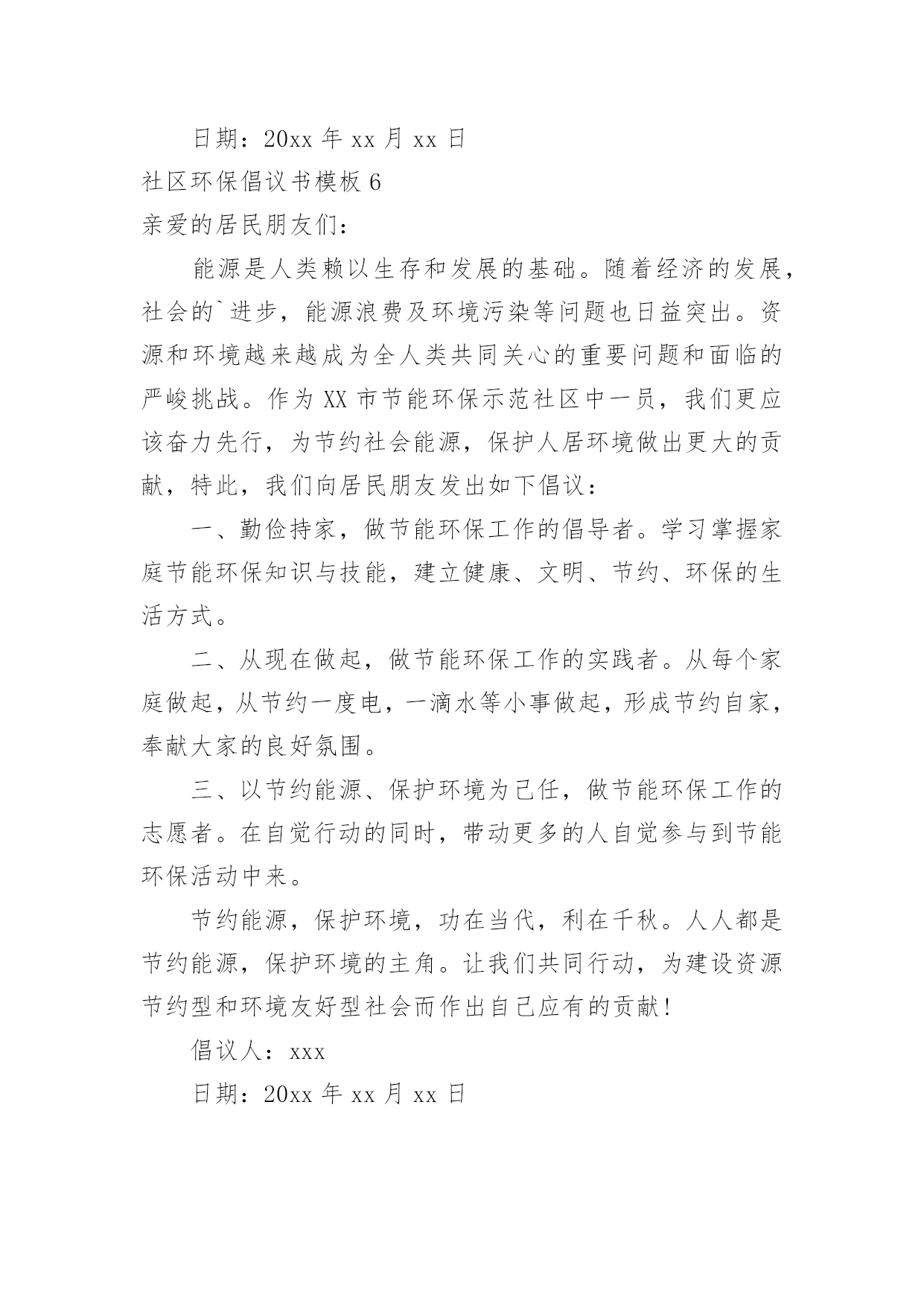 社区环保倡议书社区环保倡议书模板随着社会不断地进步,我们都可能会用到倡议书,倡议书一般由标题、称呼、正文、结尾、落款五部分组成。那么你有了解过倡议书吗?下面是小编帮大家整理的社区环保倡议书模板,仅供参考,欢迎大家阅读。社区环保倡议书模板1居民朋友们:大家好!根据沙坡头区有关文明社区创建精神,华西社区将以构建和谐社会,创建文明社区为目标,努力把华西社区创建成环境整洁、秩序安定、组织健全、服务完善、文化丰富、风尚良好的文明社区。“社区是我家,创建靠大家”,创建文明社区需要社区每个家庭、每一位居民的共同努力,共同参与。为此,我们特向社区广大居民发出以下倡议:一、争做文明居民。树立“人人清洁,人人受益”的意识,养成良好的.卫生习惯,积极维护社区公共卫生,保持楼道公用部位的整洁、清洁,楼上居民不往楼下乱抛乱丢垃圾、杂物。保持小区整洁美观,不乱吐乱扔,乱刻乱画,乱泼乱倒,乱牵乱挂,提倡用可降解塑料袋装垃圾,并且放入指定的地点。二、倡导文明新风尚。积极倡导文明礼貌、助人为乐、爱护公物、保护环境、遵纪守法的社会公德;倡导尊老爱幼、家庭和睦的家庭美德,搞好邻里团结;倡导爱岗敬业、诚实守信、办事公道、服务群众、奉献社会的职业道德。形成“我为人人,人人为我”的社会新风,让华西社区充满活力,处处有真情,人人有爱心。三、增强法制意识和安全防范意识。每位社区居民做到人人知法、守法、依法办事,自觉地同一切违法犯罪行为作斗争,做好安全防范工作,维护社区一方平安。建设整洁有序的居住环境,打造优美和谐的小区形象,是我们的共同愿望,也是我们的共同责任和应尽义务,让我们一起行动起来,为创建文明社区而共同努力!倡议人:xxx日期:20xx年xx月xx日社区环保倡议书模板2广大居民朋友们:地球气候变暖已日益成为危及人类生存的严重问题。频繁发生的灾害性气候所引发的泥石流、暴风雨雪、不断上升的海平面、逐渐消逝的冰川、洪水、干旱已经给人类生存带来了巨大的威胁。面对同一片蓝天、身处同一个地球,我们每个人都有责任去保护环境和拯救地球。为此,我们向居民们发出关爱地球、还我绿色的倡议,倡导大家树立低碳理念,创造绿色家园。从现在开始:1、购买简单包装的商品,选购绿色产品、绿色食物,倡导绿色消费;2、少用一次性制品(木筷、纸杯、纸巾等),减少垃圾,进行垃圾分类,回收资源;3、使用节能电器,电器使用后完全关闭电源,节约用电;适度使用空调;4、多骑自行车、多坐公交车,为节能减排出力;5、亲近大自然,参加植树造林活动,认养(捐植)一棵树木,寄托自己的理想,埋下自己的`愿望。6、关心爱护绿色生命,保护身边的绿化成果,广泛开展植绿、护绿、爱绿、兴绿文明活动,争做绿色文明使者,让我们家园的天更蓝、水更清、地更绿。7、让我们携手营造人人了解、重视、参与环保的良好氛围。为每个人喝上干净的水、呼吸到新鲜的空气、吃上放心的食物、享受到健康和快乐的生活尽一份责任!过低碳生活,做绿色公民!我们一起行动吧!倡议人:xxx日期:20xx年xx月xx日社区环保倡议书模板3尊敬的居民朋友们:一个绿色的地球是我们人类生存的先决条件。两千年的人类文明进程没有牺牲地球的绿色,但是两百年的现代文明却使我们绿色的地球日渐披黄蒙黑。人类在毁灭地球绿色的同时,也就是在逐步毁灭人类自己。看看我们周围干涸的'河流,污染的空气,漫天飞舞的白色垃圾和满地的瓜果碎屑.为此我们倡议:倡导从我做起、从身边的小事做起,保护好赖以生存的环境。倡导节约每一滴水,使用无磷洗涤用品,少用一次性餐具和塑料袋,不烧散煤,生活垃圾分类放置,绝食用野生动物。提倡穿着采用棉、麻、毛、丝绸等天然植物制作的"生态时装",食用无污染、无公害且安全、优质、营养的"绿色食品",使用无污染、低耗能、低噪音符合环保要求的家用电器,盛装物品使用"绿色包装",禁止"白色污染",搞好居室卫生,注重室内和庭院的绿化。积极参与爱鸟护鸟和保护野生动物活动,增强"人类只有一个地球"的忧患意识,坚决制止破坏生态和污染环境的一切违法行为。努力建设生态城市,绿化和美化我们和顺的家园,使我们生存的环境更加美好,舒适。希望大家的支持,相信大家会从身边的点滴小事作起!倡议人:xxx日期:20xx年xx月xx日社区环保倡议书模板4各位居民:社区是我们居住、生活的场所,是我们共同的家园,创建整洁、有序、优美的社区环境是我们共同的'心愿,社区环境直接关系着居民的起居生活,直接体现着社区自治的能力和社区文明程度。在此向全体居民发出如下倡议:一、爱护环境卫生,人人有责。二、自觉维护社区卫生的整洁,不乱倒垃圾,污物、不高空抛物。三、培养良好的卫生行为,不随地吐痰、便溺、乱扔果皮纸屑、烟头等废弃物四、不擅自在楼道内堆放杂物。五、养宠物的居民要及时清理宠物粪便,栓好犬链。六、爱护社区内的一草一木,不在绿化带内种菜等,