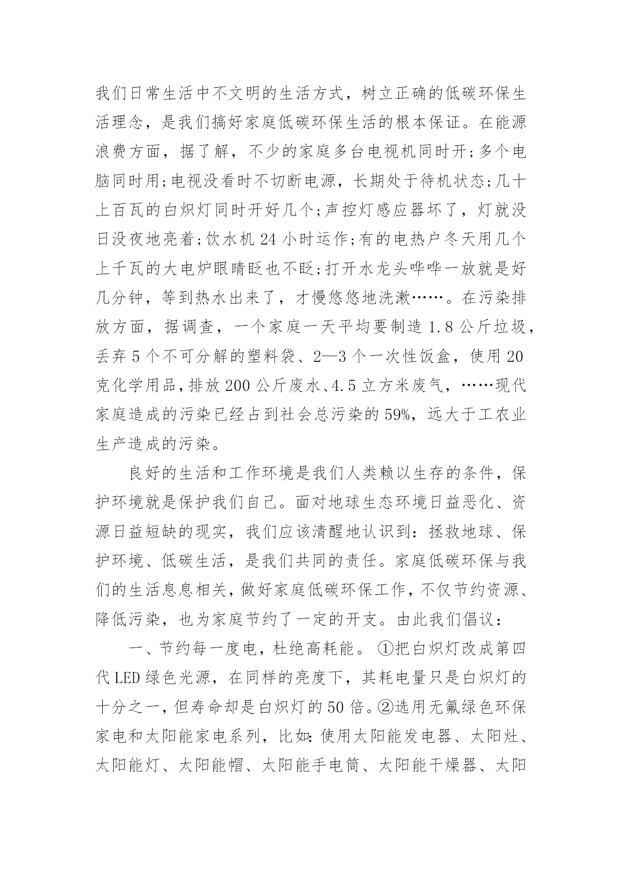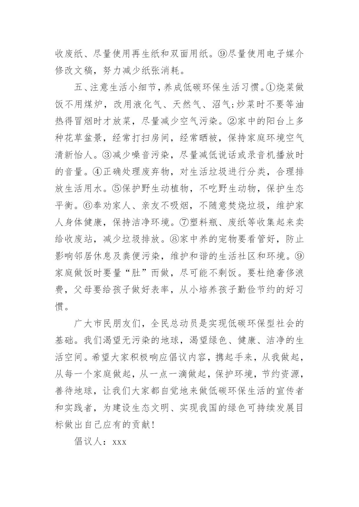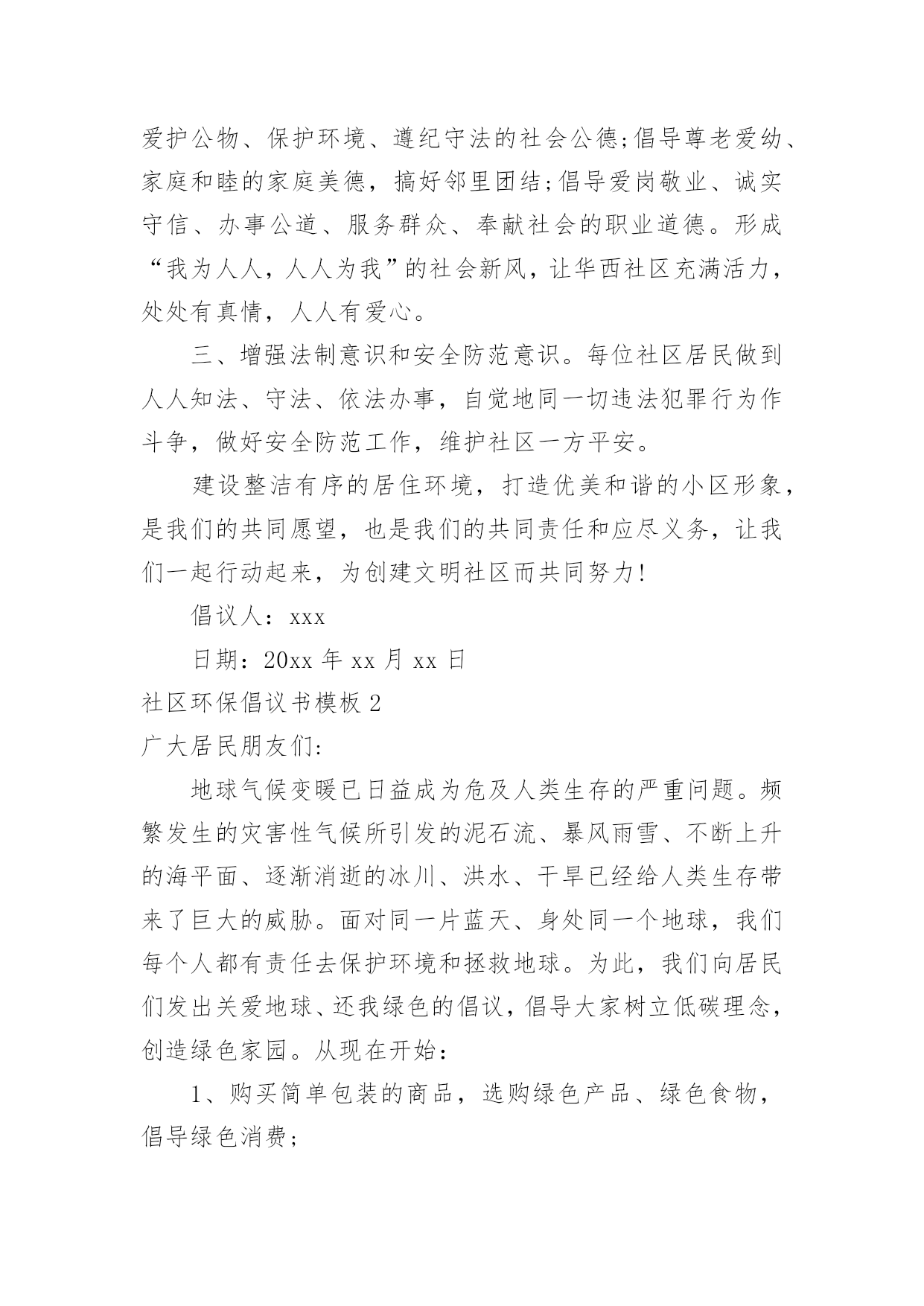 社区环保倡议书社区环保倡议书模板随着社会不断地进步,我们都可能会用到倡议书,倡议书一般由标题、称呼、正文、结尾、落款五部分组成。那么你有了解过倡议书吗?下面是小编帮大家整理的社区环保倡议书模板,仅供参考,欢迎大家阅读。社区环保倡议书模板1居民朋友们:大家好!根据沙坡头区有关文明社区创建精神,华西社区将以构建和谐社会,创建文明社区为目标,努力把华西社区创建成环境整洁、秩序安定、组织健全、服务完善、文化丰富、风尚良好的文明社区。“社区是我家,创建靠大家”,创建文明社区需要社区每个家庭、每一位居民的共同努力,共同参与。为此,我们特向社区广大居民发出以下倡议:一、争做文明居民。树立“人人清洁,人人受益”的意识,养成良好的.卫生习惯,积极维护社区公共卫生,保持楼道公用部位的整洁、清洁,楼上居民不往楼下乱抛乱丢垃圾、杂物。保持小区整洁美观,不乱吐乱扔,乱刻乱画,乱泼乱倒,乱牵乱挂,提倡用可降解塑料袋装垃圾,并且放入指定的地点。二、倡导文明新风尚。积极倡导文明礼貌、助人为乐、爱护公物、保护环境、遵纪守法的社会公德;倡导尊老爱幼、家庭和睦的家庭美德,搞好邻里团结;倡导爱岗敬业、诚实守信、办事公道、服务群众、奉献社会的职业道德。形成“我为人人,人人为我”的社会新风,让华西社区充满活力,处处有真情,人人有爱心。三、增强法制意识和安全防范意识。每位社区居民做到人人知法、守法、依法办事,自觉地同一切违法犯罪行为作斗争,做好安全防范工作,维护社区一方平安。建设整洁有序的居住环境,打造优美和谐的小区形象,是我们的共同愿望,也是我们的共同责任和应尽义务,让我们一起行动起来,为创建文明社区而共同努力!倡议人:xxx日期:20xx年xx月xx日社区环保倡议书模板2广大居民朋友们:地球气候变暖已日益成为危及人类生存的严重问题。频繁发生的灾害性气候所引发的泥石流、暴风雨雪、不断上升的海平面、逐渐消逝的冰川、洪水、干旱已经给人类生存带来了巨大的威胁。面对同一片蓝天、身处同一个地球,我们每个人都有责任去保护环境和拯救地球。为此,我们向居民们发出关爱地球、还我绿色的倡议,倡导大家树立低碳理念,创造绿色家园。从现在开始:1、购买简单包装的商品,选购绿色产品、绿色食物,倡导绿色消费;2、少用一次性制品(木筷、纸杯、纸巾等),减少垃圾,进行垃圾分类,回收资源;3、使用节能电器,电器使用后完全关闭电源,节约用电;适度使用空调;4、多骑自行车、多坐公交车,为节能减排出力;5、亲近大自然,参加植树造林活动,认养(捐植)一棵树木,寄托自己的理想,埋下自己的`愿望。6、关心爱护绿色生命,保护身边的绿化成果,广泛开展植绿、护绿、爱绿、兴绿文明活动,争做绿色文明使者,让我们家园的天更蓝、水更清、地更绿。7、让我们携手营造人人了解、重视、参与环保的良好氛围。为每个人喝上干净的水、呼吸到新鲜的空气、吃上放心的食物、享受到健康和快乐的生活尽一份责任!过低碳生活,做绿色公民!我们一起行动吧!倡议人:xxx日期:20xx年xx月xx日社区环保倡议书模板3尊敬的居民朋友们:一个绿色的地球是我们人类生存的先决条件。两千年的人类文明进程没有牺牲地球的绿色,但是两百年的现代文明却使我们绿色的地球日渐披黄蒙黑。人类在毁灭地球绿色的同时,也就是在逐步毁灭人类自己。看看我们周围干涸的'河流,污染的空气,漫天飞舞的白色垃圾和满地的瓜果碎屑.为此我们倡议:倡导从我做起、从身边的小事做起,保护好赖以生存的环境。倡导节约每一滴水,使用无磷洗涤用品,少用一次性餐具和塑料袋,不烧散煤,生活垃圾分类放置,绝食用野生动物。提倡穿着采用棉、麻、毛、丝绸等天然植物制作的"生态时装",食用无污染、无公害且安全、优质、营养的"绿色食品",使用无污染、低耗能、低噪音符合环保要求的家用电器,盛装物品使用"绿色包装",禁止"白色污染",搞好居室卫生,注重室内和庭院的绿化。积极参与爱鸟护鸟和保护野生动物活动,增强"人类只有一个地球"的忧患意识,坚决制止破坏生态和污染环境的一切违法行为。努力建设生态城市,绿化和美化我们和顺的家园,使我们生存的环境更加美好,舒适。希望大家的支持,相信大家会从身边的点滴小事作起!倡议人:xxx日期:20xx年xx月xx日社区环保倡议书模板4各位居民:社区是我们居住、生活的场所,是我们共同的家园,创建整洁、有序、优美的社区环境是我们共同的'心愿,社区环境直接关系着居民的起居生活,直接体现着社区自治的能力和社区文明程度。在此向全体居民发出如下倡议:一、爱护环境卫生,人人有责。二、自觉维护社区卫生的整洁,不乱倒垃圾,污物、不高空抛物。三、培养良好的卫生行为,不随地吐痰、便溺、乱扔果皮纸屑、烟头等废弃物四、不擅自在楼道内堆放杂物。五、养宠物的居民要及时清理宠物粪便,栓好犬链。六、爱护社区内的一草一木,不在绿化带内种菜等,