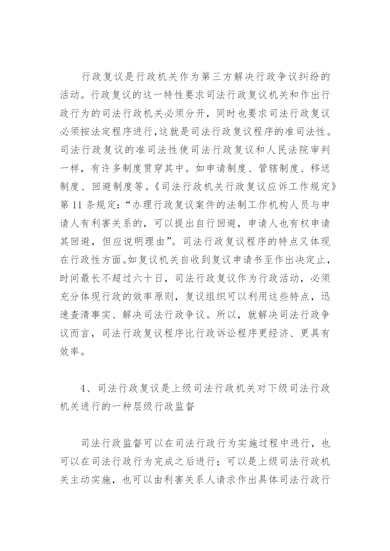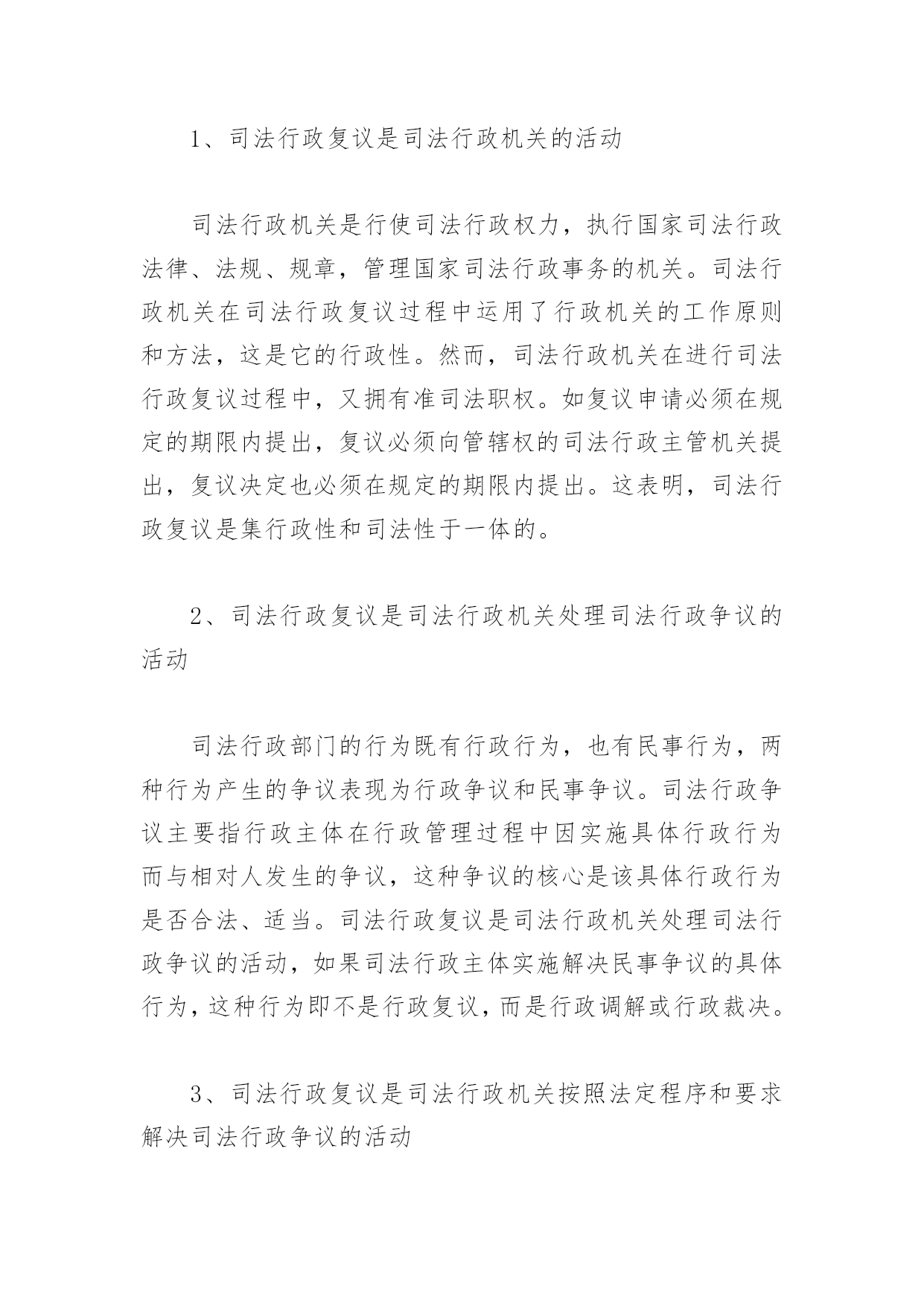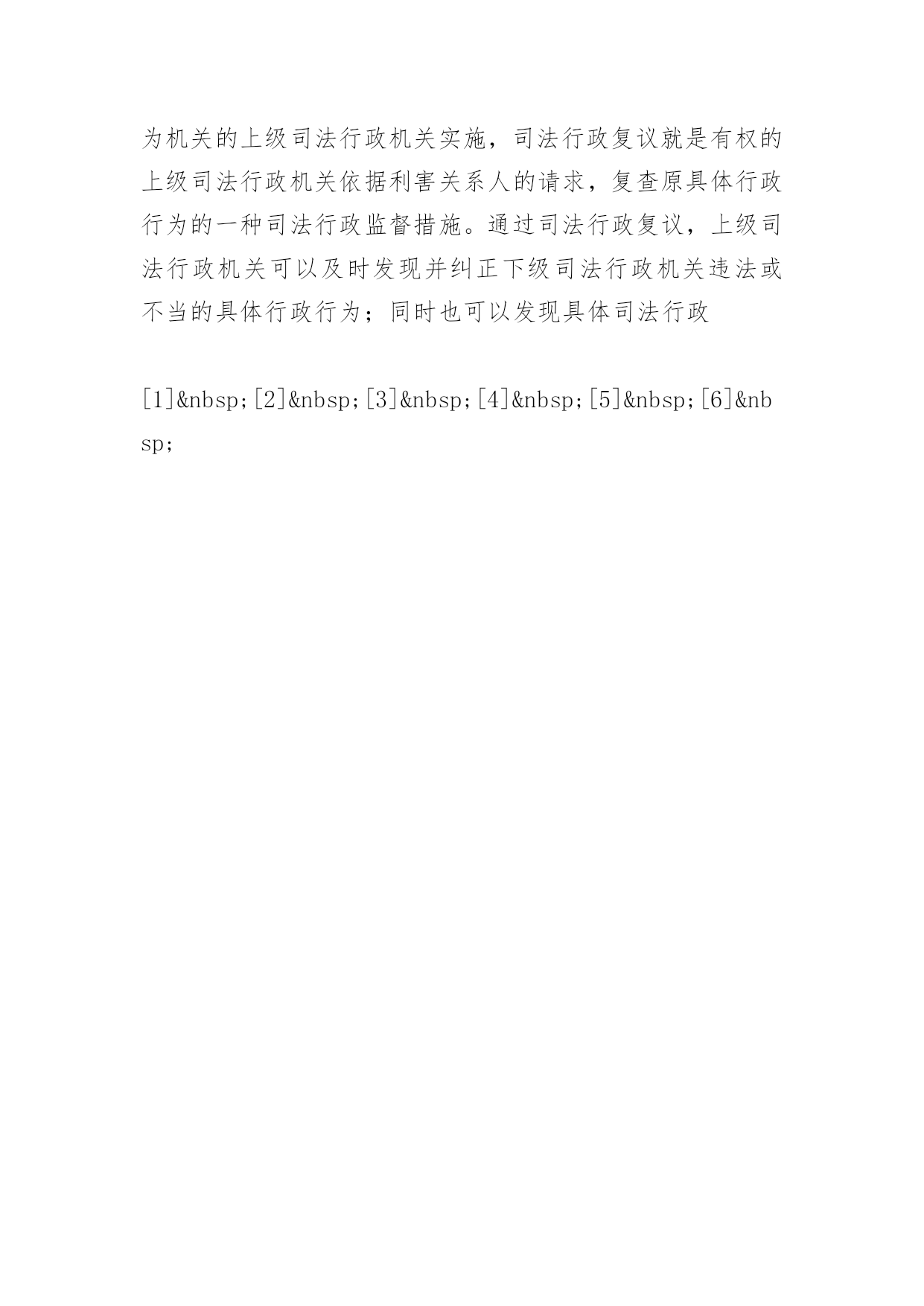 司法行政复议的范围、管辖及程序论文司法行政复议的范围、管辖及程序论文内容摘要:行政法上的救济制度,指有权机关对于行政主体的行政违法和行政不当行为实施的法律制度,行政复议是法律救济最主要途径之一。本文将重点分析司法行政机关行政复议的范围、管辖以及程序。关键词:司法行政复议范围管辖程序司法行政复议是指司法行政相对人(公民、法人和其他组织)不服司法行政机关的具体行政行为,依法向行政复议机关提出申请,请求重新审查并纠正原具体行政行为,行政复议机关据此对原具体行政行为是否合法、适当进行审查并作出决定的法律制度。司法行政复议的目的是为了纠正司法行政主体作出的违法或者不当的具体行政行为,以保护行政相对人的合法权益。《中华人民共和国行政复议法》(以下简称《行政复议法》)第1条规定:“为了防止和纠正违法的或不当的具体行政行为,保护公民、法人或者其他组织的合法权益,保障和监督行政机关依法行使职权,根据宪法制定本法”。这更加突出了司法行政复议监控司法行政权的功能。一、司法行政复议的特征1、司法行政复议是司法行政机关的活动司法行政机关是行使司法行政权力,执行国家司法行政法律、法规、规章,管理国家司法行政事务的机关。司法行政机关在司法行政复议过程中运用了行政机关的工作原则和方法,这是它的行政性。然而,司法行政机关在进行司法行政复议过程中,又拥有准司法职权。如复议申请必须在规定的期限内提出,复议必须向管辖权的司法行政主管机关提出,复议决定也必须在规定的期限内提出。这表明,司法行政复议是集行政性和司法性于一体的。2、司法行政复议是司法行政机关处理司法行政争议的活动司法行政部门的行为既有行政行为,也有民事行为,两种行为产生的争议表现为行政争议和民事争议。司法行政争议主要指行政主体在行政管理过程中因实施具体行政行为而与相对人发生的争议,这种争议的核心是该具体行政行为是否合法、适当。司法行政复议是司法行政机关处理司法行政争议的活动,如果司法行政主体实施解决民事争议的具体行为,这种行为即不是行政复议,而是行政调解或行政裁决。3、司法行政复议是司法行政机关按照法定程序和要求解决司法行政争议的活动行政复议是行政机关作为第三方解决行政争议纠纷的活动。行政复议的这一特性要求司法行政复议机关和作出行政行为的司法行政机关必须分开,同时也要求司法行政复议必须按法定程序进行,这就是司法行政复议程序的准司法性。司法行政复议的准司法性使司法行政复议和人民法院审判一样,有许多制度贯穿其中。如申请制度、管辖制度、移送制度、回避制度等。《司法行政机关行政复议应诉工作规定》第11条规定:“办理行政复议案件的法制工作机构人员与申请人有利害关系的,可以提出自行回避,申请人也有权申请其回避,但应说明理由”。司法行政复议程序的特点又体现在行政性方面。如复议机关自收到复议申请书至作出决定止,时间最长不超过六十日,司法行政复议作为行政活动,必须充分体现行政的效率原则,复议组织可以利用这些特点,迅速查清事实、解决司法行政争议。所以,就解决司法行政争议而言,司法行政复议程序比行政诉讼程序更经济、更具有效率。4、司法行政复议是上级司法行政机关对下级司法行政机关进行的一种层级行政监督司法行政监督可以在司法行政行为实施过程中进行,也可以在司法行政行为完成之后进行;可以是上级司法行政机关主动实施,也可以由利害关系人请求作出具体司法行政行为机关的上级司法行政机关实施,司法行政复议就是有权的上级司法行政机关依据利害关系人的请求,复查原具体行政行为的一种司法行政监督措施。通过司法行政复议,上级司法行政机关可以及时发现并纠正下级司法行政机关违法或不当的具体行政行为;同时也可以发现具体司法行政[1] [2] [3] [4] [5] [6]