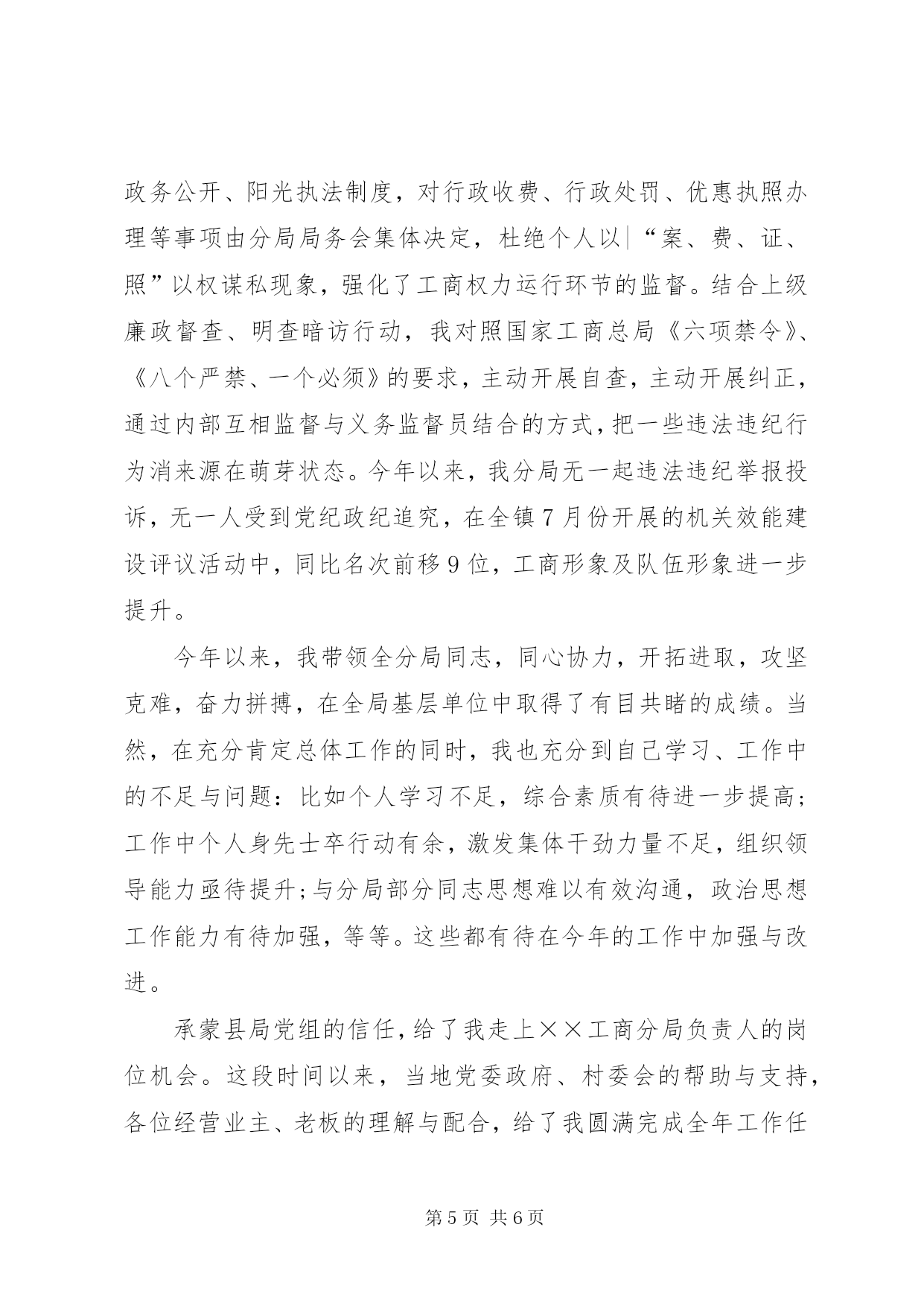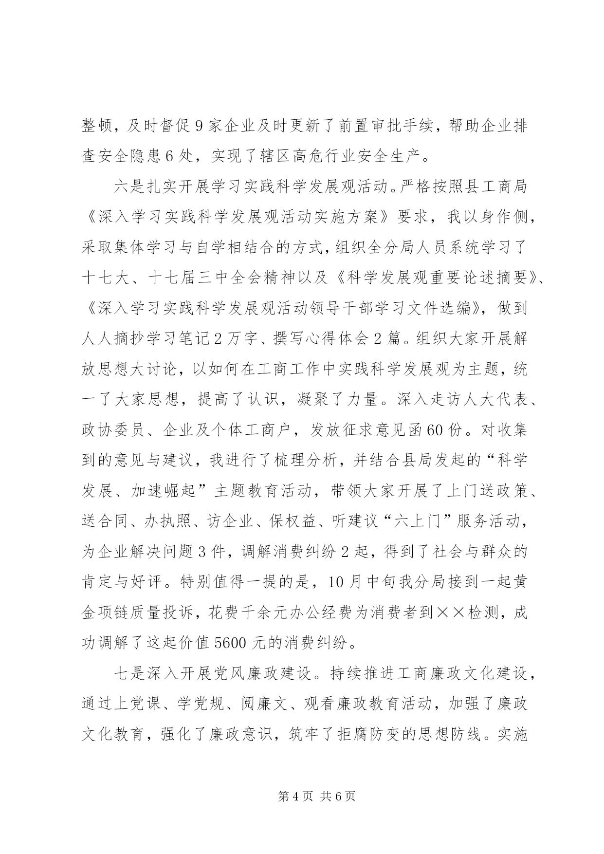 第PAGE\*Arabic\*MERGEFORMAT6页共NUMPAGES\*MERGEFORMAT6页工商局局长述职述廉报告根据安排,县局今天到我们这里开展述职述廉活动。所以,有机会荣幸地把大家请到这里来,对我们的工作进行指导、评议。在此,我代表××工商分局对大家的到来表示热烈的欢迎。今年以来,××工商分局切实实践科学发展观,按照国家工商总局监管与发展、服务、维权、执法“四个统一”的要求,严格落实县局工作部署,与地方合力合拍、同轴共转,深入整顿和规范市场秩序,有效维护消费者合法权益,积极服务××地方经济社会发展,大力加强队伍及工商廉政文化建设,我团结带领全分局工作人员,拼搏进取,恪尽职守,在同志们的共同努下,取得了提前完成年度工作目标、效能建设名次大幅前移的良好成绩,其中商品大世界市场整顿、食品安全监管等几项工作,得到了镇党委政府的肯定与表扬。下面,我就今年以来主要工作分七个方面向大家汇报如下:一是狠抓食品市场监管。由于历史传统饮食习惯的原因,××一直是食品安全监管的重点地区,食品安全监管责任重大,来不得丝毫懈怠。我从构建食品市场监管长效机制入手,以超市、食品批发店、奶粉店为主,扎实落实市场主体准入制、进销货台帐制、不合格商品退市等制度,进一步完善了商品上市安全“过滤网”。实行食品监管定人员、定辖区、定责任,每两人负责一个片区,在当街日以“六查六看”为标准开展市场巡查,及时清查市场上的不合格食品。以专项整治为突破口,相继开展了啤酒、饮料、婴儿食品、粮油肉菜等市场专项整治,查获过期婴儿米粉200余瓶、不合格月饼300多斤、无qs标志食品100多盒;捣毁群众反映强烈的制售病死猪肉窝点一处,查获病死猪肉840斤,罚款5000元,杜绝了本地市场上公然制售病死猪死的行为。二是着力维护农资消费安全。加强农资经营户守法经营教育,在年初就组织召开了一次农资经营户座谈会,组织学习了农资市场监管文件及相关法律法规,并与经营户签订了《守法经营承诺书》。通过加盟县供销社新农资公司形式,理顺了辖区内6户农资经营户经营主体资格问题。结合“12315”消费维权网络进农村工程,在各个行政设立了农资打假维权联系点,配合了兼职联络员,及时收集农户关于农资的质量意见。开展了“红盾打假护农”专项行动,协助县局对辖区内2户销售不合格化肥的经营户进行查处,查获劣质复肥11吨,罚款4650元。四是深入开展清理无照经营工作。清理无照经营是今年全国整顿市场经济秩序的一项重点工作,已经形成了政府统一领导、部门各司其责的工作格局。针对部分经营持照经营的观念淡薄,到县城办理前置审批手续麻烦等现状。采取加强法律法规宣传、邀请有关职能部门到××现场办公等办法,逐户上门下发《催办营业执照通知书》,发动督促56户经营户办理了执照。对部分拒不前来办照的,我们会同公安等部门,取缔无照经营户13户,立案查处5起,罚款7000元。五是尽心尽力服务地方发展。结合无照经营清理行动,上门到户发放关于个私经济发展措施、优惠政策、设立登记程序宣传资料,大力营造全民创业的舆论氛围。简化注册登记程序和条件,协助经营业主办理前置审批手续,提供咨询、上门、预约等服务,严格落实“一审一核”、当场办理制度,为服务全民创业市场准入降低门槛、畅通渠道。今年以来共发展个体工商户187户,私营企业10户(公司3户、合伙企业1户、个人独资企业6户),激活民间创业资金1000多万元。坚决落实再就业优惠政策,办理下岗优惠执照2户,办理返乡农民工营业执照16户,支持其向金融部门申请到创业贷款86万元,积极推动社会就业和再就业工程。引导、扶持××山百合、杨梅、××薯粉丝等当地特色农产品运用商标、广告策略,进一步提高××土特产的市场知名度,大力推进“一村一品”特色农业产业化发展。大力开展校园周力环境整治,在镇政府统一领导下,会同公安、综治、村委会,出动执法人员50多人次,下达整改通知书20份,取缔黑网吧一家,查获上网电脑11台;取缔校门口无照副食品、小饮食摊店18户工商局局长述职述廉报告,家长担忧、学校担心的学生购买食用麻辣等劣质食品的现象有所改观,校园周边环境明显优化。加强对煤矿、采石场、液化汽站等高危行业的日常巡查,责令2家无照经营的采石场停业整顿,及时督促9家企业及时更新了前置审批手续,帮助企业排查安全隐患6处,实现了辖区高危行业安全生产。六是扎实开展学习实践科学发展观活动。严格按照县工商局《深入学习实践科学发展观活动实施方案》要求,我以身作侧,采取集体学习与自学相结合的方式,组织全分局人员系统学习了十七大、十七届三中全会精神以及《科学发展观重要论述摘要》、《深入学习实践科学发展观活动领导干部学习文件选编》,做到人人摘抄学习笔记2万字、撰写心得体会2篇。组织大家开展解放思想大讨论,以如何在工商工作中实践科