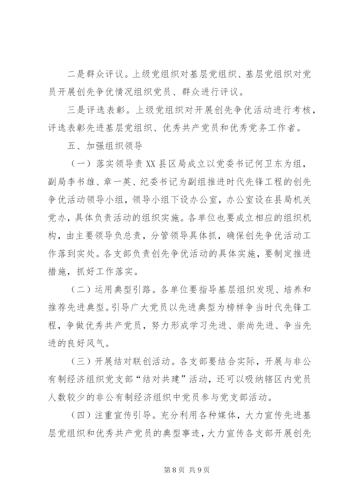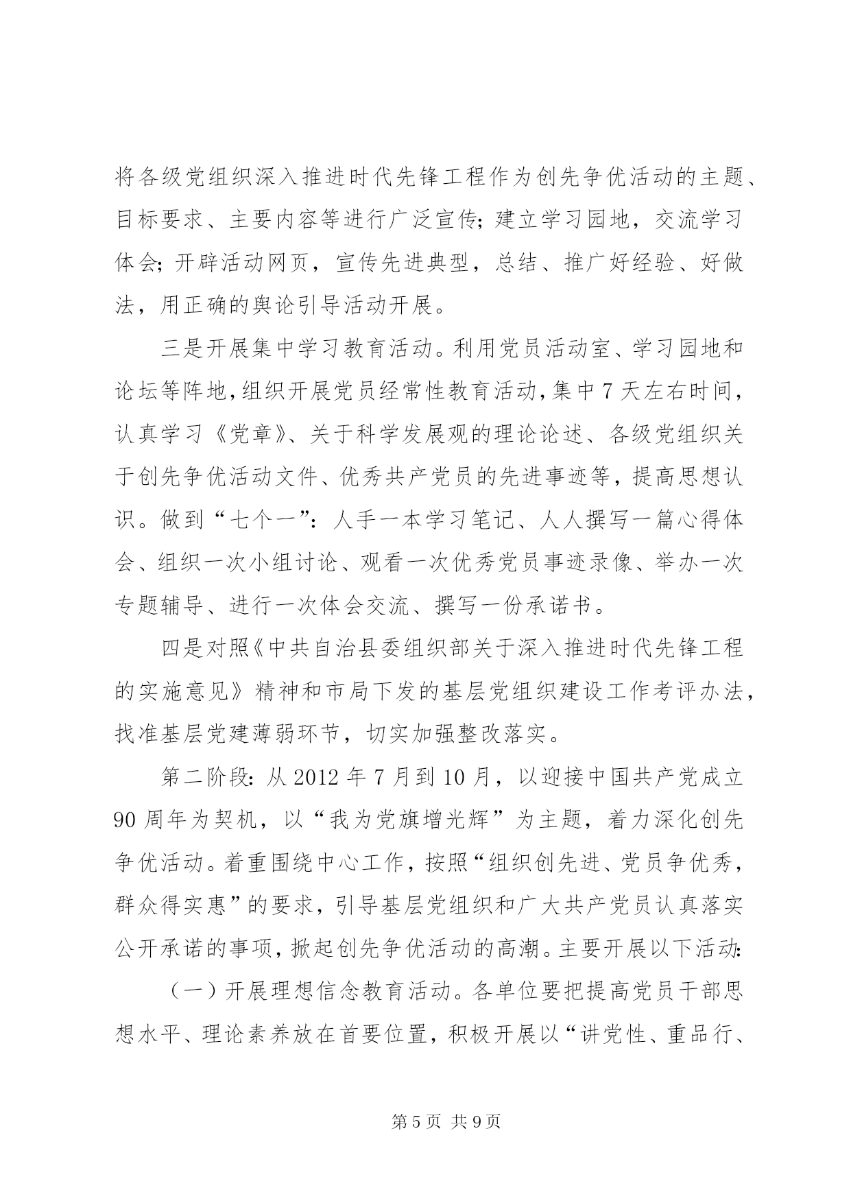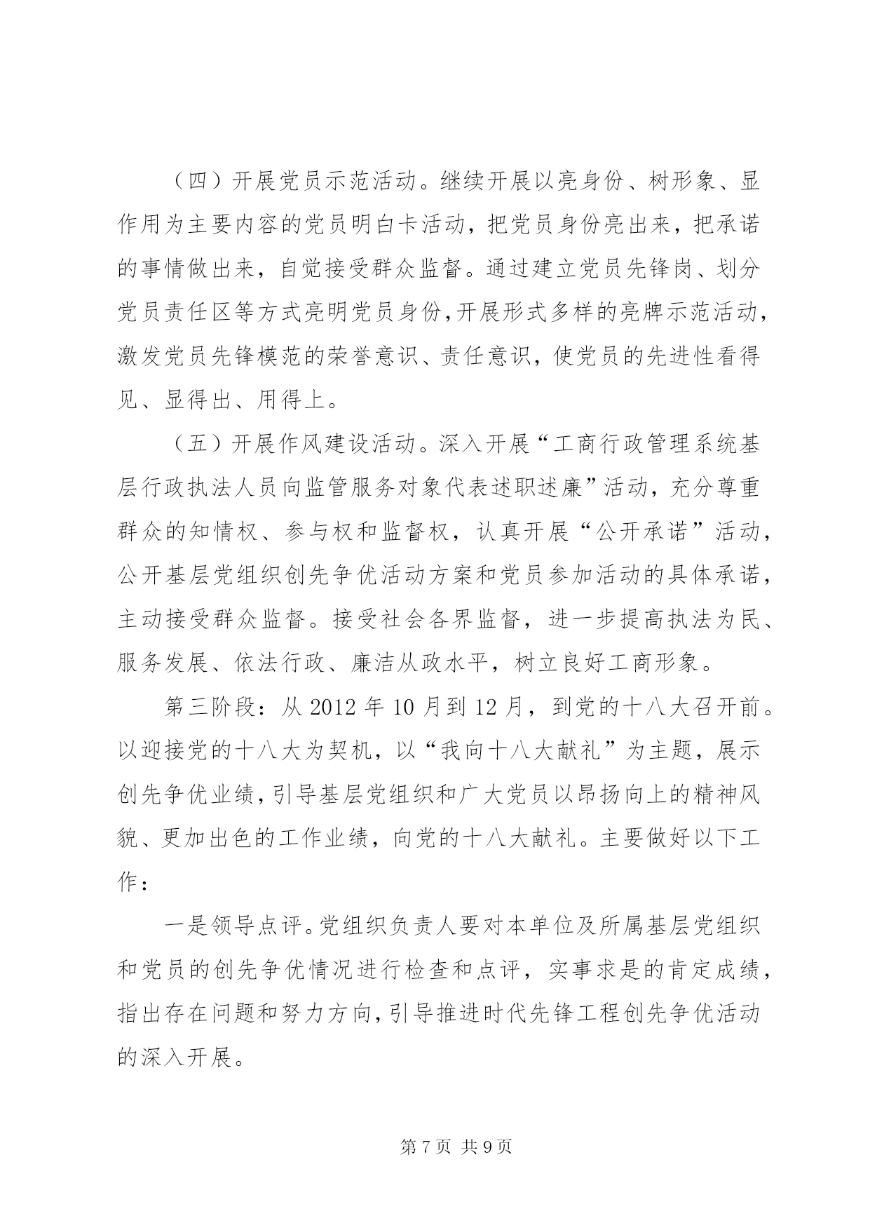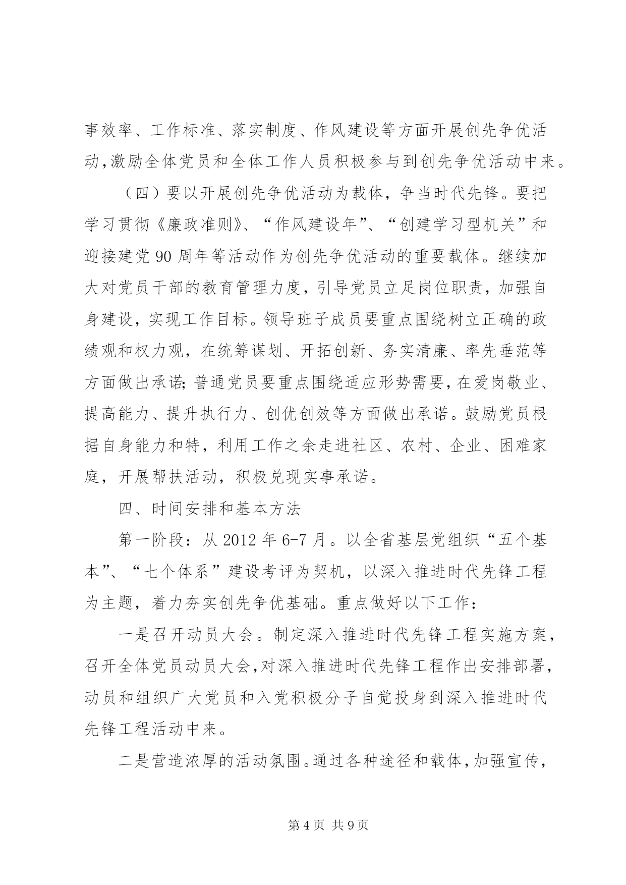 第PAGE\*Arabic\*MERGEFORMAT9页共NUMPAGES\*MERGEFORMAT9页工商局推进时代先锋工程方案为继续推动学习实践科学发展观活动向深度和广度发展,激励全体党员进一步增强先锋意识、实践先锋要求、树立先锋形象,增强党组织的创造力、凝聚力和战斗力,保持和发展党员队伍先进性,根据《中共自治县委组织部关于深入推进时代先锋工程的实施意见》(组〔2012〕4号)精神,结合县工商局实际,现就深入推进时代先锋工程制定以下实施方案。一、指导思想认真贯彻落实党的十七大和十七届四中全会精神,以邓小平理论和“三个代表”重要思想为指导,以深入学习实践科学发展观为主题,以加强党员队伍先进性建设为主线,突出建设服务型党组织,深入开展“践行科学发展、争当时代先锋”创先争优活动,充分发挥党组织争当推动发展、服务群众、凝聚人心、促进和谐的先锋,激励广大党员争做心系群众、服务发展的先锋,为推动经济社会发展提供组织保障。二、基本原则(一)紧扣中心、服务大局。紧紧围绕推进依法行政和对促进工商部门服务经济发展、履行职能到位、实现工商行政管理事业的新发展开展活动,用是否调动了党员干部和全体工作人员的积极性,是否改进服务质量、提高办事效率、圆满完成任务来检验活动成效。(二)搞好结合、精心组织。根据2012年工商局工作要点、目标任务和工作特点,结合近年来开展的系列争创活动成果,精心设计活动载体,增强活动吸引力。(三)选树典型、营造氛围。注重发现和总结身边典型的人和事,用生动事例教育党员干部,努力营造“争当先进光荣、不思进取可耻”的浓厚氛围。(四)立足本职、注重实效。从本职工作和群众需要出发,从改进工作作风、提高服务水平方面做起,通过开展活动让党员干部看到变化、增强信心、提高素质。三、基本要求通过开展创先争优活动,努力促进我局党建工作机制进一步完善,党委和党员践行科学发展的能力进一步提升,党群干群鱼水关系进一步密切,和谐稳定发展局面进一步巩固。(一)党委要努力做到“五个好”。一是领导班子好。坚决贯彻党的路线方针政策,全面落实科学发展观,认真执行上级党组织的各项指示、决议;坚持民主集中制,班子团结协作,廉洁自律,有较强的凝聚力和战斗力。二是党员队伍好。党员有较强的党性意识,讲学习、讲政治、讲正气,整体素质优良、富有活力,先锋模范作用发挥明显。三是工作机制好。各项规章制度完善,落实和管理到位,考核奖惩机制科学规范,工作运行顺畅有序。四是工作业绩好。开拓创新,求真务实,在机关组织的各项活动和目标管理考核中成绩显著,没有发生违法违纪问题,社会治安综合治理工作达标,机关文化氛围浓厚。五是群众反映好。党组织在群众中有较高威信,党员在群众中有良好形象,党群干群关系密切,群众满意度在90%以上。(二)党员要努力做到“五带头”。一是带头学习提高。重视学习、善于学习、终身学习,坚持学以致用、学用相。深入学习实践科学发展观,自觉做到真学真懂真信真用;认真学习与本职工作相关业务知识,努力提高履行职责能力。二是带头争创佳绩。具有强烈的事业心和责任感,埋头苦干、开拓进取、乐于奉献,不甘落后,努力争先,在本职岗位做出一流成绩。三是带头服务群众。牢记宗旨,心系群众,热情服务、文明服务,主动帮助服务对象排忧解难,自觉维护群众正当权益,做服务对象的信赖人、贴心人。四是带头遵纪守法。模范执行党组织的各项决议,严格遵守国家法律法规,自觉遵守机关和本办各项规章制度。五是带头弘扬正气。积极践行社会主义核心价值体系,树立正确的人生观、利益观、价值观和荣辱观,遵守社会公德、职业道德和家庭美德,敢于同不良风气、违纪违法行为作斗争。(三)开展创先争优活动,要以“学赶先进、干事创业、争当先锋”为载体,明确目标要求,教育和引导全体党员干部立足本职岗位,干一流工作,创一流佳绩,在“比、学、赶、超”中争当先锋。各个股室要结合本职岗位工作特点,在服务态度、办事效率、工作标准、落实制度、作风建设等方面开展创先争优活动,激励全体党员和全体工作人员积极参与到创先争优活动中来。(四)要以开展创先争优活动为载体,争当时代先锋。要把学习贯彻《廉政准则》、“作风建设年”、“创建学习型机关”和迎接建党90周年等活动作为创先争优活动的重要载体。继续加大对党员干部的教育管理力度,引导党员立足岗位职责,加强自身建设,实现工作目标。领导班子成员要重点围绕树立正确的政绩观和权力观,在统筹谋划、开拓创新、务实清廉、率先垂范等方面做出承诺;普通党员要重点围绕适应形势需要,在爱岗敬业、提高能力、提升执行力、创优创效等方面做出承诺。鼓励党员根据自身能力和特,利用工作之余走进社区、农村、企业、困难家庭,开展帮扶活动,积极兑现实事承诺。四、时间安排和基本方法第一阶段:从2012年6-7月。以全省基层党组织“五个基本”、