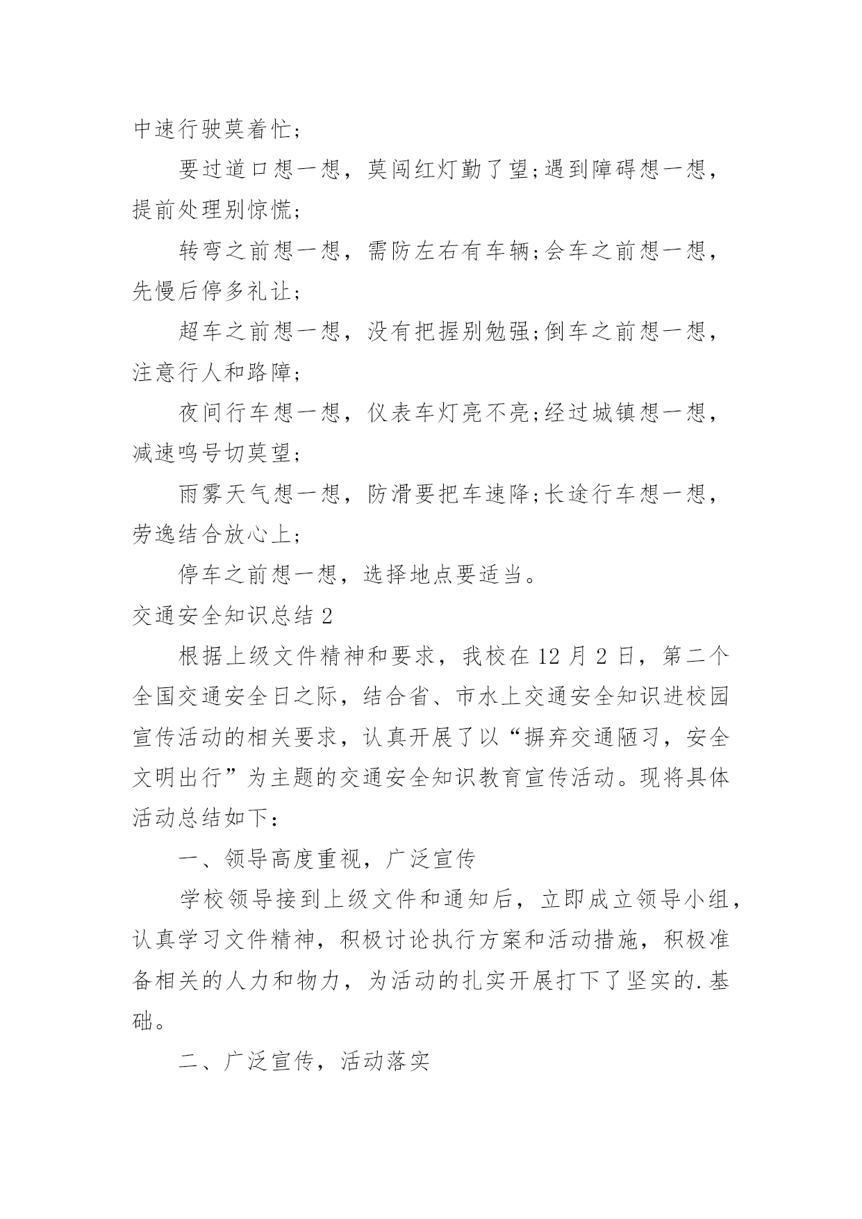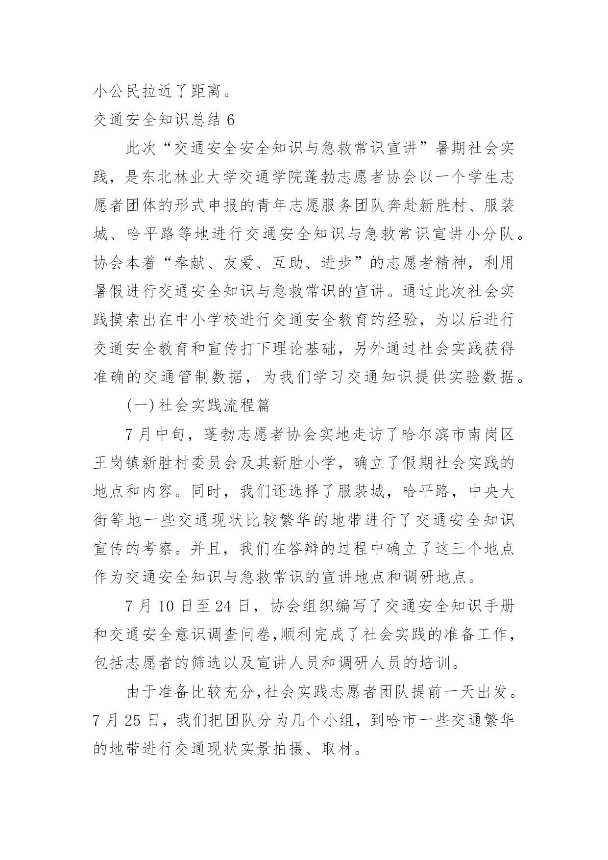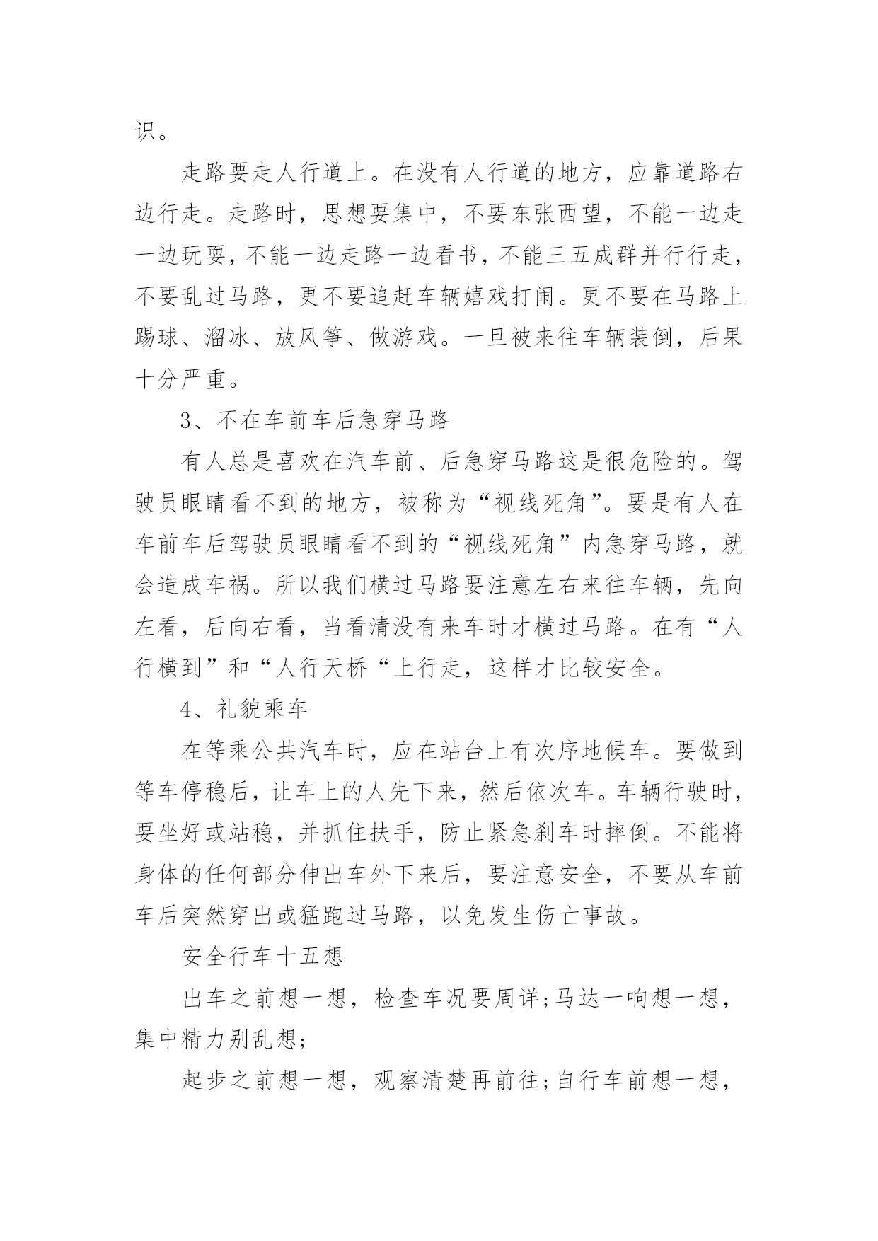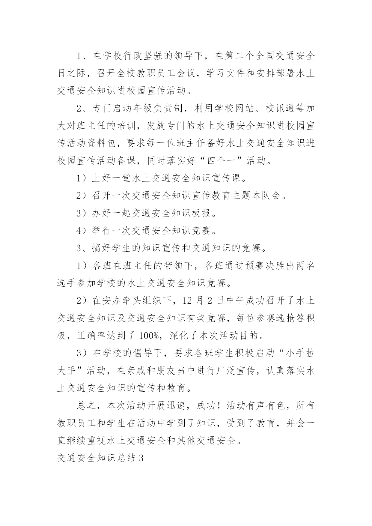 交通安全知识总结交通安全知识总结(汇编12篇)总结是在某一时期、某一项目或某些工作告一段落或者全部完成后进行回顾检查、分析评价,从而得出教训和一些规律性认识的一种书面材料,它可以促使我们思考,让我们一起认真地写一份总结吧。如何把总结做到重点突出呢?以下是小编为大家收集的交通安全知识总结,欢迎阅读,希望大家能够喜欢。交通安全知识总结1人的一生就只有一次生命,我们应该爱惜生命。注意交通安全也是爱惜生命的一部分。交通安全知识点总结最新有哪些你知道吗?共同阅读交通安全知识点总结最新,请您阅读!交通安全知识点总结1、行走安全:行人须在人行道内行走,没有人行道靠右边行走;穿越马路须走人行横道;通过有效通信号控制的人行道,须遵守信号的规定;通过没有交通信号控制的人行道,要左顾右盼,注意来往车辆,不准追逐,奔跑;没有行人横道的,须直行通过,不准在车辆临近时突然横穿;有人行过街天桥或地道的,须走人行过街天桥或地道;不准爬越马路边和路中的护栏、隔离栏,不准在道路上扒车、追车、强行拦车或抛物击车。2、骑自行车(电动车、摩托车)安全:不满16周岁不能在道路上骑电动车、摩托车;不打伞骑车;不脱手骑车;不骑车带人;不骑“病”车;不骑快车;不与机动车抢道;不平行骑车;不在恶劣天气骑车。3、乘车安全:乘公共汽车要停稳后上下车,在车上要抓好扶手,头、手等身体部位不能伸出窗外,管好身边物品,防止扒窃;乘高速汽车要系安全带;不乘超载车。小学生交通安全知识1、汽车不是一刹车就停的有的学生认为乱过马路没有什么关系,反正驾驶员会刹车的。其实,汽车不是一刹就停的。由于惯性作用,刹车后车还会向前滑一段路,这就是力的惯性作用。就像人在奔跑中,突然停下来,还会不由自主地身前冲几步一样。何况还有可能驾驶员不注意,刹车不灵等。所以,乱穿马路是十分危险的,不少交通事故就是因为行人乱过马路造成的。血的教训应当引以为戒。2、安全走路走路,谁不会呢?其实不然,如果我们不注意交通安全,走路就会闯祸。所以上学读书、放学回家、节假日外出时走在人来车往的交通繁忙的`道路上,要遵守交通规则,增强自我保护意识。走路要走人行道上。在没有人行道的地方,应靠道路右边行走。走路时,思想要集中,不要东张西望,不能一边走一边玩耍,不能一边走路一边看书,不能三五成群并行行走,不要乱过马路,更不要追赶车辆嬉戏打闹。更不要在马路上踢球、溜冰、放风筝、做游戏。一旦被来往车辆装倒,后果十分严重。3、不在车前车后急穿马路有人总是喜欢在汽车前、后急穿马路这是很危险的。驾驶员眼睛看不到的地方,被称为“视线死角”。要是有人在车前车后驾驶员眼睛看不到的“视线死角”内急穿马路,就会造成车祸。所以我们横过马路要注意左右来往车辆,先向左看,后向右看,当看清没有来车时才横过马路。在有“人行横到”和“人行天桥“上行走,这样才比较安全。4、礼貌乘车在等乘公共汽车时,应在站台上有次序地候车。要做到等车停稳后,让车上的人先下来,然后依次车。车辆行驶时,要坐好或站稳,并抓住扶手,防止紧急刹车时摔倒。不能将身体的任何部分伸出车外下来后,要注意安全,不要从车前车后突然穿出或猛跑过马路,以免发生伤亡事故。安全行车十五想出车之前想一想,检查车况要周详;马达一响想一想,集中精力别乱想;起步之前想一想,观察清楚再前往;自行车前想一想,中速行驶莫着忙;要过道口想一想,莫闯红灯勤了望;遇到障碍想一想,提前处理别惊慌;转弯之前想一想,需防左右有车辆;会车之前想一想,先慢后停多礼让;超车之前想一想,没有把握别勉强;倒车之前想一想,注意行人和路障;夜间行车想一想,仪表车灯亮不亮;经过城镇想一想,减速鸣号切莫望;雨雾天气想一想,防滑要把车速降;长途行车想一想,劳逸结合放心上;停车之前想一想,选择地点要适当。交通安全知识总结2根据上级文件精神和要求,我校在12月2日,第二个全国交通安全日之际,结合省、市水上交通安全知识进校园宣传活动的相关要求,认真开展了以“摒弃交通陋习,安全文明出行”为主题的交通安全知识教育宣传活动。现将具体活动总结如下:一、领导高度重视,广泛宣传学校领导接到上级文件和通知后,立即成立领导小组,认真学习文件精神,积极讨论执行方案和活动措施,积极准备相关的人力和物力,为活动的扎实开展打下了坚实的.基础。二、广泛宣传,活动落实1、在学校行政坚强的领导下,在第二个全国交通安全日之际,召开全校教职员工会议,学习文件和安排部署水上交通安全知识进校园宣传活动。2、专门启动年级负责制,利用学校网站、校讯通等加大对班主任的培训,发放专门的水上交通安全知识进校园宣传活动资料包,要求每一位班主任备好水上交通安全知识进校园宣传活动备课,同时落实好“四个一”活动。1)上好一堂水上交通安全知识宣传课。2)召开一次交通安全知识宣传教育主题本队会。3)办好一起交通安全知识板报。4)举