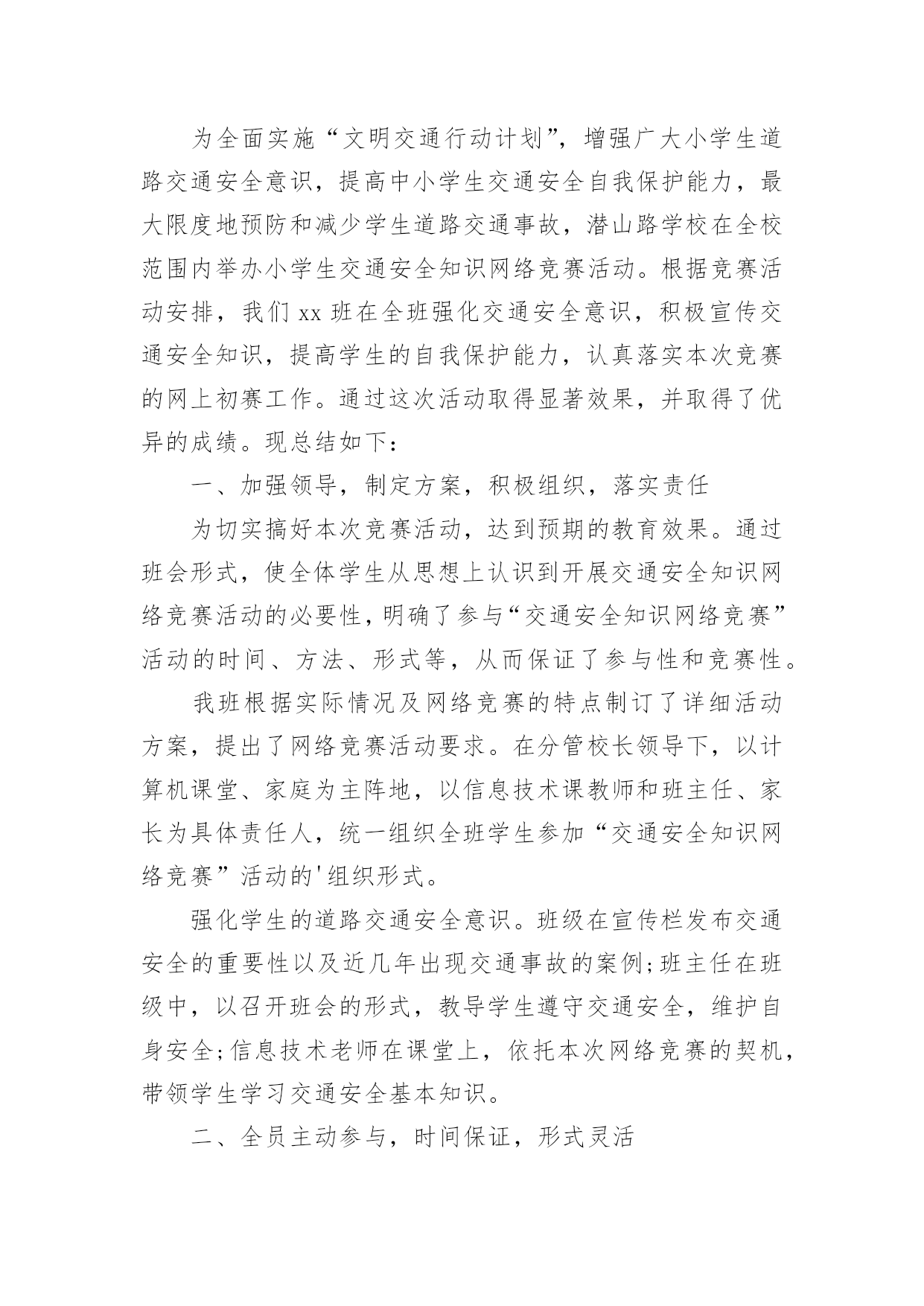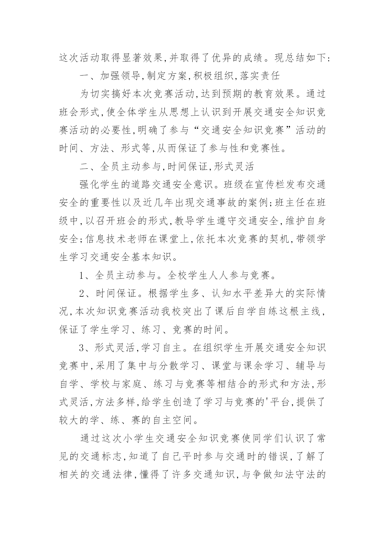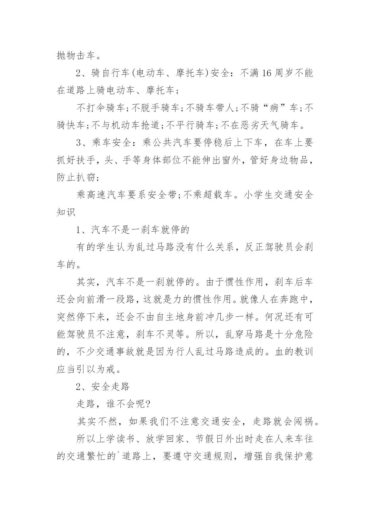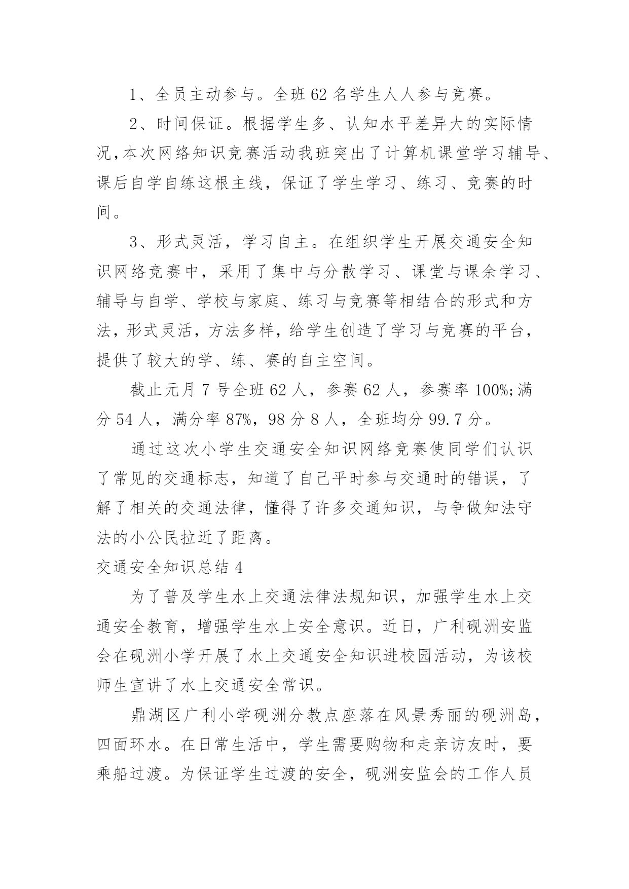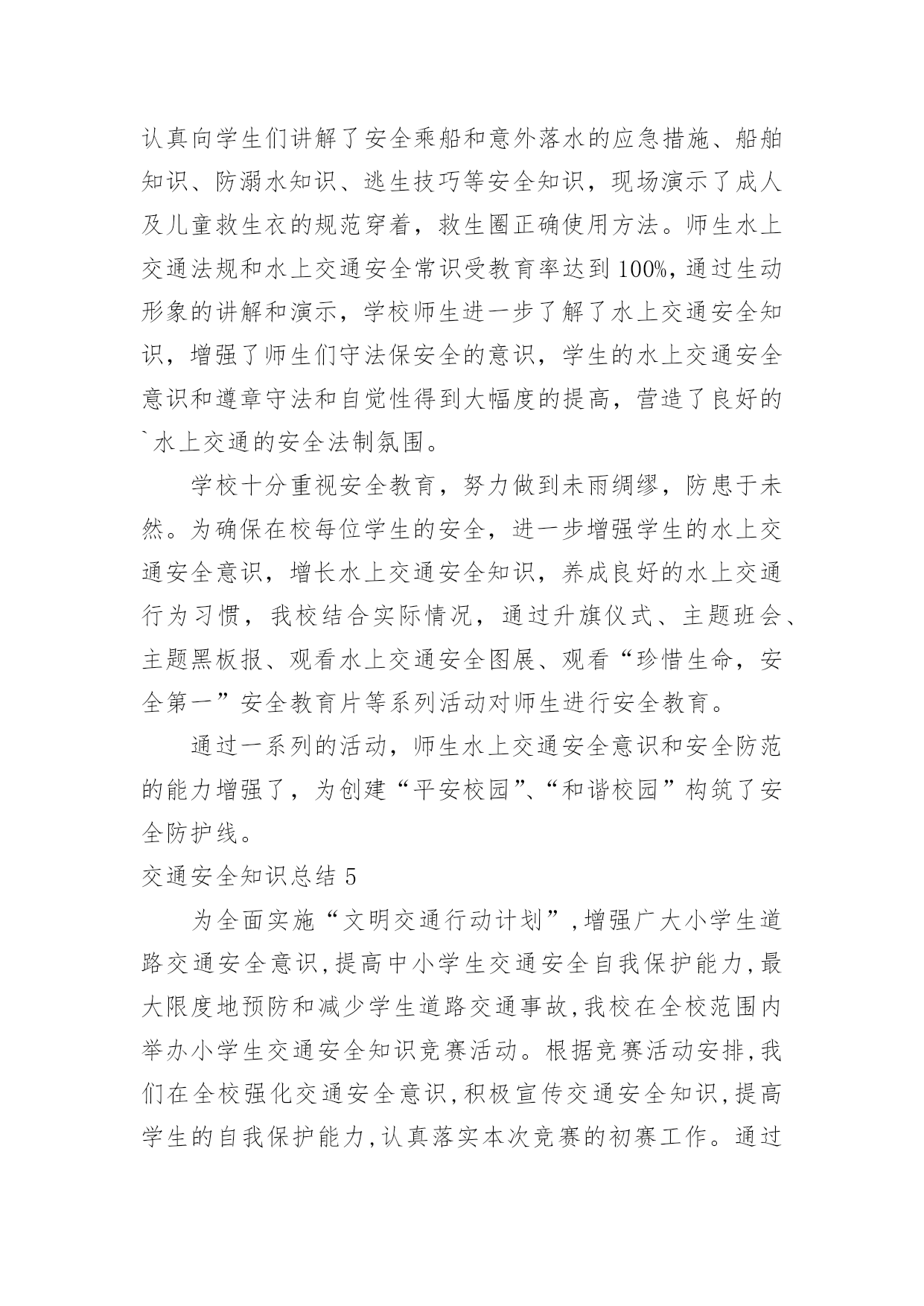 交通安全知识总结交通安全知识总结(汇编12篇)总结是在某一时期、某一项目或某些工作告一段落或者全部完成后进行回顾检查、分析评价,从而得出教训和一些规律性认识的一种书面材料,它可以促使我们思考,让我们一起认真地写一份总结吧。如何把总结做到重点突出呢?以下是小编为大家收集的交通安全知识总结,欢迎阅读,希望大家能够喜欢。交通安全知识总结1人的一生就只有一次生命,我们应该爱惜生命。注意交通安全也是爱惜生命的一部分。交通安全知识点总结最新有哪些你知道吗?共同阅读交通安全知识点总结最新,请您阅读!交通安全知识点总结1、行走安全:行人须在人行道内行走,没有人行道靠右边行走;穿越马路须走人行横道;通过有效通信号控制的人行道,须遵守信号的规定;通过没有交通信号控制的人行道,要左顾右盼,注意来往车辆,不准追逐,奔跑;没有行人横道的,须直行通过,不准在车辆临近时突然横穿;有人行过街天桥或地道的,须走人行过街天桥或地道;不准爬越马路边和路中的护栏、隔离栏,不准在道路上扒车、追车、强行拦车或抛物击车。2、骑自行车(电动车、摩托车)安全:不满16周岁不能在道路上骑电动车、摩托车;不打伞骑车;不脱手骑车;不骑车带人;不骑“病”车;不骑快车;不与机动车抢道;不平行骑车;不在恶劣天气骑车。3、乘车安全:乘公共汽车要停稳后上下车,在车上要抓好扶手,头、手等身体部位不能伸出窗外,管好身边物品,防止扒窃;乘高速汽车要系安全带;不乘超载车。小学生交通安全知识1、汽车不是一刹车就停的有的学生认为乱过马路没有什么关系,反正驾驶员会刹车的。其实,汽车不是一刹就停的。由于惯性作用,刹车后车还会向前滑一段路,这就是力的惯性作用。就像人在奔跑中,突然停下来,还会不由自主地身前冲几步一样。何况还有可能驾驶员不注意,刹车不灵等。所以,乱穿马路是十分危险的,不少交通事故就是因为行人乱过马路造成的。血的教训应当引以为戒。2、安全走路走路,谁不会呢?其实不然,如果我们不注意交通安全,走路就会闯祸。所以上学读书、放学回家、节假日外出时走在人来车往的交通繁忙的`道路上,要遵守交通规则,增强自我保护意识。走路要走人行道上。在没有人行道的地方,应靠道路右边行走。走路时,思想要集中,不要东张西望,不能一边走一边玩耍,不能一边走路一边看书,不能三五成群并行行走,不要乱过马路,更不要追赶车辆嬉戏打闹。更不要在马路上踢球、溜冰、放风筝、做游戏。一旦被来往车辆装倒,后果十分严重。3、不在车前车后急穿马路有人总是喜欢在汽车前、后急穿马路这是很危险的。驾驶员眼睛看不到的地方,被称为“视线死角”。要是有人在车前车后驾驶员眼睛看不到的“视线死角”内急穿马路,就会造成车祸。所以我们横过马路要注意左右来往车辆,先向左看,后向右看,当看清没有来车时才横过马路。在有“人行横到”和“人行天桥“上行走,这样才比较安全。4、礼貌乘车在等乘公共汽车时,应在站台上有次序地候车。要做到等车停稳后,让车上的人先下来,然后依次车。车辆行驶时,要坐好或站稳,并抓住扶手,防止紧急刹车时摔倒。不能将身体的任何部分伸出车外下来后,要注意安全,不要从车前车后突然穿出或猛跑过马路,以免发生伤亡事故。安全行车十五想出车之前想一想,检查车况要周详;马达一响想一想,集中精力别乱想;起步之前想一想,观察清楚再前往;自行车前想一想,中速行驶莫着忙;要过道口想一想,莫闯红灯勤了望;遇到障碍想一想,提前处理别惊慌;转弯之前想一想,需防左右有车辆;会车之前想一想,先慢后停多礼让;超车之前想一想,没有把握别勉强;倒车之前想一想,注意行人和路障;夜间行车想一想,仪表车灯亮不亮;经过城镇想一想,减速鸣号切莫望;雨雾天气想一想,防滑要把车速降;长途行车想一想,劳逸结合放心上;停车之前想一想,选择地点要适当。交通安全知识总结2根据上级文件精神和要求,我校在12月2日,第二个全国交通安全日之际,结合省、市水上交通安全知识进校园宣传活动的相关要求,认真开展了以“摒弃交通陋习,安全文明出行”为主题的交通安全知识教育宣传活动。现将具体活动总结如下:一、领导高度重视,广泛宣传学校领导接到上级文件和通知后,立即成立领导小组,认真学习文件精神,积极讨论执行方案和活动措施,积极准备相关的人力和物力,为活动的扎实开展打下了坚实的.基础。二、广泛宣传,活动落实1、在学校行政坚强的领导下,在第二个全国交通安全日之际,召开全校教职员工会议,学习文件和安排部署水上交通安全知识进校园宣传活动。2、专门启动年级负责制,利用学校网站、校讯通等加大对班主任的培训,发放专门的水上交通安全知识进校园宣传活动资料包,要求每一位班主任备好水上交通安全知识进校园宣传活动备课,同时落实好“四个一”活动。1)上好一堂水上交通安全知识宣传课。2)召开一次交通安全知识宣传教育主题本队会。3)办好一起交通安全知识板报。4)举