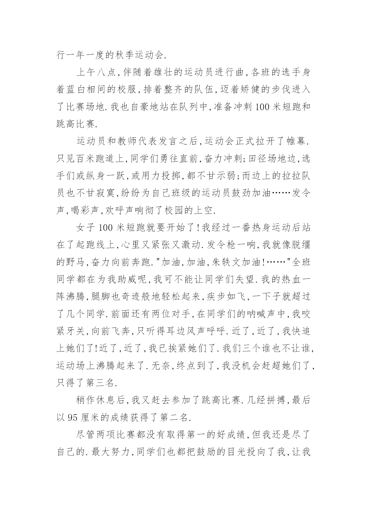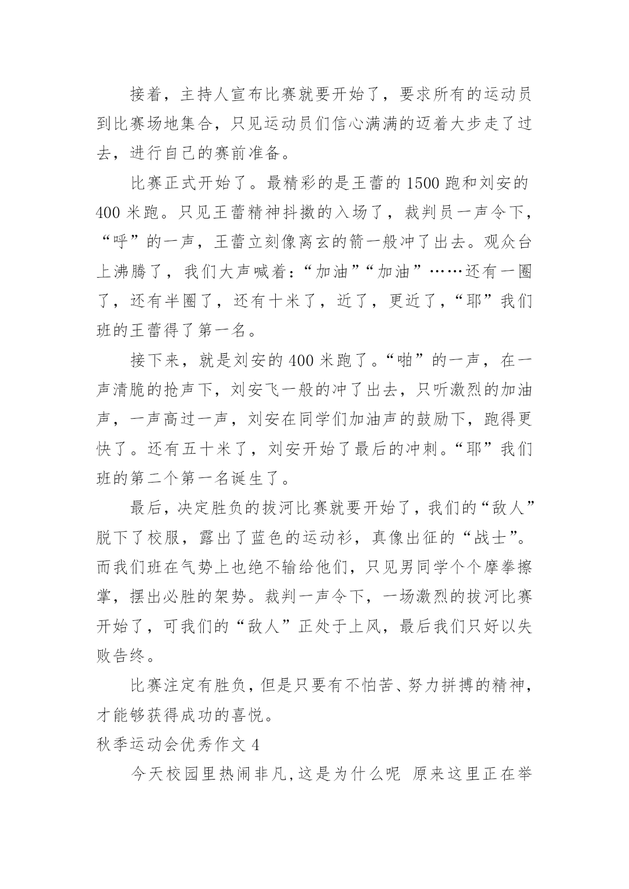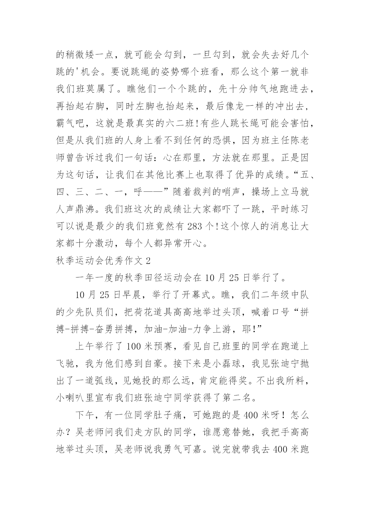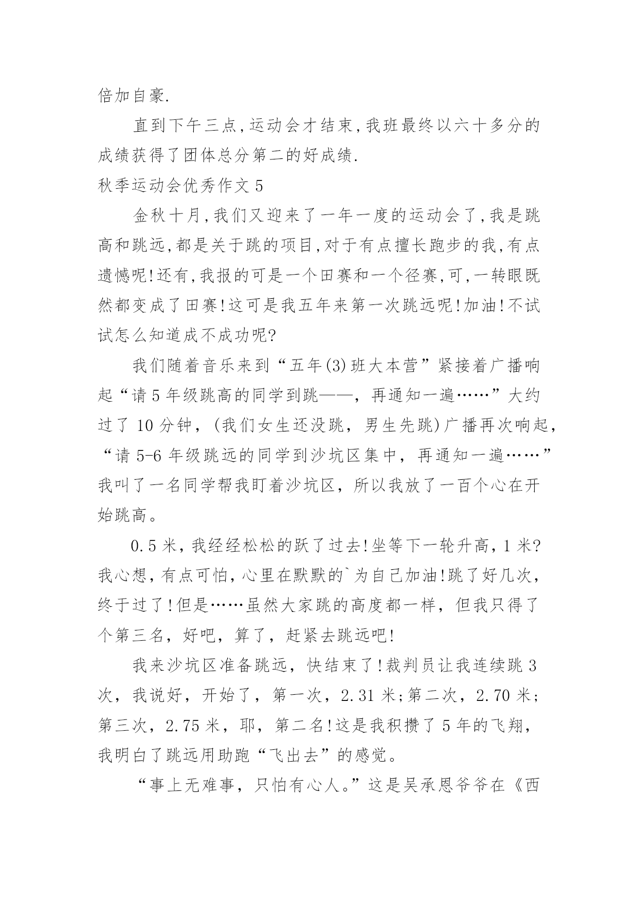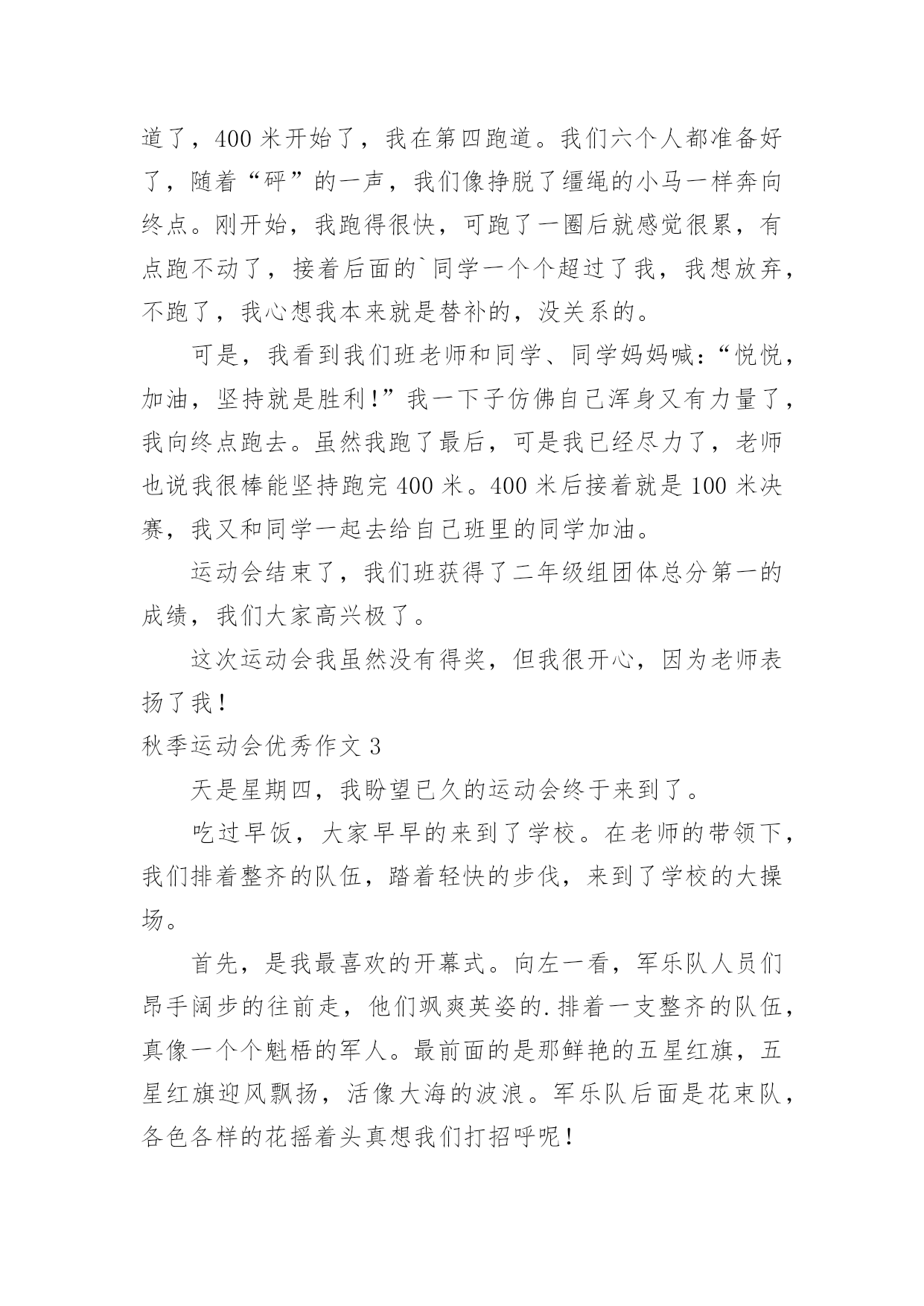 秋季运动会优秀作文秋季运动会优秀作文在学习、工作乃至生活中,大家都有写作文的经历,对作文很是熟悉吧,作文要求篇章结构完整,一定要避免无结尾作文的出现。那么你有了解过作文吗?以下是小编为大家整理的秋季运动会优秀作文,希望对大家有所帮助。秋季运动会优秀作文1星期四早晨,我们学校经过教育局的批准,开了第四届运动会。今年运动会和往年没有什么区别,只是今年的老天不给力,刚好在运动会的早晨下起了倾盆大雨。这一下倒不要紧,影响了每个人的正常水平和心情。早上我一来到学校就听说了运动会没有因为下雨而取消的好消息,有点小激动。在陈老师和金老师讲了半个小时后,趣味运动会就正式开始了。先是集体项目跳长绳。对于我们班来讲,我们对于跳长绳是没有抱多大希望的,因为体育老师说我们班跳的最慢了。“呼”随着一声哨响,比赛开始了。甩绳的人专心致志的甩,听着绳子甩到地上的“啪啪”声,就知道他们有多用力了。只见他们跳绳的,说是八字绳,都可以说是“跳龙绳”了!当他们跑进绳子中时,每个人都是提心吊胆的,因为跳的稍微矮一点,就可能会勾到,一旦勾到,就会失去好几个跳的'机会。要说跳绳的姿势哪个班看,那么这个第一就非我们班莫属了。瞧他们一个个跳的,先十分帅气地跑进去,再抬起右脚,同时左脚也抬起来,最后像龙一样的冲出去,霸气吧,这就是最真实的六二班!有些人跳长绳可能会害怕,但是从我们班的人身上看不到任何的恐惧,因为班主任陈老师曾告诉过我们一句话:心在那里,方法就在那里。正是因为这句话,让我们在其他比赛上也取得了优异的成绩。“五、四、三、二、一,呼——”随着裁判的哨声,操场上立马就人声鼎沸。我们班这次的成绩让大家都吓了一跳,平时练习可以说是最少的我们班竟然有283个!这个惊人的消息让大家都十分激动,每个人都异常开心。秋季运动会优秀作文2一年一度的秋季田径运动会在10月25日举行了。10月25日早晨,举行了开幕式。瞧,我们二年级中队的少先队员们,把荷花道具高高地举过头顶,喊着口号“拼搏-拼搏-奋勇拼搏,加油-加油-力争上游,耶!”上午举行了100米预赛,看见自己班里的同学在跑道上飞驰,我为他们感到自豪。接下来是小磊球,我见张迪宁抛出了一道弧线,见她投的那么远,肯定能得奖。不出我所料,小喇叭里宣布我们班张迪宁同学获得了第二名。下午,有一位同学肚子痛,可她跑的是400米呀!怎么办?吴老师问我们走方队的同学,谁愿意替她,我把手高高地举过头顶,吴老师说我勇气可嘉。说完就带我去400米跑道了,400米开始了,我在第四跑道。我们六个人都准备好了,随着“砰”的一声,我们像挣脱了缰绳的小马一样奔向终点。刚开始,我跑得很快,可跑了一圈后就感觉很累,有点跑不动了,接着后面的`同学一个个超过了我,我想放弃,不跑了,我心想我本来就是替补的,没关系的。可是,我看到我们班老师和同学、同学妈妈喊:“悦悦,加油,坚持就是胜利!”我一下子仿佛自己浑身又有力量了,我向终点跑去。虽然我跑了最后,可是我已经尽力了,老师也说我很棒能坚持跑完400米。400米后接着就是100米决赛,我又和同学一起去给自己班里的同学加油。运动会结束了,我们班获得了二年级组团体总分第一的成绩,我们大家高兴极了。这次运动会我虽然没有得奖,但我很开心,因为老师表扬了我!秋季运动会优秀作文3天是星期四,我盼望已久的运动会终于来到了。吃过早饭,大家早早的来到了学校。在老师的带领下,我们排着整齐的队伍,踏着轻快的步伐,来到了学校的大操场。首先,是我最喜欢的开幕式。向左一看,军乐队人员们昂手阔步的往前走,他们飒爽英姿的.排着一支整齐的队伍,真像一个个魁梧的军人。最前面的是那鲜艳的五星红旗,五星红旗迎风飘扬,活像大海的波浪。军乐队后面是花束队,各色各样的花摇着头真想我们打招呼呢!接着,主持人宣布比赛就要开始了,要求所有的运动员到比赛场地集合,只见运动员们信心满满的迈着大步走了过去,进行自己的赛前准备。比赛正式开始了。最精彩的是王蕾的1500跑和刘安的400米跑。只见王蕾精神抖擞的入场了,裁判员一声令下,“呼”的一声,王蕾立刻像离玄的箭一般冲了出去。观众台上沸腾了,我们大声喊着:“加油”“加油”……还有一圈了,还有半圈了,还有十米了,近了,更近了,“耶”我们班的王蕾得了第一名。接下来,就是刘安的400米跑了。“啪”的一声,在一声清脆的抢声下,刘安飞一般的冲了出去,只听激烈的加油声,一声高过一声,刘安在同学们加油声的鼓励下,跑得更快了。还有五十米了,刘安开始了最后的冲刺。“耶”我们班的第二个第一名诞生了。最后,决定胜负的拔河比赛就要开始了,我们的“敌人”脱下了校服,露出了蓝色的运动衫,真像出征的“战士”。而我们班在气势上也绝不输给他们,只见男同学个个摩拳擦掌,摆出必胜的架势。裁判一声令下,一场激烈的拔河比赛开始了,可我们的“敌人”正处于上风,最后我们只好以失败