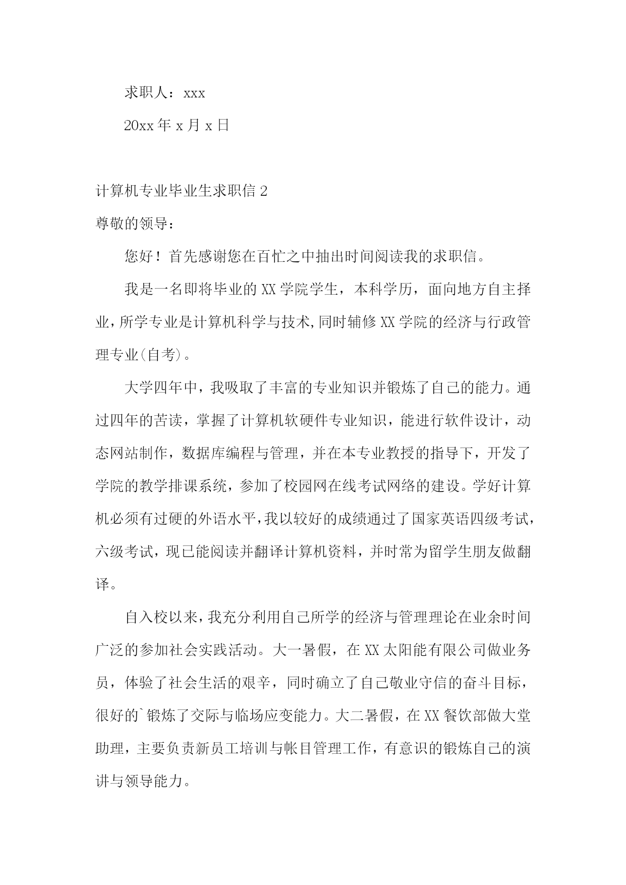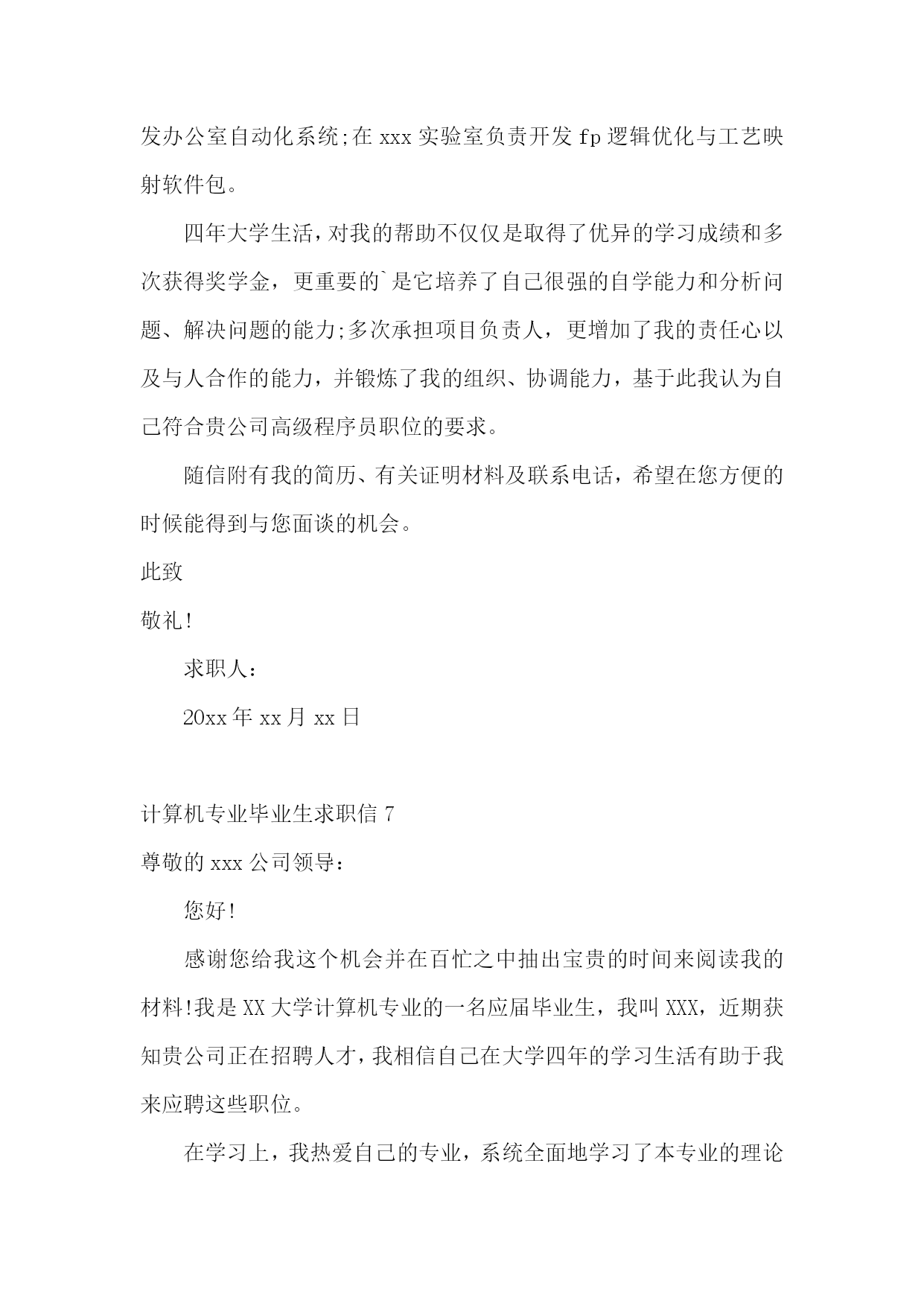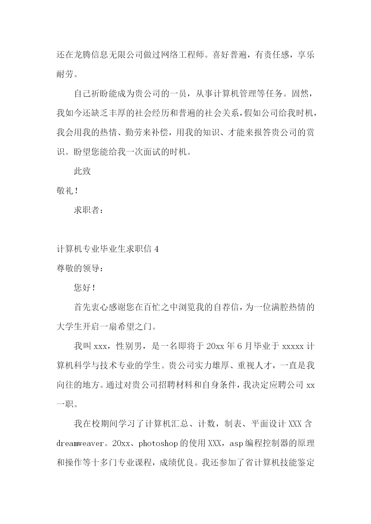 计算机专业毕业生求职信计算机专业毕业生求职信1尊敬的领导:您好!万分感谢您在百忙之中翻阅我的求职信!今日定标题一字乃为”求”,但非为乞求,只为”求”得您的慧眼。本人自知学识浅薄,并非学富五车,但我相信,现如今所学知识完全能够胜任贵公司该职位要求,我也相信别人能够做到的我一定可以做到,因为我会全身心投入!有人把我比作氚,开发后能量可以扩大千万倍。我是XX学院计算机系计算机网络08届毕业生。我对贵公司所提供的职位很感兴趣。大学四年是人生中最为重要的一个阶段,在这期间我学到了扎实的专业基础理论知识。我所修专业是一门管理和计算机的交叉专业,作为管理学学生的我具备了一定的管理能力,包括企业管理、人力资源管理以及信息管理等。在学好专业课程的同时,我还学习了计算机软件、硬件、网络方面的许多知识,并自学过企业信息化,电子商务等。这使我具备了很强的计算机实际操作能力和局域网络的设计维护能力等。此外,我对市场营销、金融经济等很感兴趣。最重要的一点是,大学让我掌握了学习的方法,是我对新知识新事物有很快的上手能力。我更加珍惜大学为我们提供的融入社会的机会!学习之余我还参加一定的社会工作,曾担任班级班长,做过促销员,网管员等工作。在这些勤工俭学过程中我感受颇多、获益匪浅!我从中悟出了许多做人做事的道理,人际交往能力和组织协调能力也有了很大的’提高。工作中,我力尽所能地做好每一件事,具有很强的责任心和集体荣誉感。尽管我没有工作经验,但我的自学能力能让我很快地掌握新知识,很快地上手并适应新的工作。我相信贵公司能给我提供施展才能的一片天空,而且我也相信我的努力能让贵公司的事业更上一层楼。即使贵公司认为我不符合条件,我也会继续努力,并向公司致以最诚挚的祝愿!工作两年来,见识和体会很多。至今所接触各种工作事宜均非学校专业知识所涉及,令我感觉大学几年学习对我是否有帮助产生很大怀疑。有学长说上大学实为大部分时间自己学。我听有所想,在大学生活里,除了保质保量完成必修科目,我还自修了网络编程语言ASP,图像处理软件photoshop,矢量动画制作软件flash。另外研读了当今热门专业通讯工程。学习是我的工作和生活。在电视台实习的短暂生活记忆着我首次踏入社会工作的艰辛与快乐。我深知贵公司所需人才要为本科学历,但我请您能够给我一次机会,我会证明那里的三和四对您而言没差别。现在对我未能提前感谢您观看我的求职信表示道歉,对我的请求令您为难表示歉意。此致敬礼!求职人:xxx20xx年x月x日计算机专业毕业生求职信2尊敬的领导:您好!首先感谢您在百忙之中抽出时间阅读我的求职信。我是一名即将毕业的XX学院学生,本科学历,面向地方自主择业,所学专业是计算机科学与技术,同时辅修XX学院的经济与行政管理专业(自考)。大学四年中,我吸取了丰富的专业知识并锻炼了自己的能力。通过四年的苦读,掌握了计算机软硬件专业知识,能进行软件设计,动态网站制作,数据库编程与管理,并在本专业教授的指导下,开发了学院的教学排课系统,参加了校园网在线考试网络的建设。学好计算机必须有过硬的外语水平,我以较好的成绩通过了国家英语四级考试,六级考试,现已能阅读并翻译计算机资料,并时常为留学生朋友做翻译。自入校以来,我充分利用自己所学的经济与管理理论在业余时间广泛的参加社会实践活动。大一暑假,在XX太阳能有限公司做业务员,体验了社会生活的艰辛,同时确立了自己敬业守信的奋斗目标,很好的`锻炼了交际与临场应变能力。大二暑假,在XX餐饮部做大堂助理,主要负责新员工培训与帐目管理工作,有意识的锻炼自己的演讲与领导能力。希望通过我的这封求职信,能使您对我有一个更全面深入的了解,我愿意以极大的热情与责任心投入到贵司的发展建设中去。最后再次感谢您耐心的阅读了我的求职信。期待您的回复。祝贵公司的事业蒸蒸日上,稳步发展!此致敬礼!求职人:XXX年XX月XX日计算机专业毕业生求职信3尊崇的公司经理:首先,为我的冒昧打搅向您表示真诚的歉意。在行将毕业之际,我怀着对贵公司的无比信任与敬慕,斗胆投石问路,希望能成为贵公司的一员,为公司效劳。我是××理工学院计算机软件专业97级先生,将于往年7月毕业。在大学四年中,我努力学习各门根底课及专业课,并获得了良好的.成果,英语已经过六级考试。自己不只能纯熟掌握学校的课程(vb顺序设计、autocadr14、frontpage98、foxpro2.5、c言语等),而且还自学了photoshop5.0、3dmax2.5、visual等,专业才能强,曾获学校计算机软件设计竞赛一等奖。作为一名跨世纪的大先生,我十分留意各方面才能的培育,积极参与社会理论,曾在安全保险做业务员,在肯德基做过星级训练员,还在龙腾信息无限公司做过网络工程师。喜好普遍,有责