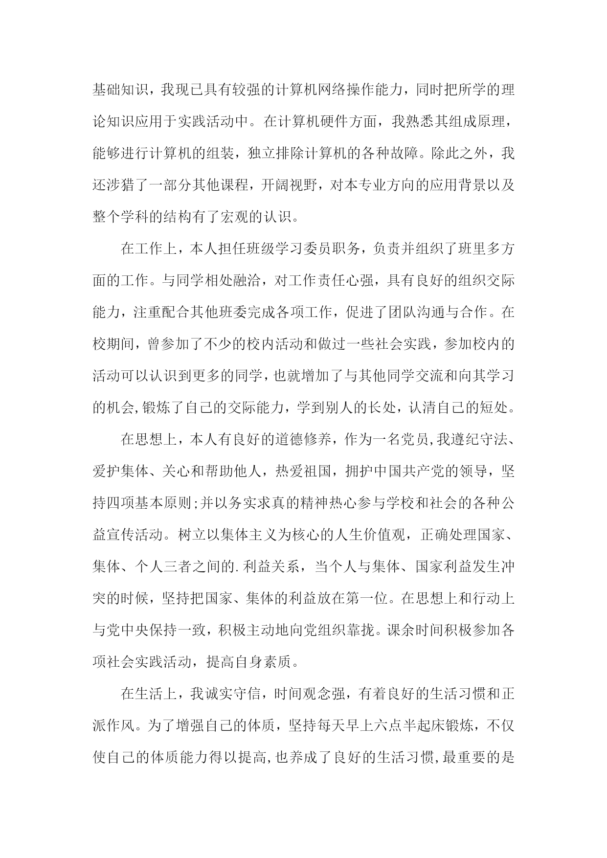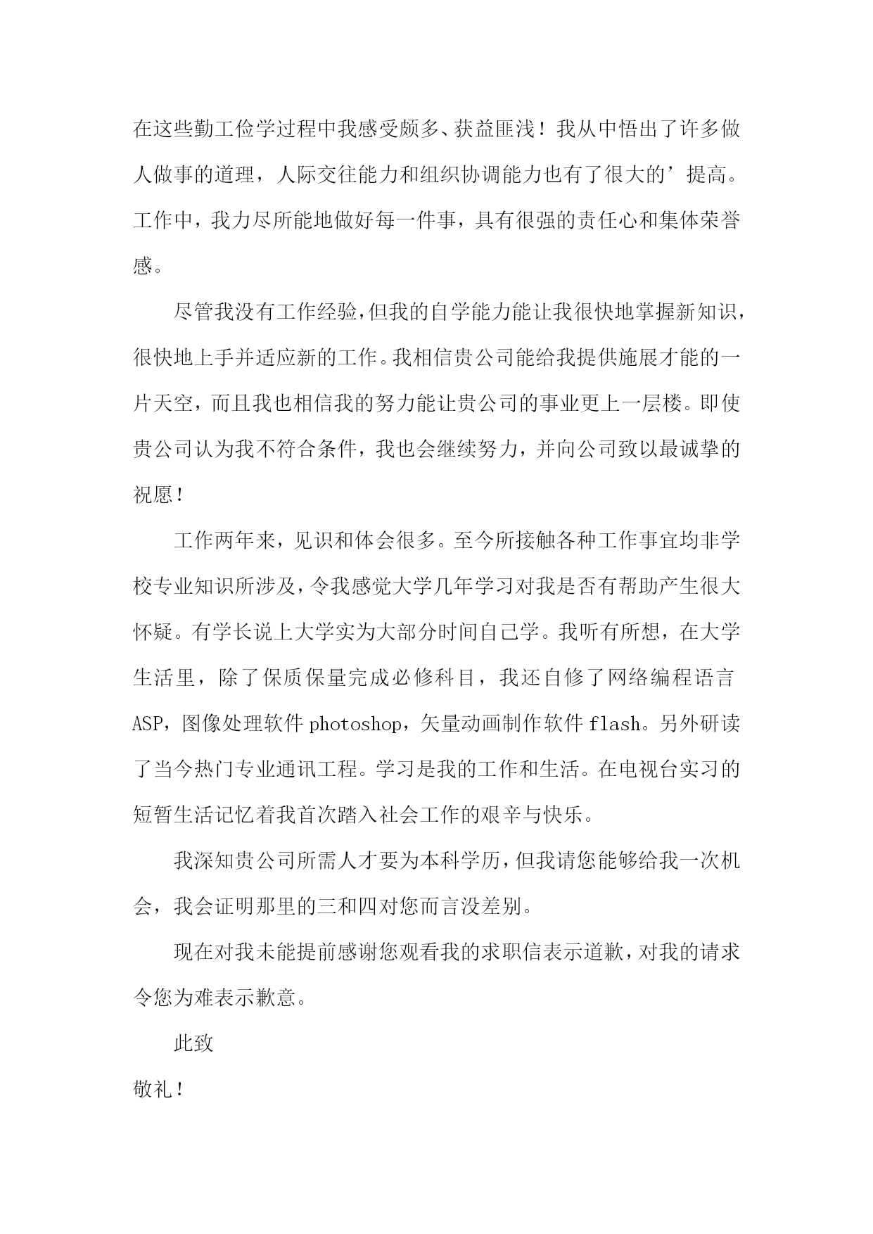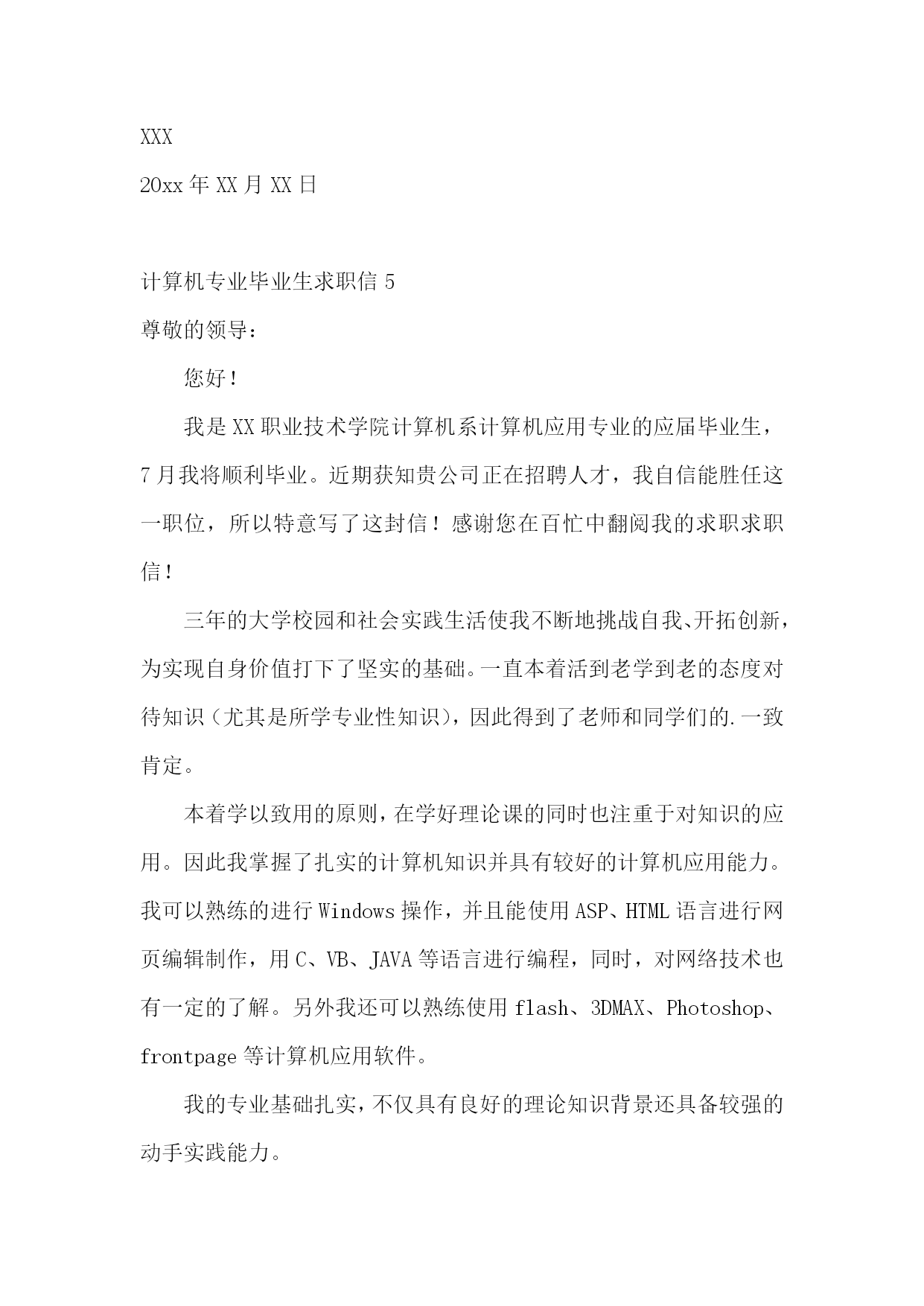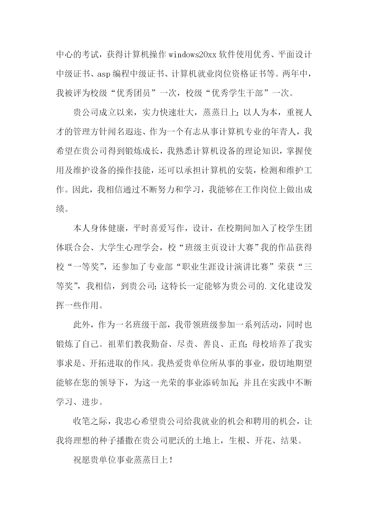 计算机专业毕业生求职信计算机专业毕业生求职信1尊敬的领导:您好!万分感谢您在百忙之中翻阅我的求职信!今日定标题一字乃为”求”,但非为乞求,只为”求”得您的慧眼。本人自知学识浅薄,并非学富五车,但我相信,现如今所学知识完全能够胜任贵公司该职位要求,我也相信别人能够做到的我一定可以做到,因为我会全身心投入!有人把我比作氚,开发后能量可以扩大千万倍。我是XX学院计算机系计算机网络08届毕业生。我对贵公司所提供的职位很感兴趣。大学四年是人生中最为重要的一个阶段,在这期间我学到了扎实的专业基础理论知识。我所修专业是一门管理和计算机的交叉专业,作为管理学学生的我具备了一定的管理能力,包括企业管理、人力资源管理以及信息管理等。在学好专业课程的同时,我还学习了计算机软件、硬件、网络方面的许多知识,并自学过企业信息化,电子商务等。这使我具备了很强的计算机实际操作能力和局域网络的设计维护能力等。此外,我对市场营销、金融经济等很感兴趣。最重要的一点是,大学让我掌握了学习的方法,是我对新知识新事物有很快的上手能力。我更加珍惜大学为我们提供的融入社会的机会!学习之余我还参加一定的社会工作,曾担任班级班长,做过促销员,网管员等工作。在这些勤工俭学过程中我感受颇多、获益匪浅!我从中悟出了许多做人做事的道理,人际交往能力和组织协调能力也有了很大的’提高。工作中,我力尽所能地做好每一件事,具有很强的责任心和集体荣誉感。尽管我没有工作经验,但我的自学能力能让我很快地掌握新知识,很快地上手并适应新的工作。我相信贵公司能给我提供施展才能的一片天空,而且我也相信我的努力能让贵公司的事业更上一层楼。即使贵公司认为我不符合条件,我也会继续努力,并向公司致以最诚挚的祝愿!工作两年来,见识和体会很多。至今所接触各种工作事宜均非学校专业知识所涉及,令我感觉大学几年学习对我是否有帮助产生很大怀疑。有学长说上大学实为大部分时间自己学。我听有所想,在大学生活里,除了保质保量完成必修科目,我还自修了网络编程语言ASP,图像处理软件photoshop,矢量动画制作软件flash。另外研读了当今热门专业通讯工程。学习是我的工作和生活。在电视台实习的短暂生活记忆着我首次踏入社会工作的艰辛与快乐。我深知贵公司所需人才要为本科学历,但我请您能够给我一次机会,我会证明那里的三和四对您而言没差别。现在对我未能提前感谢您观看我的求职信表示道歉,对我的请求令您为难表示歉意。此致敬礼!求职人:xxx20xx年x月x日计算机专业毕业生求职信2尊敬的领导:您好!首先感谢您在百忙之中抽出时间阅读我的求职信。我是一名即将毕业的XX学院学生,本科学历,面向地方自主择业,所学专业是计算机科学与技术,同时辅修XX学院的经济与行政管理专业(自考)。大学四年中,我吸取了丰富的专业知识并锻炼了自己的能力。通过四年的苦读,掌握了计算机软硬件专业知识,能进行软件设计,动态网站制作,数据库编程与管理,并在本专业教授的指导下,开发了学院的教学排课系统,参加了校园网在线考试网络的建设。学好计算机必须有过硬的外语水平,我以较好的成绩通过了国家英语四级考试,六级考试,现已能阅读并翻译计算机资料,并时常为留学生朋友做翻译。自入校以来,我充分利用自己所学的经济与管理理论在业余时间广泛的参加社会实践活动。大一暑假,在XX太阳能有限公司做业务员,体验了社会生活的艰辛,同时确立了自己敬业守信的奋斗目标,很好的`锻炼了交际与临场应变能力。大二暑假,在XX餐饮部做大堂助理,主要负责新员工培训与帐目管理工作,有意识的锻炼自己的演讲与领导能力。希望通过我的这封求职信,能使您对我有一个更全面深入的了解,我愿意以极大的热情与责任心投入到贵司的发展建设中去。最后再次感谢您耐心的阅读了我的求职信。期待您的回复。祝贵公司的事业蒸蒸日上,稳步发展!此致敬礼!求职人:XXX年XX月XX日计算机专业毕业生求职信3尊崇的公司经理:首先,为我的冒昧打搅向您表示真诚的歉意。在行将毕业之际,我怀着对贵公司的无比信任与敬慕,斗胆投石问路,希望能成为贵公司的一员,为公司效劳。我是××理工学院计算机软件专业97级先生,将于往年7月毕业。在大学四年中,我努力学习各门根底课及专业课,并获得了良好的.成果,英语已经过六级考试。自己不只能纯熟掌握学校的课程(vb顺序设计、autocadr14、frontpage98、foxpro2.5、c言语等),而且还自学了photoshop5.0、3dmax2.5、visual等,专业才能强,曾获学校计算机软件设计竞赛一等奖。作为一名跨世纪的大先生,我十分留意各方面才能的培育,积极参与社会理论,曾在安全保险做业务员,在肯德基做过星级训练员,还在龙腾信息无限公司做过网络工程师。喜好普遍,有责