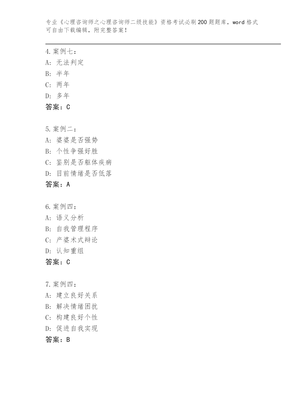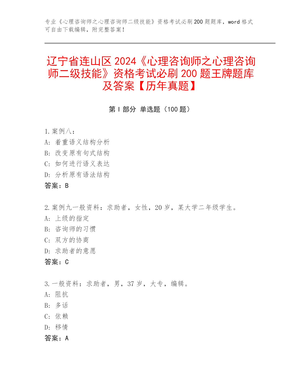 历年辽宁省振安区《心理咨询师之心理咨询师二级技能》资格考试必背200题真题题库及答案【各地真题】