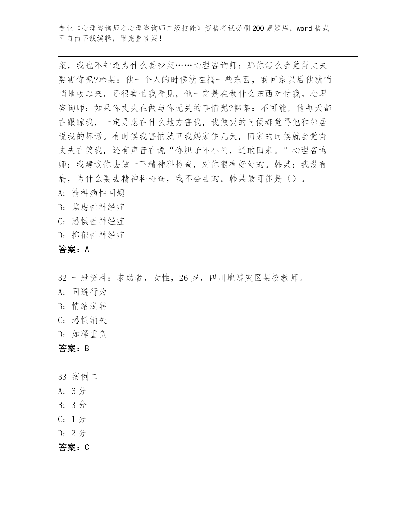 2024福建省《心理咨询师之心理咨询师二级技能》考试必刷200题题库(历年真题)