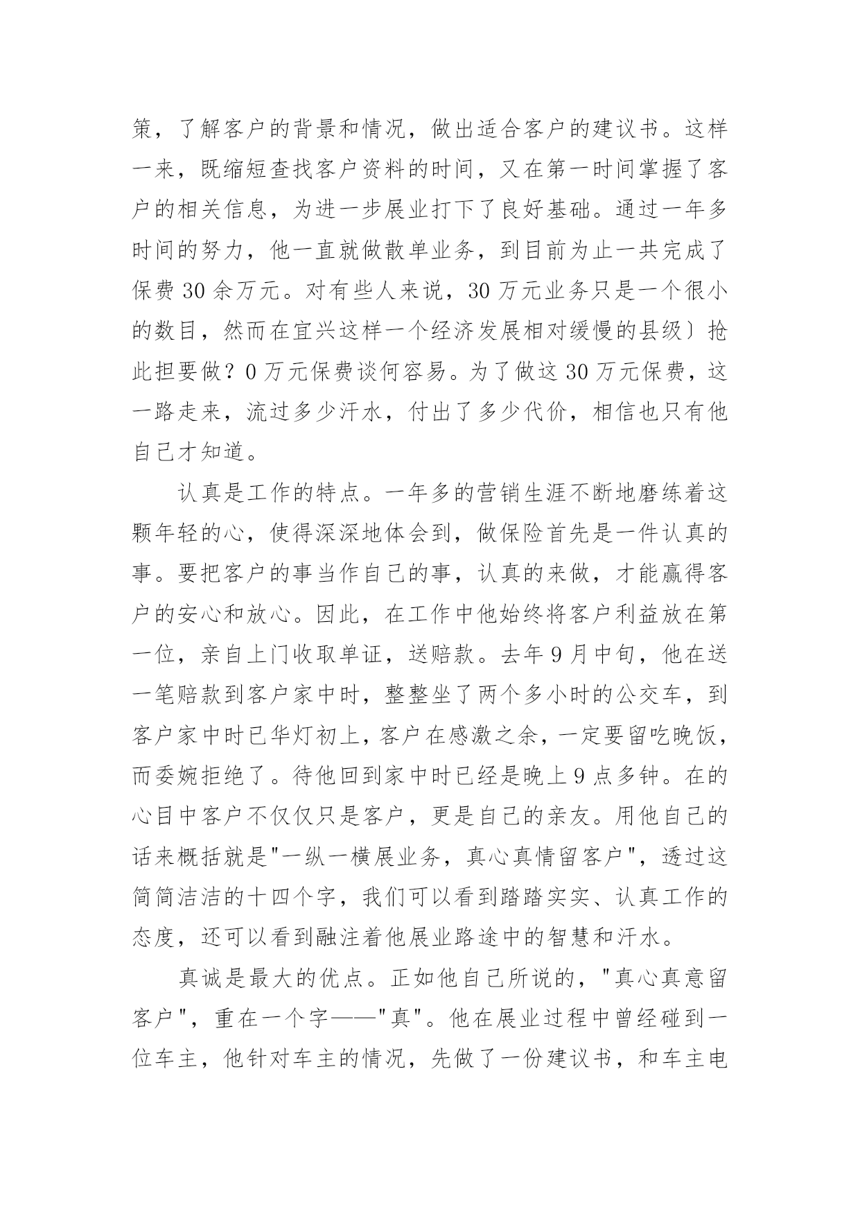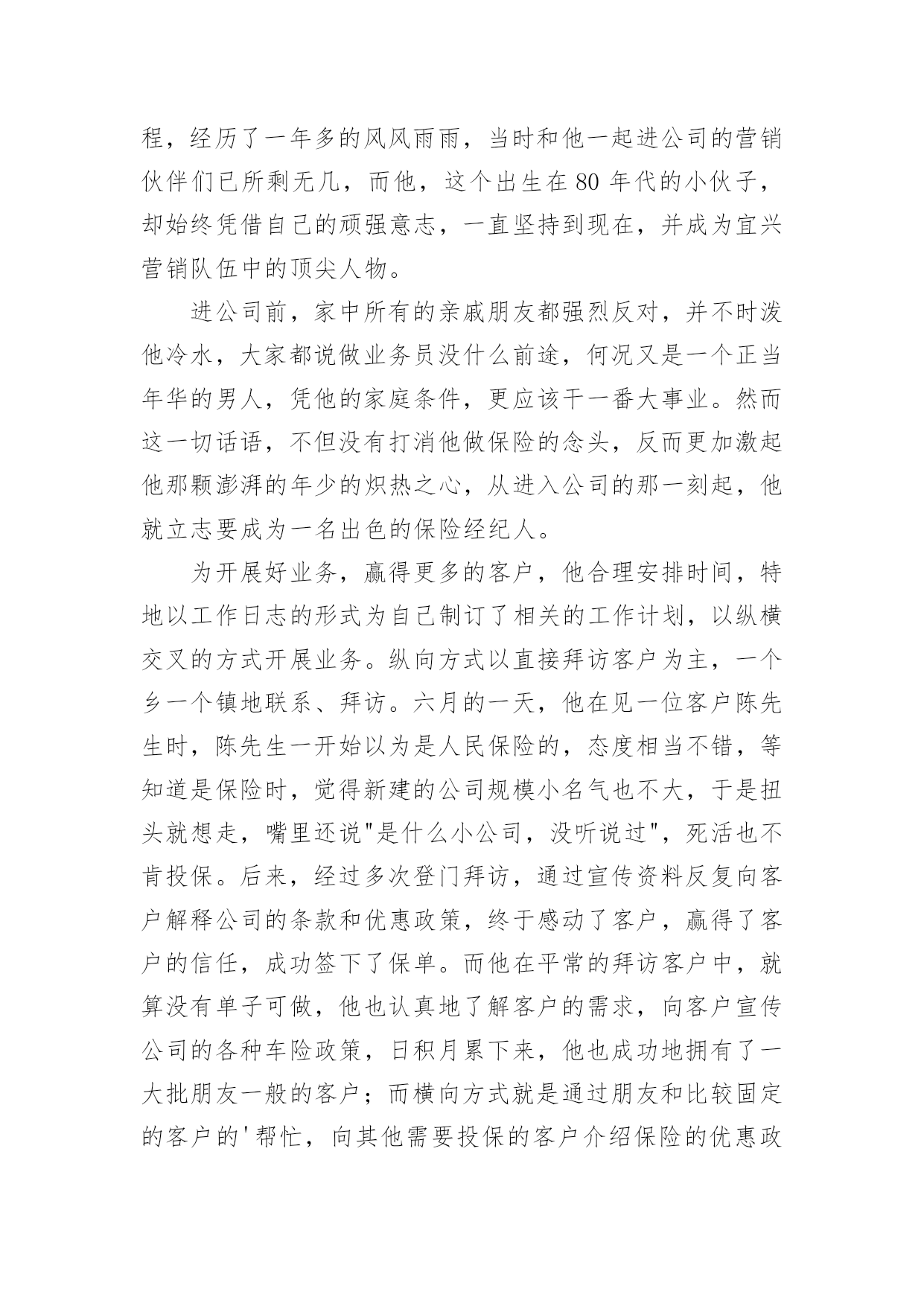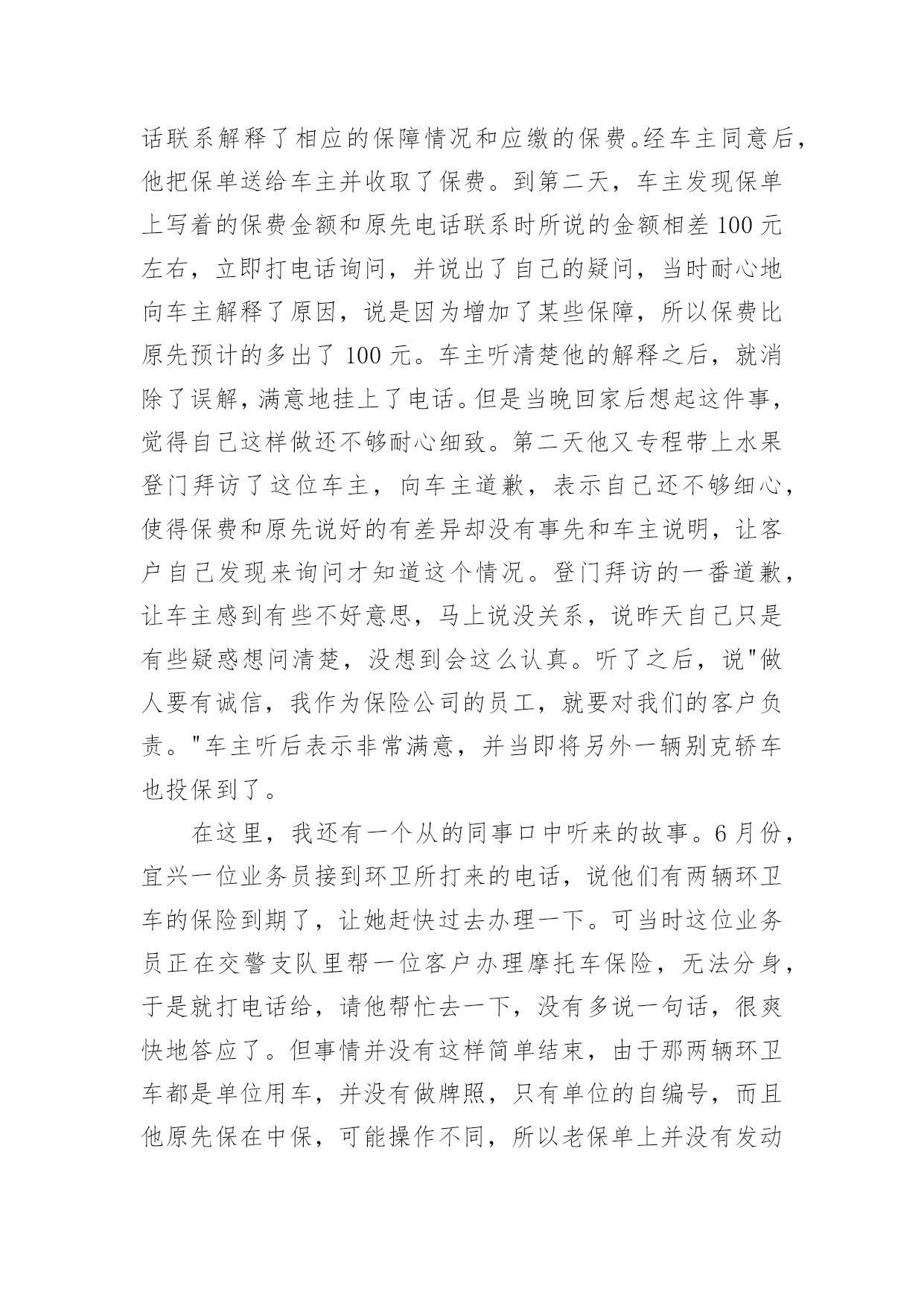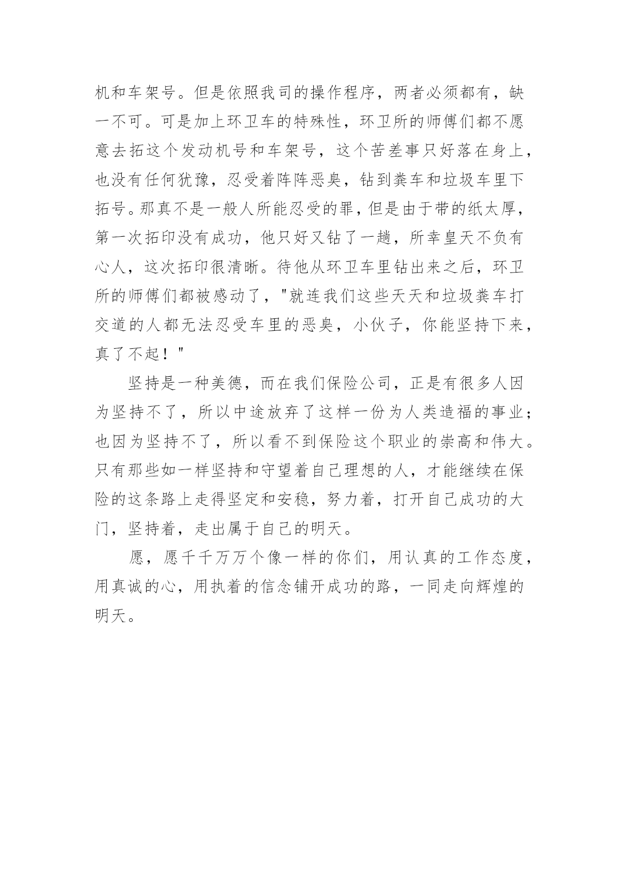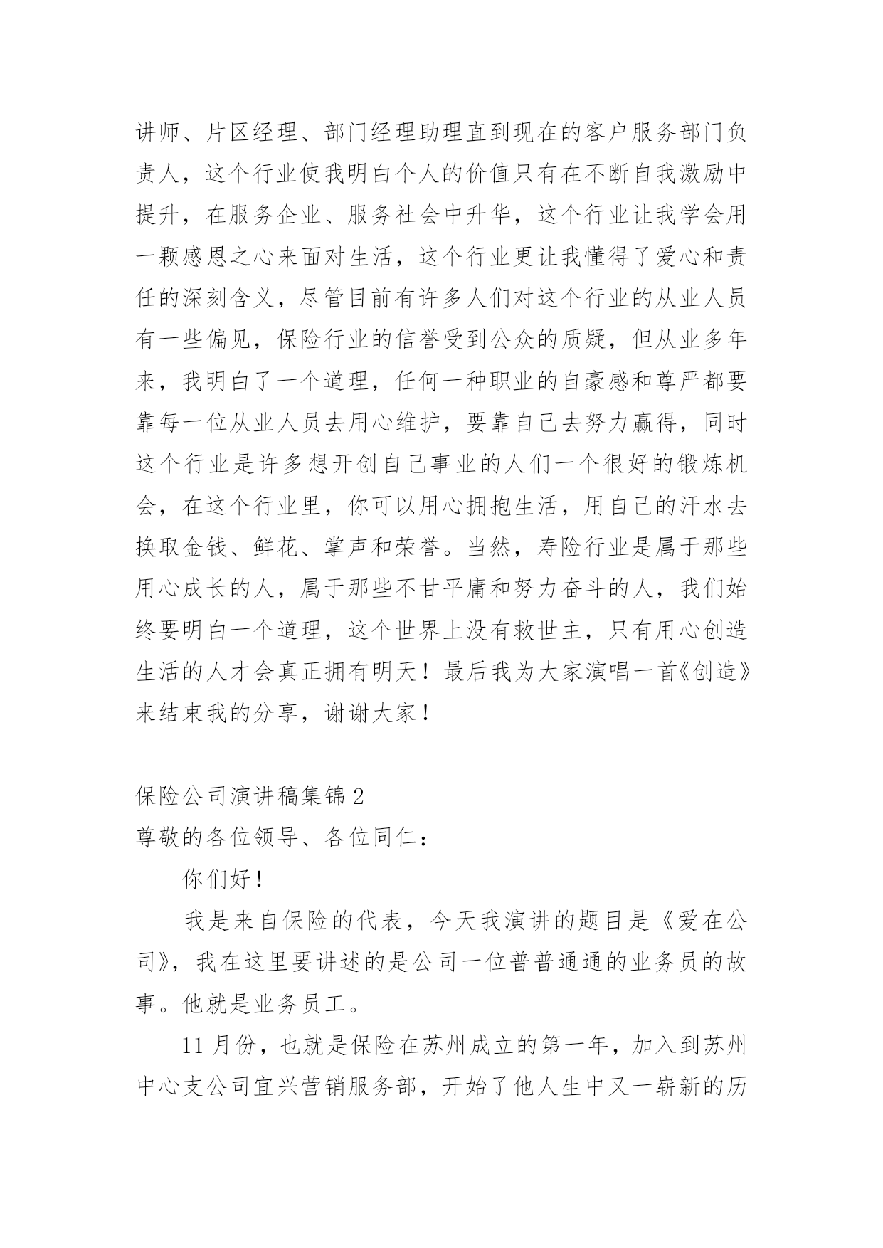 保险公司演讲稿保险公司演讲稿集锦演讲稿是一种实用性比较强的文稿,是为演讲准备的书面材料。在现在社会,我们可以使用演讲稿的机会越来越多,相信写演讲稿是一个让许多人都头痛的问题,下面是小编帮大家整理的保险公司演讲稿集锦,希望能够帮助到大家。保险公司演讲稿集锦1各位朋友:大家好!我是来自中国太平洋人寿保险股份有限公司巴州支公司的陈洪海,首先感谢库尔勒市团委举办这次活动所创造的机会及公司给予我的信任,让我有缘面对这么多朋友,告别校园时代至今已有八个年头,想来真是弹指一挥间,从小到大我评价自己是一个有着许多好奇心和梦想同时又用心的人,因此,今天我给大家分享的题目就叫用心追逐,放飞梦想。可能每个朋友的心里都会有这样的想法,如果时间能够倒流回某一个阶段,我将如何从新开始,假如真有这种可能的话,我想我会从92年开始。92年,我的高考成绩离本科院校的录取分数线差一点距离,本想重整旗鼓,但父母似乎对我失去了信心,因为在这之前我已经重整了两次,那个时候对一纸文凭的追求是一种潮流,现在想来,这种单纯对文凭的追求不免有些不合时宜,但在求职过程中,尤其是一些竞争激烈的岗位,对学历的要求依然是一个门坎,这似乎是一种证明。不过,我想告诉朋友们的是最好的证明是在现实中去用心成长,在不断成长的过程中去触摸你的梦想,一纸文凭可能是一份职业的叩门砖,而生活的大门却要我们用心灵来开启。95年大学毕业,因为客观原因,我和同学们没有机会进入当时梦寐以求的塔石化炼油厂,不过,幸运的是另外一扇大门向我们打开——南疆一座新成立的股份制小炼油厂,仰望厂区上方的灿烂星空,心情是那样激动,毕竟,我可以养活自己了,和第一次找到工作的朋友们一样,心情简单而又快乐。在这里,我用心珍惜每一个实践机会,因为用心,我全身心地带领工友废寝忘食地安装设备、起草开工方案、绘画工艺流程图纸、进行员工理论培训,因为用心,厂领导给予了我更多的信任和支持,从最初的一名普通工人到车间主管,从工艺技术员到生产技术部部长。因为用心,平凡而单调的生活显得多姿多彩,空旷的戈壁滩赋予了我个性上的一种从容和豁达。一年半后,为了选择另外一种生活,我辞职离开炼油厂,回到了库尔勒。当时我的心情就像李白在《将进酒》中所写到的那样,"天生我材必有用,千金散尽还复来",然而现实生活并没有我想象的那样顺利,由于自己高不成,低不就的心态,近一个月的时间里,我都在家里当"马大嫂",以缓释我心中的一种愧疚感,当母亲给我零用钱的时候,我悄悄地抹去只有我自己才看得到的眼泪,记得有一首歌的名字叫《从头再来》,歌词中这样唱到"心若在,梦就在,天地之间还有真爱,论成败,人生豪迈,只不过是从头在来",这里我要送给朋友们一句话,"在生活中,有一些财富可以用金钱来衡量,而无法用金钱衡量的财富却更加值得我们珍惜",一个月后,我以一种平和的心态接受了一份月薪只有250元的工作,进入《希望之路》编辑部,每次去外地出差,打工的女友都会去车站送我,并把她的表交给我看时间,有一次,当我在外地给她打电话,当她在电话里欣喜地告诉我用自己的奖金为我买了一块手表时,我却禁不住潸然泪下,后来我将这块表和我们编辑出版的.《希望之路》一起珍藏,因此,我要深深感谢我的父母和爱人,因为在我用心面对生活的过程中,也有这样一份爱在支持着我。当朋友们努力跋涉在人生旅途中,不要遗忘了这份爱,它会在你寻找工作的过程中带来一份感动和坚强。同时不要看轻任何一份职业,只要用心,经历本身就是一种财富,因为在希望之路的经历为我后期进入保险行业奠定了坚实的基础。97年8月份我进入当时还在筹建中的中国太平洋保险公司,看完一部叫《保险推销人》的书籍之后,我对这个行业充满了信心,公司一开业,我便带着无比的热情投入到工作中,和同事们一起走遍梨城的大街小巷,走入人群中,走到社会中,从事保险行业的生涯中,我用心成长,真诚面对每一位同事和客户,从一名普通的营销人员到业务主管、培训讲师、片区经理、部门经理助理直到现在的客户服务部门负责人,这个行业使我明白个人的价值只有在不断自我激励中提升,在服务企业、服务社会中升华,这个行业让我学会用一颗感恩之心来面对生活,这个行业更让我懂得了爱心和责任的深刻含义,尽管目前有许多人们对这个行业的从业人员有一些偏见,保险行业的信誉受到公众的质疑,但从业多年来,我明白了一个道理,任何一种职业的自豪感和尊严都要靠每一位从业人员去用心维护,要靠自己去努力赢得,同时这个行业是许多想开创自己事业的人们一个很好的锻炼机会,在这个行业里,你可以用心拥抱生活,用自己的汗水去换取金钱、鲜花、掌声和荣誉。当然,寿险行业是属于那些用心成长的人,属于那些不甘平庸和努力奋斗的人,我们始终要明白一个道理,这个世界上没有救世主,只有用心创造生活的人才会真正拥有明天!最后我为大家演唱一首《创造》来结束我的分享,谢谢大家!