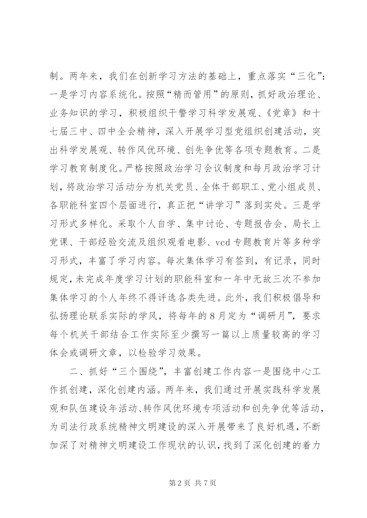 第PAGE\*Arabic\*MERGEFORMAT7页共NUMPAGES\*MERGEFORMAT7页市司法局文明单位汇报材料复评组各位领导:一、完善“三项机制”,夯实文明创建基础一是强化领导,完善组织机制。加强对文明单位创建工作的领导,是文明单位创建的保证。2009年,我局对文明创建工作领导小组进行了调整,由局党组书记、局长夏功良担任领导小组组长,党组成员任副组长,各科室和基层单位也相应明确了主要负责人亲自抓。两年来,我们坚持“三个文明”一起抓,建立健全党政一把手负总责,党、政、工、团、妇各负其责,形成了一岗双责,齐抓共管的文明创建体系。此外,我们每年初召开文明创建专题会议,层层签订了精神文明建设责任书,将年度业务工作目标和创建工作目标一起进行考核,层层分解落实,切实做到了谁主管谁负责,确保做到创建工作一级负责一级,一级带一级,把工作责任落实到每个岗位,每个责任人,为文明创建工作提供了强有力的组织保证。二是强化监督检查,健全监督机制。我们一方面组织领导小组办公室成员不定期对各科室、基层单位创建工作进行监督检查。另一方面聘请了10名行风监督员,定期召开座谈会听取他们对司法行政机关和法律服务队伍行风、廉政建设等工作意见和建议。此外还通过雁荡法治网、新闻媒体、设立举报电话和举报箱以及发放征求意见表等形式,广泛收集群众意见和建议,主动接受社会监督,形成多渠道的监督网络。三是强化学习培训,完善教育机制。两年来,我们在创新学习方法的基础上,重点落实“三化”:一是学习内容系统化。按照“精而管用”的原则,抓好政治理论、业务知识的学习,积极组织干警学习科学发展观、《党章》和十七届三中、四中全会精神,深入开展学习型党组织创建活动,突出科学发展观、转作风优环境、创先争优等各项专题教育。二是学习教育制度化。严格按照政治学习会议制度和每月政治学习计划,将政治学习活动分为机关党员、全体干部职工、党小组成员、各职能科室四个层面进行,真正把“讲学习”落到实处。三是学习形式多样化。采取个人自学、集中讨论、专题报告会、局长上党课、干部经验交流及组织观看电影、vcd专题教育片等多种学习形式,丰富了学习内容。每次集体学习有签到,有记录,同时规定,未完成年度学习计划的职能科室和一年中无故三次不参加集体学习的个人年终不得评选各类先进。此外,我们积极倡导和弘扬理论联系实际的学风,将每年的8月定为“调研月”,要求每个机关干部结合工作实际至少撰写一篇以上质量较高的学习体会或调研文章,以检验学习效果。二、抓好“三个围绕”,丰富创建工作内容一是围绕中心工作抓创建,深化创建内涵。两年来,我们通过开展实践科学发展观和队伍建设年活动、转作风优环境专项活动和创先争优等活动,为司法行政系统精神文明建设的深入开展带来了良好机遇,不断加深了对精神文明建设工作现状的认识,找到了深化创建的着力点。一是切实摸准了群众反映强烈的热点难点问题。在各项活动中,局班子成员根据自己分管的工作,建立了领导班子联片责任制度,通过蹲点调研、送法下乡等系列活动,了解司法行政机关和法律服务行业中存在的问题,并通过调研落实相应的工作措施,把整改成效与工作责任制、考核挂钩,达到了预期目的,对整体工作产生较明显的促进作用。二是促进了各项制度的完善。我们通过开展各项活动为契机,抓好了各项制度的完善与落实,建立健全局党组会议制度、局长办公制度、局务会议制度、干部请销假制度等,进一步转变机关作风,提高工作效率。以制度管人,以制度落实促工作的全面到位。三是促进了良好整体形象的形成。在各项活动中,通过开门纳谏,主动整改,特别是对群众反映强烈的问题及时整改到位,提高了群众对司法行政工作的满意度。在2009年度的社会评机关活动中,我局群众满意度明显升高,得分排名与2008年度相比前进10名以上,排名第8位。司法行政队伍的形象有了明显提高,有效地推动了整体工作的发展。二是围绕载体抓创建,丰富创建内容。两年来,我们通过深入开展队伍建设年活动和转作风优环境活动,切实转变了机关干部的工作作风,形成了局机关你追我赶、争创一流的工作氛围:一是开展“四好科室”创建活动。两年来,我局各职能科室以创建机关“干净、干事、干练”的良好形象为目标,积极开展“四好科室”争创活动,并受到市委表彰,2009年我局8个职能全部达到市委“四好科室”标准,宣教科被评为了“群众满意科室”。二是开展六型机关创建活动。结合“两提高、两降低”效能建设主题活动,力争使局机关成为学习型、服务型、效率型、和谐型、节约型、廉洁型机关。三是开展学习型党组织创建活动。我局通过开展“培养学习型领导、建设学习型领导班子”和“培育学习型党员、建设学习型党支部”主题创建活动,力争在3年内使学习型党组织达到100%,学习型党员达到90%。四是开展精神文明系列活动。两年来,我