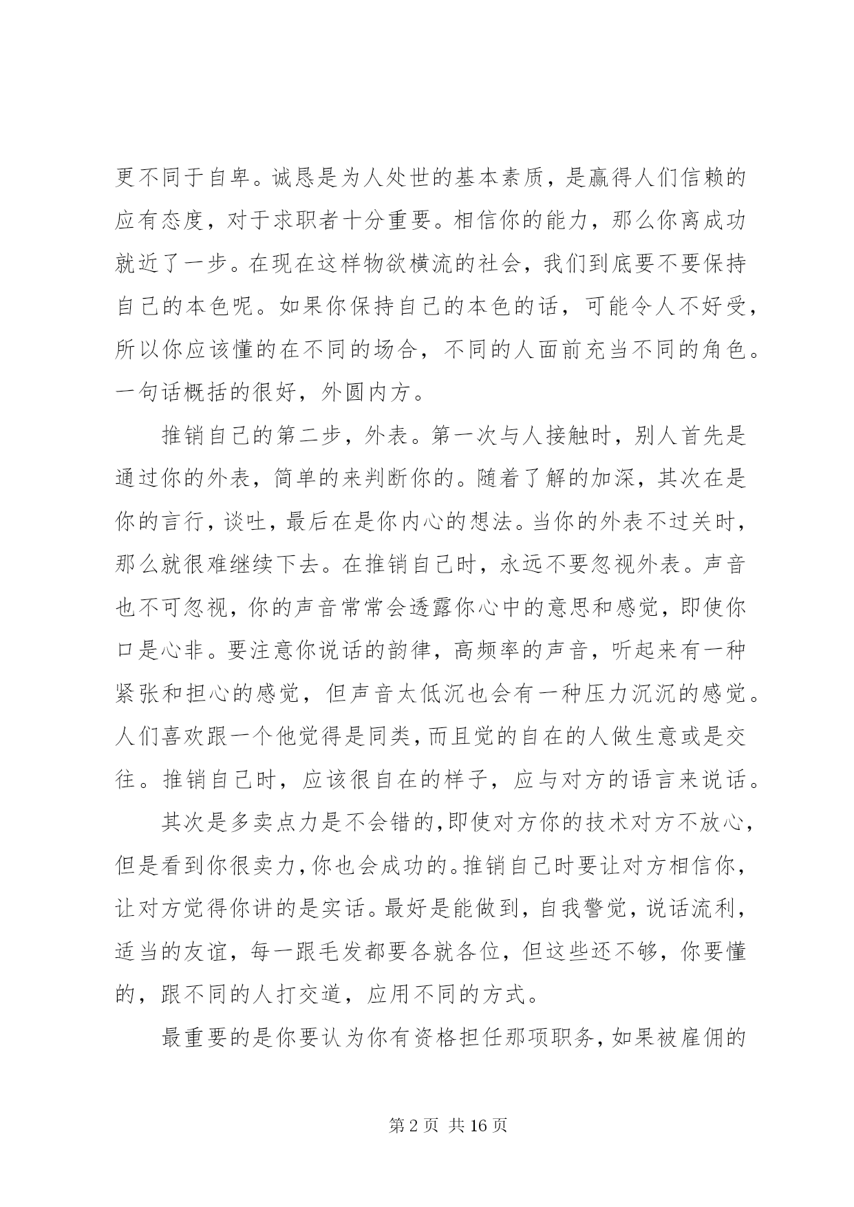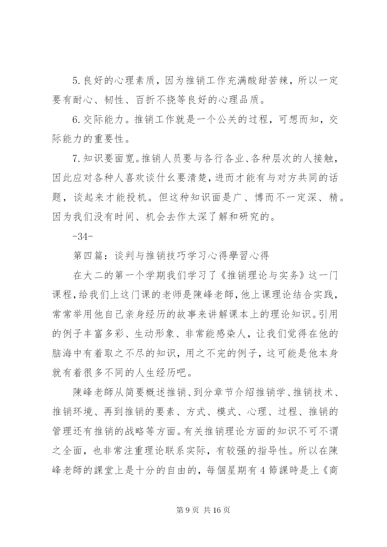 第PAGE\*Arabic\*MERGEFORMAT16页共NUMPAGES\*MERGEFORMAT16页《推销理论与技巧》学习心得推销自己。首先应该了解推销首要做的第一件事,那就是你要对你推销的东西相当熟悉,如当你要推销手套时,你应该了解手套是怎样构成的,是由那些原材料,什么样的人带什么手套,什么场合适合带那种手套,什么季节应该带什么手套,每一种形式的手套有那些利弊等。当我们推销自己时,应该充分的认识自己,我们是什么样的人,我们能给别人带来什么,我们的目的何在,别人对我们的印象如何,对我们有什么反应,以及我们的优缺点何在。每一个人必须找出自己的答案,你的个性,你的风格。跟你亲近的人,也许不好意思指出你的缺点。因此当你考虑推销自己的时候,不得不诚实地对自己评价一翻。我们要推销自己的第一个对象是你自己,写“自荐材料”时,我们倾向于取己之长,但要做到客观真实,不能有半点夸大和失真。尽管如此,用人单位很难仅凭一纸文书对应聘者产生百分之百的信任,这就是对方的“信任度”和自己的“内包装”.之间的分清分歧。所以推销自己时,你应该对自己有足够的自信,即使没有你也要装出来,你要装出你很有自信的样子,这样别人就会被你的自信感染。衣着的得体,神情的自信,态度的诚恳是攻关“通行证”说起容易,做到却很难“得体”就是着装适度中,稍多修饰便是浮夸,稍减一些便见形秽;“自信”是事业成功的基础,它即有别于自傲,更不同于自卑。诚恳是为人处世的基本素质,是赢得人们信赖的应有态度,对于求职者十分重要。相信你的能力,那么你离成功就近了一步。在现在这样物欲横流的社会,我们到底要不要保持自己的本色呢。如果你保持自己的本色的话,可能令人不好受,所以你应该懂的在不同的场合,不同的人面前充当不同的角色。一句话概括的很好,外圆内方。推销自己的第二步,外表。第一次与人接触时,别人首先是通过你的外表,简单的来判断你的。随着了解的加深,其次在是你的言行,谈吐,最后在是你内心的想法。当你的外表不过关时,那么就很难继续下去。在推销自己时,永远不要忽视外表。声音也不可忽视,你的声音常常会透露你心中的意思和感觉,即使你口是心非。要注意你说话的韵律,高频率的声音,听起来有一种紧张和担心的感觉,但声音太低沉也会有一种压力沉沉的感觉。人们喜欢跟一个他觉得是同类,而且觉的自在的人做生意或是交往。推销自己时,应该很自在的样子,应与对方的语言来说话。其次是多卖点力是不会错的,即使对方你的技术对方不放心,但是看到你很卖力,你也会成功的。推销自己时要让对方相信你,让对方觉得你讲的是实话。最好是能做到,自我警觉,说话流利,适当的友谊,每一跟毛发都要各就各位,但这些还不够,你要懂的,跟不同的人打交道,应用不同的方式。最重要的是你要认为你有资格担任那项职务,如果被雇佣的话,你认为你会做的很好,千万不要顾虑太多,要尽自己最大的努力去争取。人都是从年轻人走过来的,当别人看到你有一股朝气的时候,会认为是个可用之人。最后是,当你推销自己的时候,别担心做错事,但要从错误中得到教训。推销自己时就好像参照一本详细的食谱,去准备一道菜。正当你认为每一步都确实照做了后,你发觉必须回到第一页,做最后的加油添醋,这才是成败的关键。没有注意每一个细节的话,你可能有一个中上的产品,但永远还可再做修改。推销自己的方式,必须经常修改。推销自己最单纯的一点,真相和信心将是你最大的资产。如果你要推销自己,请从现在开始吧。第二篇:学习推销理论与技巧的心得体会学习推销理论与技巧的心得在当今日益竞争激烈的社会,推销学已不是个专业,而是作为新时代青年所必须掌握的一门技能。也许昨天我们还一无所有,但我们渴望今日将富甲天下。怎样才能如愿以偿,那就只有直面人生先把自己推销出去。在自我推销中,应该用尊严、自信和勇敢去面对失败。汲取生活养分,让自己的精神世界丰富而深刻。也许有人给你指明最佳途径,但真正使自己从零开始建立生活的勇气却来自自信。如果畏首畏尾,瞻前顾后,连接失败的还是失败。推销理论又称为市场学、市场行销或营销学。指个人或群体通过创造并同他人交换产品和价值,以满足需求与欲望的一种社会和管理过程。我觉得推销首先要把自己推出去,一个人生活在社会上,首先得被人肯定,然后才能被人尊重,只有你被人尊重了,才可能得到信任,也只有以信任做基础,才能被人接受。一个人怎样才能被肯定。这得看你身上是否具有“肯定因子”,也就是看你身上是否具有可以肯定的闪光点。这些闪光之点所构成的肯定因子,可以分为静态因子与动态因子。静态囚千虽然比较直观,但有时仍得借助一定的活动方式才能完全表现出来。如一个人的气质、外貌。而动态因子就只有在活动中才能被人认识了。比如性格、能力、修养、学识等。只有当你的肯定因子被人充分了解之后,才能得到他人的肯定。再就是建立自我推销的自
