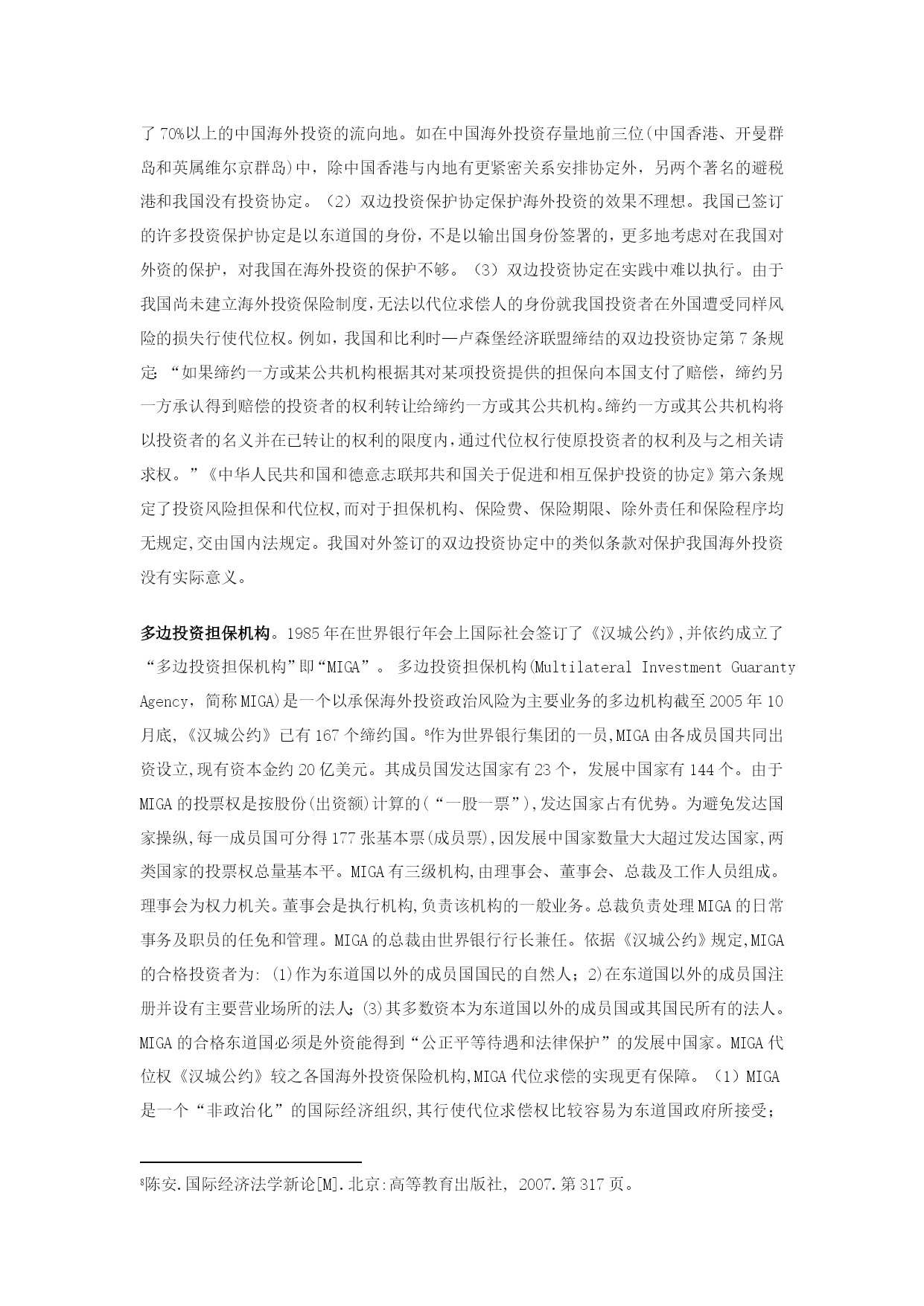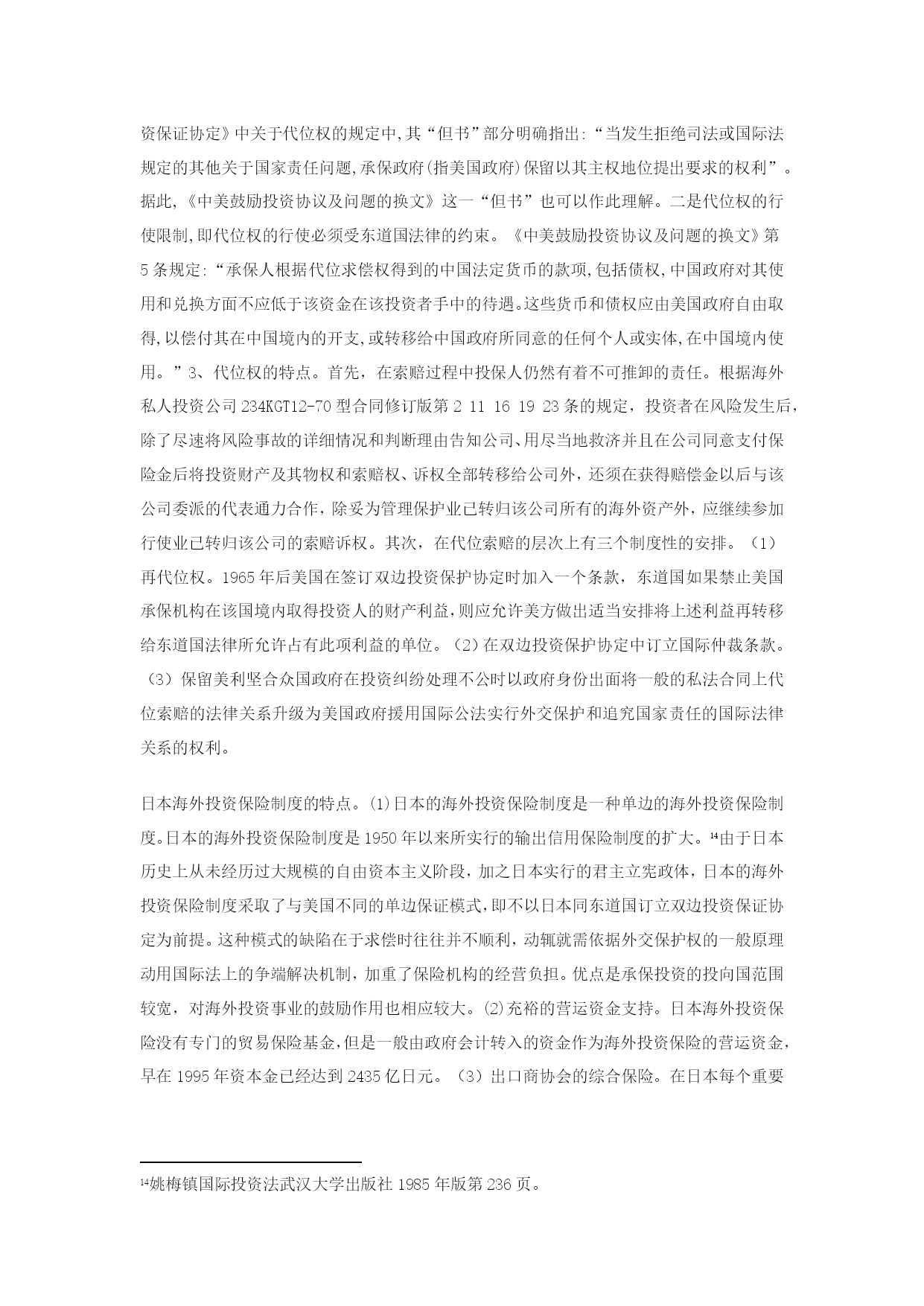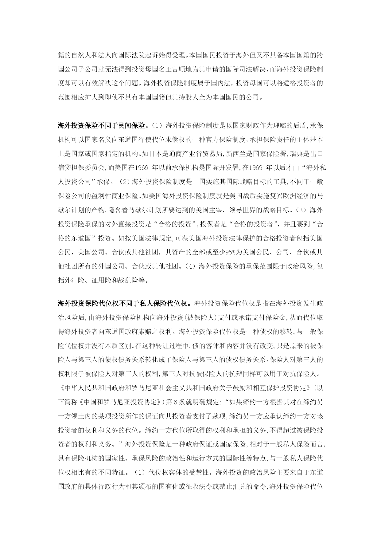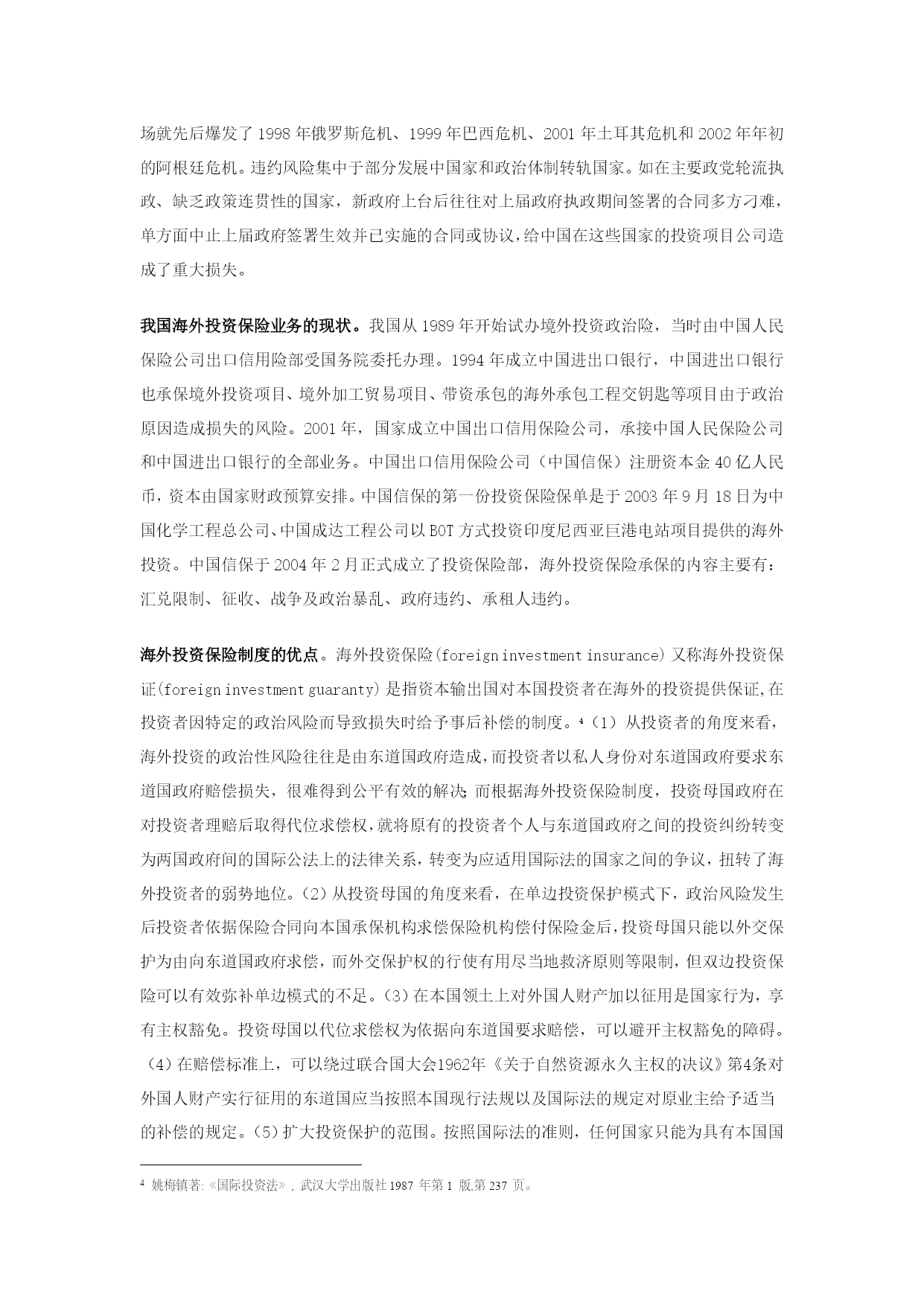 海外投资保险制度海外投资风险。“风险”一词来源于早期使用于海商和保险业的意大利语“rischio”,最初的意思是指风暴等自然灾害。海外投资的风险主要有政治风险和商业风险。“政治风险是指与东道国政治、社会、法律有关的、人为的、非投资者所能控制的风险。所谓‘人为的’,主要是指由东道国政府所为行为产生的风险。”余劲松主编:《国际投资法》,法律出版社2003年第2版,。跨国经营中的政治风险传统上划分为征收、战争、汇兑限制和违约风险。我国约七成的海外直接投资集中在石油等资源性行业和制造业,这两个行业占了二战后全球所有被征收的外国企业的六成。我国投资较多的国家中,智利、秘鲁和坦桑尼亚分别征收过外国人财产26至35次,印尼、赞比亚和苏丹分别征收过15至25次,阿根廷、缅甸、埃及、墨西哥、委内瑞拉、尼日利亚分别征收过5至10次)。数年前中国某大型化学工程建设公司承建前南斯拉夫化工厂,在执行期间遭遇以美国为首的北约对南斯拉夫开战,工程项目遭到重创,数亿美元的工程款至今未能得到回收,项目的有关方损失惨重,也给国内贷款银行造成了几亿元人民币的长期不良贷款李福胜.中国企业“走出去”面临的国家风险研究[拉丁美洲研究,2006,(6).。我国企业在跨国经营中面临的政治风险呈现以下特点:一是由传统的战争风险转向和平环境中的政治暴力风险。和平环境中的政治暴力风险包括贸易保护主义驱动的政治暴力风险和劳工权益引起的政治暴力风险等。例如西班牙埃尔切事件就是东道国厂商出于竞争对中国企业采取的暴力行为。俄罗斯于2006年年底出台了关于整顿批发零售市场经济秩序,规范外来移民就业等有关法规,规定自2007年1月1日起,从事零售工作的外国劳务人员经营主体的比例不得高于40%,自2007年4月1日起,外籍务工人员不得在商亭里、自由市场内以及商店以外地点从事零售贸易。由于这项政策的出台,共有10万华商受到损失。吴莉婧:《我国海外投资企业面临风险与法律对策研究》,《学术论坛》2021年第6期。二是直接征收风险减少,隐性征收风险突出。例如有些国家以检查偷漏税、走私、卫生、安全条件为名,频繁搜查中国企业,动辄处以高额款、额外课税,干扰其正常生产经营,甚至以上述借口没收企业的财物。三是汇兑限制风险总体降低,但金融风险仍然较高。在非国际储备货币发行国,如果其资本账户和国内资本市场开放较快,或外债负担较重,其爆发货币、金融危机的几率就较高。新兴市场就先后爆发了1998年俄罗斯危机、1999年巴西危机、2001年土耳其危机和2002年年初的阿根廷危机。违约风险集中于部分发展中国家和政治体制转轨国家。如在主要政党轮流执政、缺乏政策连贯性的国家,新政府上台后往往对上届政府执政期间签署的合同多方刁难,单方面中止上届政府签署生效并已实施的合同或协议,给中国在这些国家的投资项目公司造成了重大损失。我国海外投资保险业务的现状。我国从1989年开始试办境外投资政治险,当时由中国人民保险公司出口信用险部受国务院委托办理。1994年成立中国进出口银行,中国进出口银行也承保境外投资项目、境外加工贸易项目、带资承包的海外承包工程交钥匙等项目由于政治原因造成损失的风险。2001年,国家成立中国出口信用保险公司,承接中国人民保险公司和中国进出口银行的全部业务。中国出口信用保险公司(中国信保)注册资本金40亿人民币,资本由国家财政预算安排。中国信保的第一份投资保险保单是于2003年9月18日为中国化学工程总公司、中国成达工程公司以BOT方式投资印度尼西亚巨港电站项目提供的海外投资。中国信保于2004年2月正式成立了投资保险部,海外投资保险承保的内容主要有:汇兑限制、征收、战争及政治暴乱、政府违约、承租人违约。海外投资保险制度的优点。海外投资保险(foreigninvestmentinsurance)又称海外投资保证(foreigninvestmentguaranty)是指资本输出国对本国投资者在海外的投资提供保证,在投资者因特定的政治风险而导致损失时给予事后补偿的制度。姚梅镇著:《国际投资法》,武汉大学出版社1987年第1版,。(1)从投资者的角度来看,海外投资的政治性风险往往是由东道国政府造成,而投资者以私人身份对东道国政府要求东道国政府赔偿损失,很难得到公平有效的解决;而根据海外投资保险制度,投资母国政府在对投资者理赔后取得代位求偿权,就将原有的投资者个人与东道国政府之间的投资纠纷转变为两国政府间的国际公法上的法律关系,转变为应适用国际法的国家之间的争议,扭转了海外投资者的弱势地位。(2)从投资母国的角度来看,在单边投资保护模式下,政治风险发生后投资者依据保险合同向本国承保机构求偿保险机构偿付保险金后,投资母国只能以外交保护为由向东道国政府求偿,而外交保护权的行使有用尽