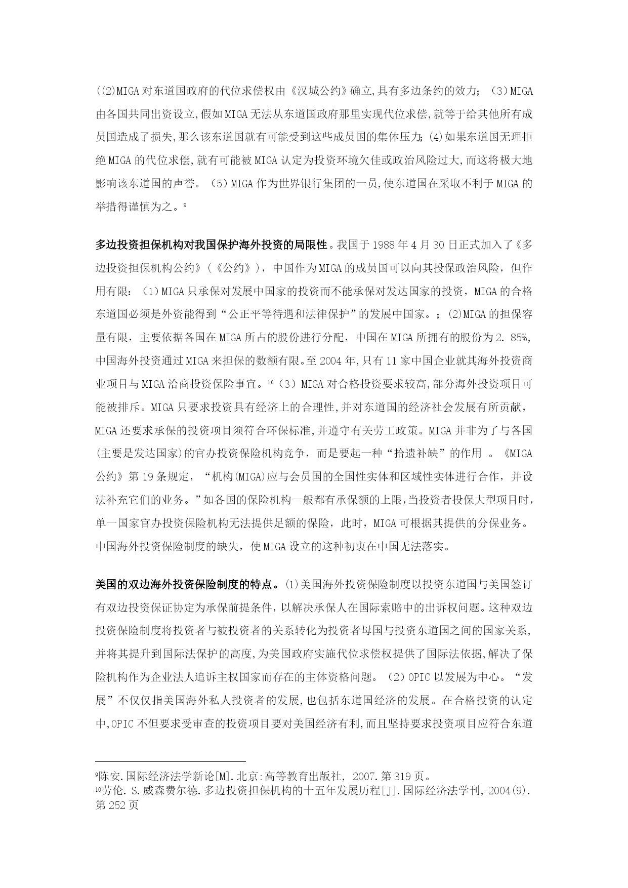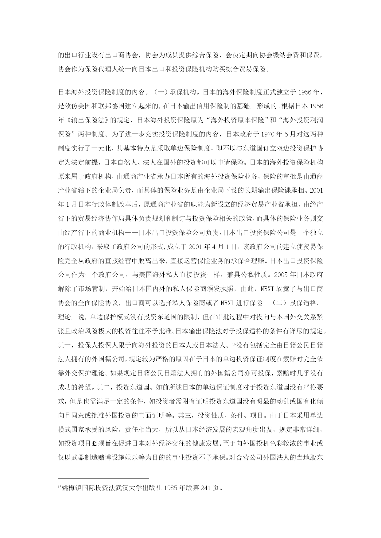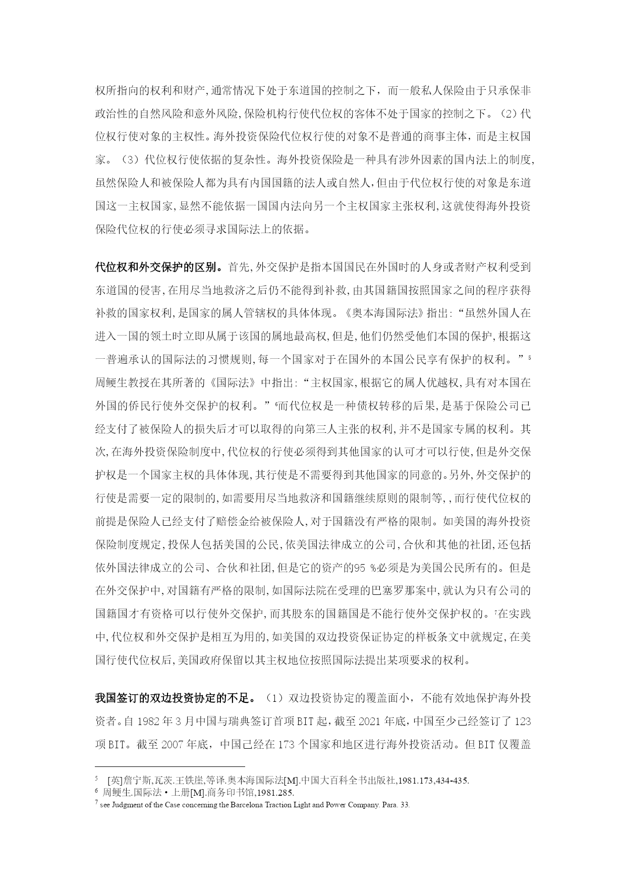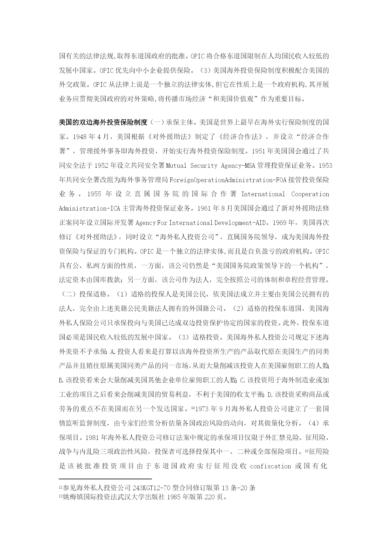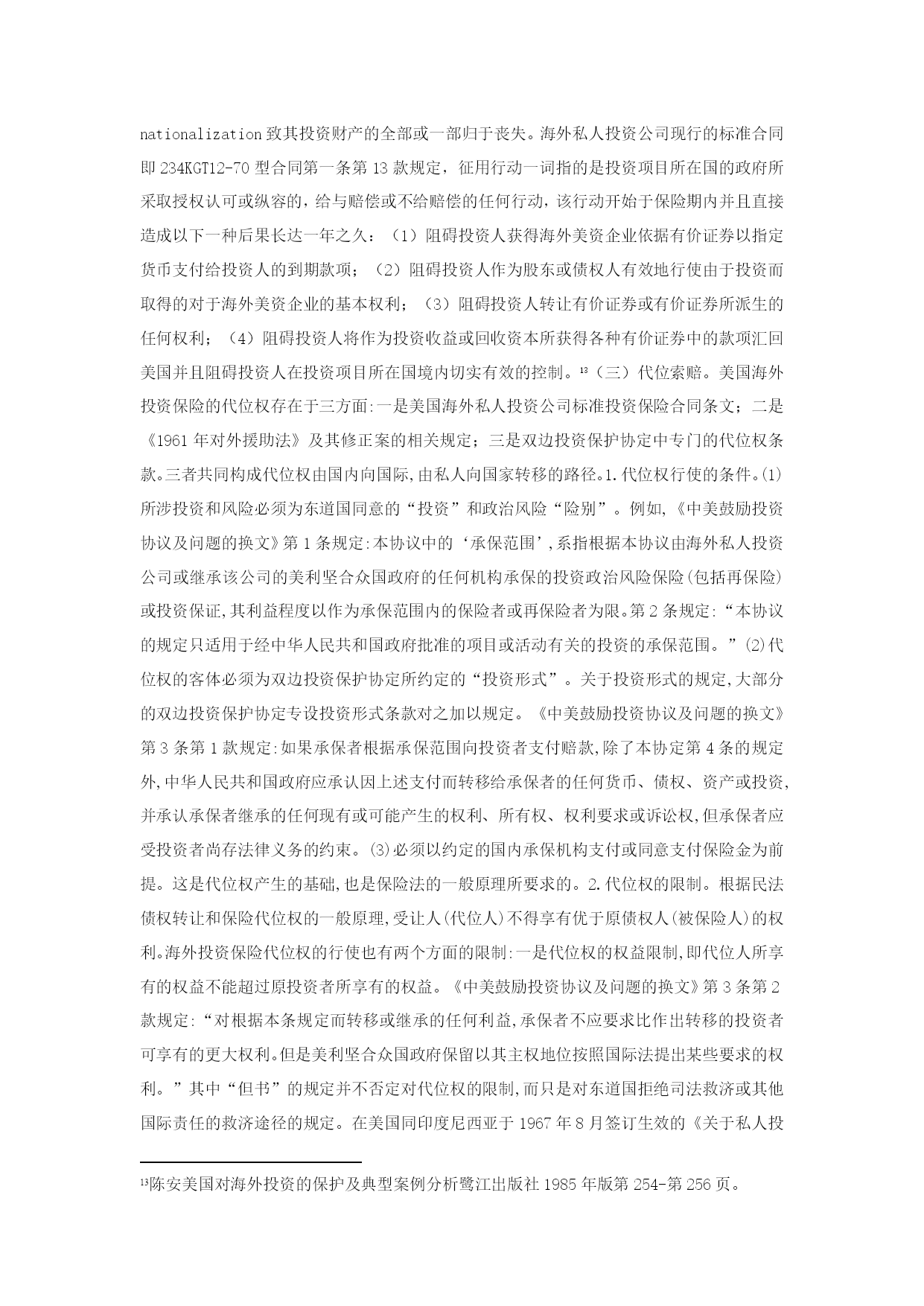 海外投资保险制度海外投资风险。“风险”一词来源于早期使用于海商和保险业的意大利语“rischio”,最初的意思是指风暴等自然灾害。海外投资的风险主要有政治风险和商业风险。“政治风险是指与东道国政治、社会、法律有关的、人为的、非投资者所能控制的风险。所谓‘人为的’,主要是指由东道国政府所为行为产生的风险。”余劲松主编:《国际投资法》,法律出版社2003年第2版,。跨国经营中的政治风险传统上划分为征收、战争、汇兑限制和违约风险。我国约七成的海外直接投资集中在石油等资源性行业和制造业,这两个行业占了二战后全球所有被征收的外国企业的六成。我国投资较多的国家中,智利、秘鲁和坦桑尼亚分别征收过外国人财产26至35次,印尼、赞比亚和苏丹分别征收过15至25次,阿根廷、缅甸、埃及、墨西哥、委内瑞拉、尼日利亚分别征收过5至10次)。数年前中国某大型化学工程建设公司承建前南斯拉夫化工厂,在执行期间遭遇以美国为首的北约对南斯拉夫开战,工程项目遭到重创,数亿美元的工程款至今未能得到回收,项目的有关方损失惨重,也给国内贷款银行造成了几亿元人民币的长期不良贷款李福胜.中国企业“走出去”面临的国家风险研究[拉丁美洲研究,2006,(6).。我国企业在跨国经营中面临的政治风险呈现以下特点:一是由传统的战争风险转向和平环境中的政治暴力风险。和平环境中的政治暴力风险包括贸易保护主义驱动的政治暴力风险和劳工权益引起的政治暴力风险等。例如西班牙埃尔切事件就是东道国厂商出于竞争对中国企业采取的暴力行为。俄罗斯于2006年年底出台了关于整顿批发零售市场经济秩序,规范外来移民就业等有关法规,规定自2007年1月1日起,从事零售工作的外国劳务人员经营主体的比例不得高于40%,自2007年4月1日起,外籍务工人员不得在商亭里、自由市场内以及商店以外地点从事零售贸易。由于这项政策的出台,共有10万华商受到损失。吴莉婧:《我国海外投资企业面临风险与法律对策研究》,《学术论坛》2021年第6期。二是直接征收风险减少,隐性征收风险突出。例如有些国家以检查偷漏税、走私、卫生、安全条件为名,频繁搜查中国企业,动辄处以高额款、额外课税,干扰其正常生产经营,甚至以上述借口没收企业的财物。三是汇兑限制风险总体降低,但金融风险仍然较高。在非国际储备货币发行国,如果其资本账户和国内资本市场开放较快,或外债负担较重,其爆发货币、金融危机的几率就较高。新兴市场就先后爆发了1998年俄罗斯危机、1999年巴西危机、2001年土耳其危机和2002年年初的阿根廷危机。违约风险集中于部分发展中国家和政治体制转轨国家。如在主要政党轮流执政、缺乏政策连贯性的国家,新政府上台后往往对上届政府执政期间签署的合同多方刁难,单方面中止上届政府签署生效并已实施的合同或协议,给中国在这些国家的投资项目公司造成了重大损失。我国海外投资保险业务的现状。我国从1989年开始试办境外投资政治险,当时由中国人民保险公司出口信用险部受国务院委托办理。1994年成立中国进出口银行,中国进出口银行也承保境外投资项目、境外加工贸易项目、带资承包的海外承包工程交钥匙等项目由于政治原因造成损失的风险。2001年,国家成立中国出口信用保险公司,承接中国人民保险公司和中国进出口银行的全部业务。中国出口信用保险公司(中国信保)注册资本金40亿人民币,资本由国家财政预算安排。中国信保的第一份投资保险保单是于2003年9月18日为中国化学工程总公司、中国成达工程公司以BOT方式投资印度尼西亚巨港电站项目提供的海外投资。中国信保于2004年2月正式成立了投资保险部,海外投资保险承保的内容主要有:汇兑限制、征收、战争及政治暴乱、政府违约、承租人违约。海外投资保险制度的优点。海外投资保险(foreigninvestmentinsurance)又称海外投资保证(foreigninvestmentguaranty)是指资本输出国对本国投资者在海外的投资提供保证,在投资者因特定的政治风险而导致损失时给予事后补偿的制度。姚梅镇著:《国际投资法》,武汉大学出版社1987年第1版,。(1)从投资者的角度来看,海外投资的政治性风险往往是由东道国政府造成,而投资者以私人身份对东道国政府要求东道国政府赔偿损失,很难得到公平有效的解决;而根据海外投资保险制度,投资母国政府在对投资者理赔后取得代位求偿权,就将原有的投资者个人与东道国政府之间的投资纠纷转变为两国政府间的国际公法上的法律关系,转变为应适用国际法的国家之间的争议,扭转了海外投资者的弱势地位。(2)从投资母国的角度来看,在单边投资保护模式下,政治风险发生后投资者依据保险合同向本国承保机构求偿保险机构偿付保险金后,投资母国只能以外交保护为由向东道国政府求偿,而外交保护权的行使有用尽