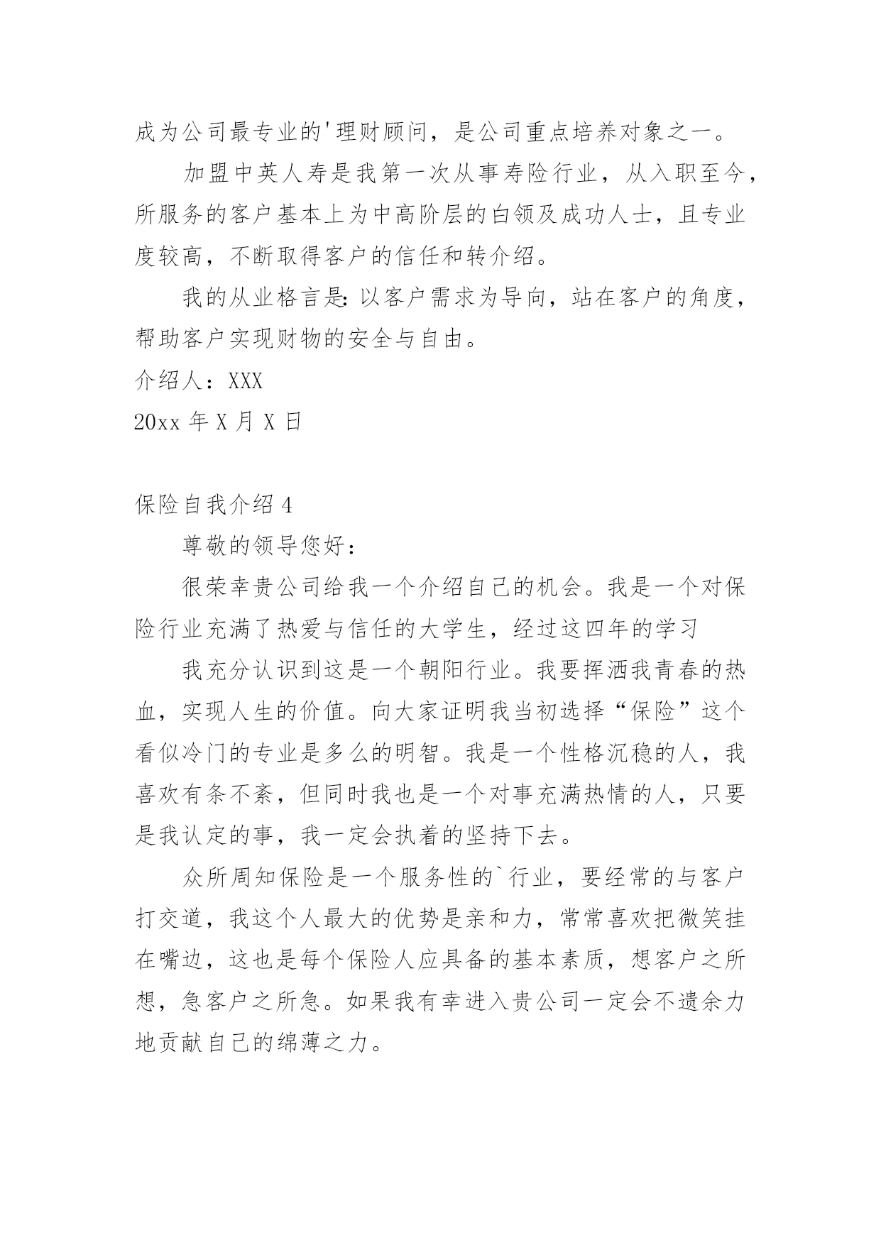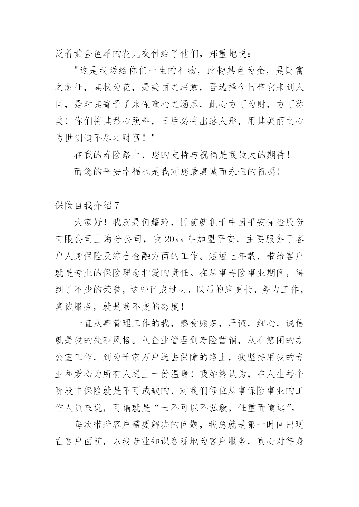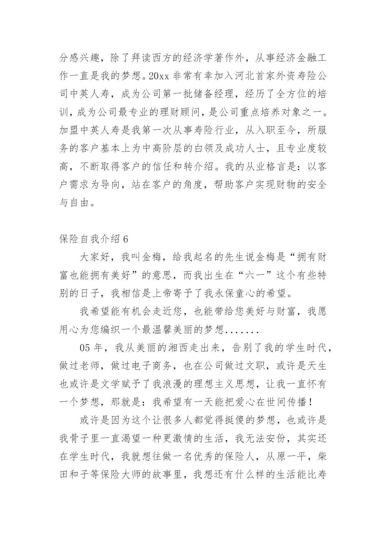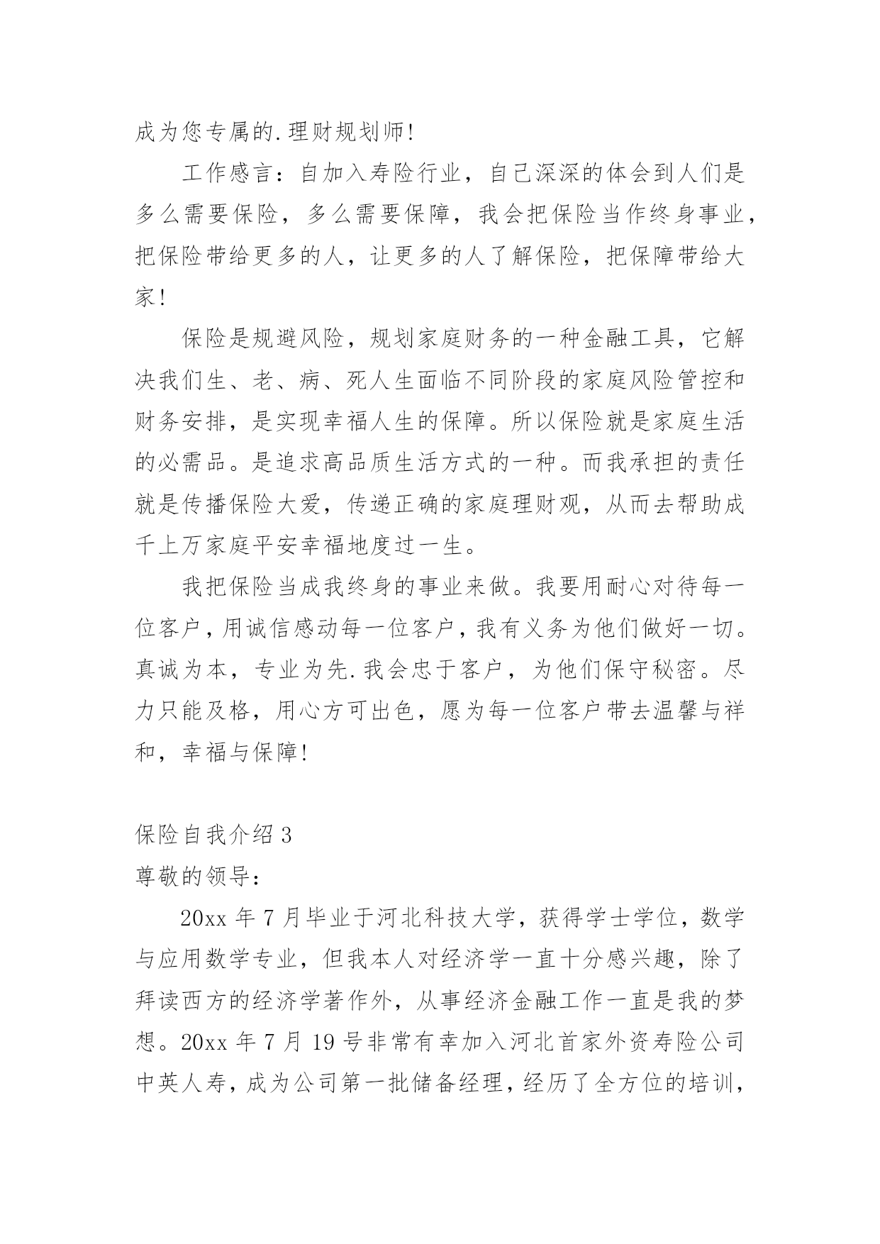 保险自我介绍保险自我介绍15篇当去到一个新环境下,我们时常会需要作自我介绍,自我介绍是让陌生人彼此认识的好方法。千万不能认为自我介绍随便应付就可以,下面是小编整理的保险自我介绍,欢迎大家分享。保险自我介绍1尊敬的各位领导,各位前辈:大家好!我来到xxx虽然只有一天的时间,但在这短短的一天里,在和x总、x总、xx执行总经理、x总,交流中,让我感到公司领导对工作的精益求精,不断创新,对员工的无微不至——让我感到加入xxx是幸运的。能成为公司的一员,我感到无比自豪,相信这种自豪感将使我更有激情投入到工作中。作为一名进入一个全新工作环境的新员工来说,尽管在过去的工作中有过一些工作经验,但刚进入公司,难免还是有点压力。所以在以后的工作免不了要向各位领导和同事多多请教。为了能让自我尽早进入工作状态和适应工作环境,我会努力学习,不断提高自我的业务水平。虽说来公司只有一天的时间,我却觉得过得十分充实和快乐,就是在以后的工作中再累也是值得的!我会尽快地适应了环境,全身心地投入到工作中去!因为正如我了解的那样,xxx是关心自我的每一个员工,给每一个员工足够的空间展现自我!对于我来说,xxx是一个区别于以往的新环境,所接触的人和事物一切都是新的。作为新员工,我会去主动了解、适应环境,同时也要将自我优越的'方面展现给公司,在充分信任和合作的基础上会建立良好的人际关系。除此之外,我还要时刻持续高昂的学习激情,不断地补充知识,提高技能,以适应公司发展。在工作中我可能会有迷惑和压力,但是我相信只要能端正心态、有十足的信心勇敢地走下去,就必须会取得成功。社会在发展,信息在增长,挑战也在加剧。我不仅仅要发挥自身的优势,更要通过学习他人的经验,来提高自身的素质。xxx公司的发展目标是宏伟而长远的,公司的发展就是我们每个人的发展,我相信我有潜力把握机遇,与xxx一齐迎接挑战!保险自我介绍2大家好,我叫xx。从事保险这段时间来让我深刻认识到保险是一份神圣的职业,为千家万户送去保障,为客户排忧解难,为每一个家庭带去幸福和平安。买保险就是对生命的尊重,是对家庭关爱和责任的体现。我通过坚持不懈的努力,积累了丰富的专业理财知识,擅长针对不同的客户需求,为客户量体裁衣,设计最适合他们的家庭保障计划,让更多的人学会规划人生、享受人生。本人将会给您带来最好的服务,成为您专属的.理财规划师!工作感言:自加入寿险行业,自己深深的体会到人们是多么需要保险,多么需要保障,我会把保险当作终身事业,把保险带给更多的人,让更多的人了解保险,把保障带给大家!保险是规避风险,规划家庭财务的一种金融工具,它解决我们生、老、病、死人生面临不同阶段的家庭风险管控和财务安排,是实现幸福人生的保障。所以保险就是家庭生活的必需品。是追求高品质生活方式的一种。而我承担的责任就是传播保险大爱,传递正确的家庭理财观,从而去帮助成千上万家庭平安幸福地度过一生。我把保险当成我终身的事业来做。我要用耐心对待每一位客户,用诚信感动每一位客户,我有义务为他们做好一切。真诚为本,专业为先.我会忠于客户,为他们保守秘密。尽力只能及格,用心方可出色,愿为每一位客户带去温馨与祥和,幸福与保障!保险自我介绍3尊敬的领导:20xx年7月毕业于河北科技大学,获得学士学位,数学与应用数学专业,但我本人对经济学一直十分感兴趣,除了拜读西方的经济学著作外,从事经济金融工作一直是我的梦想。20xx年7月19号非常有幸加入河北首家外资寿险公司中英人寿,成为公司第一批储备经理,经历了全方位的培训,成为公司最专业的'理财顾问,是公司重点培养对象之一。加盟中英人寿是我第一次从事寿险行业,从入职至今,所服务的客户基本上为中高阶层的白领及成功人士,且专业度较高,不断取得客户的信任和转介绍。我的从业格言是:以客户需求为导向,站在客户的角度,帮助客户实现财物的安全与自由。介绍人:XXX20xx年X月X日保险自我介绍4尊敬的领导您好:很荣幸贵公司给我一个介绍自己的机会。我是一个对保险行业充满了热爱与信任的大学生,经过这四年的学习我充分认识到这是一个朝阳行业。我要挥洒我青春的热血,实现人生的价值。向大家证明我当初选择“保险”这个看似冷门的专业是多么的明智。我是一个性格沉稳的人,我喜欢有条不紊,但同时我也是一个对事充满热情的人,只要是我认定的事,我一定会执着的坚持下去。众所周知保险是一个服务性的`行业,要经常的与客户打交道,我这个人最大的优势是亲和力,常常喜欢把微笑挂在嘴边,这也是每个保险人应具备的基本素质,想客户之所想,急客户之所急。如果我有幸进入贵公司一定会不遗余力地贡献自己的绵薄之力。保险自我介绍5我是来自大学市场营销专业的应届毕业生,我叫,我个人比较喜欢看书,因为书籍能够丰富我的知识。平时我还比较喜欢跑步,因为我认为跑步在无形中能够磨练我的意志,我为人很真