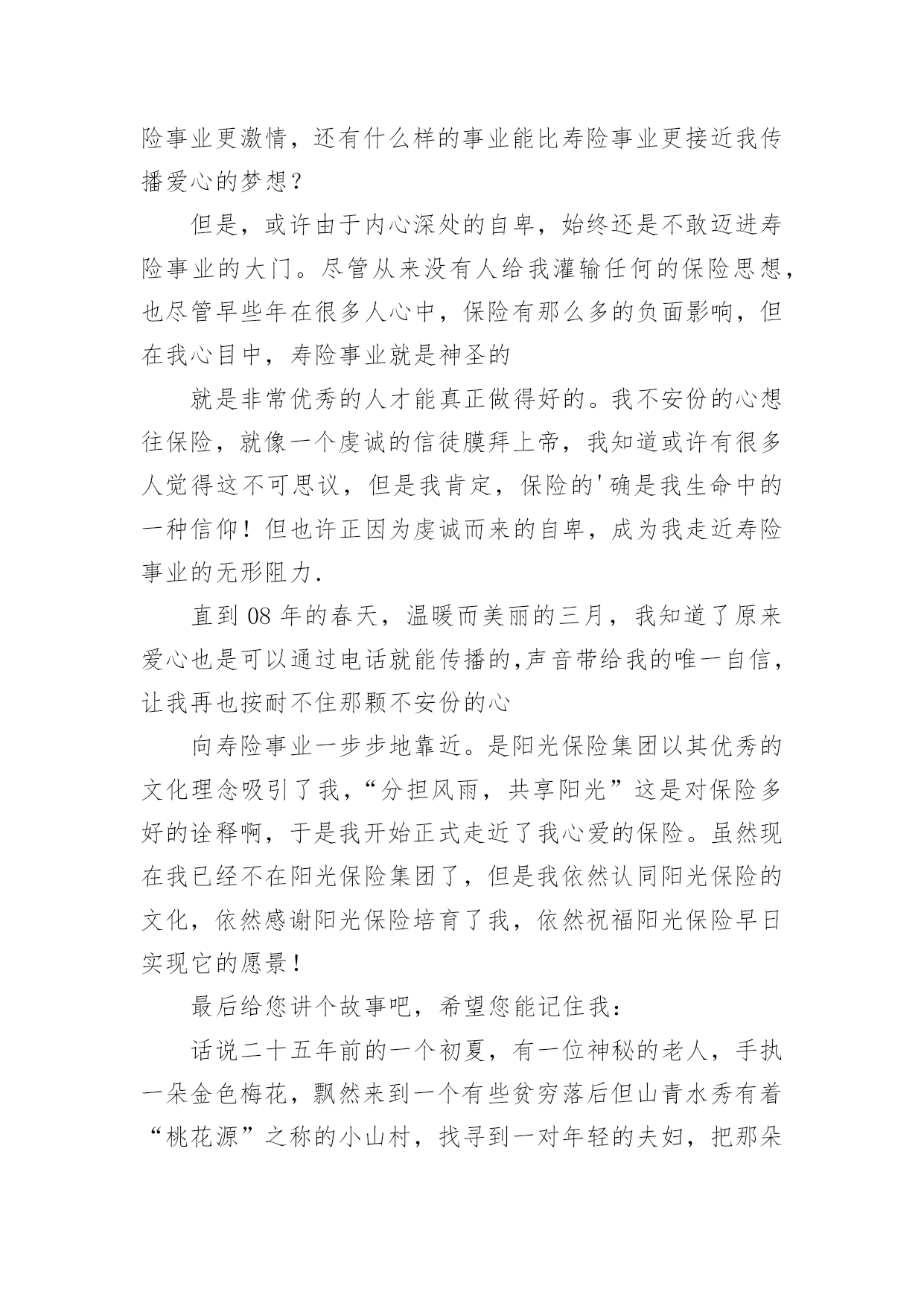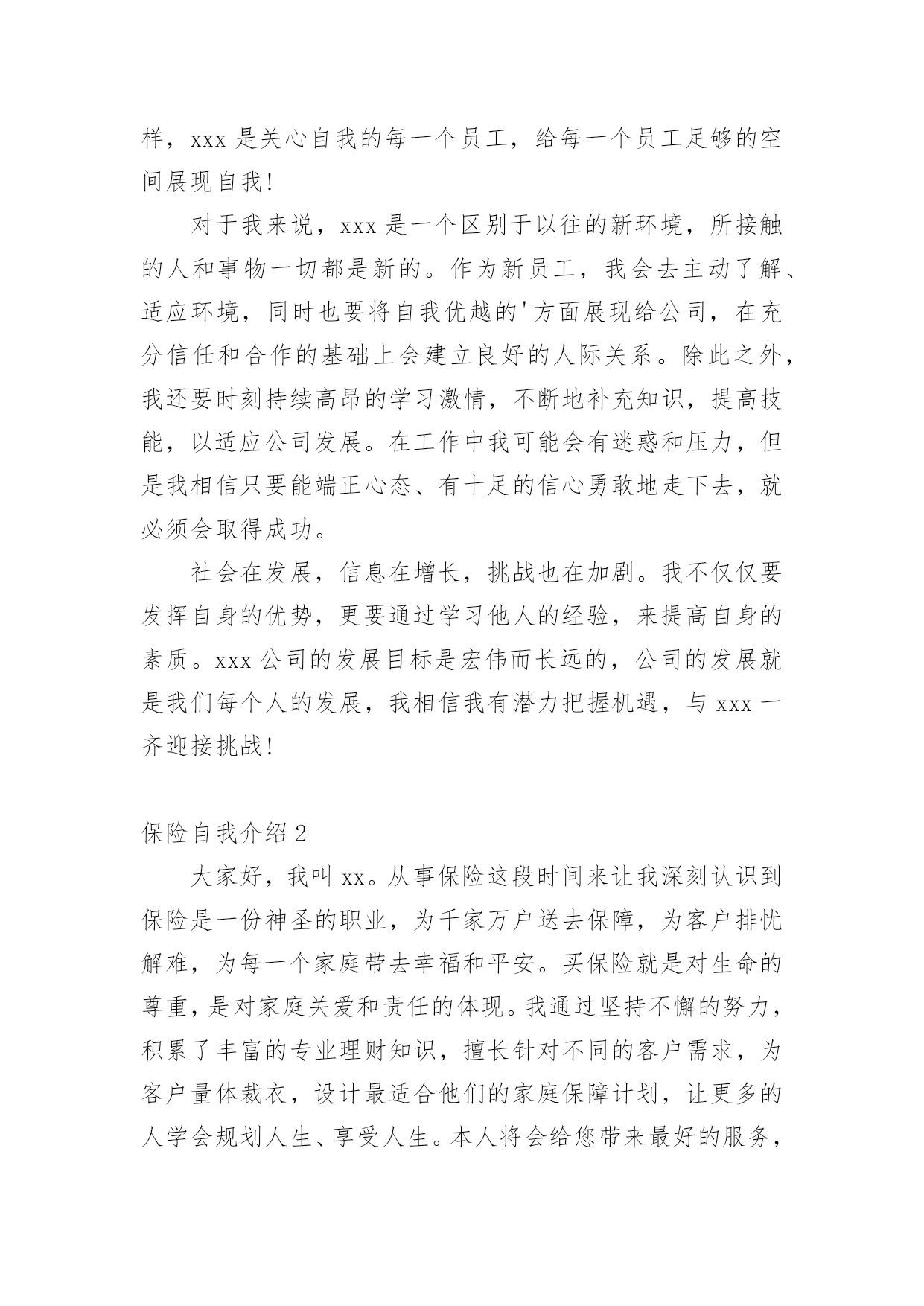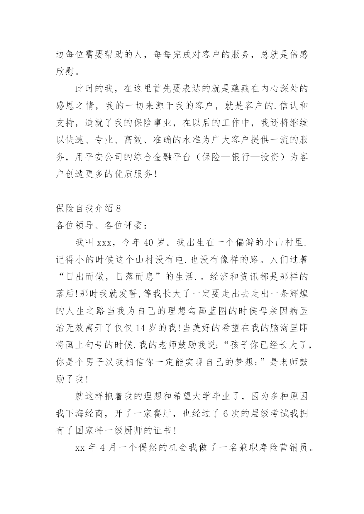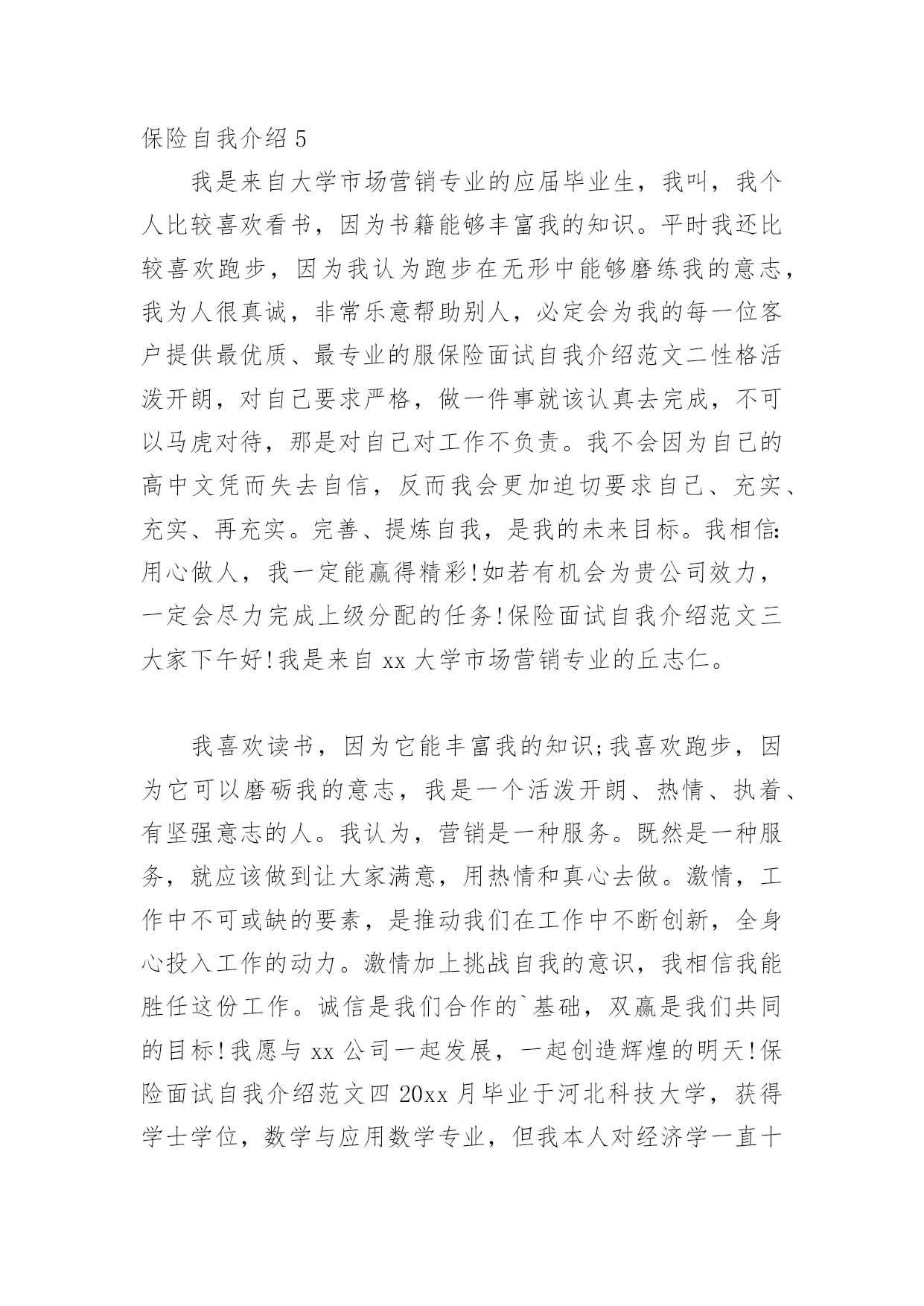 保险自我介绍保险自我介绍15篇当去到一个新环境下,我们时常会需要作自我介绍,自我介绍是让陌生人彼此认识的好方法。千万不能认为自我介绍随便应付就可以,下面是小编整理的保险自我介绍,欢迎大家分享。保险自我介绍1尊敬的各位领导,各位前辈:大家好!我来到xxx虽然只有一天的时间,但在这短短的一天里,在和x总、x总、xx执行总经理、x总,交流中,让我感到公司领导对工作的精益求精,不断创新,对员工的无微不至——让我感到加入xxx是幸运的。能成为公司的一员,我感到无比自豪,相信这种自豪感将使我更有激情投入到工作中。作为一名进入一个全新工作环境的新员工来说,尽管在过去的工作中有过一些工作经验,但刚进入公司,难免还是有点压力。所以在以后的工作免不了要向各位领导和同事多多请教。为了能让自我尽早进入工作状态和适应工作环境,我会努力学习,不断提高自我的业务水平。虽说来公司只有一天的时间,我却觉得过得十分充实和快乐,就是在以后的工作中再累也是值得的!我会尽快地适应了环境,全身心地投入到工作中去!因为正如我了解的那样,xxx是关心自我的每一个员工,给每一个员工足够的空间展现自我!对于我来说,xxx是一个区别于以往的新环境,所接触的人和事物一切都是新的。作为新员工,我会去主动了解、适应环境,同时也要将自我优越的'方面展现给公司,在充分信任和合作的基础上会建立良好的人际关系。除此之外,我还要时刻持续高昂的学习激情,不断地补充知识,提高技能,以适应公司发展。在工作中我可能会有迷惑和压力,但是我相信只要能端正心态、有十足的信心勇敢地走下去,就必须会取得成功。社会在发展,信息在增长,挑战也在加剧。我不仅仅要发挥自身的优势,更要通过学习他人的经验,来提高自身的素质。xxx公司的发展目标是宏伟而长远的,公司的发展就是我们每个人的发展,我相信我有潜力把握机遇,与xxx一齐迎接挑战!保险自我介绍2大家好,我叫xx。从事保险这段时间来让我深刻认识到保险是一份神圣的职业,为千家万户送去保障,为客户排忧解难,为每一个家庭带去幸福和平安。买保险就是对生命的尊重,是对家庭关爱和责任的体现。我通过坚持不懈的努力,积累了丰富的专业理财知识,擅长针对不同的客户需求,为客户量体裁衣,设计最适合他们的家庭保障计划,让更多的人学会规划人生、享受人生。本人将会给您带来最好的服务,成为您专属的.理财规划师!工作感言:自加入寿险行业,自己深深的体会到人们是多么需要保险,多么需要保障,我会把保险当作终身事业,把保险带给更多的人,让更多的人了解保险,把保障带给大家!保险是规避风险,规划家庭财务的一种金融工具,它解决我们生、老、病、死人生面临不同阶段的家庭风险管控和财务安排,是实现幸福人生的保障。所以保险就是家庭生活的必需品。是追求高品质生活方式的一种。而我承担的责任就是传播保险大爱,传递正确的家庭理财观,从而去帮助成千上万家庭平安幸福地度过一生。我把保险当成我终身的事业来做。我要用耐心对待每一位客户,用诚信感动每一位客户,我有义务为他们做好一切。真诚为本,专业为先.我会忠于客户,为他们保守秘密。尽力只能及格,用心方可出色,愿为每一位客户带去温馨与祥和,幸福与保障!保险自我介绍3尊敬的领导:20xx年7月毕业于河北科技大学,获得学士学位,数学与应用数学专业,但我本人对经济学一直十分感兴趣,除了拜读西方的经济学著作外,从事经济金融工作一直是我的梦想。20xx年7月19号非常有幸加入河北首家外资寿险公司中英人寿,成为公司第一批储备经理,经历了全方位的培训,成为公司最专业的'理财顾问,是公司重点培养对象之一。加盟中英人寿是我第一次从事寿险行业,从入职至今,所服务的客户基本上为中高阶层的白领及成功人士,且专业度较高,不断取得客户的信任和转介绍。我的从业格言是:以客户需求为导向,站在客户的角度,帮助客户实现财物的安全与自由。介绍人:XXX20xx年X月X日保险自我介绍4尊敬的领导您好:很荣幸贵公司给我一个介绍自己的机会。我是一个对保险行业充满了热爱与信任的大学生,经过这四年的学习我充分认识到这是一个朝阳行业。我要挥洒我青春的热血,实现人生的价值。向大家证明我当初选择“保险”这个看似冷门的专业是多么的明智。我是一个性格沉稳的人,我喜欢有条不紊,但同时我也是一个对事充满热情的人,只要是我认定的事,我一定会执着的坚持下去。众所周知保险是一个服务性的`行业,要经常的与客户打交道,我这个人最大的优势是亲和力,常常喜欢把微笑挂在嘴边,这也是每个保险人应具备的基本素质,想客户之所想,急客户之所急。如果我有幸进入贵公司一定会不遗余力地贡献自己的绵薄之力。保险自我介绍5我是来自大学市场营销专业的应届毕业生,我叫,我个人比较喜欢看书,因为书籍能够丰富我的知识。平时我还比较喜欢跑步,因为我认为跑步在无形中能够磨练我的意志,我为人很真