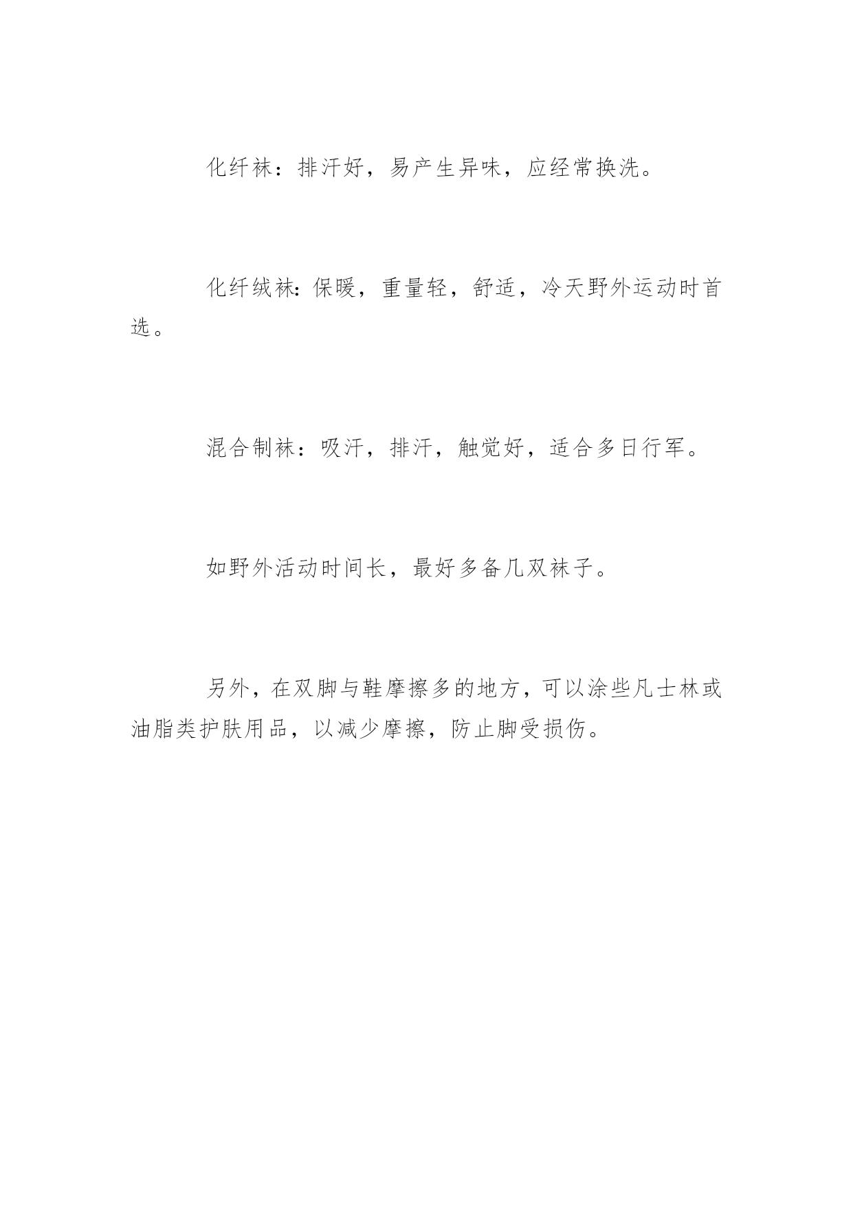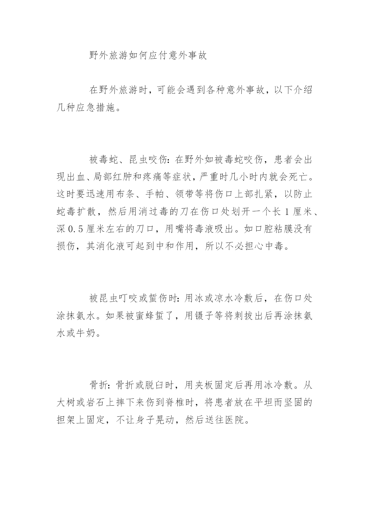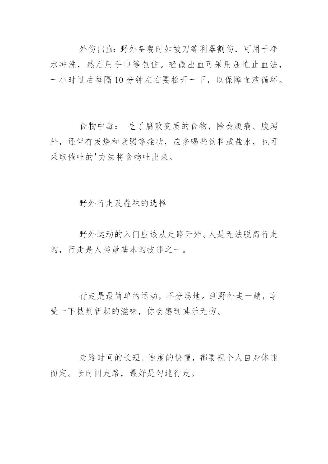 野外旅游小常识野外旅游小常识有些朋友喜欢野外旅游,显而易见就是困难自然会多。下面小编给大家分享一些野外旅游的小常识,想对你们有所帮助。野外步行秘诀认真走路我们走路时,不要一面走路一面想如何走路。把走路当作目的,认真去走。刚开始训练走路,在平地上,最少要走15分钟。练习快走时,我们呼吸会加快、出汁、小腿肚、脚底、腹侧都会发痛。当你感到身体某部份发痛,常会中断走路。其实走路如同赛跑,要有技术。有时离开道路而走发痛的原因有很多,可能因为鞋子、袜子、走路方法所引起。我们在后面会告诉各位走路的要领。走路是一项很好的'运动,人们未发明汽车时,就是以双脚为交通工具。走路可以训练脚肌肉结实,促进身体健康。对自己走路及健康有了信心,不妨离开道路,到野外山路走一走(当然要避免走施工现场,要享受披荆斩棘开路的趣味。本来路就是人走出来的。)绕远路也有一番乐趣不要经常走同样一条路,不妨绕远路、看看周围环境,因为气候、季节的不同,而有不一样的变化。有时不妨停下脚步好好观察,说不定有新发现。长时间走路,最好以同样速度前进野外旅游如何应付意外事故在野外旅游时,可能会遇到各种意外事故,以下介绍几种应急措施。被毒蛇、昆虫咬伤:在野外如被毒蛇咬伤,患者会出现出血、局部红肿和疼痛等症状,严重时几小时内就会死亡。这时要迅速用布条、手帕、领带等将伤口上部扎紧,以防止蛇毒扩散,然后用消过毒的刀在伤口处划开一个长1厘米、深0.5厘米左右的刀口,用嘴将毒液吸出。如口腔粘膜没有损伤,其消化液可起到中和作用,所以不必担心中毒。被昆虫叮咬或蜇伤时:用冰或凉水冷敷后,在伤口处涂抹氨水。如果被蜜蜂蜇了,用镊子等将刺拔出后再涂抹氨水或牛奶。骨折:骨折或脱臼时,用夹板固定后再用冰冷敷。从大树或岩石上摔下来伤到脊椎时,将患者放在平坦而坚固的担架上固定,不让身子晃动,然后送往医院。外伤出血:野外备餐时如被刀等利器割伤,可用干净水冲洗,然后用手巾等包住。轻微出血可采用压迫止血法,一小时过后每隔10分钟左右要松开一下,以保障血液循环。食物中毒:吃了腐败变质的食物,除会腹痛、腹泻外,还伴有发烧和衰弱等症状,应多喝些饮料或盐水,也可采取催吐的'方法将食物吐出来。野外行走及鞋袜的选择野外运动的入门应该从走路开始。人是无法脱离行走的,行走是人类最基本的技能之一。行走是最简单的运动,不分场地。到野外走一趟,享受一下披荆斩棘的滋味,你会感到其乐无穷。走路时间的长短、速度的快慢,都要视个人自身体能而定。长时间走路,最好是匀速行走。上坡时,步子放小些,每一步都要稳。如果上坡太陡,可以走"之"字形。下坡时,也不要破坏原来行走的节奏,应扎扎实实地走。把鞋带系得紧一些,特别是在踝部,以免顶伤脚尖。通过吊桥时,吊桥很容易摇荡,最好一个一个地过。如有恐高者,眼睛向前方看,注意保持节奏。过独木桥时,将脚步变为外"八"字,眼睛看前方一两米处。通过速度的快慢要根据独木桥的长短、宽窄而定,如独木桥又窄又长,要小心慢行,注意保持平衡。渡河时,最好结伴而行,要先了解河水深浅。遇河水较深时,应选择其他路线;河水比大腿浅,在夏天或春秋季可以涉水过河,但赤脚不安全。天冷时,要选择河中干燥的石头通过,注意石头的稳固性和自身的平衡。长途行军需要适当地休息。一般行军一小时左右,休息5~10分钟。由于每个人的.体能不同,休息要视个人情况而定。休息时不要呆着不动,应做些放松运动,喝点水,吃点小食品。走路的目的地不同,选择的鞋袜也就不同。一般的郊游,当天即回,穿普通运动鞋即可。到野外走路,特别是山路,不要穿新鞋。因为脚与新鞋尚未磨合,穿新鞋容易使脚疲劳、受伤。在山间行走,各种情况都会遇到,所以,山间行走应选择结实的鞋子:鞋底要厚,底部有大而深的花纹,可以起到很好的防滑作用;鞋底用硬橡胶制成,在碎石及不平坦的路面上能有效地保护双脚;鞋帮要高且较硬,可以起到支持脚踝的作用;穿这种鞋,水不易浸入鞋内。这种鞋通称为登山鞋。登山鞋的鞋面通常用牛皮或1000D尼龙面料制成,真皮本身有一定的防水透气功能,尼龙面加防水透气膜也可起到同样作用。穿上鞋后,要感觉一下脚趾是否可以活动,如不能活动说明鞋太小,脚尖前端应留有一厘米空隙。还要走走看,如果脚跟与鞋跟之间滑动,就容易擦伤脚,这种鞋也是不合适的。鞋带不可系得太松或太紧,那样会使双脚过早出现疲劳,且易受伤。鞋带太长要剪掉,以免绊倒自己或被异物钩挂。要用扁平的带状鞋带,不要用圆形的绳状鞋带,因为绳状的鞋带不易系紧、易松开。行军中发现鞋带松开,要立即系好,以免发生危险。袜子的大小要适中,太大、太小都不要将就。脚是行走中最勤奋、最辛苦的,要善待双脚。袜子分棉制、毛制、化纤制和混合制等。棉制袜:吸汗,不排汗,触觉好,