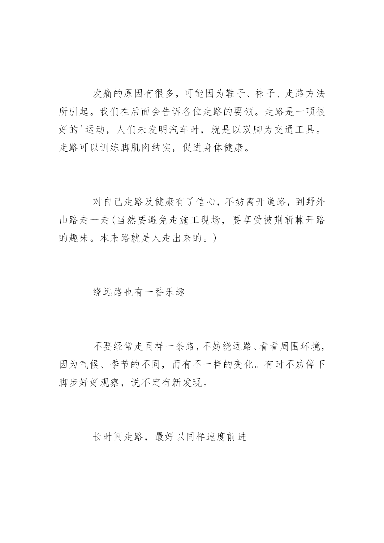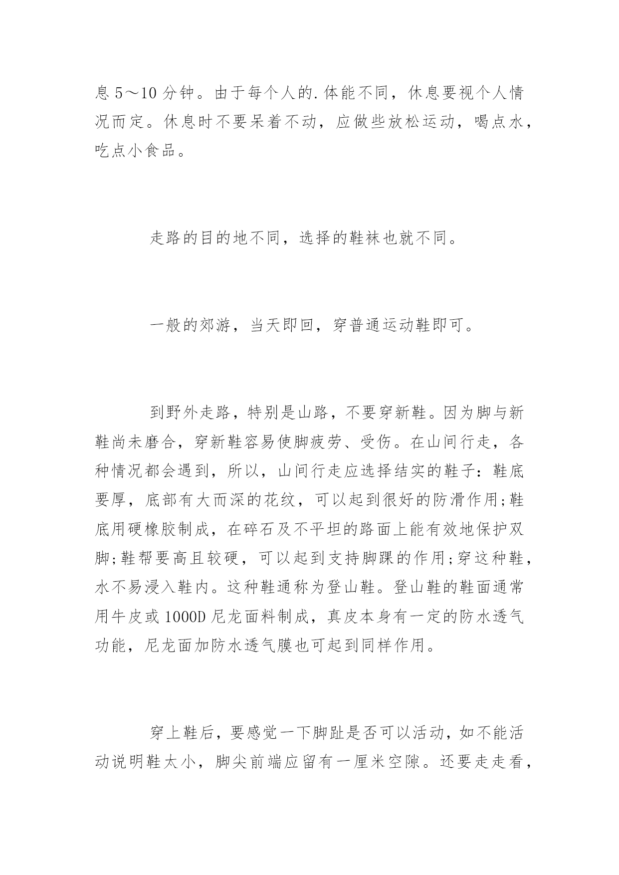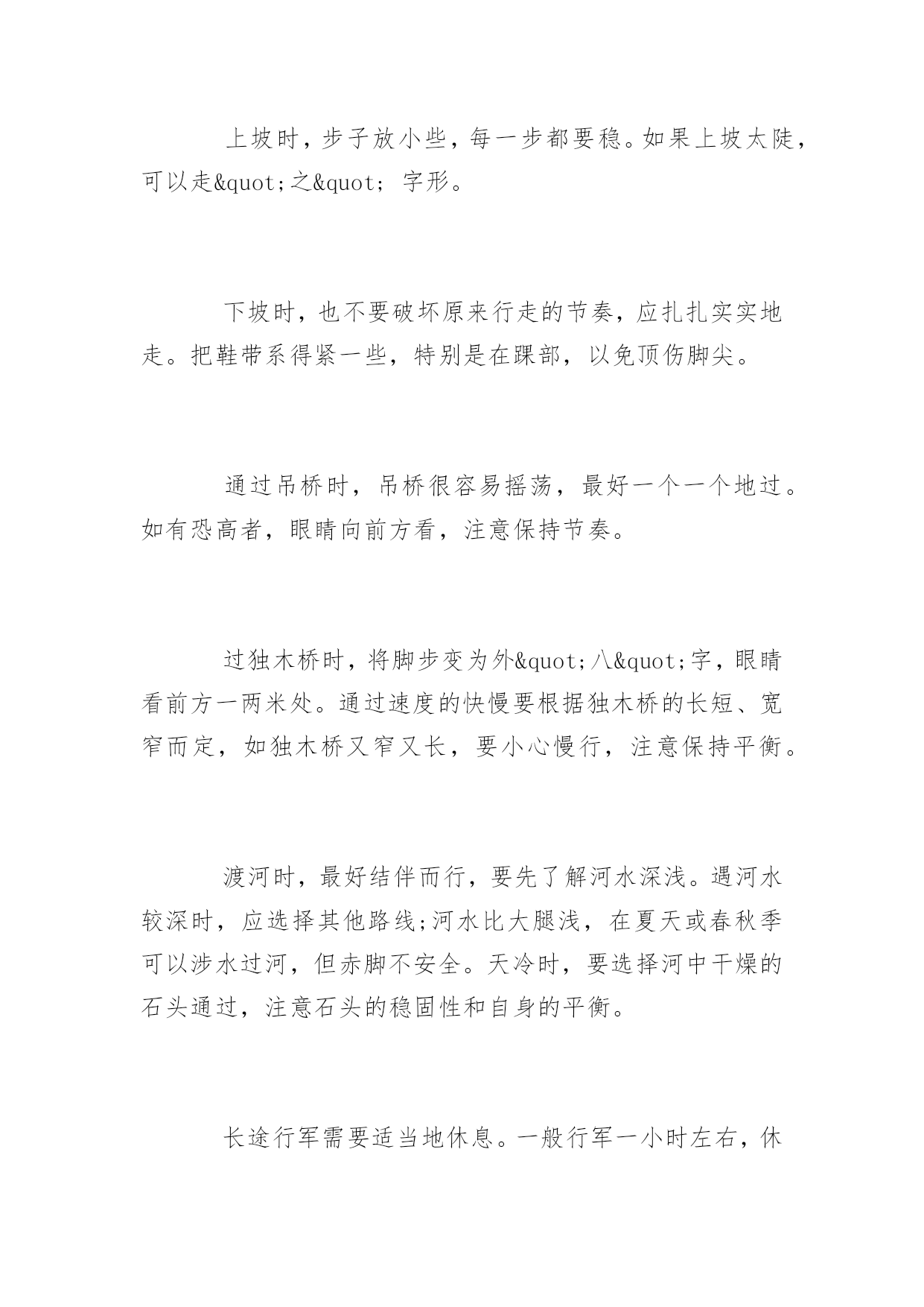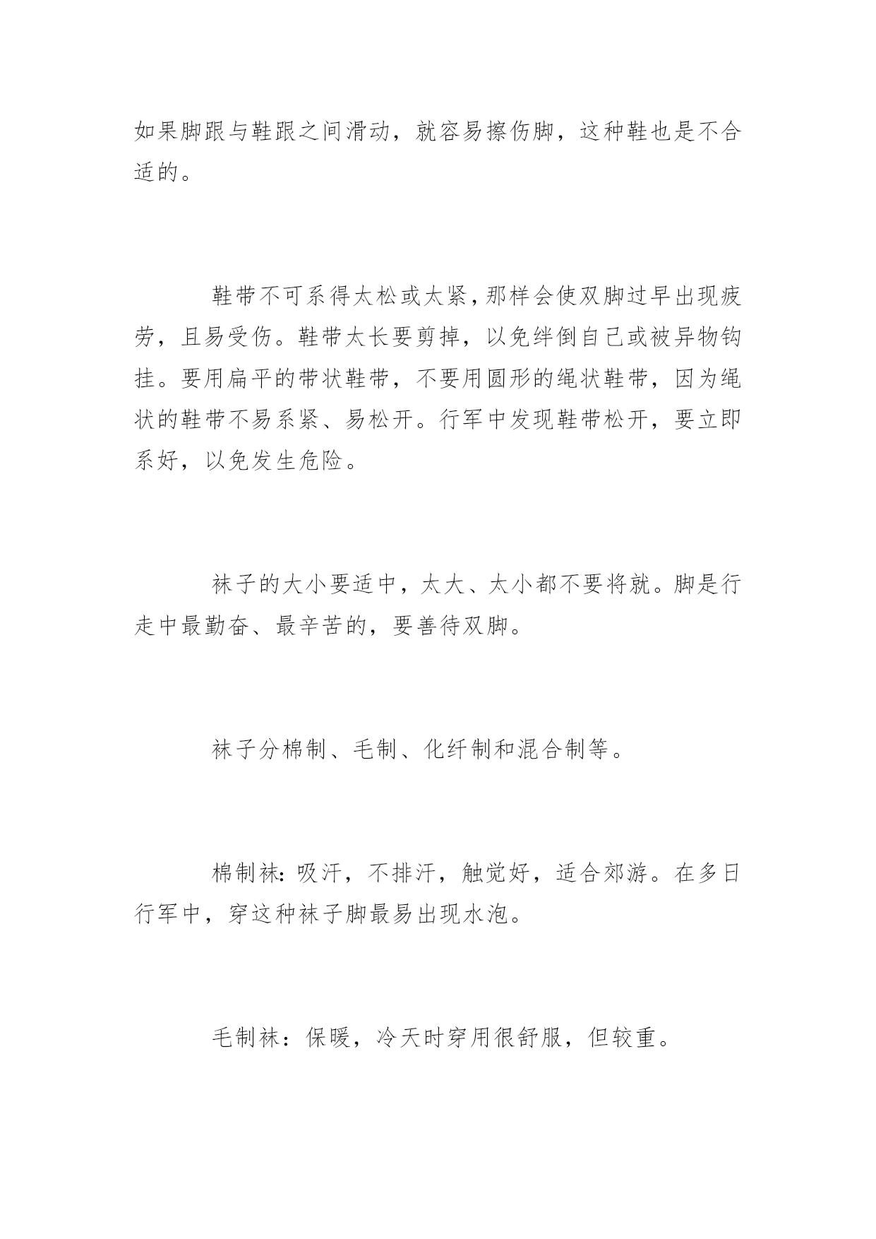 野外旅游小常识野外旅游小常识有些朋友喜欢野外旅游,显而易见就是困难自然会多。下面小编给大家分享一些野外旅游的小常识,想对你们有所帮助。野外步行秘诀认真走路我们走路时,不要一面走路一面想如何走路。把走路当作目的,认真去走。刚开始训练走路,在平地上,最少要走15分钟。练习快走时,我们呼吸会加快、出汁、小腿肚、脚底、腹侧都会发痛。当你感到身体某部份发痛,常会中断走路。其实走路如同赛跑,要有技术。有时离开道路而走发痛的原因有很多,可能因为鞋子、袜子、走路方法所引起。我们在后面会告诉各位走路的要领。走路是一项很好的'运动,人们未发明汽车时,就是以双脚为交通工具。走路可以训练脚肌肉结实,促进身体健康。对自己走路及健康有了信心,不妨离开道路,到野外山路走一走(当然要避免走施工现场,要享受披荆斩棘开路的趣味。本来路就是人走出来的。)绕远路也有一番乐趣不要经常走同样一条路,不妨绕远路、看看周围环境,因为气候、季节的不同,而有不一样的变化。有时不妨停下脚步好好观察,说不定有新发现。长时间走路,最好以同样速度前进野外旅游如何应付意外事故在野外旅游时,可能会遇到各种意外事故,以下介绍几种应急措施。被毒蛇、昆虫咬伤:在野外如被毒蛇咬伤,患者会出现出血、局部红肿和疼痛等症状,严重时几小时内就会死亡。这时要迅速用布条、手帕、领带等将伤口上部扎紧,以防止蛇毒扩散,然后用消过毒的刀在伤口处划开一个长1厘米、深0.5厘米左右的刀口,用嘴将毒液吸出。如口腔粘膜没有损伤,其消化液可起到中和作用,所以不必担心中毒。被昆虫叮咬或蜇伤时:用冰或凉水冷敷后,在伤口处涂抹氨水。如果被蜜蜂蜇了,用镊子等将刺拔出后再涂抹氨水或牛奶。骨折:骨折或脱臼时,用夹板固定后再用冰冷敷。从大树或岩石上摔下来伤到脊椎时,将患者放在平坦而坚固的担架上固定,不让身子晃动,然后送往医院。外伤出血:野外备餐时如被刀等利器割伤,可用干净水冲洗,然后用手巾等包住。轻微出血可采用压迫止血法,一小时过后每隔10分钟左右要松开一下,以保障血液循环。食物中毒:吃了腐败变质的食物,除会腹痛、腹泻外,还伴有发烧和衰弱等症状,应多喝些饮料或盐水,也可采取催吐的'方法将食物吐出来。野外行走及鞋袜的选择野外运动的入门应该从走路开始。人是无法脱离行走的,行走是人类最基本的技能之一。行走是最简单的运动,不分场地。到野外走一趟,享受一下披荆斩棘的滋味,你会感到其乐无穷。走路时间的长短、速度的快慢,都要视个人自身体能而定。长时间走路,最好是匀速行走。上坡时,步子放小些,每一步都要稳。如果上坡太陡,可以走"之"字形。下坡时,也不要破坏原来行走的节奏,应扎扎实实地走。把鞋带系得紧一些,特别是在踝部,以免顶伤脚尖。通过吊桥时,吊桥很容易摇荡,最好一个一个地过。如有恐高者,眼睛向前方看,注意保持节奏。过独木桥时,将脚步变为外"八"字,眼睛看前方一两米处。通过速度的快慢要根据独木桥的长短、宽窄而定,如独木桥又窄又长,要小心慢行,注意保持平衡。渡河时,最好结伴而行,要先了解河水深浅。遇河水较深时,应选择其他路线;河水比大腿浅,在夏天或春秋季可以涉水过河,但赤脚不安全。天冷时,要选择河中干燥的石头通过,注意石头的稳固性和自身的平衡。长途行军需要适当地休息。一般行军一小时左右,休息5~10分钟。由于每个人的.体能不同,休息要视个人情况而定。休息时不要呆着不动,应做些放松运动,喝点水,吃点小食品。走路的目的地不同,选择的鞋袜也就不同。一般的郊游,当天即回,穿普通运动鞋即可。到野外走路,特别是山路,不要穿新鞋。因为脚与新鞋尚未磨合,穿新鞋容易使脚疲劳、受伤。在山间行走,各种情况都会遇到,所以,山间行走应选择结实的鞋子:鞋底要厚,底部有大而深的花纹,可以起到很好的防滑作用;鞋底用硬橡胶制成,在碎石及不平坦的路面上能有效地保护双脚;鞋帮要高且较硬,可以起到支持脚踝的作用;穿这种鞋,水不易浸入鞋内。这种鞋通称为登山鞋。登山鞋的鞋面通常用牛皮或1000D尼龙面料制成,真皮本身有一定的防水透气功能,尼龙面加防水透气膜也可起到同样作用。穿上鞋后,要感觉一下脚趾是否可以活动,如不能活动说明鞋太小,脚尖前端应留有一厘米空隙。还要走走看,如果脚跟与鞋跟之间滑动,就容易擦伤脚,这种鞋也是不合适的。鞋带不可系得太松或太紧,那样会使双脚过早出现疲劳,且易受伤。鞋带太长要剪掉,以免绊倒自己或被异物钩挂。要用扁平的带状鞋带,不要用圆形的绳状鞋带,因为绳状的鞋带不易系紧、易松开。行军中发现鞋带松开,要立即系好,以免发生危险。袜子的大小要适中,太大、太小都不要将就。脚是行走中最勤奋、最辛苦的,要善待双脚。袜子分棉制、毛制、化纤制和混合制等。棉制袜:吸汗,不排汗,触觉好,