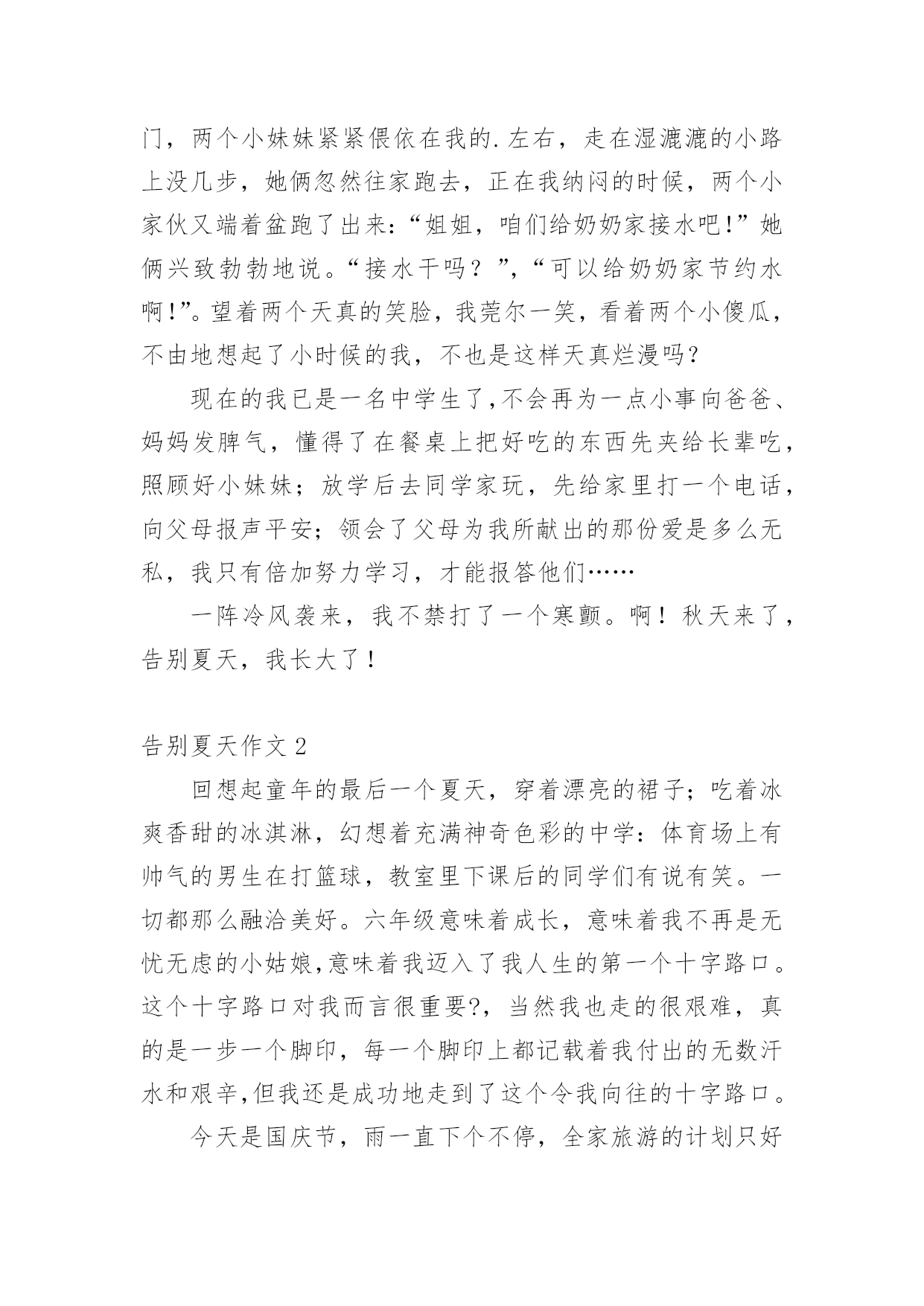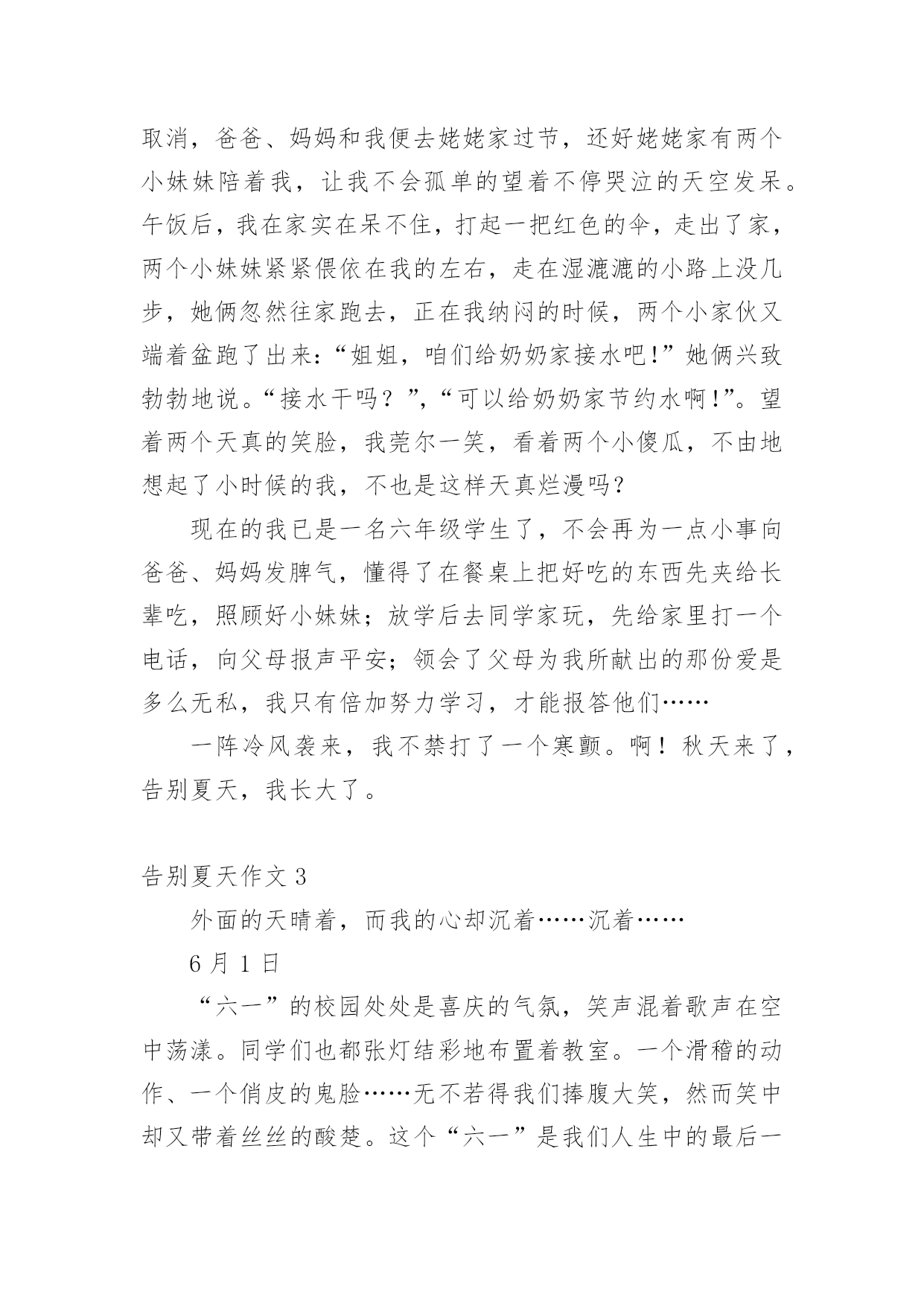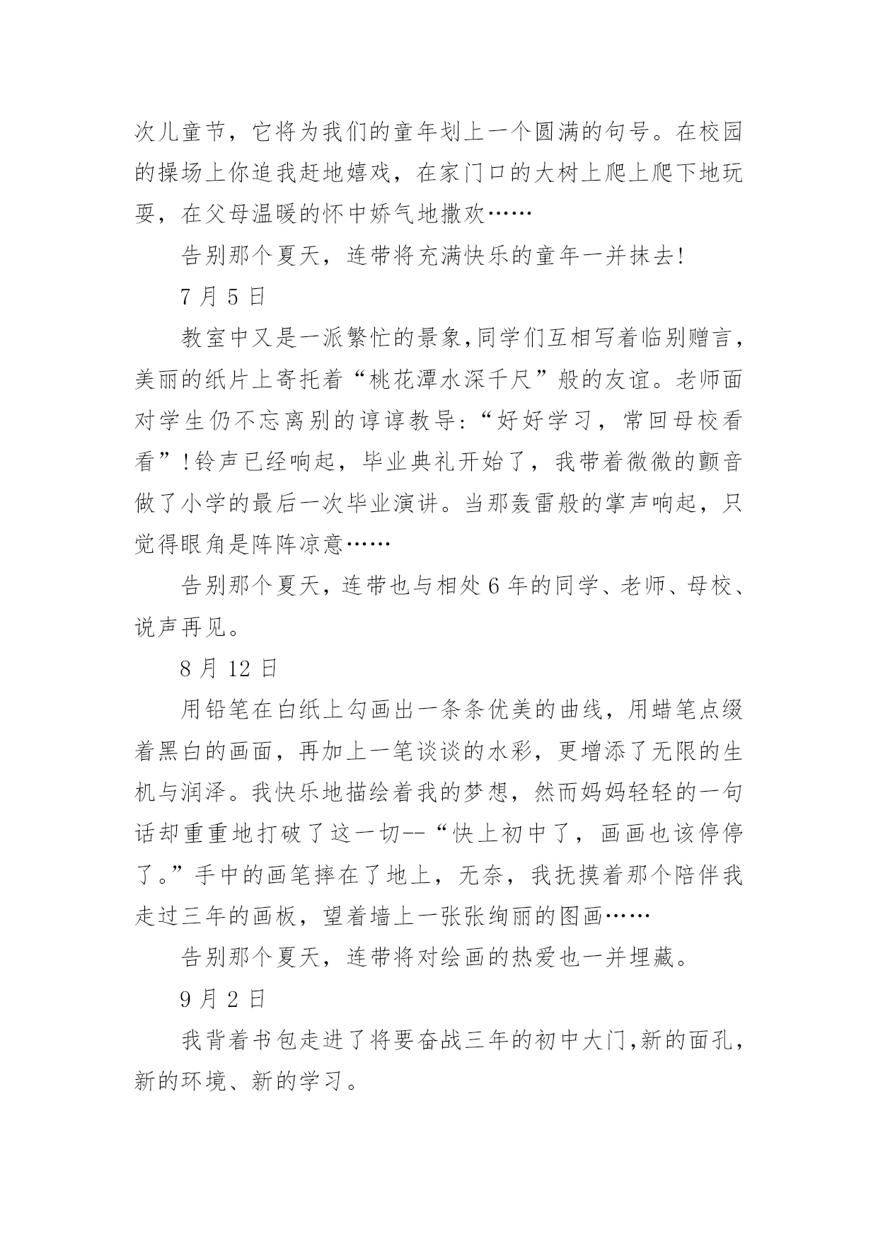 告别夏天作文在平平淡淡的日常中,大家都尝试过写作文吧,写作文可以锻炼我们的独处习惯,让自己的心静下来,思考自己未来的方向。为了让您在写作文时更加简单方便,下面是小编为大家收集的告别夏天作文,仅供参考,欢迎大家阅读。告别夏天作文1夏天、阳光、冰淇淋、花裙子,我想是每个女孩子的忠爱。我,一个刚刚升入中学的快乐女孩,回想起童年的最后一个夏天,穿着漂亮的裙子;吃着冰爽香甜的冰淇淋,幻想着充满神奇色彩的中学:操场上有帅气的男生在打篮球,教室里下课后的同学们有说有笑。一切都那么融洽美好。中学意味着成长,意味着我不再是无忧无虑的小姑娘,意味着我迈入了我人生的第一个十字路口。这个十字路口对我而言很重要,当然我也走的很艰难,真的是一步一个脚印,每一个脚印上都记载着我付出的无数汗水和艰辛,但我还是成功地走到了这个令我向往的十字路口,我很幸运,考上了一所省级重点中学,这也使爸爸、妈妈倍感欣慰。今天是国庆节,雨一直下个不停,全家旅游的计划只好取消,爸爸、妈妈和我便去姥姥家过节,还好姥姥家有两个小妹妹陪着我,让我不会孤单的望着不停哭泣的天空发呆。午饭后,我在家实在呆不住,打起一把红色的伞,走出了家门,两个小妹妹紧紧偎依在我的.左右,走在湿漉漉的小路上没几步,她俩忽然往家跑去,正在我纳闷的时候,两个小家伙又端着盆跑了出来:“姐姐,咱们给奶奶家接水吧!”她俩兴致勃勃地说。“接水干吗?”,“可以给奶奶家节约水啊!”。望着两个天真的笑脸,我莞尔一笑,看着两个小傻瓜,不由地想起了小时候的我,不也是这样天真烂漫吗?现在的我已是一名中学生了,不会再为一点小事向爸爸、妈妈发脾气,懂得了在餐桌上把好吃的东西先夹给长辈吃,照顾好小妹妹;放学后去同学家玩,先给家里打一个电话,向父母报声平安;领会了父母为我所献出的那份爱是多么无私,我只有倍加努力学习,才能报答他们……一阵冷风袭来,我不禁打了一个寒颤。啊!秋天来了,告别夏天,我长大了!告别夏天作文2回想起童年的最后一个夏天,穿着漂亮的裙子;吃着冰爽香甜的冰淇淋,幻想着充满神奇色彩的中学:体育场上有帅气的男生在打篮球,教室里下课后的同学们有说有笑。一切都那么融洽美好。六年级意味着成长,意味着我不再是无忧无虑的小姑娘,意味着我迈入了我人生的第一个十字路口。这个十字路口对我而言很重要?,当然我也走的很艰难,真的是一步一个脚印,每一个脚印上都记载着我付出的无数汗水和艰辛,但我还是成功地走到了这个令我向往的十字路口。今天是国庆节,雨一直下个不停,全家旅游的计划只好取消,爸爸、妈妈和我便去姥姥家过节,还好姥姥家有两个小妹妹陪着我,让我不会孤单的望着不停哭泣的天空发呆。午饭后,我在家实在呆不住,打起一把红色的伞,走出了家,两个小妹妹紧紧偎依在我的左右,走在湿漉漉的小路上没几步,她俩忽然往家跑去,正在我纳闷的时候,两个小家伙又端着盆跑了出来:“姐姐,咱们给奶奶家接水吧!”她俩兴致勃勃地说。“接水干吗?”,“可以给奶奶家节约水啊!”。望着两个天真的笑脸,我莞尔一笑,看着两个小傻瓜,不由地想起了小时候的我,不也是这样天真烂漫吗?现在的我已是一名六年级学生了,不会再为一点小事向爸爸、妈妈发脾气,懂得了在餐桌上把好吃的东西先夹给长辈吃,照顾好小妹妹;放学后去同学家玩,先给家里打一个电话,向父母报声平安;领会了父母为我所献出的那份爱是多么无私,我只有倍加努力学习,才能报答他们……一阵冷风袭来,我不禁打了一个寒颤。啊!秋天来了,告别夏天,我长大了。告别夏天作文3外面的天晴着,而我的心却沉着……沉着……6月1日“六一”的校园处处是喜庆的气氛,笑声混着歌声在空中荡漾。同学们也都张灯结彩地布置着教室。一个滑稽的动作、一个俏皮的鬼脸……无不若得我们捧腹大笑,然而笑中却又带着丝丝的酸楚。这个“六一”是我们人生中的最后一次儿童节,它将为我们的童年划上一个圆满的句号。在校园的操场上你追我赶地嬉戏,在家门口的大树上爬上爬下地玩耍,在父母温暖的怀中娇气地撒欢……告别那个夏天,连带将充满快乐的童年一并抹去!7月5日教室中又是一派繁忙的景象,同学们互相写着临别赠言,美丽的纸片上寄托着“桃花潭水深千尺”般的友谊。老师面对学生仍不忘离别的谆谆教导:“好好学习,常回母校看看”!铃声已经响起,毕业典礼开始了,我带着微微的颤音做了小学的最后一次毕业演讲。当那轰雷般的掌声响起,只觉得眼角是阵阵凉意……告别那个夏天,连带也与相处6年的同学、老师、母校、说声再见。8月12日用铅笔在白纸上勾画出一条条优美的曲线,用蜡笔点缀着黑白的画面,再加上一笔谈谈的水彩,更增添了无限的生机与润泽。我快乐地描绘着我的梦想,然而妈妈轻轻的一句话却重重地打破了这一切--“快上初中了,画画也该停停了。”手中的画笔摔在了地上,无奈,我抚摸着那个陪伴我走过三年的画板,望着墙上一张张绚丽的图画……告别那个夏天,连带将