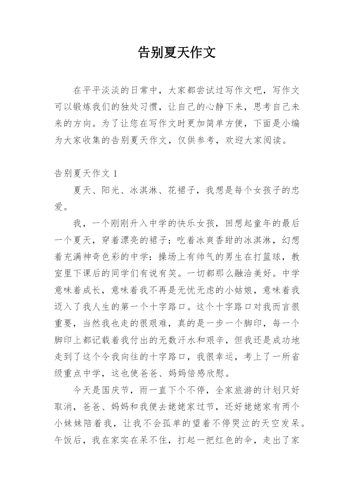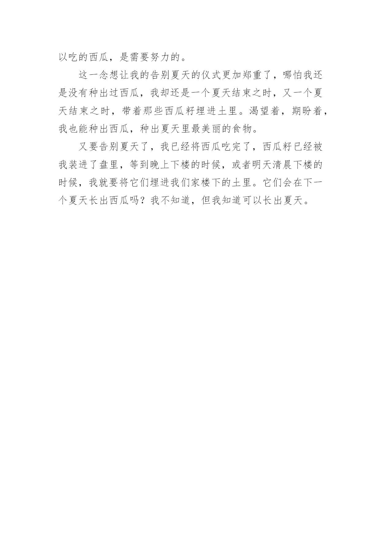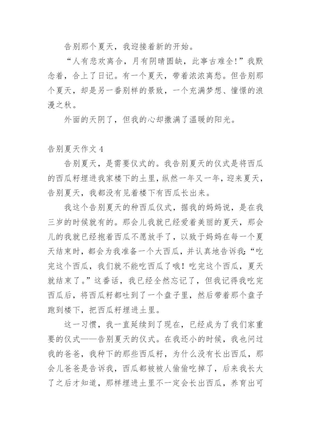 告别夏天作文在平平淡淡的日常中,大家都尝试过写作文吧,写作文可以锻炼我们的独处习惯,让自己的心静下来,思考自己未来的方向。为了让您在写作文时更加简单方便,下面是小编为大家收集的告别夏天作文,仅供参考,欢迎大家阅读。告别夏天作文1夏天、阳光、冰淇淋、花裙子,我想是每个女孩子的忠爱。我,一个刚刚升入中学的快乐女孩,回想起童年的最后一个夏天,穿着漂亮的裙子;吃着冰爽香甜的冰淇淋,幻想着充满神奇色彩的中学:操场上有帅气的男生在打篮球,教室里下课后的同学们有说有笑。一切都那么融洽美好。中学意味着成长,意味着我不再是无忧无虑的小姑娘,意味着我迈入了我人生的第一个十字路口。这个十字路口对我而言很重要,当然我也走的很艰难,真的是一步一个脚印,每一个脚印上都记载着我付出的无数汗水和艰辛,但我还是成功地走到了这个令我向往的十字路口,我很幸运,考上了一所省级重点中学,这也使爸爸、妈妈倍感欣慰。今天是国庆节,雨一直下个不停,全家旅游的计划只好取消,爸爸、妈妈和我便去姥姥家过节,还好姥姥家有两个小妹妹陪着我,让我不会孤单的望着不停哭泣的天空发呆。午饭后,我在家实在呆不住,打起一把红色的伞,走出了家门,两个小妹妹紧紧偎依在我的.左右,走在湿漉漉的小路上没几步,她俩忽然往家跑去,正在我纳闷的时候,两个小家伙又端着盆跑了出来:“姐姐,咱们给奶奶家接水吧!”她俩兴致勃勃地说。“接水干吗?”,“可以给奶奶家节约水啊!”。望着两个天真的笑脸,我莞尔一笑,看着两个小傻瓜,不由地想起了小时候的我,不也是这样天真烂漫吗?现在的我已是一名中学生了,不会再为一点小事向爸爸、妈妈发脾气,懂得了在餐桌上把好吃的东西先夹给长辈吃,照顾好小妹妹;放学后去同学家玩,先给家里打一个电话,向父母报声平安;领会了父母为我所献出的那份爱是多么无私,我只有倍加努力学习,才能报答他们……一阵冷风袭来,我不禁打了一个寒颤。啊!秋天来了,告别夏天,我长大了!告别夏天作文2回想起童年的最后一个夏天,穿着漂亮的裙子;吃着冰爽香甜的冰淇淋,幻想着充满神奇色彩的中学:体育场上有帅气的男生在打篮球,教室里下课后的同学们有说有笑。一切都那么融洽美好。六年级意味着成长,意味着我不再是无忧无虑的小姑娘,意味着我迈入了我人生的第一个十字路口。这个十字路口对我而言很重要?,当然我也走的很艰难,真的是一步一个脚印,每一个脚印上都记载着我付出的无数汗水和艰辛,但我还是成功地走到了这个令我向往的十字路口。今天是国庆节,雨一直下个不停,全家旅游的计划只好取消,爸爸、妈妈和我便去姥姥家过节,还好姥姥家有两个小妹妹陪着我,让我不会孤单的望着不停哭泣的天空发呆。午饭后,我在家实在呆不住,打起一把红色的伞,走出了家,两个小妹妹紧紧偎依在我的左右,走在湿漉漉的小路上没几步,她俩忽然往家跑去,正在我纳闷的时候,两个小家伙又端着盆跑了出来:“姐姐,咱们给奶奶家接水吧!”她俩兴致勃勃地说。“接水干吗?”,“可以给奶奶家节约水啊!”。望着两个天真的笑脸,我莞尔一笑,看着两个小傻瓜,不由地想起了小时候的我,不也是这样天真烂漫吗?现在的我已是一名六年级学生了,不会再为一点小事向爸爸、妈妈发脾气,懂得了在餐桌上把好吃的东西先夹给长辈吃,照顾好小妹妹;放学后去同学家玩,先给家里打一个电话,向父母报声平安;领会了父母为我所献出的那份爱是多么无私,我只有倍加努力学习,才能报答他们……一阵冷风袭来,我不禁打了一个寒颤。啊!秋天来了,告别夏天,我长大了。告别夏天作文3外面的天晴着,而我的心却沉着……沉着……6月1日“六一”的校园处处是喜庆的气氛,笑声混着歌声在空中荡漾。同学们也都张灯结彩地布置着教室。一个滑稽的动作、一个俏皮的鬼脸……无不若得我们捧腹大笑,然而笑中却又带着丝丝的酸楚。这个“六一”是我们人生中的最后一次儿童节,它将为我们的童年划上一个圆满的句号。在校园的操场上你追我赶地嬉戏,在家门口的大树上爬上爬下地玩耍,在父母温暖的怀中娇气地撒欢……告别那个夏天,连带将充满快乐的童年一并抹去!7月5日教室中又是一派繁忙的景象,同学们互相写着临别赠言,美丽的纸片上寄托着“桃花潭水深千尺”般的友谊。老师面对学生仍不忘离别的谆谆教导:“好好学习,常回母校看看”!铃声已经响起,毕业典礼开始了,我带着微微的颤音做了小学的最后一次毕业演讲。当那轰雷般的掌声响起,只觉得眼角是阵阵凉意……告别那个夏天,连带也与相处6年的同学、老师、母校、说声再见。8月12日用铅笔在白纸上勾画出一条条优美的曲线,用蜡笔点缀着黑白的画面,再加上一笔谈谈的水彩,更增添了无限的生机与润泽。我快乐地描绘着我的梦想,然而妈妈轻轻的一句话却重重地打破了这一切--“快上初中了,画画也该停停了。”手中的画笔摔在了地上,无奈,我抚摸着那个陪伴我走过三年的画板,望着墙上一张张绚丽的图画……告别那个夏天,连带将