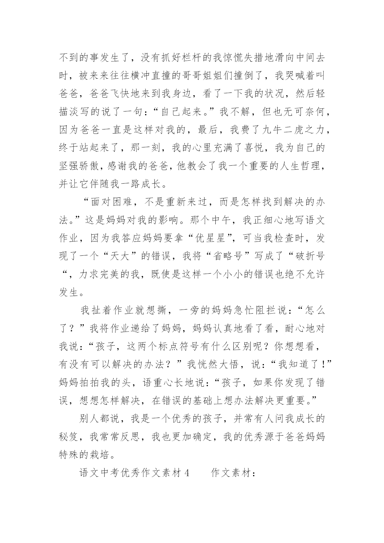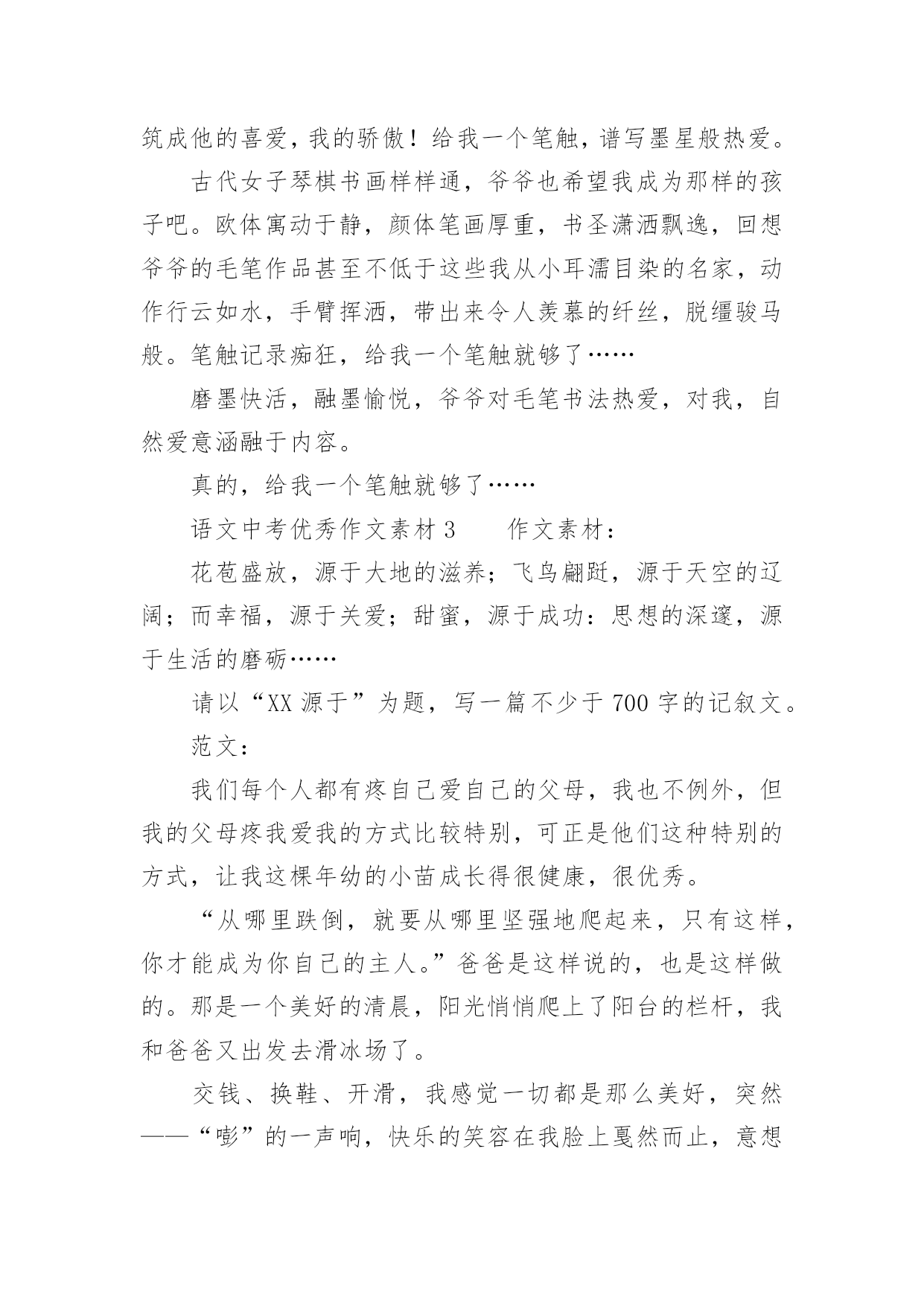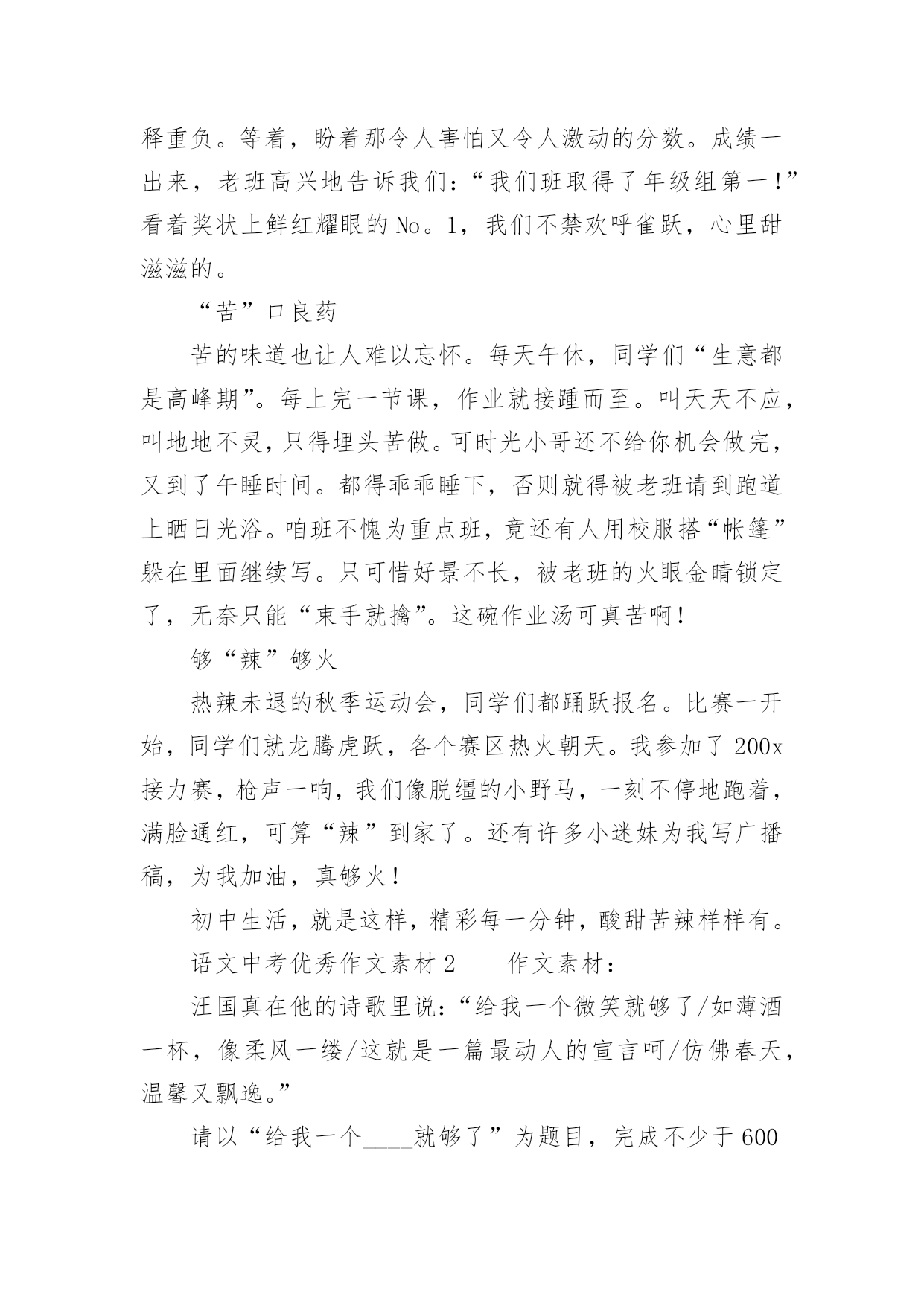 语文中考优秀作文素材2022语文中考优秀作文素材在现实学习生活中,大家最害怕的就是作文了吧?当你积累了一定的作文素材,写作文其实也没那么难。为了帮助大家写作文时更加简单方便,以下是小编帮大家整理的2022语文语文中考优秀作文素材,欢迎大家分享。语文语文中考优秀作文素材1作文素材:请以“酸甜苦辣才是生活”为话题,写一篇作文,不少于600字。范文:初中生活紧张而有节奏,充满活力与精彩,也像一个调味瓶酸甜苦辣样样有。“酸”梅止渴酸的味道让人“口水垂流千尺”。初中生活的酸也颇有一番风味。有一次我们趁老班心情好跟她申请开班会。老班斩钉截铁地说:“这次月考考好了就开,没考好就等着做试题吧!”同学们听了信心十足,“眉飞色舞”地说:“欧克欧克!”可考试成绩一出来,我们都像泄了气的皮球,垂头丧气,老班也铁青着脸。心里都酸溜溜的,一边抄试卷,一边叹气“希望越大,失望越大!”宝贝“甜”蜜酱甜的味道让人心情畅快。期末考试姗姗漫步而来,在考场上,我们拿着疾笔,一次又一次攻破难题。考完,我们如释重负。等着,盼着那令人害怕又令人激动的分数。成绩一出来,老班高兴地告诉我们:“我们班取得了年级组第一!”看着奖状上鲜红耀眼的No。1,我们不禁欢呼雀跃,心里甜滋滋的。“苦”口良药苦的味道也让人难以忘怀。每天午休,同学们“生意都是高峰期”。每上完一节课,作业就接踵而至。叫天天不应,叫地地不灵,只得埋头苦做。可时光小哥还不给你机会做完,又到了午睡时间。都得乖乖睡下,否则就得被老班请到跑道上晒日光浴。咱班不愧为重点班,竟还有人用校服搭“帐篷”躲在里面继续写。只可惜好景不长,被老班的火眼金睛锁定了,无奈只能“束手就擒”。这碗作业汤可真苦啊!够“辣”够火热辣未退的秋季运动会,同学们都踊跃报名。比赛一开始,同学们就龙腾虎跃,各个赛区热火朝天。我参加了200x接力赛,枪声一响,我们像脱缰的小野马,一刻不停地跑着,满脸通红,可算“辣”到家了。还有许多小迷妹为我写广播稿,为我加油,真够火!初中生活,就是这样,精彩每一分钟,酸甜苦辣样样有。语文中考优秀作文素材2作文素材:汪国真在他的诗歌里说:“给我一个微笑就够了/如薄酒一杯,像柔风一缕/这就是一篇最动人的宣言呵/仿佛春天,温馨又飘逸。”请以“给我一个____就够了”为题目,完成不少于600字的作文。要求:①请将题目补充完整;②除诗歌外,文体不限;③不许抄袭套写;④不得泄露个人信息。范文:一点烟展,碾墨品香。其实,给我一个笔触就够了。砚砚墨浓,黑宝石般,反光透出令人清爽的香。都说墨臭,但在我看来它却如柠檬茶,清亮。“看好了!”爷爷五六十岁时与我一同喜欢上了书法,而对这门学问早有了解的他,两堂课时间早已超越我,只留我还在感叹。白衬衫,文质彬彬,从自身散发出文艺老头独有的气质。手握笔,沾饱墨,看着毛笔由白到黑渗透,定为写大字而来。笔碰纸,开始了旅程。闻过古人磨砚坚持故事,当然也少不了爷爷亲自指导。“这个才是好墨!”不知从哪个古玩场弄来几块砚台,就像是宝贝般轻拿轻放,外面还用包装纸一层层裹着,打开时迎来满脸惊喜。爷爷爱笔,爷爷更爱墨。浓淡各异,挥,墨随着笔有力收放自如,宁静筋骨传奇。灰黑色裤子总短一小节,伴着顿笔时力度不同裤管总是上下浮动,频率不断却难有规律。“拿着。”一碗水,我得好好端着,细细看着这磨墨过程。双手紧握墨块,用力均匀地在砚台上做反复动作,看着珍贵的一点墨液,心里不由地自豪满足。“试试!”两字成功地打探起我对磨墨的兴趣,二话不说,说干就干。拿着早已充满温度的墨块与砚台使劲摩擦镜面。“吱!”自带音效的夸张动作换来满脸黑色星点,体会爷爷不容易,而正是这份不容易筑成他的喜爱,我的骄傲!给我一个笔触,谱写墨星般热爱。古代女子琴棋书画样样通,爷爷也希望我成为那样的孩子吧。欧体寓动于静,颜体笔画厚重,书圣潇洒飘逸,回想爷爷的毛笔作品甚至不低于这些我从小耳濡目染的名家,动作行云如水,手臂挥洒,带出来令人羡慕的纤丝,脱缰骏马般。笔触记录痴狂,给我一个笔触就够了……磨墨快活,融墨愉悦,爷爷对毛笔书法热爱,对我,自然爱意涵融于内容。真的,给我一个笔触就够了……语文中考优秀作文素材3作文素材:花苞盛放,源于大地的滋养;飞鸟翩跹,源于天空的辽阔;而幸福,源于关爱;甜蜜,源于成功:思想的深邃,源于生活的磨砺……请以“XX源于”为题,写一篇不少于700字的记叙文。范文:我们每个人都有疼自己爱自己的父母,我也不例外,但我的父母疼我爱我的方式比较特别,可正是他们这种特别的方式,让我这棵年幼的小苗成长得很健康,很优秀。“从哪里跌倒,就要从哪里坚强地爬起来,只有这样,你才能成为你自己的主人。”爸爸是这样说的,也是这样做的。那是一个美好的清晨,阳光悄悄爬上了阳台的栏杆,我和爸爸又出发去滑冰场了。交钱、换鞋、开滑,我感觉一切都是那么美好,突然——“嘭”的一声响,