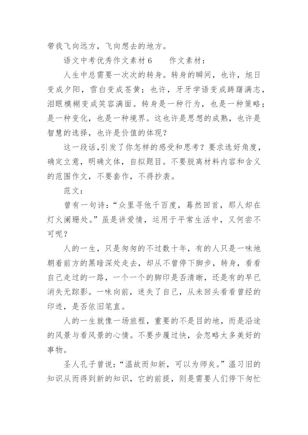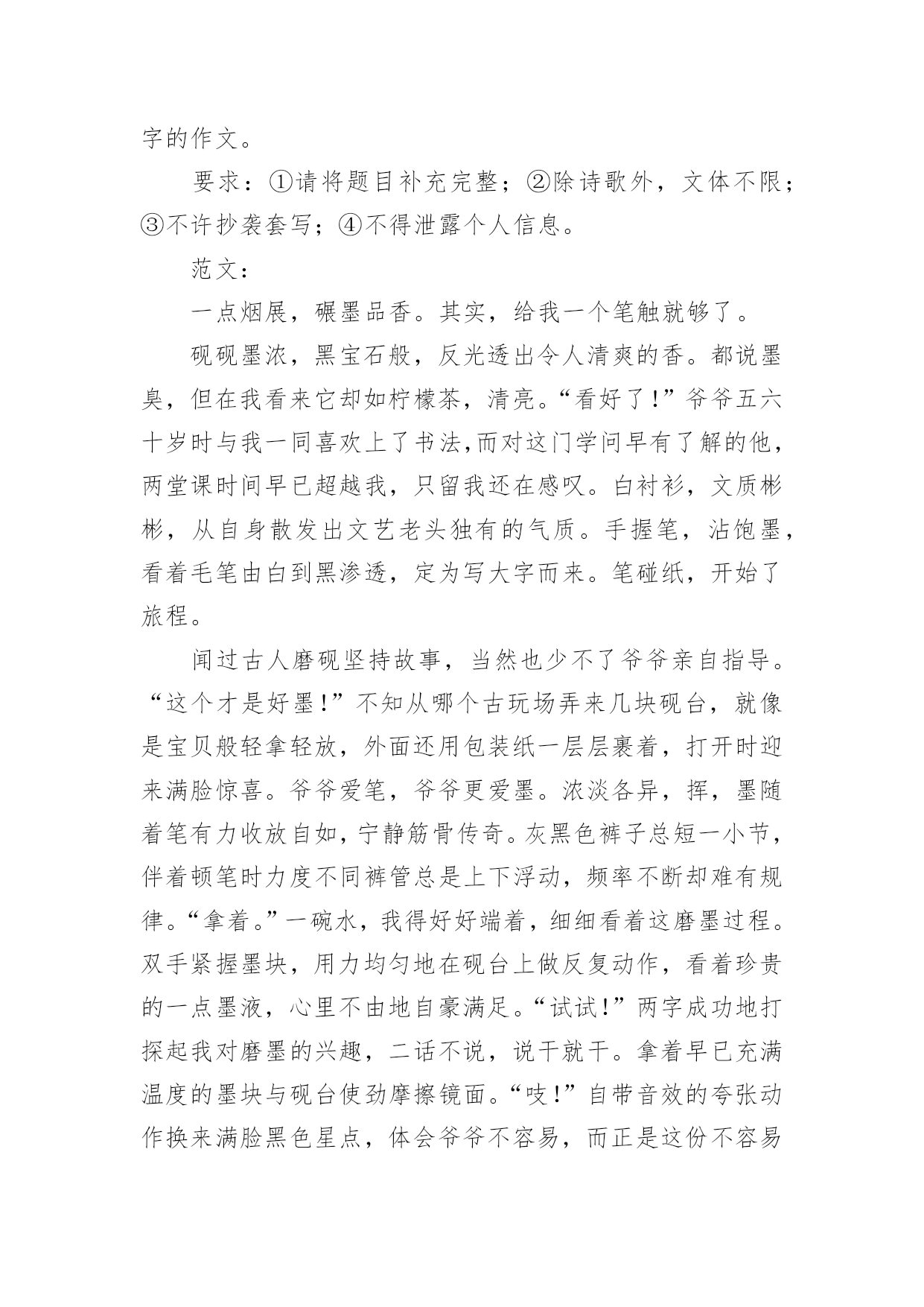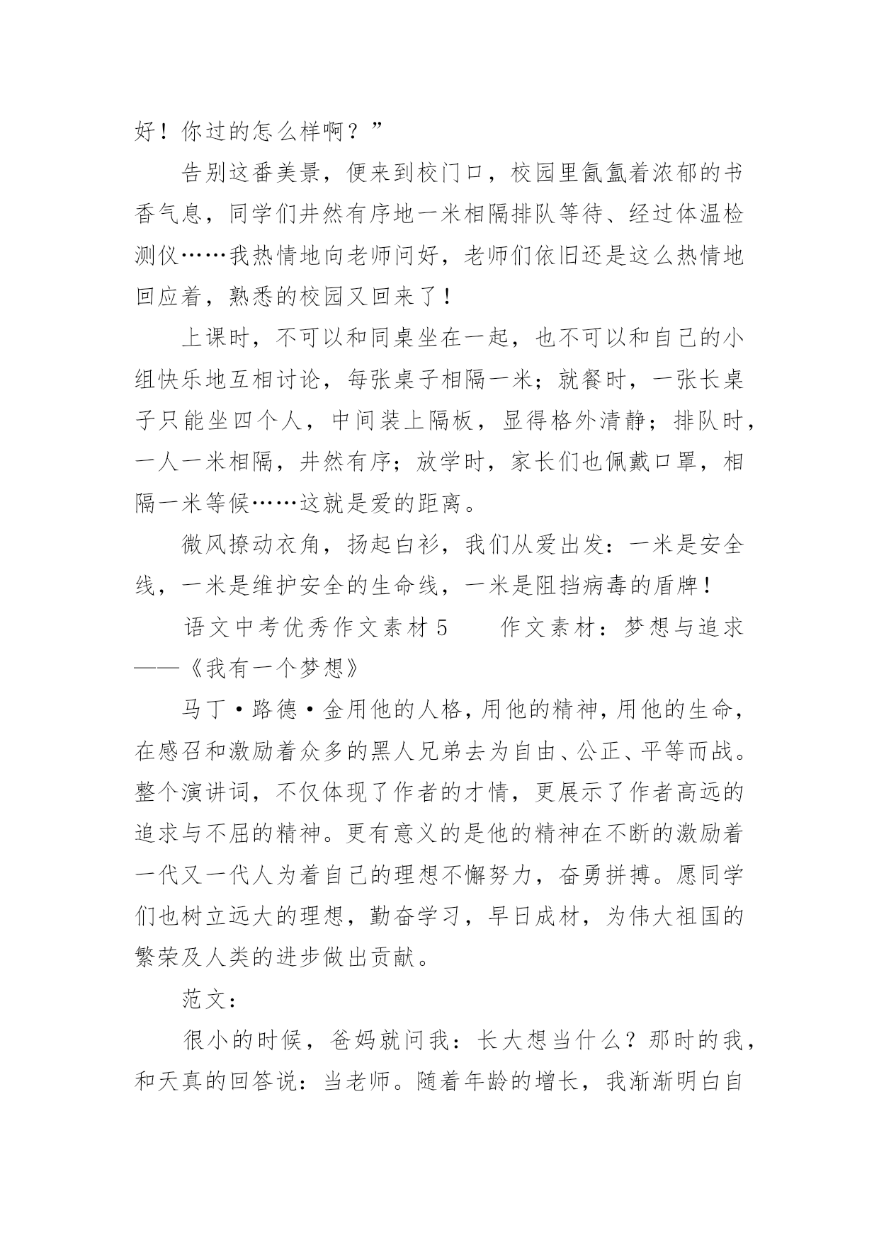 语文中考优秀作文素材2022语文中考优秀作文素材在现实学习生活中,大家最害怕的就是作文了吧?当你积累了一定的作文素材,写作文其实也没那么难。为了帮助大家写作文时更加简单方便,以下是小编帮大家整理的2022语文语文中考优秀作文素材,欢迎大家分享。语文语文中考优秀作文素材1作文素材:请以“酸甜苦辣才是生活”为话题,写一篇作文,不少于600字。范文:初中生活紧张而有节奏,充满活力与精彩,也像一个调味瓶酸甜苦辣样样有。“酸”梅止渴酸的味道让人“口水垂流千尺”。初中生活的酸也颇有一番风味。有一次我们趁老班心情好跟她申请开班会。老班斩钉截铁地说:“这次月考考好了就开,没考好就等着做试题吧!”同学们听了信心十足,“眉飞色舞”地说:“欧克欧克!”可考试成绩一出来,我们都像泄了气的皮球,垂头丧气,老班也铁青着脸。心里都酸溜溜的,一边抄试卷,一边叹气“希望越大,失望越大!”宝贝“甜”蜜酱甜的味道让人心情畅快。期末考试姗姗漫步而来,在考场上,我们拿着疾笔,一次又一次攻破难题。考完,我们如释重负。等着,盼着那令人害怕又令人激动的分数。成绩一出来,老班高兴地告诉我们:“我们班取得了年级组第一!”看着奖状上鲜红耀眼的No。1,我们不禁欢呼雀跃,心里甜滋滋的。“苦”口良药苦的味道也让人难以忘怀。每天午休,同学们“生意都是高峰期”。每上完一节课,作业就接踵而至。叫天天不应,叫地地不灵,只得埋头苦做。可时光小哥还不给你机会做完,又到了午睡时间。都得乖乖睡下,否则就得被老班请到跑道上晒日光浴。咱班不愧为重点班,竟还有人用校服搭“帐篷”躲在里面继续写。只可惜好景不长,被老班的火眼金睛锁定了,无奈只能“束手就擒”。这碗作业汤可真苦啊!够“辣”够火热辣未退的秋季运动会,同学们都踊跃报名。比赛一开始,同学们就龙腾虎跃,各个赛区热火朝天。我参加了200x接力赛,枪声一响,我们像脱缰的小野马,一刻不停地跑着,满脸通红,可算“辣”到家了。还有许多小迷妹为我写广播稿,为我加油,真够火!初中生活,就是这样,精彩每一分钟,酸甜苦辣样样有。语文中考优秀作文素材2作文素材:汪国真在他的诗歌里说:“给我一个微笑就够了/如薄酒一杯,像柔风一缕/这就是一篇最动人的宣言呵/仿佛春天,温馨又飘逸。”请以“给我一个____就够了”为题目,完成不少于600字的作文。要求:①请将题目补充完整;②除诗歌外,文体不限;③不许抄袭套写;④不得泄露个人信息。范文:一点烟展,碾墨品香。其实,给我一个笔触就够了。砚砚墨浓,黑宝石般,反光透出令人清爽的香。都说墨臭,但在我看来它却如柠檬茶,清亮。“看好了!”爷爷五六十岁时与我一同喜欢上了书法,而对这门学问早有了解的他,两堂课时间早已超越我,只留我还在感叹。白衬衫,文质彬彬,从自身散发出文艺老头独有的气质。手握笔,沾饱墨,看着毛笔由白到黑渗透,定为写大字而来。笔碰纸,开始了旅程。闻过古人磨砚坚持故事,当然也少不了爷爷亲自指导。“这个才是好墨!”不知从哪个古玩场弄来几块砚台,就像是宝贝般轻拿轻放,外面还用包装纸一层层裹着,打开时迎来满脸惊喜。爷爷爱笔,爷爷更爱墨。浓淡各异,挥,墨随着笔有力收放自如,宁静筋骨传奇。灰黑色裤子总短一小节,伴着顿笔时力度不同裤管总是上下浮动,频率不断却难有规律。“拿着。”一碗水,我得好好端着,细细看着这磨墨过程。双手紧握墨块,用力均匀地在砚台上做反复动作,看着珍贵的一点墨液,心里不由地自豪满足。“试试!”两字成功地打探起我对磨墨的兴趣,二话不说,说干就干。拿着早已充满温度的墨块与砚台使劲摩擦镜面。“吱!”自带音效的夸张动作换来满脸黑色星点,体会爷爷不容易,而正是这份不容易筑成他的喜爱,我的骄傲!给我一个笔触,谱写墨星般热爱。古代女子琴棋书画样样通,爷爷也希望我成为那样的孩子吧。欧体寓动于静,颜体笔画厚重,书圣潇洒飘逸,回想爷爷的毛笔作品甚至不低于这些我从小耳濡目染的名家,动作行云如水,手臂挥洒,带出来令人羡慕的纤丝,脱缰骏马般。笔触记录痴狂,给我一个笔触就够了……磨墨快活,融墨愉悦,爷爷对毛笔书法热爱,对我,自然爱意涵融于内容。真的,给我一个笔触就够了……语文中考优秀作文素材3作文素材:花苞盛放,源于大地的滋养;飞鸟翩跹,源于天空的辽阔;而幸福,源于关爱;甜蜜,源于成功:思想的深邃,源于生活的磨砺……请以“XX源于”为题,写一篇不少于700字的记叙文。范文:我们每个人都有疼自己爱自己的父母,我也不例外,但我的父母疼我爱我的方式比较特别,可正是他们这种特别的方式,让我这棵年幼的小苗成长得很健康,很优秀。“从哪里跌倒,就要从哪里坚强地爬起来,只有这样,你才能成为你自己的主人。”爸爸是这样说的,也是这样做的。那是一个美好的清晨,阳光悄悄爬上了阳台的栏杆,我和爸爸又出发去滑冰场了。交钱、换鞋、开滑,我感觉一切都是那么美好,突然——“嘭”的一声响,