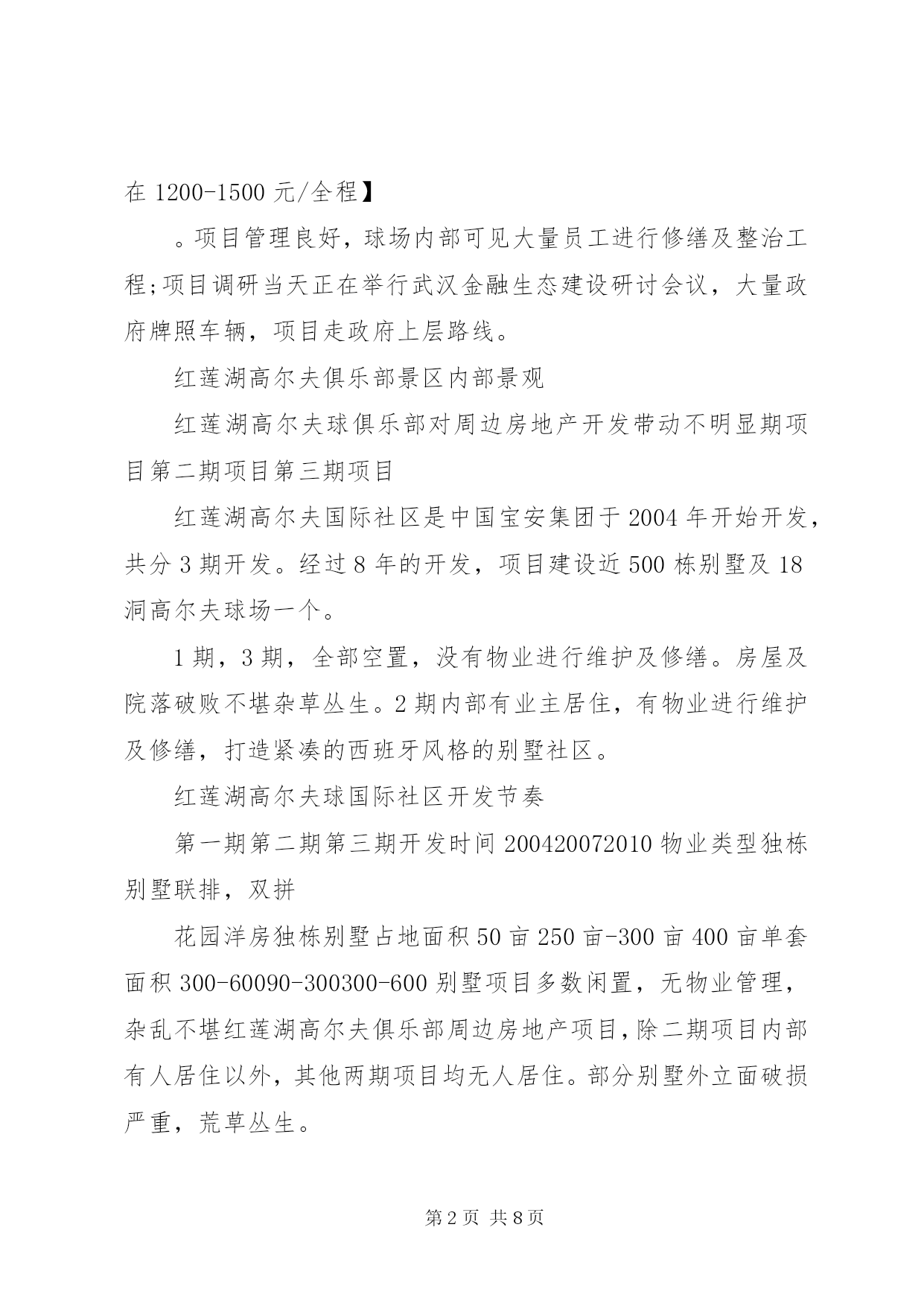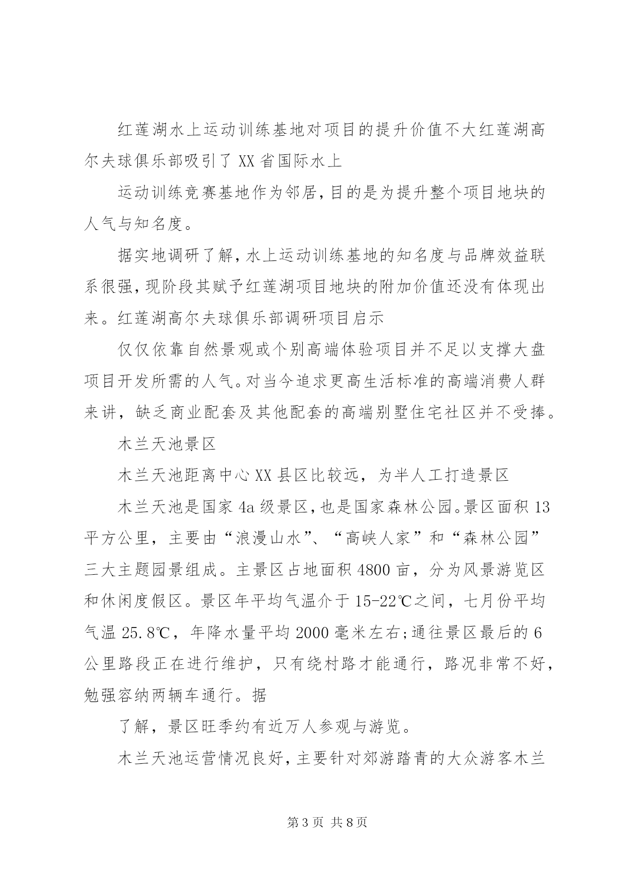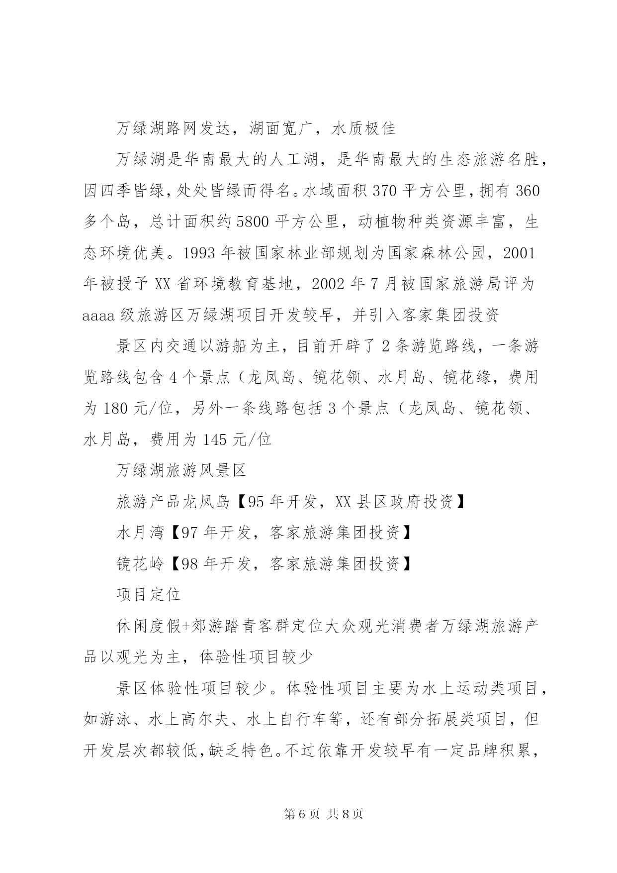 第PAGE\*Arabic\*MERGEFORMAT8页共NUMPAGES\*MERGEFORMAT8页旅游项目调研报告一旅游项目调研报告红莲湖度假村红XX县区位优势明显且有丰富的水产品资源红莲湖度假村位于江夏和鄂州交界处的美丽的红莲湖境内,交通十分便利,红莲湖水质纯净,地下水源丰富,度假区无任何大气污染和噪声,气候温和,是一个一年四季都适合商务会议,旅游度假的好地方;红莲湖在金秋盛产红莲湖大闸蟹,近两年随着螃蟹产业的迅速推广,红莲湖大闸蟹和洪湖大闸蟹一样被更多内行人所熟知。成为个人解馋和馈赠亲友的佳品。红莲湖运营情况一般,主要针对中高端商务休闲人群红莲湖高尔夫国际社区旅游产品高尔夫酒店【1座】45亩会议接待中心【2座】10000平方米高尔夫练习场【1座】60亩18洞高尔夫标准球场【1座】1200亩项目定位运动休闲+商务会议客群定位中高端商务人群项目优势:价格区间较为合理,高尔夫练习场单球5角,可租球具和球鞋【球具150元/套,球鞋50元/套,教练200元/小时,9洞高尔夫总体估算价格在600元/全程,18洞高尔夫总体估算价格在1200-1500元/全程】。项目管理良好,球场内部可见大量员工进行修缮及整治工程;项目调研当天正在举行武汉金融生态建设研讨会议,大量政府牌照车辆,项目走政府上层路线。红莲湖高尔夫俱乐部景区内部景观红莲湖高尔夫球俱乐部对周边房地产开发带动不明显期项目第二期项目第三期项目红莲湖高尔夫国际社区是中国宝安集团于2004年开始开发,共分3期开发。经过8年的开发,项目建设近500栋别墅及18洞高尔夫球场一个。1期,3期,全部空置,没有物业进行维护及修缮。房屋及院落破败不堪杂草丛生。2期内部有业主居住,有物业进行维护及修缮,打造紧凑的西班牙风格的别墅社区。红莲湖高尔夫球国际社区开发节奏第一期第二期第三期开发时间200420072010物业类型独栋别墅联排,双拼花园洋房独栋别墅占地面积50亩250亩-300亩400亩单套面积300-60090-300300-600别墅项目多数闲置,无物业管理,杂乱不堪红莲湖高尔夫俱乐部周边房地产项目,除二期项目内部有人居住以外,其他两期项目均无人居住。部分别墅外立面破损严重,荒草丛生。红莲湖水上运动训练基地对项目的提升价值不大红莲湖高尔夫球俱乐部吸引了XX省国际水上运动训练竞赛基地作为邻居,目的是为提升整个项目地块的人气与知名度。据实地调研了解,水上运动训练基地的知名度与品牌效益联系很强,现阶段其赋予红莲湖项目地块的附加价值还没有体现出来。红莲湖高尔夫球俱乐部调研项目启示仅仅依靠自然景观或个别高端体验项目并不足以支撑大盘项目开发所需的人气。对当今追求更高生活标准的高端消费人群来讲,缺乏商业配套及其他配套的高端别墅住宅社区并不受捧。木兰天池景区木兰天池距离中心XX县区比较远,为半人工打造景区木兰天池是国家4a级景区,也是国家森林公园。景区面积13平方公里,主要由“浪漫山水”、“高峡人家”和“森林公园”三大主题园景组成。主景区占地面积4800亩,分为风景游览区和休闲度假区。景区年平均气温介于15-22℃之间,七月份平均气温25.8℃,年降水量平均2000毫米左右;通往景区最后的6公里路段正在进行维护,只有绕村路才能通行,路况非常不好,勉强容纳两辆车通行。据了解,景区旺季约有近万人参观与游览。木兰天池运营情况良好,主要针对郊游踏青的大众游客木兰天池旅游度假景区旅游产品休闲度假酒店【1座】126间餐饮配套餐厅【1座】1000平方米度假别墅【7座】39间休闲木屋【6座】6间项目定位休闲度假+郊游踏青客群定位大众观光消费者调研当天景区内游客可达到3000人左右,景区整体运营情况良好;相关配套:山顶有二十余家农家乐在经营,生意红火。山下有40家兼具餐饮和住宿的农家乐,生意却萧条。景区内住宿房间共171间。其他旅游项目项目收费标准间数备注棋牌室48元/小时15间赠送茶水网球场白天38元,晚上60元1个赠送矿泉水1瓶舞厅包场1800大包888小包6883间----------------木兰天池景区优劣势分析项目优势:整个景区依山而建,从项目启动到项目完成仅仅耗时90天【据当地居民介绍】。完全依靠自然景观资源,只对个别景观进行人工修饰。外来引进植被使用面积较小,只对部分人造景观和观景面较差的区域进行移栽,充分做到了低成本运作。整体项目观景路线设计比较合理,根据游客的心理变化情况设计了诸多消费点。项目劣势。体验设施比较单调和简单,没有大型的体验互动项目,完全依靠自然景观取胜。景区内交通极不方便,只能爬山到达天池景观【耗时近2个小时】。木兰湖景区木兰湖距离武汉中心XX县区较远,有文化历史传承木兰湖位于武汉XX县区塔耳岗乡,距木兰山风景区东部6公里,因传说木兰将军幼时在此饮马而得名