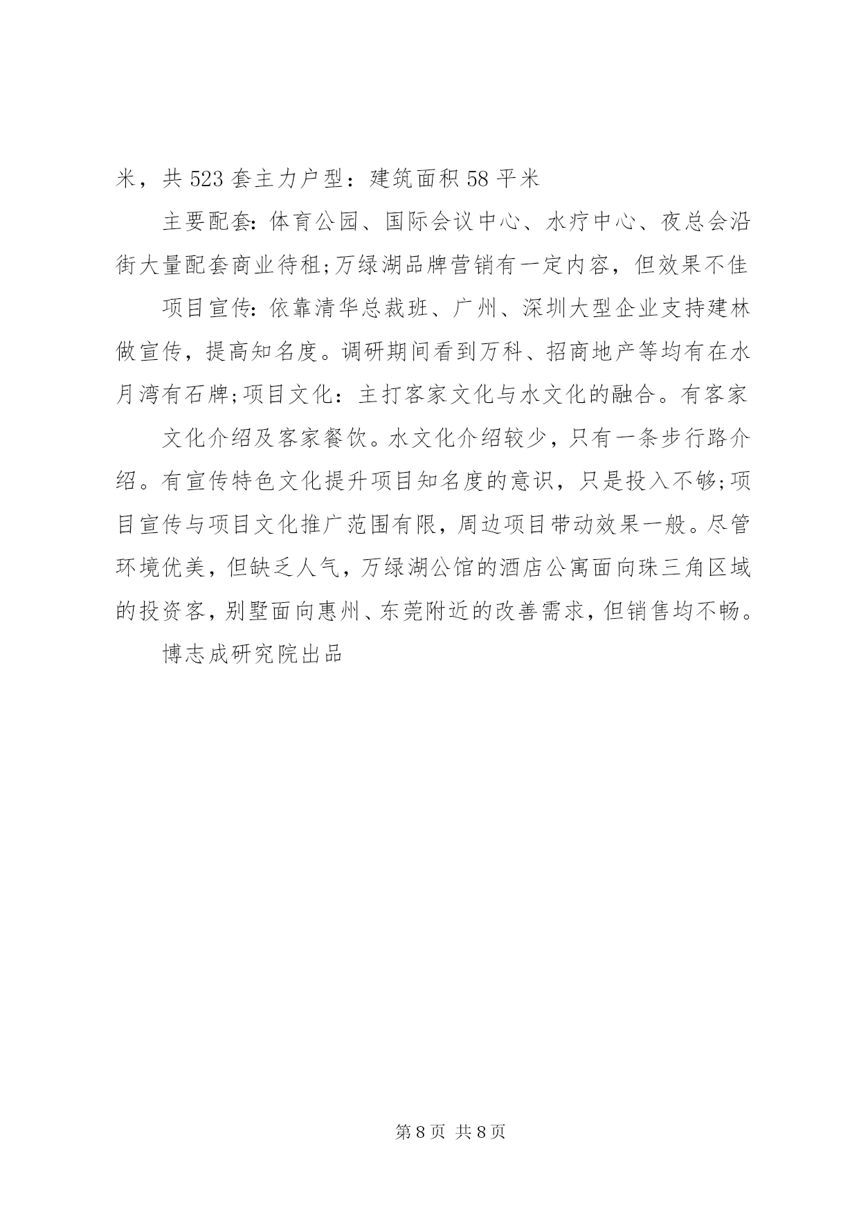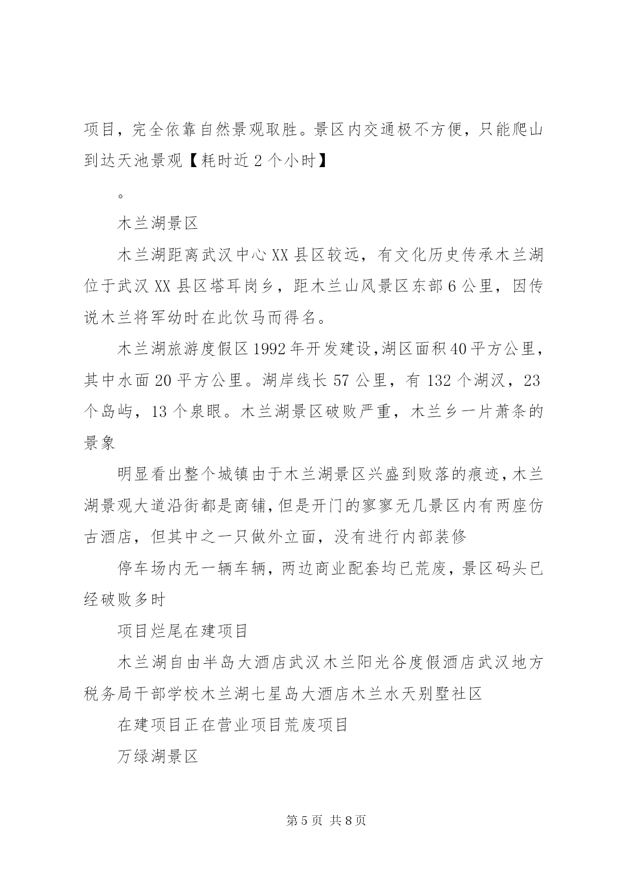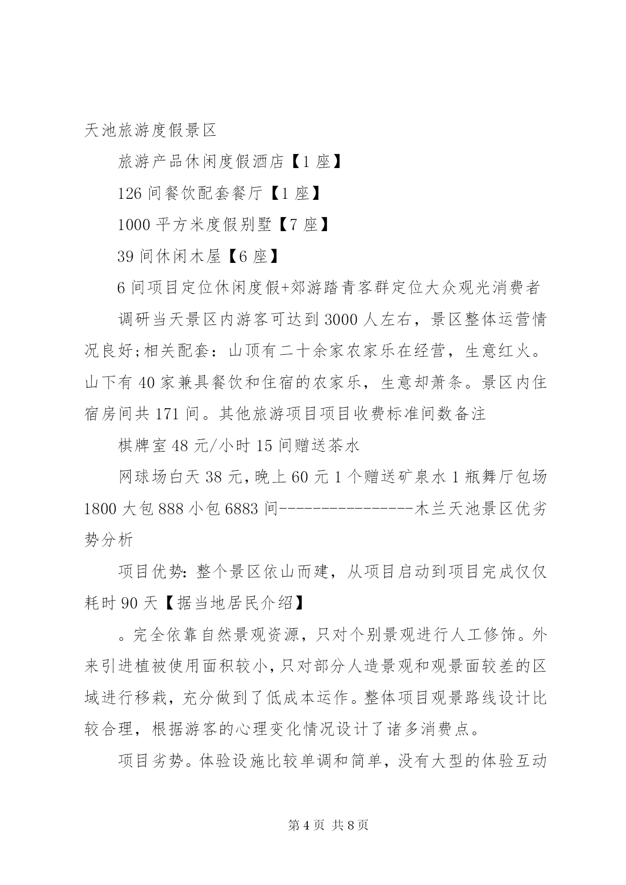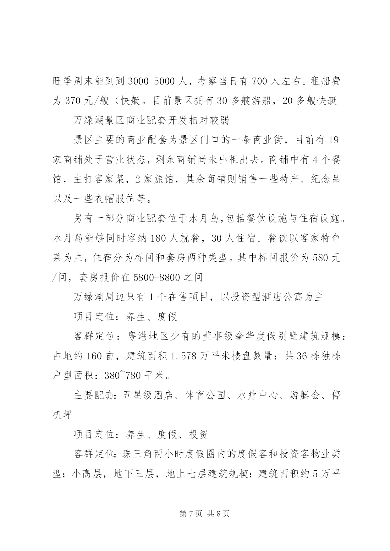 第PAGE\*Arabic\*MERGEFORMAT8页共NUMPAGES\*MERGEFORMAT8页旅游项目调研报告一旅游项目调研报告红莲湖度假村红XX县区位优势明显且有丰富的水产品资源红莲湖度假村位于江夏和鄂州交界处的美丽的红莲湖境内,交通十分便利,红莲湖水质纯净,地下水源丰富,度假区无任何大气污染和噪声,气候温和,是一个一年四季都适合商务会议,旅游度假的好地方;红莲湖在金秋盛产红莲湖大闸蟹,近两年随着螃蟹产业的迅速推广,红莲湖大闸蟹和洪湖大闸蟹一样被更多内行人所熟知。成为个人解馋和馈赠亲友的佳品。红莲湖运营情况一般,主要针对中高端商务休闲人群红莲湖高尔夫国际社区旅游产品高尔夫酒店【1座】45亩会议接待中心【2座】10000平方米高尔夫练习场【1座】60亩18洞高尔夫标准球场【1座】1200亩项目定位运动休闲+商务会议客群定位中高端商务人群项目优势:价格区间较为合理,高尔夫练习场单球5角,可租球具和球鞋【球具150元/套,球鞋50元/套,教练200元/小时,9洞高尔夫总体估算价格在600元/全程,18洞高尔夫总体估算价格在1200-1500元/全程】。项目管理良好,球场内部可见大量员工进行修缮及整治工程;项目调研当天正在举行武汉金融生态建设研讨会议,大量政府牌照车辆,项目走政府上层路线。红莲湖高尔夫俱乐部景区内部景观红莲湖高尔夫球俱乐部对周边房地产开发带动不明显期项目第二期项目第三期项目红莲湖高尔夫国际社区是中国宝安集团于2004年开始开发,共分3期开发。经过8年的开发,项目建设近500栋别墅及18洞高尔夫球场一个。1期,3期,全部空置,没有物业进行维护及修缮。房屋及院落破败不堪杂草丛生。2期内部有业主居住,有物业进行维护及修缮,打造紧凑的西班牙风格的别墅社区。红莲湖高尔夫球国际社区开发节奏第一期第二期第三期开发时间200420072010物业类型独栋别墅联排,双拼花园洋房独栋别墅占地面积50亩250亩-300亩400亩单套面积300-60090-300300-600别墅项目多数闲置,无物业管理,杂乱不堪红莲湖高尔夫俱乐部周边房地产项目,除二期项目内部有人居住以外,其他两期项目均无人居住。部分别墅外立面破损严重,荒草丛生。红莲湖水上运动训练基地对项目的提升价值不大红莲湖高尔夫球俱乐部吸引了XX省国际水上运动训练竞赛基地作为邻居,目的是为提升整个项目地块的人气与知名度。据实地调研了解,水上运动训练基地的知名度与品牌效益联系很强,现阶段其赋予红莲湖项目地块的附加价值还没有体现出来。红莲湖高尔夫球俱乐部调研项目启示仅仅依靠自然景观或个别高端体验项目并不足以支撑大盘项目开发所需的人气。对当今追求更高生活标准的高端消费人群来讲,缺乏商业配套及其他配套的高端别墅住宅社区并不受捧。木兰天池景区木兰天池距离中心XX县区比较远,为半人工打造景区木兰天池是国家4a级景区,也是国家森林公园。景区面积13平方公里,主要由“浪漫山水”、“高峡人家”和“森林公园”三大主题园景组成。主景区占地面积4800亩,分为风景游览区和休闲度假区。景区年平均气温介于15-22℃之间,七月份平均气温25.8℃,年降水量平均2000毫米左右;通往景区最后的6公里路段正在进行维护,只有绕村路才能通行,路况非常不好,勉强容纳两辆车通行。据了解,景区旺季约有近万人参观与游览。木兰天池运营情况良好,主要针对郊游踏青的大众游客木兰天池旅游度假景区旅游产品休闲度假酒店【1座】126间餐饮配套餐厅【1座】1000平方米度假别墅【7座】39间休闲木屋【6座】6间项目定位休闲度假+郊游踏青客群定位大众观光消费者调研当天景区内游客可达到3000人左右,景区整体运营情况良好;相关配套:山顶有二十余家农家乐在经营,生意红火。山下有40家兼具餐饮和住宿的农家乐,生意却萧条。景区内住宿房间共171间。其他旅游项目项目收费标准间数备注棋牌室48元/小时15间赠送茶水网球场白天38元,晚上60元1个赠送矿泉水1瓶舞厅包场1800大包888小包6883间----------------木兰天池景区优劣势分析项目优势:整个景区依山而建,从项目启动到项目完成仅仅耗时90天【据当地居民介绍】。完全依靠自然景观资源,只对个别景观进行人工修饰。外来引进植被使用面积较小,只对部分人造景观和观景面较差的区域进行移栽,充分做到了低成本运作。整体项目观景路线设计比较合理,根据游客的心理变化情况设计了诸多消费点。项目劣势。体验设施比较单调和简单,没有大型的体验互动项目,完全依靠自然景观取胜。景区内交通极不方便,只能爬山到达天池景观【耗时近2个小时】。木兰湖景区木兰湖距离武汉中心XX县区较远,有文化历史传承木兰湖位于武汉XX县区塔耳岗乡,距木兰山风景区东部6公里,因传说木兰将军幼时在此饮马而得名