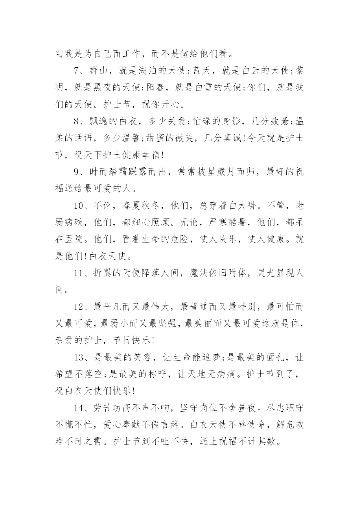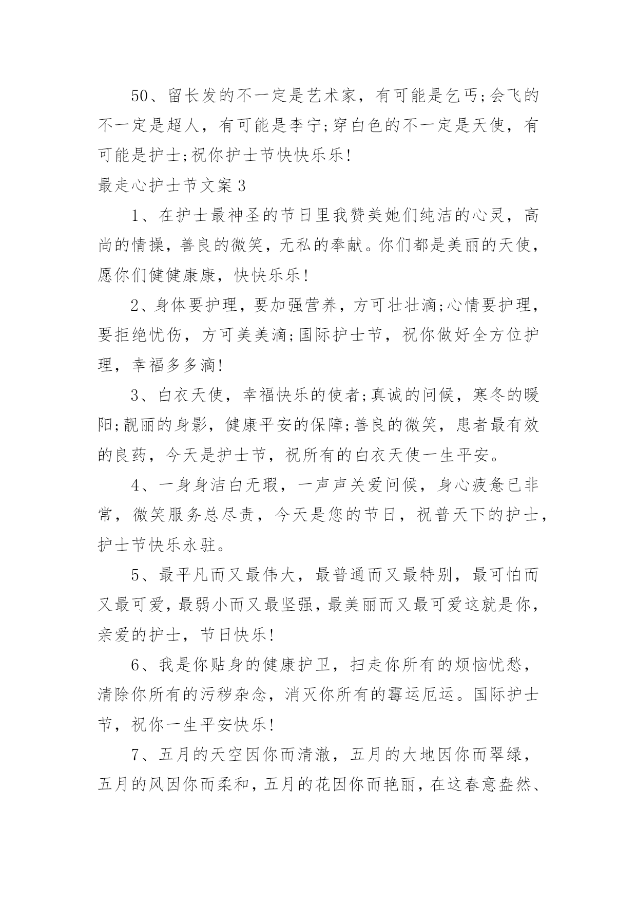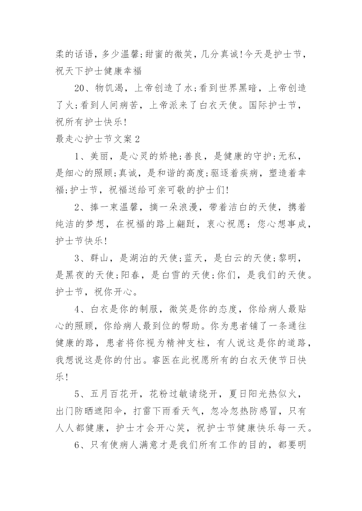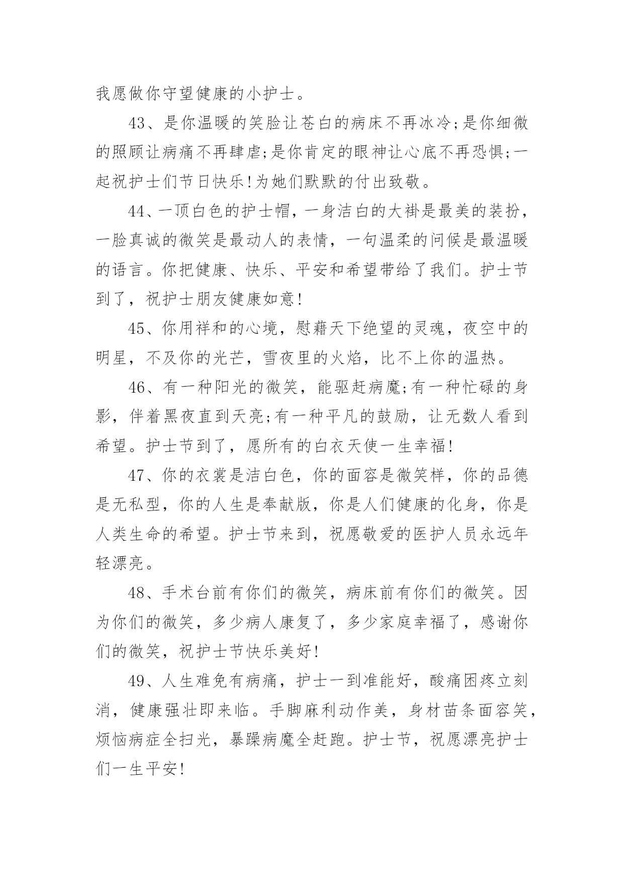 最走心护士节文案随着线上的、虚拟的社交的迅猛发展,许多人对一些广为流传的文案都不陌生吧,文案用以展现自己对生活的热爱。你还在找寻优秀经典的文案吗?下面是小编整理的最走心护士节文案,欢迎阅读,希望大家能够喜欢。最走心护士节文案11、你们,像一滴晶莹的雨露,像一朵洁白的雪花,悄然飘落在人间;你们像蜡烛,燃烧自己照亮别人。2、护士工作平凡而又伟大,琐碎而又不易,艰辛而又劳苦;我赞美护士能用柔弱的肩膀挑起一份女儿、母亲、妻子的重担;我赞美护士如春天的雨露滋润患者久旱的心田;如夏天的微风吹走燥热的空气带走患者心灵的创痛;如秋夜的明月照亮患者通往健康的心灵彼岸;如冬天的阳光温暖着患者蒸发她们的忧伤。3、护士有着无私的爱,面对多重性格的患者,她们奉献的是海一样博大的情怀;面对刁难者纵使自己受了天大的委屈她们对病人讲得也是医德和表率;众人面前一笑而过,有谁知?一个人的时候她们却在暗洒的泪涛中苦苦地徘徊;饮下苦酒之后留给自己的是一份体验的悲哀。4、无私的天使,你用博爱的手腕,抚摩着每一个受伤的孩子;你用冰寒的内心,温暖着每一颗惧怕的心灵;一双双忧伤的眼睛,在你的恬淡中变得安详平静;一张张恐慌的面孔,在你的仁爱中变得坚强无惧。5、她们奉献的是一丝温情,一份关爱,一滴汗水,一份真情;她们奉献的是最最宝贵的青春,换来的是千家万户的幸福和健康拥有者的安祥;南丁格尔精神永不灭。我赞美护士,歌颂护士,国际护士节永远是她们幸福的天堂。6、你用祥和的心境,慰藉天下绝望的灵魂,夜空中的明星,不及你的光芒,雪夜里的火焰,比不上你的温热。7、一颗诚挚的爱心,挽回了多少苦难孩童的生命,或许,我是一个喜欢穿着白色衣衫的天使,喜欢在岁月的长河里,凝望彼岸你柔和的倩影,当明亮的月光把我寒冷的心扉融化的时候,思念的船只,在回忆中又再把我引向你的身旁。8、你们是一棵棵无名的小草,是多么的渺小,但你们从没有放弃自己执着的追求,你们也有崇高的信念,也有不移的`人生坐标,那就是,奉献我的一切,为了他人生活得更幸福更美好。9、输液瓶里滴着你的希望,体温表里刻着你们的叮咛,你们是生命的守护神,你们用智慧和真诚托起生命的阳光,你们无私,献生命,扶伤痛,含辛茹苦。10、多少个白昼,你们战斗在救死扶伤的第一线;多少个夜晚,你们与死神和病魔抗争,治疗时是医生的臂膀,巡视时是患者的亲戚,监护时是健康的使者,抢救时是生命的卫士,精湛技艺让死神战栗,微笑服务献出真情爱意,救死扶伤燃起生命之火,保健预防使千家万户康益。11、洁白,是你的衣裳;微笑,是你的形像;无私,是你的奉献。白衣天使,你是健康的化身,你是生命的希望。护士节至,祝你吉祥。12、身体要护理,要加强营养,方可壮壮滴;心情要护理,要拒绝忧伤,方可美美滴;国际护士节,祝你做好全方位护理,幸福多多滴!13、我是你贴身的健康护卫,扫走你所有的烦恼忧愁,清除你所有的污秽杂念,消灭你所有的霉运厄运。国际护士节,祝你一生平安快乐!14、那灿烂的微笑,让病痛雾散云消,那细心的呵护,让病魔藏身无处,那圣洁的白衣,让健康常伴一起,护士节,我们一起祝福白衣天使。15、护士一到来,健康就来临。七上又八下,三下五除二。烦恼全扫光,病魔全赶跑。快乐从天降,幸福从东来。护士节祝好心人一生平安!16、歇一歇,调理疲惫的身心;休一休,护理健康的身形;静一静,梳理纷繁的思绪;乐一乐,整理忧愁的心情。国际护士节,祝你快乐!17、涂抹愉悦的滋味,包扎忧愁的伤痕;输入快乐的源泉,拔去烦恼的银针;按摸幸福的脉搏,测量开心的体温。国际护士节,祝你快乐永恒18、你像甘甜的清泉,滋润荒芜的沙漠,让病魔远离;你像灿烂的阳光,温暖冰凉的心灵,让伤痛消逝。美丽的白衣天使,愿你护士节快乐!19、飘逸的白衣,多少关爱;忙碌的身影,几分疲惫;温柔的话语,多少温馨;甜蜜的微笑,几分真诚!今天是护士节,祝天下护士健康幸福20、物饥渴,上帝创造了水;看到世界黑暗,上帝创造了火;看到人间病苦,上帝派来了白衣天使。国际护士节,祝所有护士快乐!最走心护士节文案21、美丽,是心灵的娇艳;善良,是健康的守护;无私,是细心的照顾;真诚,是和谐的高度;驱逐着疾病,塑造着幸福;护士节,祝福送给可亲可敬的护士们!2、捧一束温馨,摘一朵浪漫,带着洁白的天使,携着纯洁的梦想,在祝福的路上翩跹,衷心祝愿:您心想事成,护士节快乐!3、群山,是湖泊的天使;蓝天,是白云的天使;黎明,是黑夜的天使;阳春,是白雪的天使;你们,是我们的天使。护士节,祝你开心。4、白衣是你的制服,微笑是你的态度,你给病人最贴心的照顾,你给病人最到位的帮助。你为患者铺了一条通往健康的路,患者将你视为精神支柱,有人说这是你的道路,我想说这是你的付出。睿医在此祝愿所有的白衣天使节日快乐!5、五月百花开,花粉过敏请绕开,夏日阳光热似火,出门防晒遮阳伞,打雷下雨看天