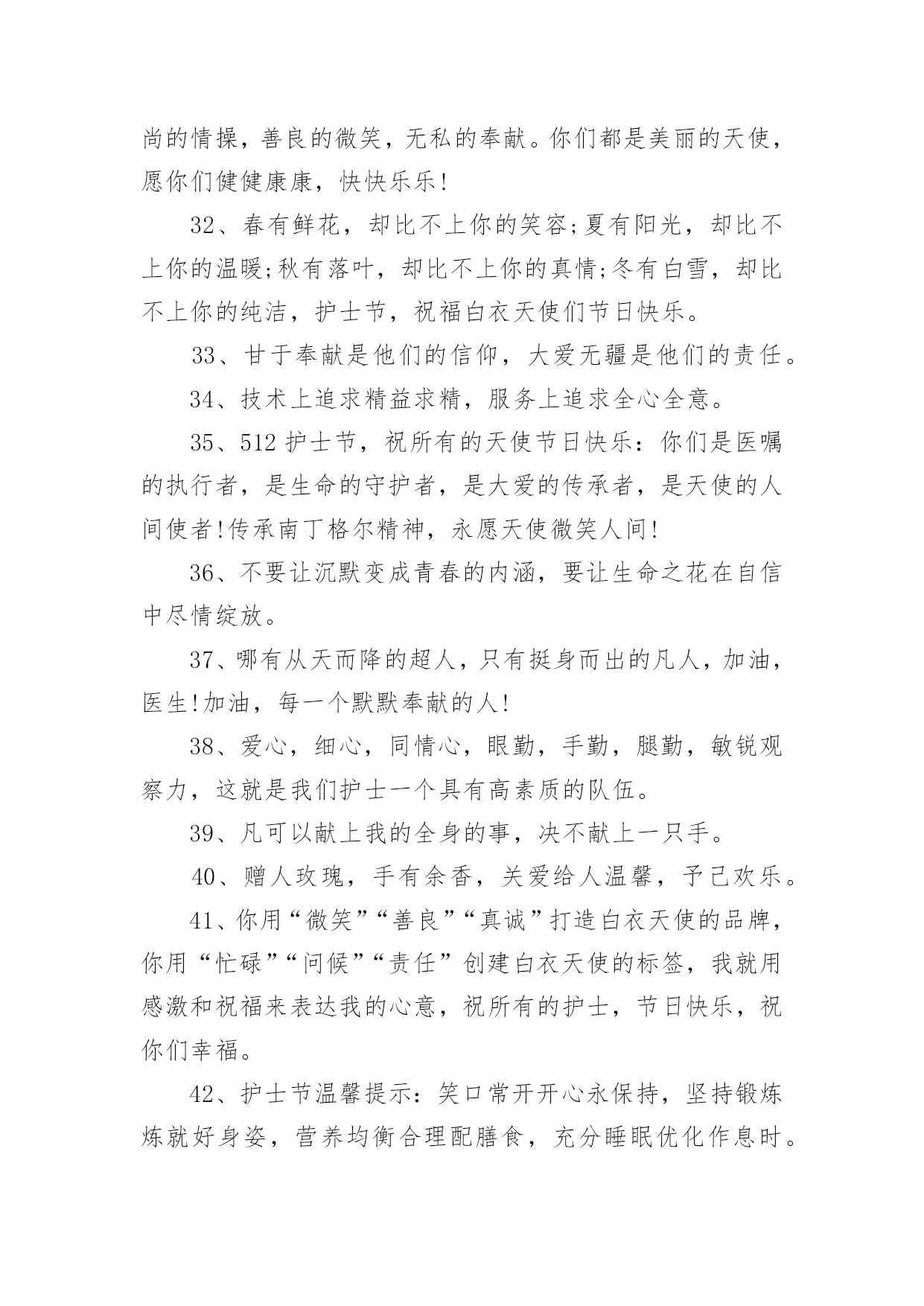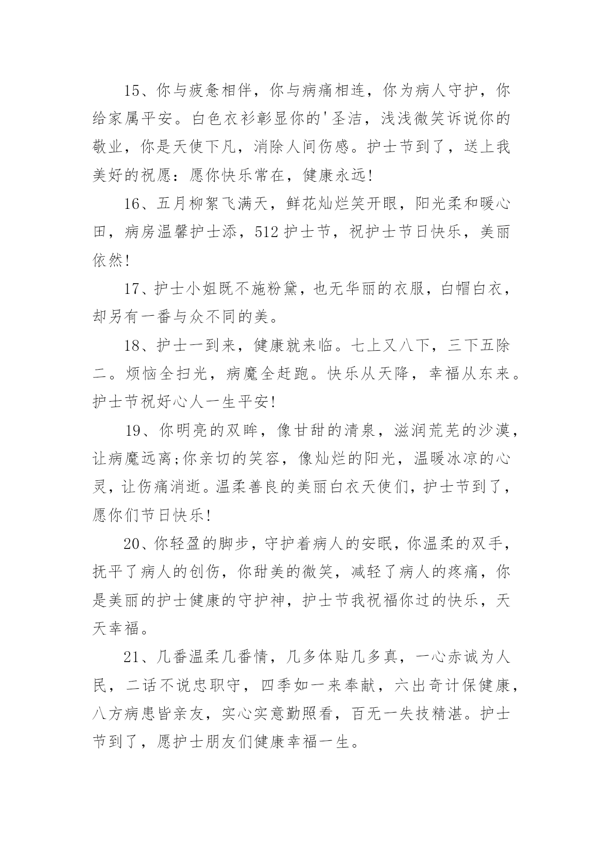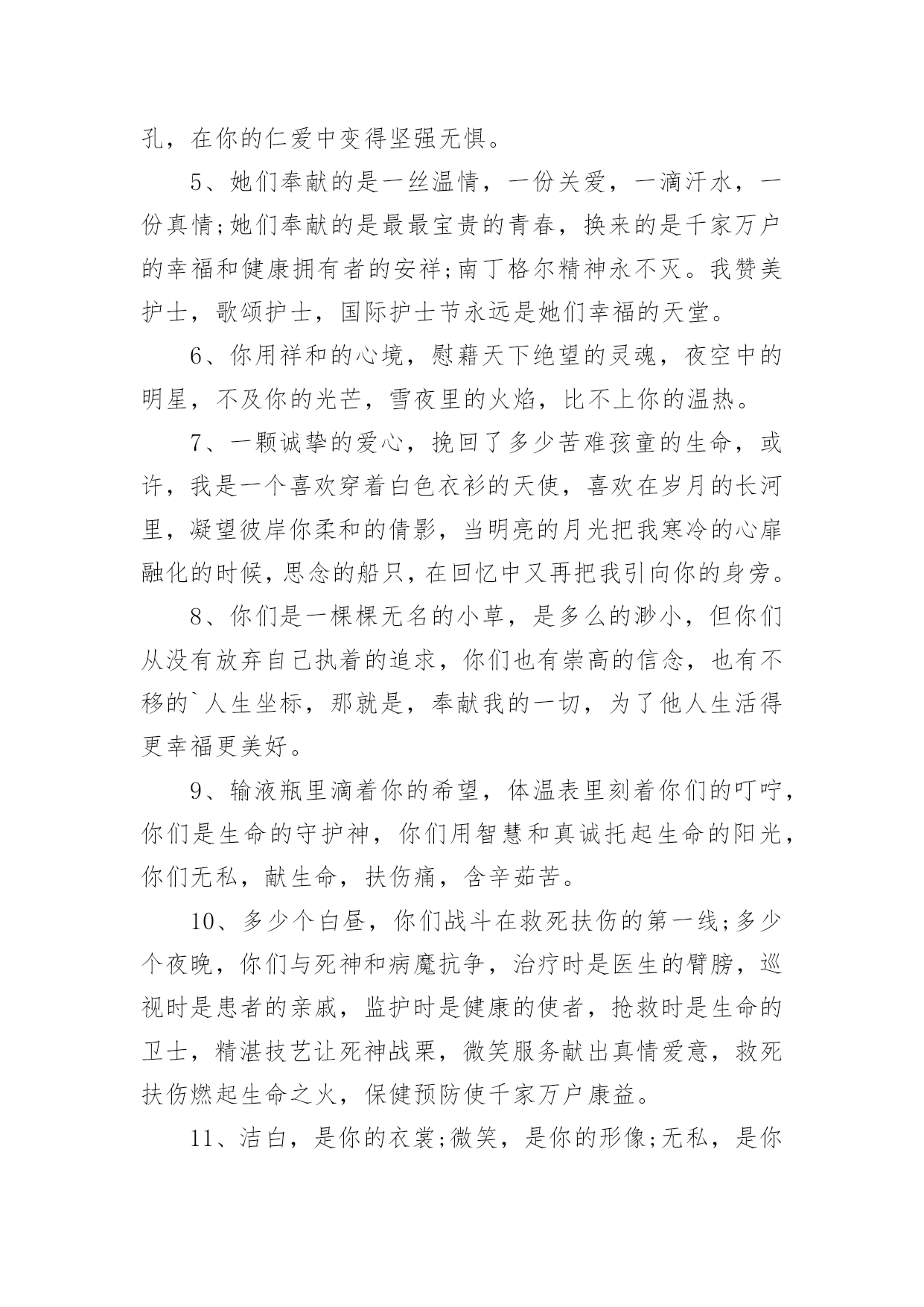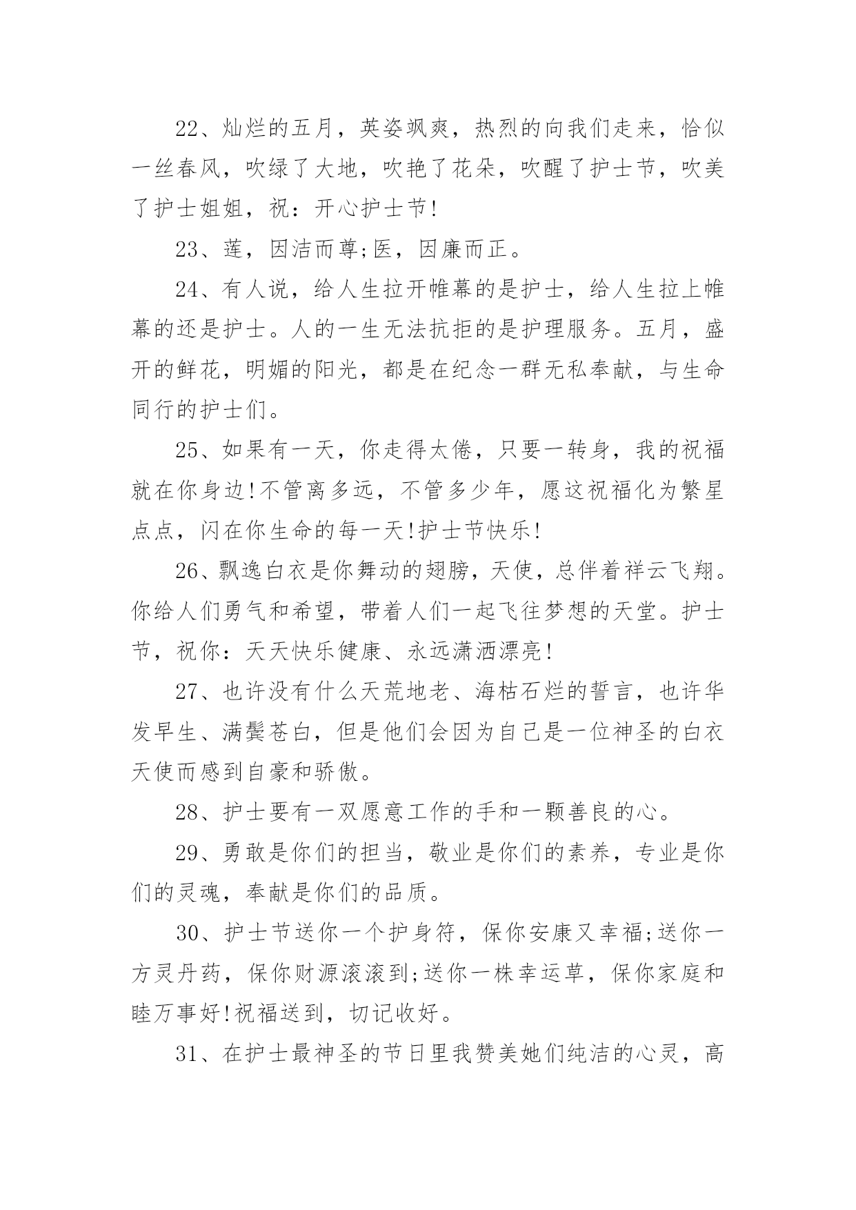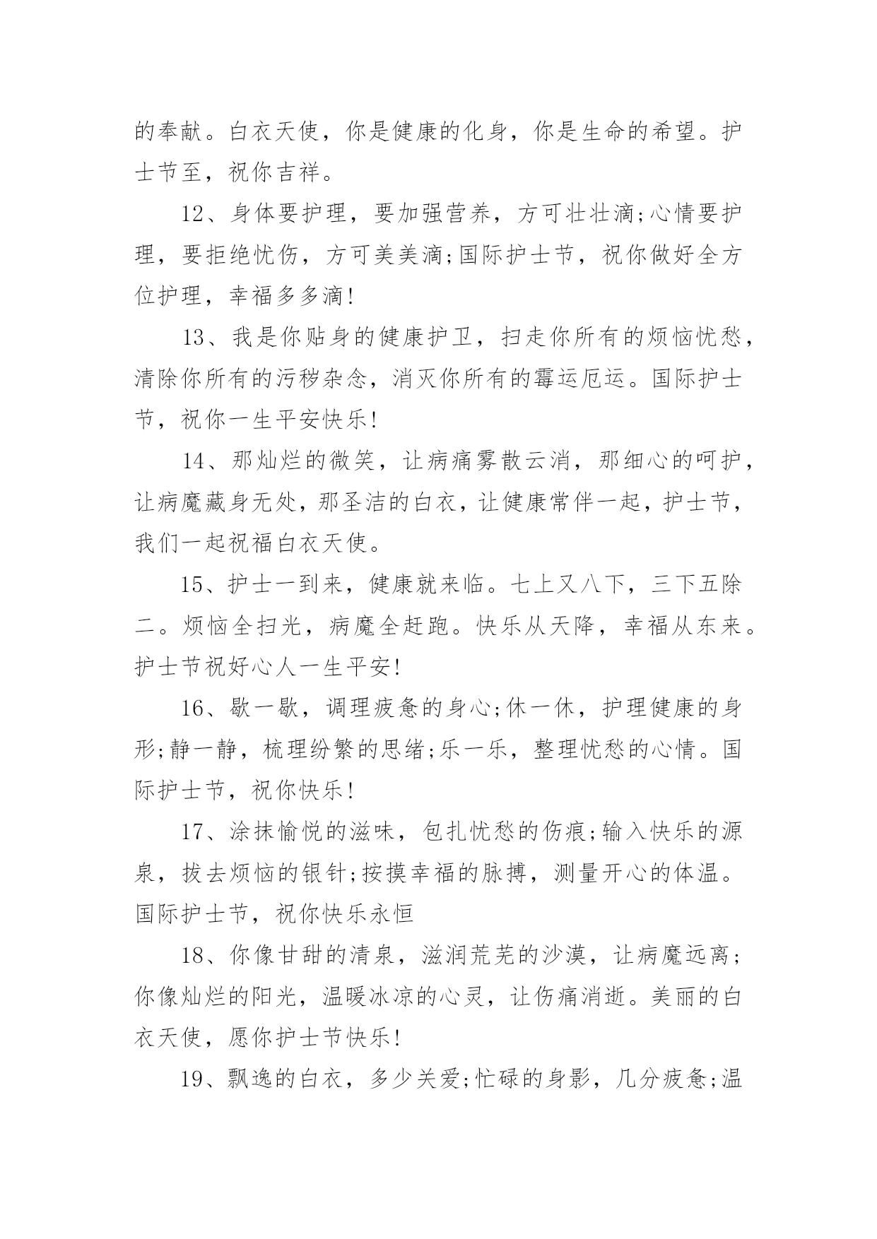 最走心护士节文案随着线上的、虚拟的社交的迅猛发展,许多人对一些广为流传的文案都不陌生吧,文案用以展现自己对生活的热爱。你还在找寻优秀经典的文案吗?下面是小编整理的最走心护士节文案,欢迎阅读,希望大家能够喜欢。最走心护士节文案11、你们,像一滴晶莹的雨露,像一朵洁白的雪花,悄然飘落在人间;你们像蜡烛,燃烧自己照亮别人。2、护士工作平凡而又伟大,琐碎而又不易,艰辛而又劳苦;我赞美护士能用柔弱的肩膀挑起一份女儿、母亲、妻子的重担;我赞美护士如春天的雨露滋润患者久旱的心田;如夏天的微风吹走燥热的空气带走患者心灵的创痛;如秋夜的明月照亮患者通往健康的心灵彼岸;如冬天的阳光温暖着患者蒸发她们的忧伤。3、护士有着无私的爱,面对多重性格的患者,她们奉献的是海一样博大的情怀;面对刁难者纵使自己受了天大的委屈她们对病人讲得也是医德和表率;众人面前一笑而过,有谁知?一个人的时候她们却在暗洒的泪涛中苦苦地徘徊;饮下苦酒之后留给自己的是一份体验的悲哀。4、无私的天使,你用博爱的手腕,抚摩着每一个受伤的孩子;你用冰寒的内心,温暖着每一颗惧怕的心灵;一双双忧伤的眼睛,在你的恬淡中变得安详平静;一张张恐慌的面孔,在你的仁爱中变得坚强无惧。5、她们奉献的是一丝温情,一份关爱,一滴汗水,一份真情;她们奉献的是最最宝贵的青春,换来的是千家万户的幸福和健康拥有者的安祥;南丁格尔精神永不灭。我赞美护士,歌颂护士,国际护士节永远是她们幸福的天堂。6、你用祥和的心境,慰藉天下绝望的灵魂,夜空中的明星,不及你的光芒,雪夜里的火焰,比不上你的温热。7、一颗诚挚的爱心,挽回了多少苦难孩童的生命,或许,我是一个喜欢穿着白色衣衫的天使,喜欢在岁月的长河里,凝望彼岸你柔和的倩影,当明亮的月光把我寒冷的心扉融化的时候,思念的船只,在回忆中又再把我引向你的身旁。8、你们是一棵棵无名的小草,是多么的渺小,但你们从没有放弃自己执着的追求,你们也有崇高的信念,也有不移的`人生坐标,那就是,奉献我的一切,为了他人生活得更幸福更美好。9、输液瓶里滴着你的希望,体温表里刻着你们的叮咛,你们是生命的守护神,你们用智慧和真诚托起生命的阳光,你们无私,献生命,扶伤痛,含辛茹苦。10、多少个白昼,你们战斗在救死扶伤的第一线;多少个夜晚,你们与死神和病魔抗争,治疗时是医生的臂膀,巡视时是患者的亲戚,监护时是健康的使者,抢救时是生命的卫士,精湛技艺让死神战栗,微笑服务献出真情爱意,救死扶伤燃起生命之火,保健预防使千家万户康益。11、洁白,是你的衣裳;微笑,是你的形像;无私,是你的奉献。白衣天使,你是健康的化身,你是生命的希望。护士节至,祝你吉祥。12、身体要护理,要加强营养,方可壮壮滴;心情要护理,要拒绝忧伤,方可美美滴;国际护士节,祝你做好全方位护理,幸福多多滴!13、我是你贴身的健康护卫,扫走你所有的烦恼忧愁,清除你所有的污秽杂念,消灭你所有的霉运厄运。国际护士节,祝你一生平安快乐!14、那灿烂的微笑,让病痛雾散云消,那细心的呵护,让病魔藏身无处,那圣洁的白衣,让健康常伴一起,护士节,我们一起祝福白衣天使。15、护士一到来,健康就来临。七上又八下,三下五除二。烦恼全扫光,病魔全赶跑。快乐从天降,幸福从东来。护士节祝好心人一生平安!16、歇一歇,调理疲惫的身心;休一休,护理健康的身形;静一静,梳理纷繁的思绪;乐一乐,整理忧愁的心情。国际护士节,祝你快乐!17、涂抹愉悦的滋味,包扎忧愁的伤痕;输入快乐的源泉,拔去烦恼的银针;按摸幸福的脉搏,测量开心的体温。国际护士节,祝你快乐永恒18、你像甘甜的清泉,滋润荒芜的沙漠,让病魔远离;你像灿烂的阳光,温暖冰凉的心灵,让伤痛消逝。美丽的白衣天使,愿你护士节快乐!19、飘逸的白衣,多少关爱;忙碌的身影,几分疲惫;温柔的话语,多少温馨;甜蜜的微笑,几分真诚!今天是护士节,祝天下护士健康幸福20、物饥渴,上帝创造了水;看到世界黑暗,上帝创造了火;看到人间病苦,上帝派来了白衣天使。国际护士节,祝所有护士快乐!最走心护士节文案21、美丽,是心灵的娇艳;善良,是健康的守护;无私,是细心的照顾;真诚,是和谐的高度;驱逐着疾病,塑造着幸福;护士节,祝福送给可亲可敬的护士们!2、捧一束温馨,摘一朵浪漫,带着洁白的天使,携着纯洁的梦想,在祝福的路上翩跹,衷心祝愿:您心想事成,护士节快乐!3、群山,是湖泊的天使;蓝天,是白云的天使;黎明,是黑夜的天使;阳春,是白雪的天使;你们,是我们的天使。护士节,祝你开心。4、白衣是你的制服,微笑是你的态度,你给病人最贴心的照顾,你给病人最到位的帮助。你为患者铺了一条通往健康的路,患者将你视为精神支柱,有人说这是你的道路,我想说这是你的付出。睿医在此祝愿所有的白衣天使节日快乐!5、五月百花开,花粉过敏请绕开,夏日阳光热似火,出门防晒遮阳伞,打雷下雨看天