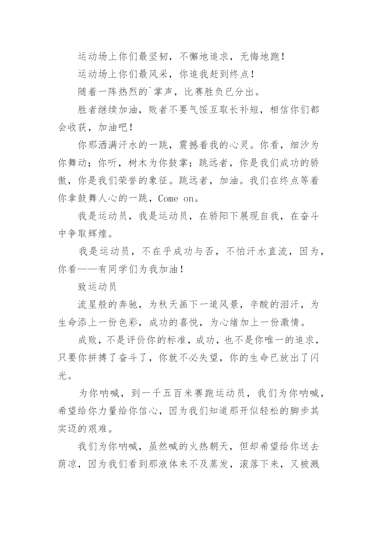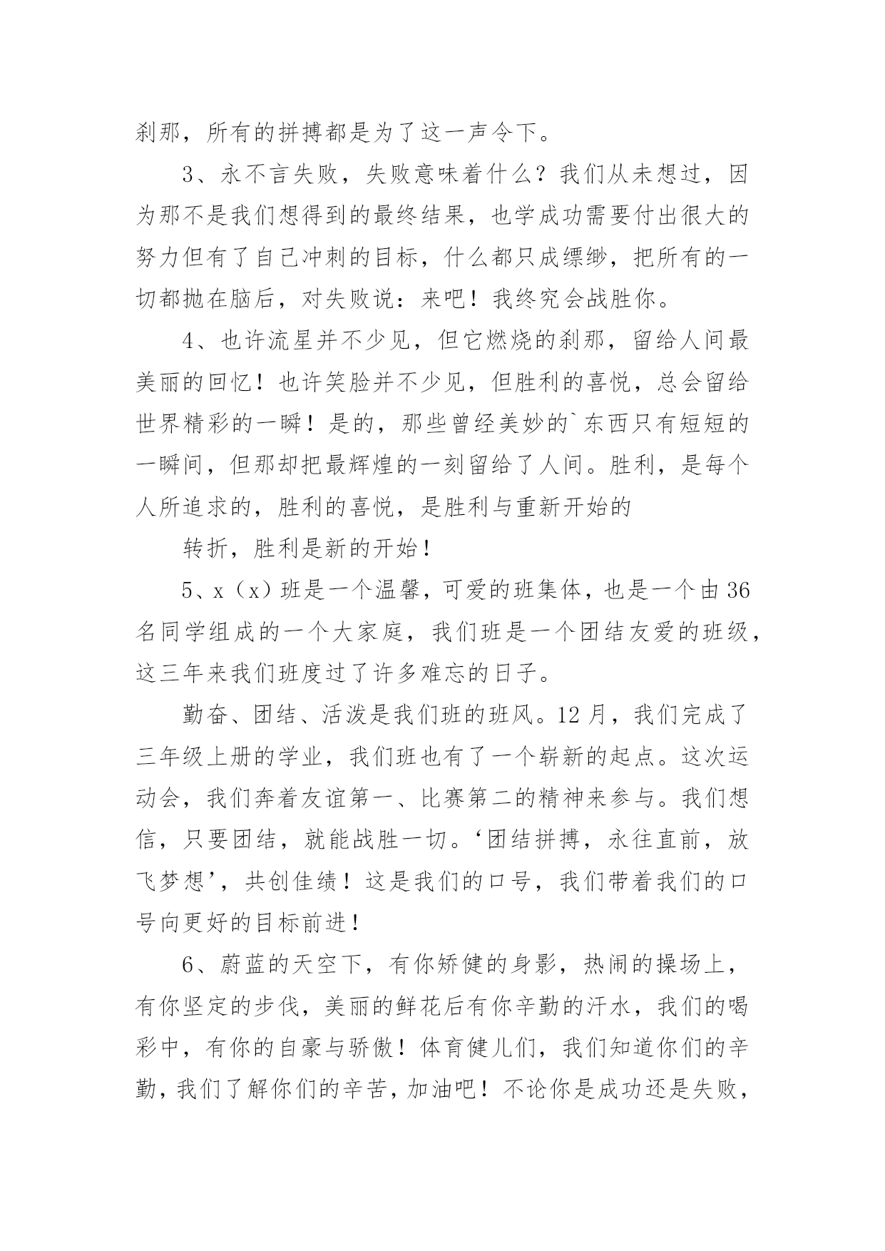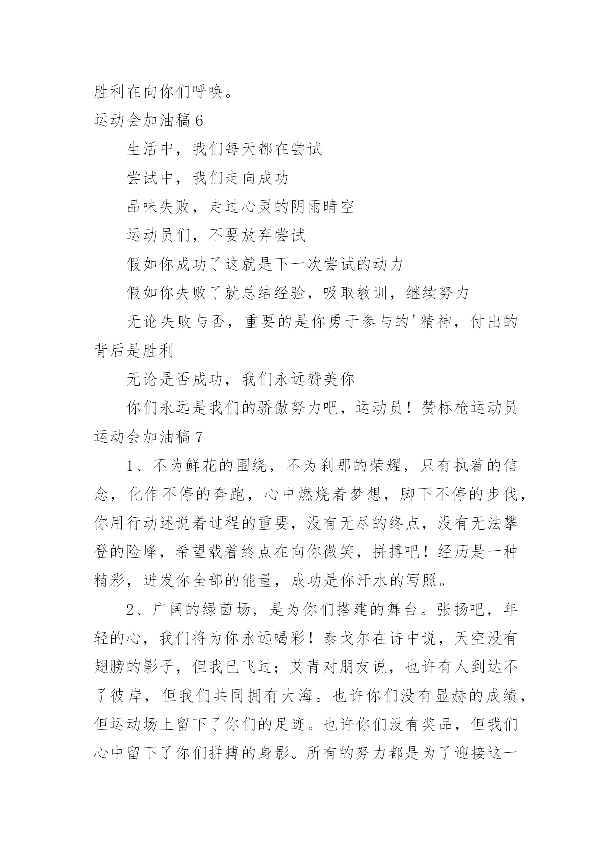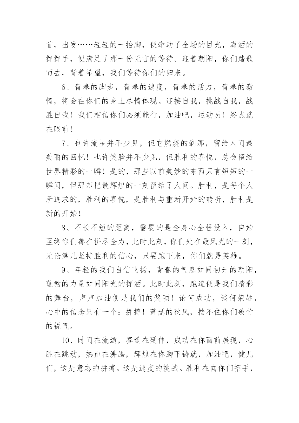 运动会加油稿运动会加油稿(汇编15篇)在当下社会,接触并使用加油稿的人越来越多,加油稿可以起到鼓励场上的人、增添其信心的作用。写起加油稿来就毫无头绪?下面是小编精心整理的运动会加油稿,欢迎阅读与收藏。运动会加油稿1美丽的花环是用荆棘编成的。不畏艰难,坚持不懈,斗志激昂、群策群力,但我们始终坚信“友谊第一,比赛第二”。我们会积极拼搏,赛出成绩,赛出风格,用蓬勃向上的精神面貌迎接崭新的未来!挑战运动极限,演绎健康风采!互相学习,取长补短,再接再厉,勇攀高峰!致1500米运动员你是否感到,烈日的照射,那是烈日对你的祝福!你是否感到,彩旗的摇摆,那是彩旗对你的呐喊!人们的注视,那是人们对你的希望!祝福在你身边,呐喊在你耳边希望在你心中!致长跑运动员在那一瞬间,你们像离了弦的箭!似流星,如闪电。运动场上你们最坚韧,不懈地追求,无悔地跑!运动场上你们最风采,你追我赶到终点!随着一阵热烈的`掌声,比赛胜负已分出。胜者继续加油,败者不要气馁互取长补短,相信你们都会收获,加油吧!你那洒满汗水的一跳,震撼着我的心灵。你看,细沙为你舞动;你听,树木为你鼓掌;跳远者,你是我们成功的骄傲,你是我们荣誉的象征。跳远者,加油。我们在终点等着你拿鼓舞人心的一跳,Comeon。我是运动员,我是运动员,在骄阳下展现自我,在奋斗中争取辉煌。我是运动员,不在乎成功与否,不怕汗水直流,因为,你看——有同学们为我加油!致运动员流星般的奔驰,为秋天画下一道风景,辛酸的泪汗,为生命添上一份色彩,成功的喜悦,为心绪加上一份激情。成败,不是评价你的标准,成功,也不是你唯一的追求,只要你拼搏了奋斗了,你就不必失望,你的生命已放出了闪光。为你呐喊,到一千五百米赛跑运动员,我们为你呐喊,希望给你力量给你信心,因为我们知道那开似轻松的脚步其实迈的艰难。我们为你呐喊,虽然喊的火热朝天,但却希望给你送去荫凉,因为我们看到那液体来不及蒸发,滚落下来,又被溅起。我们并不期待什么,你已经是我们的英雄。运动会加油稿2你和红色的地面有个约定,那上面,总有你奔跑的`身影。你与绿色的草坪有个约定,那上面,有着你辛劳的汗渍。你与我们有个约定,说你一定要赢,也一定会赢枪声响了。八百米,几秒,却又像几个世纪!迈开大步,跨过世纪!一滴滴汗水,飘洒在绿茵场上,伴随着矫健的步伐,奏出希望的乐章。一种种信念,放在蔚蓝的天空,伴随着你那深沉的眼光,画出美丽的弧线。人生能有几回搏?千百双眼睛注视着你,为了希望、为了胜利,跑出青春的梦想。运动会加油稿3黎明的曙光,照耀着神州。这天,我们修到了这熟悉的气息,熟悉的运动场记录了多少运动健儿的矫健身影,此刻又将留下多少华丽的瞬间。“声声助威,把运动氛围装点。”激昂的呐喊声是他们发自内心的欢呼,是的',胜利属于强者,属于在赛场上奋力拼搏,挥汗奔跑的径赛运动员,也属于那放手一掷的田赛运动员。努力,精彩的瞬间有你们创造。还记得奥林匹克的口号吗?更高、更快、更强,正是因为有了动力,才让我们的运动变的精彩,变的绚丽,变的引人。大家记忆尤新的永远是最有风采的一面,乔丹的灌蓝,巴乔的射门。这所有的一切都让我们深深感受到一种精神的存在,那是勇攀高峰的精神,那是不断超越的精神,更是人类挑战极限的精神。除了超越的精神外,还有一种风采感动着我们,那是运动最本质的品格,也是人类在竞争中的最真实,自然的情感流露。那是一种团结奋进的精神,它让本来残酷的竞争带上了人为的印记,捎上了一片真情。它让运动除了成绩外多了一种品质值得歌颂,相信那才是最感人的东西,它长存于我们运动史,深烙在我们思想中。你永远是我们心目中真正的英雄,第一个冲过终点的人当然是我们的偶像,而尚在跑道上为了奥林匹克精神奋力拼搏的,更值得我们敬崇、永不放弃,永不服输、终点并不是真正的终点,体育必将冲破人类的极限。运动会加油稿4致短跑运动员:踏上跑道,是一种选择。离开起点,是一种勇气。驰骋赛场,为追求一种胜利。朋友,用你的实力,用你的智慧,去开拓出那一片属于你的短跑天地吧。致长跑运动员:一滴滴汗水,飘落在绿茵道上,伴随着矫健的步伐,奏出希望的乐章。一种种信念,飘在蔚蓝的天空,伴随着你那深沉的眼光,画出美丽的弧线。人生能有几回搏?千百双眼睛注视着你,为了希望、为了胜利,跑出青春的梦想。致100米运动员:枪声伴你踏上征程,你昂着自信的头,带着必胜的信念,冲去,奔去。那一刻时光仿佛都为你停住,你的勇气振动了一切,震撼了每一个人的心灵。终点,你赢了。虽然只是那短短的十几秒,但你在我们心中留下了永恒致200米运动员:200米,有一个人生的起点,200米,有一个人生的弯道,200米,有一段人生的冲刺200米,有一个辉煌的胜利,200米,只刹那一瞬间,却成就一段永恒的胜利,200米,只弯过一个转折,却折出多少汗水冲向你那光辉煌的胜利吧,跨过那一瞬,转过那道弯