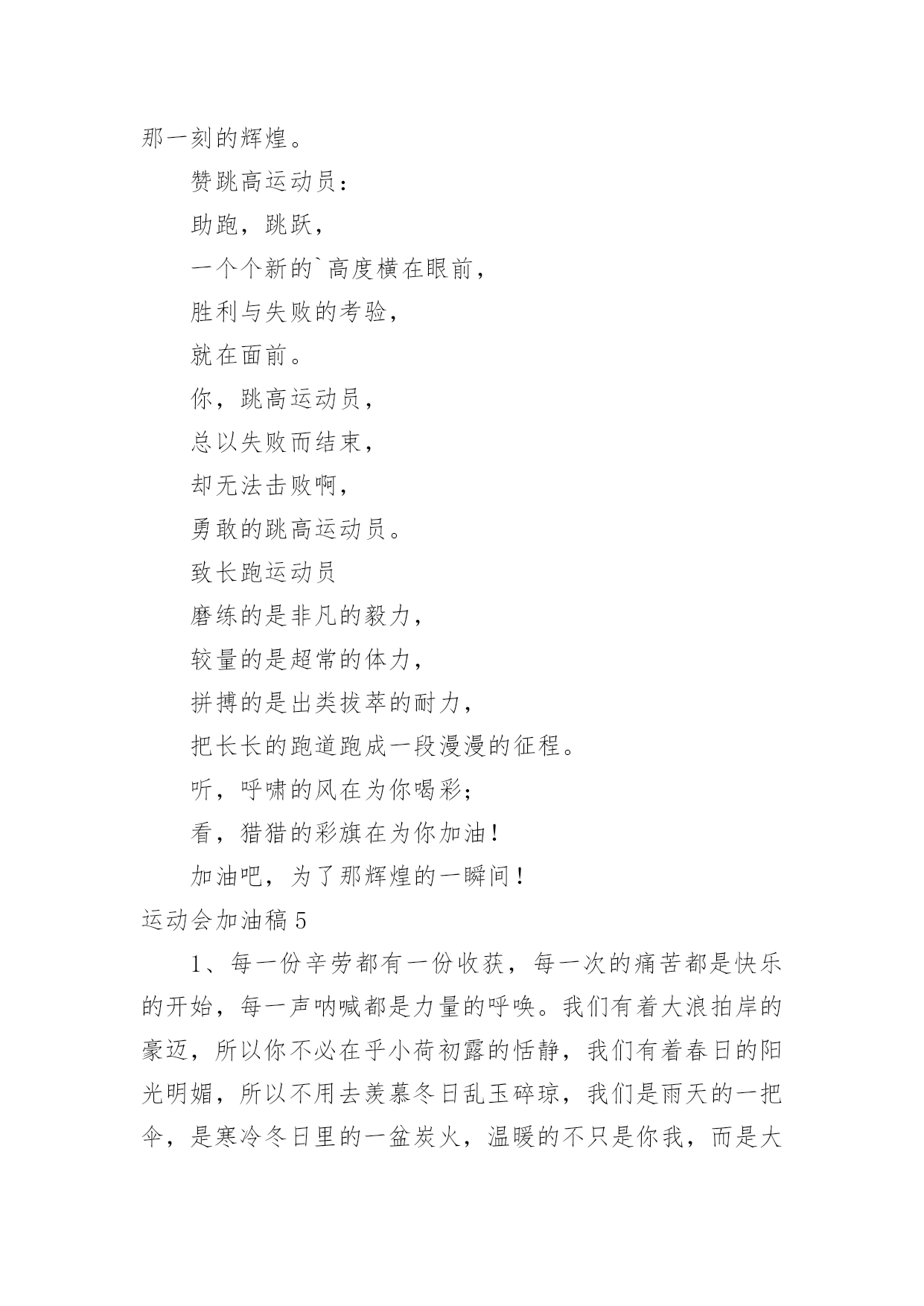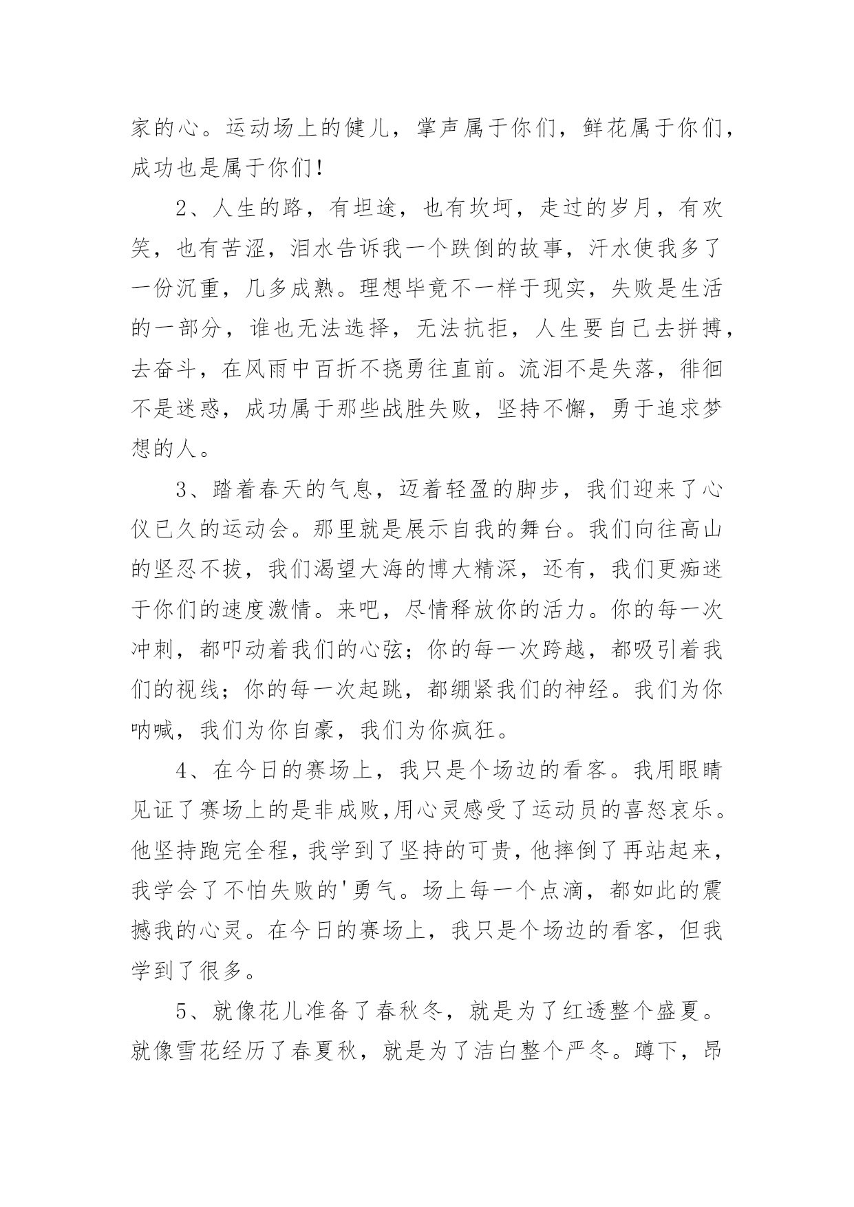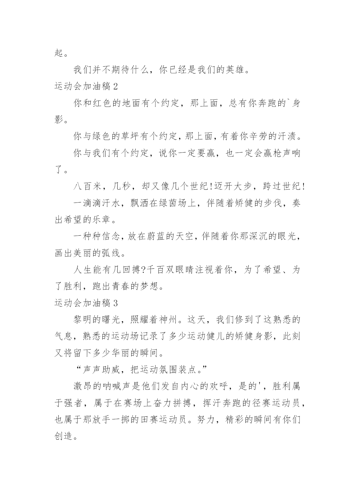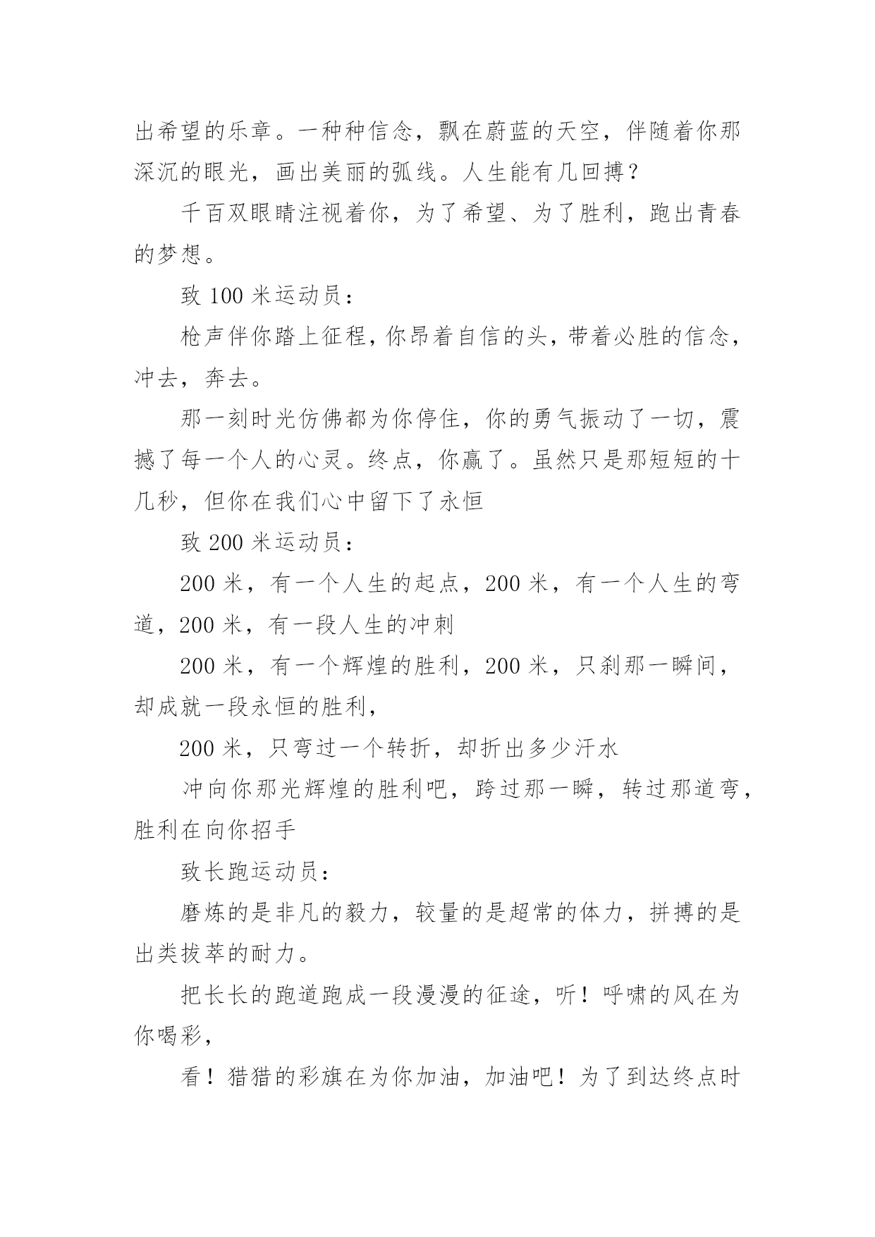 运动会加油稿运动会加油稿(汇编15篇)在当下社会,接触并使用加油稿的人越来越多,加油稿可以起到鼓励场上的人、增添其信心的作用。写起加油稿来就毫无头绪?下面是小编精心整理的运动会加油稿,欢迎阅读与收藏。运动会加油稿1美丽的花环是用荆棘编成的。不畏艰难,坚持不懈,斗志激昂、群策群力,但我们始终坚信“友谊第一,比赛第二”。我们会积极拼搏,赛出成绩,赛出风格,用蓬勃向上的精神面貌迎接崭新的未来!挑战运动极限,演绎健康风采!互相学习,取长补短,再接再厉,勇攀高峰!致1500米运动员你是否感到,烈日的照射,那是烈日对你的祝福!你是否感到,彩旗的摇摆,那是彩旗对你的呐喊!人们的注视,那是人们对你的希望!祝福在你身边,呐喊在你耳边希望在你心中!致长跑运动员在那一瞬间,你们像离了弦的箭!似流星,如闪电。运动场上你们最坚韧,不懈地追求,无悔地跑!运动场上你们最风采,你追我赶到终点!随着一阵热烈的`掌声,比赛胜负已分出。胜者继续加油,败者不要气馁互取长补短,相信你们都会收获,加油吧!你那洒满汗水的一跳,震撼着我的心灵。你看,细沙为你舞动;你听,树木为你鼓掌;跳远者,你是我们成功的骄傲,你是我们荣誉的象征。跳远者,加油。我们在终点等着你拿鼓舞人心的一跳,Comeon。我是运动员,我是运动员,在骄阳下展现自我,在奋斗中争取辉煌。我是运动员,不在乎成功与否,不怕汗水直流,因为,你看——有同学们为我加油!致运动员流星般的奔驰,为秋天画下一道风景,辛酸的泪汗,为生命添上一份色彩,成功的喜悦,为心绪加上一份激情。成败,不是评价你的标准,成功,也不是你唯一的追求,只要你拼搏了奋斗了,你就不必失望,你的生命已放出了闪光。为你呐喊,到一千五百米赛跑运动员,我们为你呐喊,希望给你力量给你信心,因为我们知道那开似轻松的脚步其实迈的艰难。我们为你呐喊,虽然喊的火热朝天,但却希望给你送去荫凉,因为我们看到那液体来不及蒸发,滚落下来,又被溅起。我们并不期待什么,你已经是我们的英雄。运动会加油稿2你和红色的地面有个约定,那上面,总有你奔跑的`身影。你与绿色的草坪有个约定,那上面,有着你辛劳的汗渍。你与我们有个约定,说你一定要赢,也一定会赢枪声响了。八百米,几秒,却又像几个世纪!迈开大步,跨过世纪!一滴滴汗水,飘洒在绿茵场上,伴随着矫健的步伐,奏出希望的乐章。一种种信念,放在蔚蓝的天空,伴随着你那深沉的眼光,画出美丽的弧线。人生能有几回搏?千百双眼睛注视着你,为了希望、为了胜利,跑出青春的梦想。运动会加油稿3黎明的曙光,照耀着神州。这天,我们修到了这熟悉的气息,熟悉的运动场记录了多少运动健儿的矫健身影,此刻又将留下多少华丽的瞬间。“声声助威,把运动氛围装点。”激昂的呐喊声是他们发自内心的欢呼,是的',胜利属于强者,属于在赛场上奋力拼搏,挥汗奔跑的径赛运动员,也属于那放手一掷的田赛运动员。努力,精彩的瞬间有你们创造。还记得奥林匹克的口号吗?更高、更快、更强,正是因为有了动力,才让我们的运动变的精彩,变的绚丽,变的引人。大家记忆尤新的永远是最有风采的一面,乔丹的灌蓝,巴乔的射门。这所有的一切都让我们深深感受到一种精神的存在,那是勇攀高峰的精神,那是不断超越的精神,更是人类挑战极限的精神。除了超越的精神外,还有一种风采感动着我们,那是运动最本质的品格,也是人类在竞争中的最真实,自然的情感流露。那是一种团结奋进的精神,它让本来残酷的竞争带上了人为的印记,捎上了一片真情。它让运动除了成绩外多了一种品质值得歌颂,相信那才是最感人的东西,它长存于我们运动史,深烙在我们思想中。你永远是我们心目中真正的英雄,第一个冲过终点的人当然是我们的偶像,而尚在跑道上为了奥林匹克精神奋力拼搏的,更值得我们敬崇、永不放弃,永不服输、终点并不是真正的终点,体育必将冲破人类的极限。运动会加油稿4致短跑运动员:踏上跑道,是一种选择。离开起点,是一种勇气。驰骋赛场,为追求一种胜利。朋友,用你的实力,用你的智慧,去开拓出那一片属于你的短跑天地吧。致长跑运动员:一滴滴汗水,飘落在绿茵道上,伴随着矫健的步伐,奏出希望的乐章。一种种信念,飘在蔚蓝的天空,伴随着你那深沉的眼光,画出美丽的弧线。人生能有几回搏?千百双眼睛注视着你,为了希望、为了胜利,跑出青春的梦想。致100米运动员:枪声伴你踏上征程,你昂着自信的头,带着必胜的信念,冲去,奔去。那一刻时光仿佛都为你停住,你的勇气振动了一切,震撼了每一个人的心灵。终点,你赢了。虽然只是那短短的十几秒,但你在我们心中留下了永恒致200米运动员:200米,有一个人生的起点,200米,有一个人生的弯道,200米,有一段人生的冲刺200米,有一个辉煌的胜利,200米,只刹那一瞬间,却成就一段永恒的胜利,200米,只弯过一个转折,却折出多少汗水冲向你那光辉煌的胜利吧,跨过那一瞬,转过那道弯