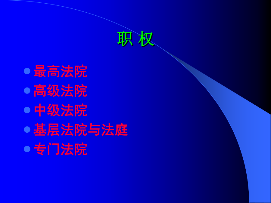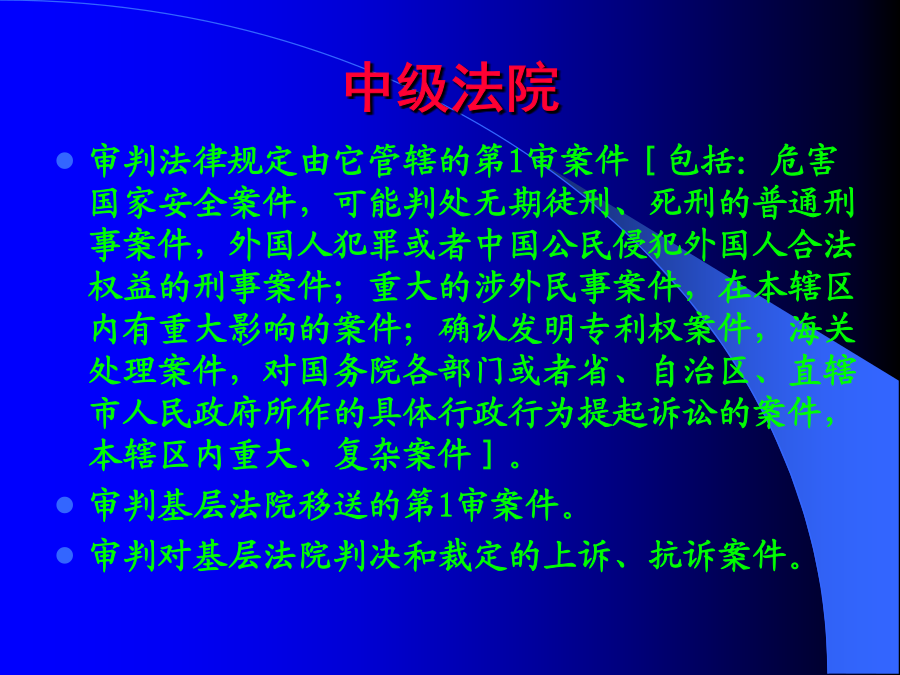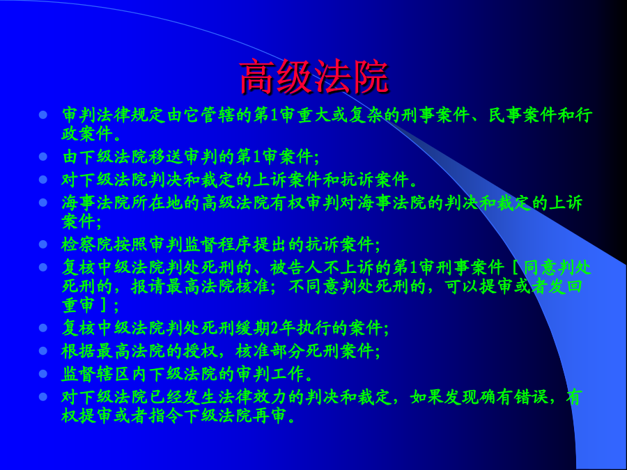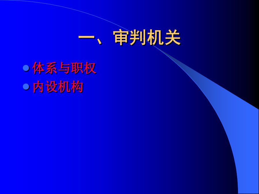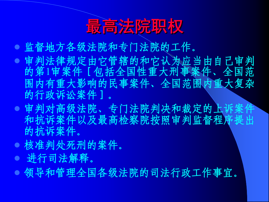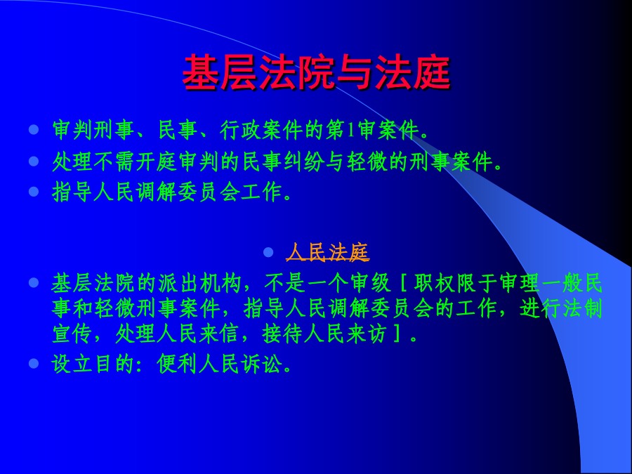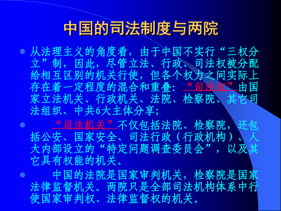 中国司法制度中国的司法制度与两院一、审判机关体系职权最高法院性质最高法院职权高级法院中级法院基层法院与法庭专门法院专门法院最高人民法院内设机构3.民事审判机构[设立4个审判庭。民事一庭专门审理婚姻家庭、人身权利和房产合同纠纷案件;民事二庭审理法人之间、法人与其它经济组织之间的各类合同和侵权纠纷案件;民事三庭审理知识产权案件;民事四庭审理海事海商案件,包括海事海商案件和涉外、涉港澳台的商事案件]。4.行政法庭[审理涉及中央国家机关的行政诉讼案件]。5.审判委员会[审判委员会不是根据部门法的要求设立,而是根据民主集中制的领导原则设立的。它是最高法院的领导集团,而不是法律执行机构。它是中国独有的审判领导形式]。地方各级人民法院内设机构专门法院与地方法院的区别二、检察机关体系与职权立案范围内设机构组织机构最高检察院地方各级检察院主要工作部门三、工作方式法院合议制两审终审制两审终审制审级制度的实质与问题审判委员会案件审批制度检察院的工作方式侦察公安机关(国家安全机关)立案侦查、检察院立案监督中的问题批捕1.批捕决定2.逮捕完成后的工作批捕中的问题公诉公诉中的问题抗诉抗诉监督民主集中制