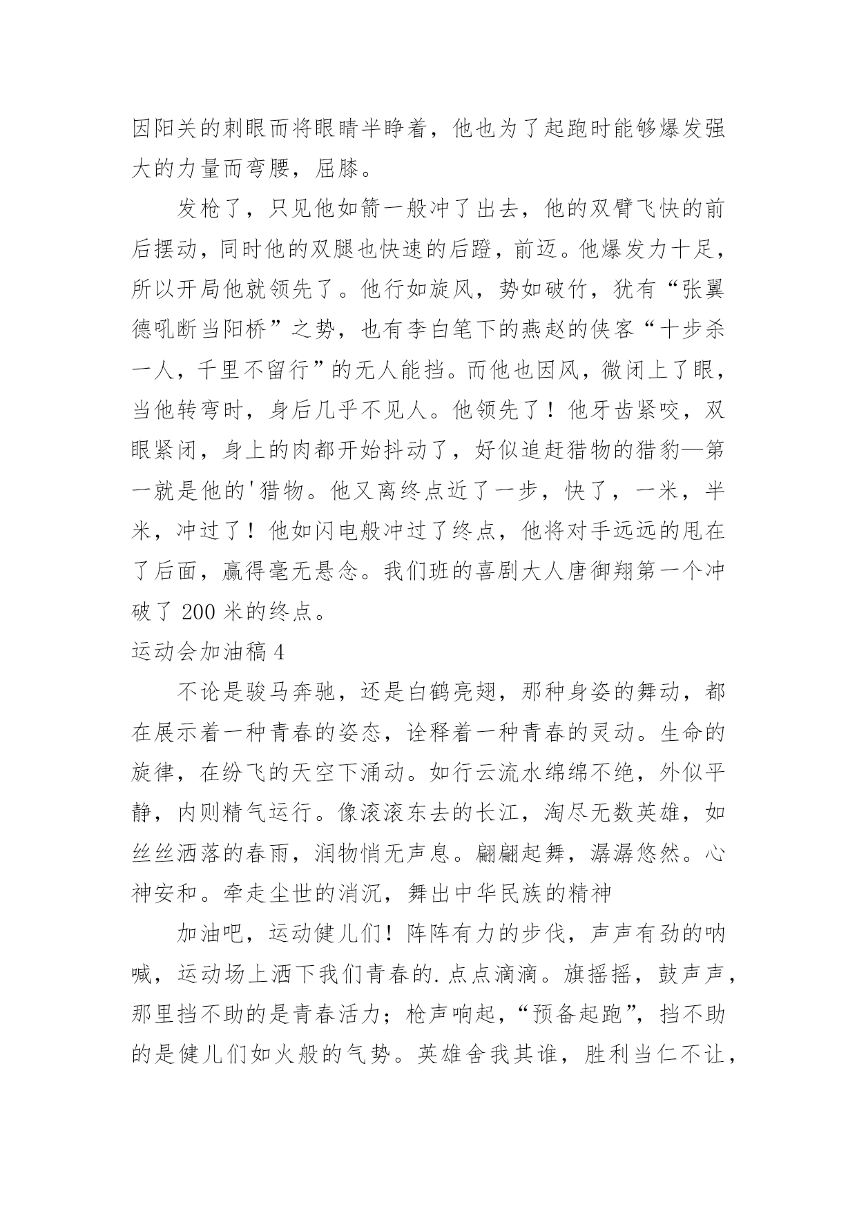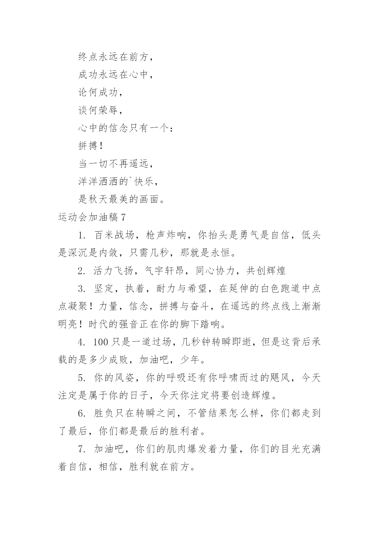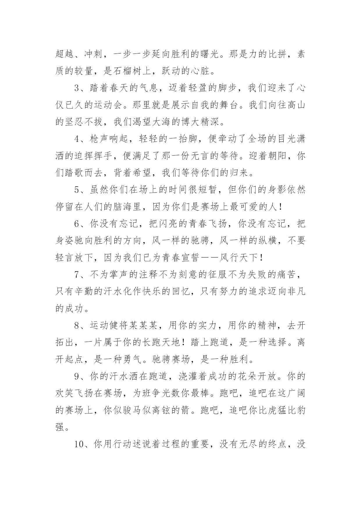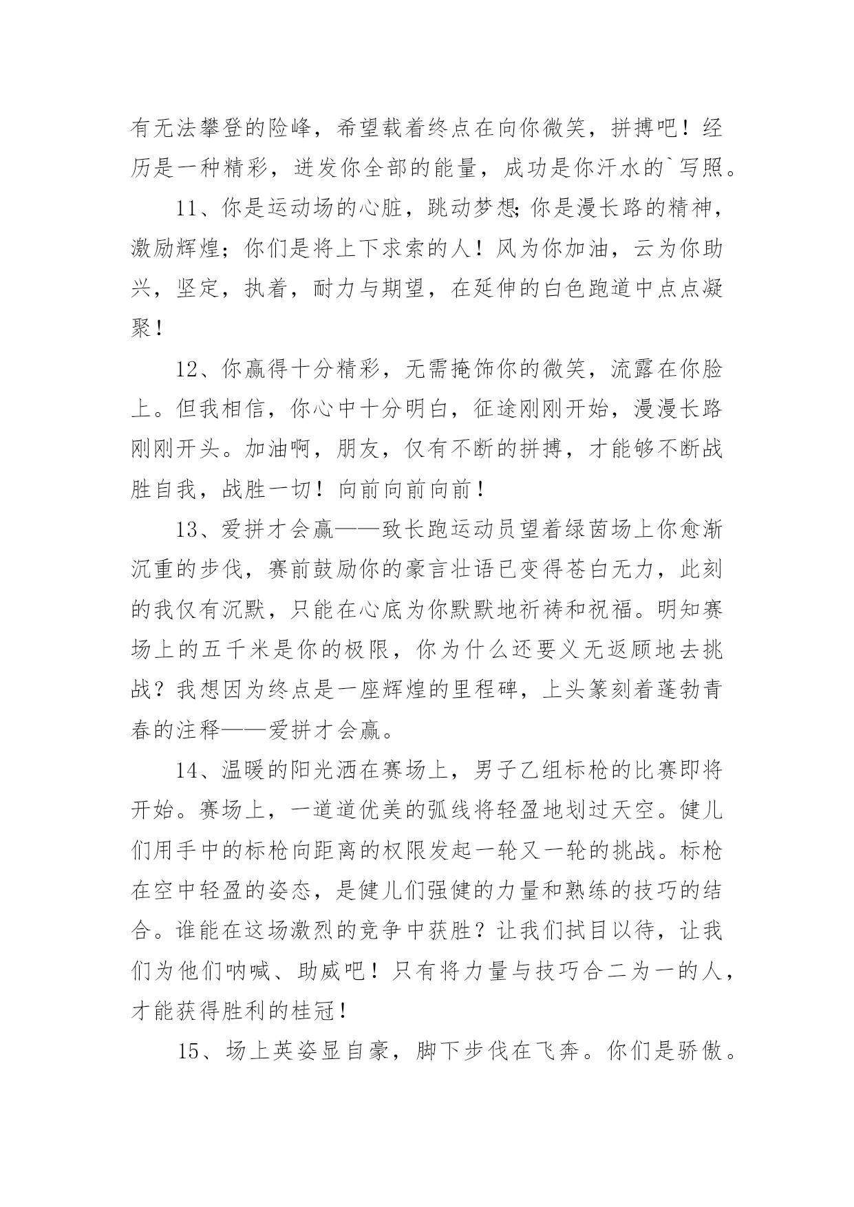 运动会加油稿运动会加油稿(热)在充满活力,日益开放的今天,我们用到加油稿的地方越来越多,借助加油稿可以活跃气氛,催人奋进。还是对加油稿一筹莫展吗?以下是小编整理的运动会加油稿,仅供参考,大家一起来看看吧。运动会加油稿1同学们看,那边正要进行的是二年级立定跳远比赛,二(6)班的运动健将们颜马可、曾钰、周君豪、易书漫、宋可鑫、潘芊荷正热火朝天地做着热身运动呢,他们显得非常精神抖擞!为了运动会的一搏,我们班的'运动健将们在平时牺牲了不少业余时间,付出了不少努力!在这共同期待的一刻,同学们向着目标跳跃吧!加油!二(6)班!运动会加油稿21、只有拼搏,才会取得辉煌的成绩;只有播种,才能收获丰硕的果实;只有追求,才能品味真正的人生。金牌和花环从来不是撞树的兔子,骄傲和自豪,也从来不是天上掉下来的馅饼,只瞄准而不射击的猎手不是好猎手,只呐喊不冲锋的士兵不是好士兵。运动健儿们,加油!无论成功还是失败,只要为之奋斗!2、有多少次挥泪如雨,伤痛曾添满记忆,只因为始终相信,去拼搏才能胜利。总在鼓舞自己,要成功就得努力。热血在赛场沸腾,巨人在赛场升起。相信自己,你将赢得胜利,创造奇迹,相信自己,梦想在你手中,这是你的天地。当一切过去,你们将是第一。相信自己,你们将超越极限,相信自己,你们将超越自我!3、看到你那获胜后的笑容,谁知是用多少泪水与汗水浇灌成的。付出总有收获,上帝始终眷恋那些拼搏的人。失败时不要怨天忧人,只要拼搏才能换来成功。在竞争激烈的赛场上,只有爱拼才会赢;在艰苦的高中学习中,只有爱拼才会赢,在绚丽多彩的人生舞台上,只有爱拼才会赢。4、秋天,我和别人一样收获,望着我那干瘪的谷粒。心里有一种苦涩的欢乐。但我绝不因此而气馁,因为有你关怀着我。我把它们捧在手里,紧紧地,紧紧地放在您的面前。你的眼睛中流露着欢乐,仿佛你收获一样,欢笑着。5、不要太在意付出的多少,只要你有那颗付出的心,你就是我们最闪亮的星。因为“世事无常”。在终点处的第一个永远不会是你,只要笑到最后,坚持不懈才是最自然的纯美丽。04营销班的同学,机不可失啊,趁800米将要来临之时,准备好迈开你稳重的步伐,向前,冲吧。我们全体同学会一向在你们身边支持你们,为你们呐喊“加油”!6、在操场上,除了同学以外,还有我们的老师。这天在操场上,他们以自己的行动,为我们树立努力拼搏的榜样。虽然鬓角已有白发,皱纹已上眼角,但这些无法遮掩年轻的心!早晨的阳光照在每个人的身上,拼搏属于每个年轻的心房。7、秋风羽,天气淡淡的转凉。然而这人的秋在今日更加迷人,不是因为它的秋高气爽,也不是因为它的明媚阳光,是因为今日的人儿倍加精神气爽。看!运动场上那一幕幕,一股股,无论是哭是笑,市喜是悲,其中都融入了他们的汗水辛劳。他们是真正的矫健者,是运动场上的骄儿,更是我们心中的英雄。加油吧!英雄们!8、借着奥运的`东风迎着观众的喝彩,我们运动起来,奔跑在的跑道上,让我们共同努力,奔跑奔跑,冲向胜利的终点9、一条跑道,要四个人去打造一个信念,要四个人去拼搏每次交接都是信任的传递每次交接都是永恒的支持前世的五百次回眸,才能够换来今日的相遇,冲吧!向着终点,向着个四个人的共同目标,前进!10、看!那一面面迎风飘舞的彩旗,是一朵朵盛开的鲜花;听!那一阵阵惊天动地的欢呼,是回响在耳边胜利的风声。运动场上的你们,是胜利的标志,运动场上的你们,是青春的赞叹。去吧!去迎接那伟大的挑战,去吧!去做一名追风的少年。运动会加油稿3韩俊弛他站在第二道上准备着,阳光照在他身上,脸上,他也因阳关的刺眼而将眼睛半睁着,他也为了起跑时能够爆发强大的力量而弯腰,屈膝。发枪了,只见他如箭一般冲了出去,他的双臂飞快的前后摆动,同时他的双腿也快速的后蹬,前迈。他爆发力十足,所以开局他就领先了。他行如旋风,势如破竹,犹有“张翼德吼断当阳桥”之势,也有李白笔下的燕赵的侠客“十步杀一人,千里不留行”的无人能挡。而他也因风,微闭上了眼,当他转弯时,身后几乎不见人。他领先了!他牙齿紧咬,双眼紧闭,身上的肉都开始抖动了,好似追赶猎物的猎豹—第一就是他的'猎物。他又离终点近了一步,快了,一米,半米,冲过了!他如闪电般冲过了终点,他将对手远远的甩在了后面,赢得毫无悬念。我们班的喜剧大人唐御翔第一个冲破了200米的终点。运动会加油稿4不论是骏马奔驰,还是白鹤亮翅,那种身姿的舞动,都在展示着一种青春的姿态,诠释着一种青春的灵动。生命的旋律,在纷飞的天空下涌动。如行云流水绵绵不绝,外似平静,内则精气运行。像滚滚东去的长江,淘尽无数英雄,如丝丝洒落的春雨,润物悄无声息。翩翩起舞,潺潺悠然。心神安和。牵走尘世的消沉,舞出中华民族的精神加油吧,运动健儿们!阵阵有力的步伐,声声有劲的呐喊,运动场上洒下我们青春的.点点滴滴。旗摇摇,鼓声声,那里挡不助的是青春活力;枪声响起,“预备起跑