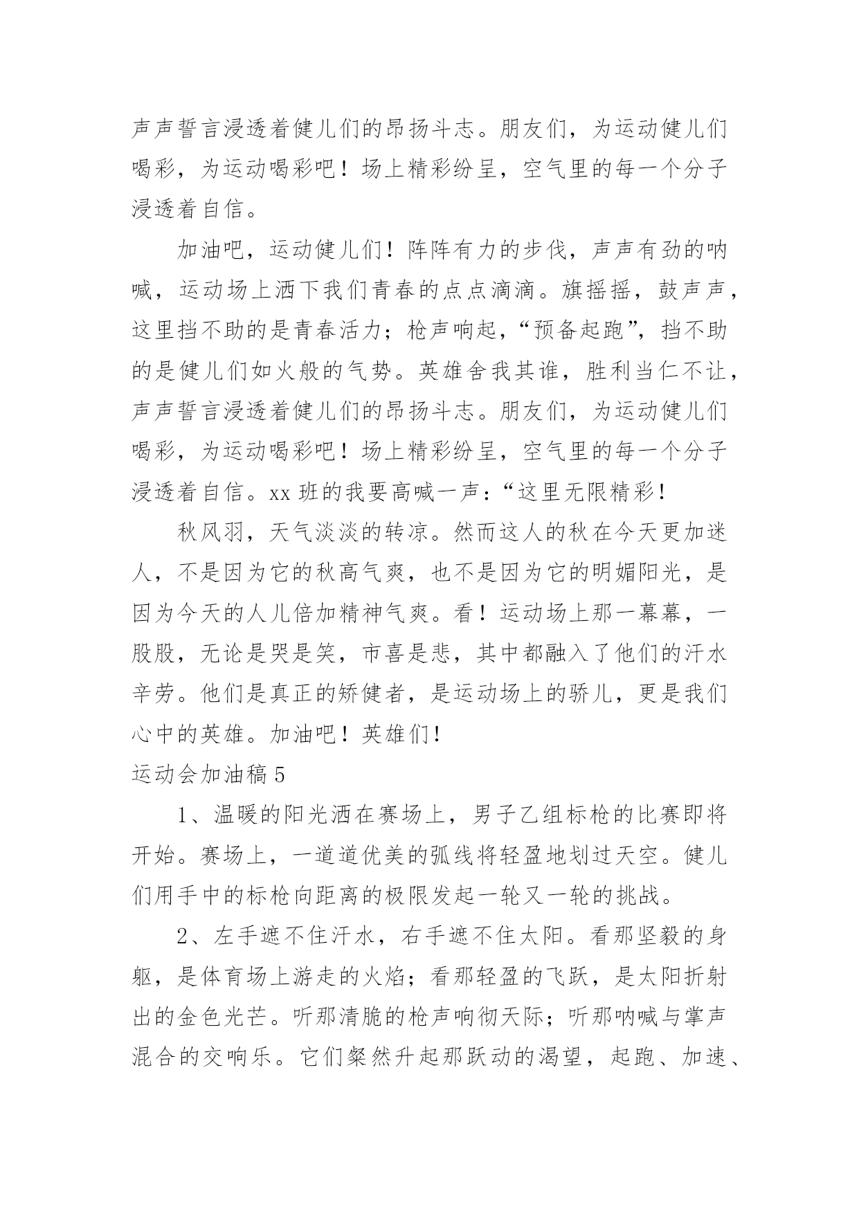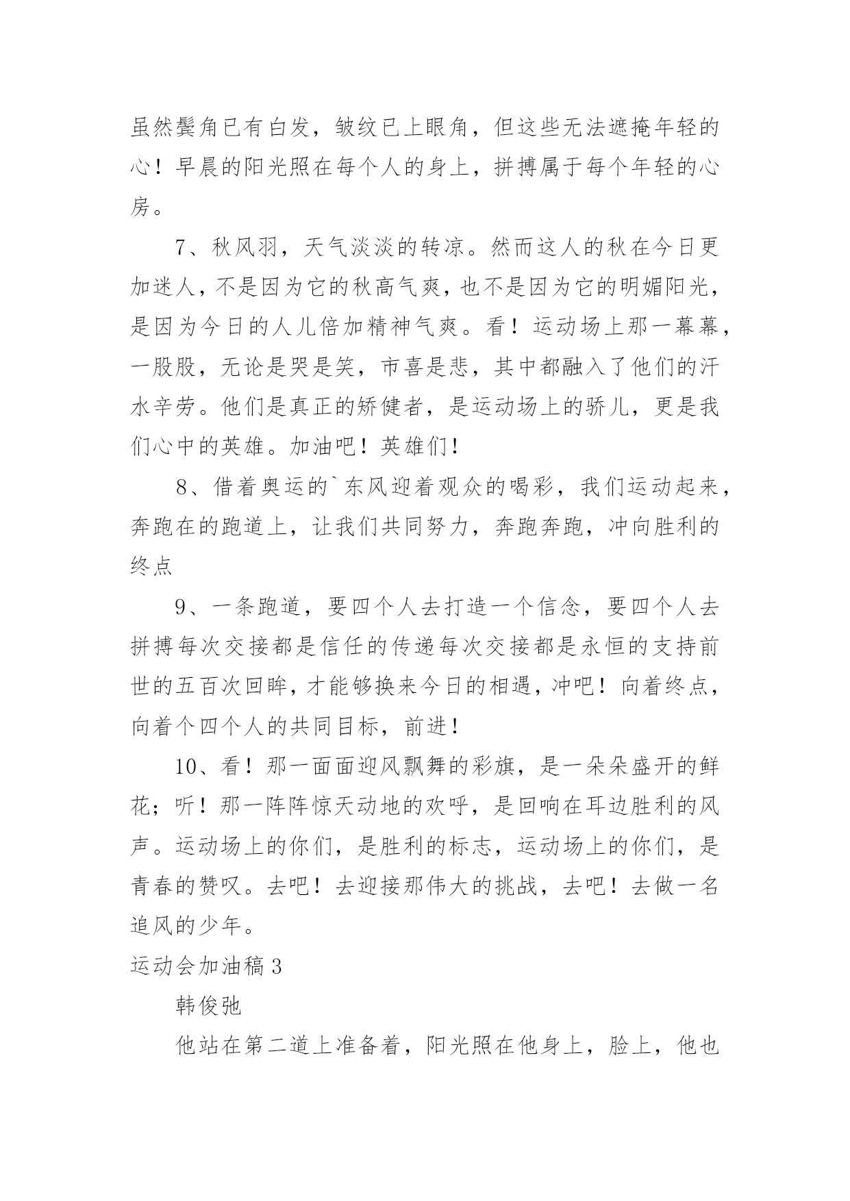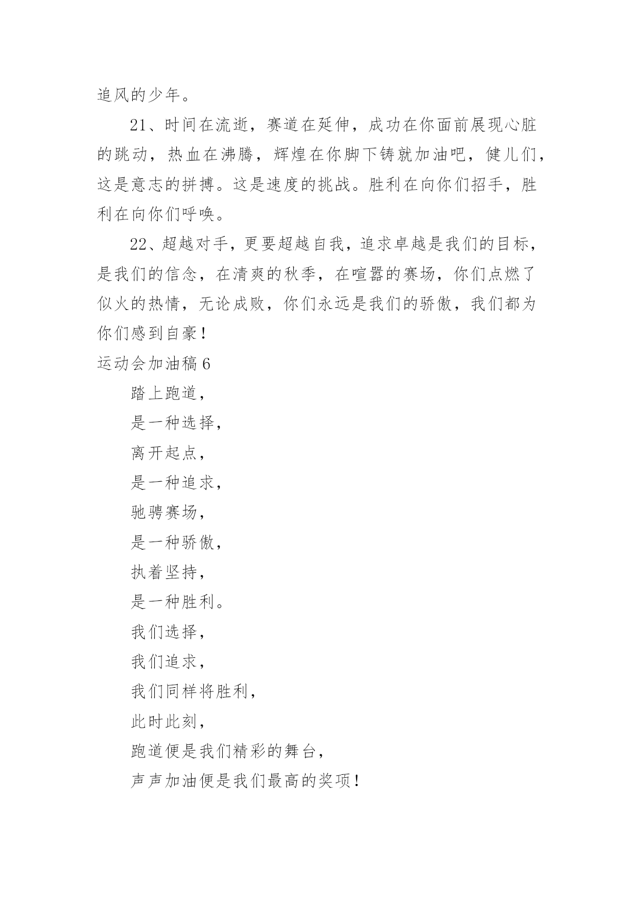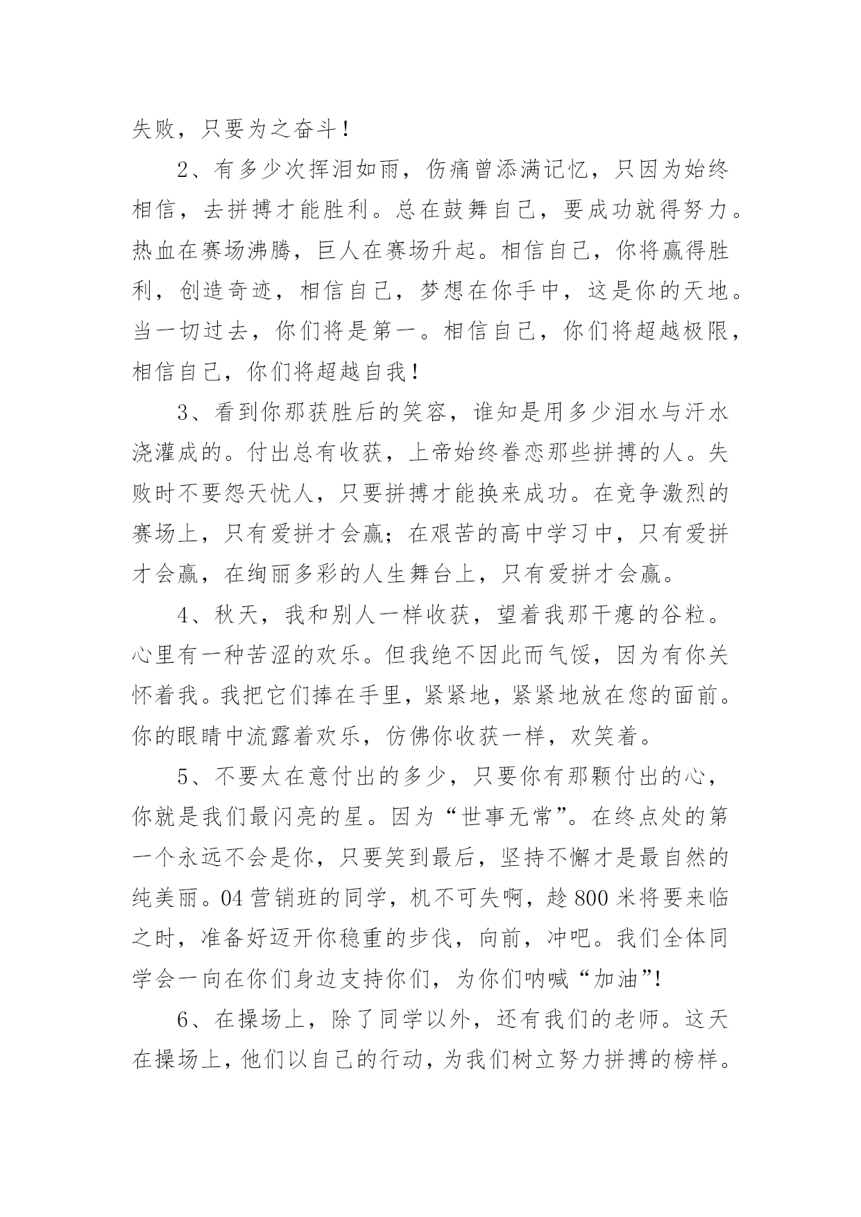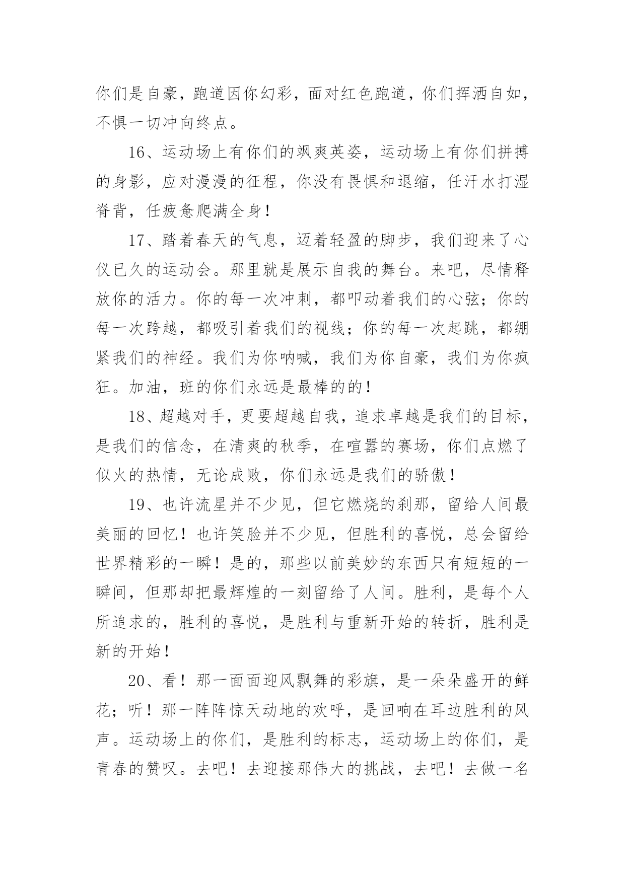 运动会加油稿运动会加油稿(热)在充满活力,日益开放的今天,我们用到加油稿的地方越来越多,借助加油稿可以活跃气氛,催人奋进。还是对加油稿一筹莫展吗?以下是小编整理的运动会加油稿,仅供参考,大家一起来看看吧。运动会加油稿1同学们看,那边正要进行的是二年级立定跳远比赛,二(6)班的运动健将们颜马可、曾钰、周君豪、易书漫、宋可鑫、潘芊荷正热火朝天地做着热身运动呢,他们显得非常精神抖擞!为了运动会的一搏,我们班的'运动健将们在平时牺牲了不少业余时间,付出了不少努力!在这共同期待的一刻,同学们向着目标跳跃吧!加油!二(6)班!运动会加油稿21、只有拼搏,才会取得辉煌的成绩;只有播种,才能收获丰硕的果实;只有追求,才能品味真正的人生。金牌和花环从来不是撞树的兔子,骄傲和自豪,也从来不是天上掉下来的馅饼,只瞄准而不射击的猎手不是好猎手,只呐喊不冲锋的士兵不是好士兵。运动健儿们,加油!无论成功还是失败,只要为之奋斗!2、有多少次挥泪如雨,伤痛曾添满记忆,只因为始终相信,去拼搏才能胜利。总在鼓舞自己,要成功就得努力。热血在赛场沸腾,巨人在赛场升起。相信自己,你将赢得胜利,创造奇迹,相信自己,梦想在你手中,这是你的天地。当一切过去,你们将是第一。相信自己,你们将超越极限,相信自己,你们将超越自我!3、看到你那获胜后的笑容,谁知是用多少泪水与汗水浇灌成的。付出总有收获,上帝始终眷恋那些拼搏的人。失败时不要怨天忧人,只要拼搏才能换来成功。在竞争激烈的赛场上,只有爱拼才会赢;在艰苦的高中学习中,只有爱拼才会赢,在绚丽多彩的人生舞台上,只有爱拼才会赢。4、秋天,我和别人一样收获,望着我那干瘪的谷粒。心里有一种苦涩的欢乐。但我绝不因此而气馁,因为有你关怀着我。我把它们捧在手里,紧紧地,紧紧地放在您的面前。你的眼睛中流露着欢乐,仿佛你收获一样,欢笑着。5、不要太在意付出的多少,只要你有那颗付出的心,你就是我们最闪亮的星。因为“世事无常”。在终点处的第一个永远不会是你,只要笑到最后,坚持不懈才是最自然的纯美丽。04营销班的同学,机不可失啊,趁800米将要来临之时,准备好迈开你稳重的步伐,向前,冲吧。我们全体同学会一向在你们身边支持你们,为你们呐喊“加油”!6、在操场上,除了同学以外,还有我们的老师。这天在操场上,他们以自己的行动,为我们树立努力拼搏的榜样。虽然鬓角已有白发,皱纹已上眼角,但这些无法遮掩年轻的心!早晨的阳光照在每个人的身上,拼搏属于每个年轻的心房。7、秋风羽,天气淡淡的转凉。然而这人的秋在今日更加迷人,不是因为它的秋高气爽,也不是因为它的明媚阳光,是因为今日的人儿倍加精神气爽。看!运动场上那一幕幕,一股股,无论是哭是笑,市喜是悲,其中都融入了他们的汗水辛劳。他们是真正的矫健者,是运动场上的骄儿,更是我们心中的英雄。加油吧!英雄们!8、借着奥运的`东风迎着观众的喝彩,我们运动起来,奔跑在的跑道上,让我们共同努力,奔跑奔跑,冲向胜利的终点9、一条跑道,要四个人去打造一个信念,要四个人去拼搏每次交接都是信任的传递每次交接都是永恒的支持前世的五百次回眸,才能够换来今日的相遇,冲吧!向着终点,向着个四个人的共同目标,前进!10、看!那一面面迎风飘舞的彩旗,是一朵朵盛开的鲜花;听!那一阵阵惊天动地的欢呼,是回响在耳边胜利的风声。运动场上的你们,是胜利的标志,运动场上的你们,是青春的赞叹。去吧!去迎接那伟大的挑战,去吧!去做一名追风的少年。运动会加油稿3韩俊弛他站在第二道上准备着,阳光照在他身上,脸上,他也因阳关的刺眼而将眼睛半睁着,他也为了起跑时能够爆发强大的力量而弯腰,屈膝。发枪了,只见他如箭一般冲了出去,他的双臂飞快的前后摆动,同时他的双腿也快速的后蹬,前迈。他爆发力十足,所以开局他就领先了。他行如旋风,势如破竹,犹有“张翼德吼断当阳桥”之势,也有李白笔下的燕赵的侠客“十步杀一人,千里不留行”的无人能挡。而他也因风,微闭上了眼,当他转弯时,身后几乎不见人。他领先了!他牙齿紧咬,双眼紧闭,身上的肉都开始抖动了,好似追赶猎物的猎豹—第一就是他的'猎物。他又离终点近了一步,快了,一米,半米,冲过了!他如闪电般冲过了终点,他将对手远远的甩在了后面,赢得毫无悬念。我们班的喜剧大人唐御翔第一个冲破了200米的终点。运动会加油稿4不论是骏马奔驰,还是白鹤亮翅,那种身姿的舞动,都在展示着一种青春的姿态,诠释着一种青春的灵动。生命的旋律,在纷飞的天空下涌动。如行云流水绵绵不绝,外似平静,内则精气运行。像滚滚东去的长江,淘尽无数英雄,如丝丝洒落的春雨,润物悄无声息。翩翩起舞,潺潺悠然。心神安和。牵走尘世的消沉,舞出中华民族的精神加油吧,运动健儿们!阵阵有力的步伐,声声有劲的呐喊,运动场上洒下我们青春的.点点滴滴。旗摇摇,鼓声声,那里挡不助的是青春活力;枪声响起,“预备起跑