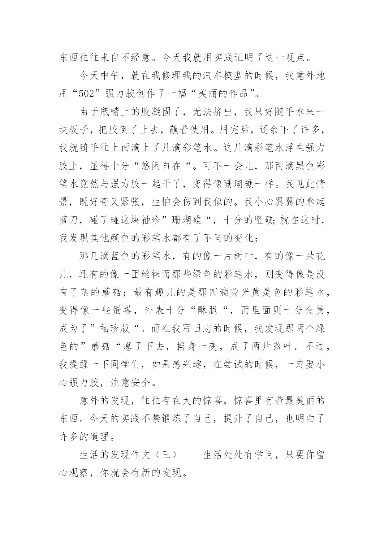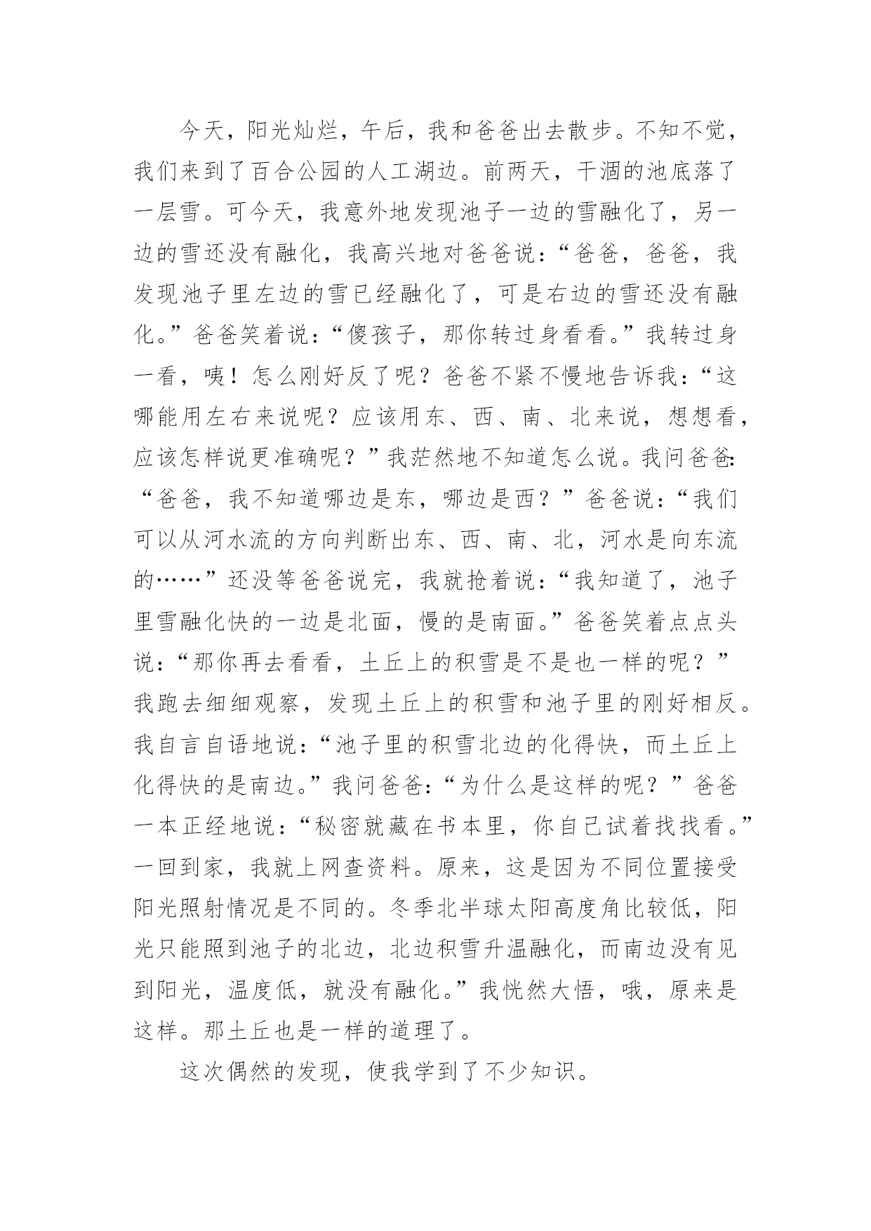 以生活的发现为题的作文以生活的发现为题的作文生活的发现作文(一)在生活中,处处会有发现,也许在你不经意间也许这一秒你可能就会意外发现。现在我来讲讲我的意外发现吧!那天,爸爸妈妈在上班,屋里只有我一人。我静悄悄的趴在课桌上望着作业上密密麻麻的字不知从何写起,于是我开始找点乐趣偷偷懒。我正准备找改正液玩刚拿到手,盖子掉了,改正液倒在我的衣服上,天啊!我不禁大叫黑色的毛衣上有明显的白色污渍。我想:要是不自己洗,出去别人就要叫我大熊猫了那可多不好我一副坚定的神色自言自语道:“洗衣服,哼!小事一桩”我把脏衣服脱了放进洗衣机里,可是怎么用呢?看来只能用手洗了。我把盆里装满水,拿手错了好一会可污渍竟然像磁铁一样牢吸在衣服上,一点也没变,正当我急得像热锅上的蚂蚁一样时,不小心把洗甲水泼到了衣服上,衣服上的污渍变浅了,我用手再一搓污渍竟奇迹般的不见了。我欣喜若狂,不禁为自己伟大的'发现而感到自豪。妈妈下班回到家,我把自己的发现告诉了妈妈。妈妈摸着我的头说:“世界上所有的事去亲身体验就会发现,并获得意想不到的收获!”生活的发现作文(二)意外的发现,往往来自于生活。往往不经意的地方,却也总是有着意外的惊喜。美丽的东西往往来自不经意。今天我就用实践证明了这一观点。今天中午,就在我修理我的汽车模型的时候,我意外地用“502”强力胶创作了一幅“美丽的作品”。由于瓶嘴上的胶凝固了,无法挤出,我只好随手拿来一块板子,把胶倒了上去,蘸着使用。用完后,还余下了许多,我就随手往上面滴上了几滴彩笔水。这几滴彩笔水浮在强力胶上,显得十分“悠闲自在“。可不一会儿,那两滴黑色彩笔水竟然与强力胶一起干了,变得像珊瑚礁一样。我见此情景,既好奇又紧张,生怕会伤到我似的。我小心翼翼的拿起剪刀,碰了碰这块袖珍”珊瑚礁“,十分的坚硬;就在这时,我发现其他颜色的彩笔水都有了不同的变化:那几滴蓝色的彩笔水,有的像一片树叶,有的像一朵花儿,还有的像一团丝袜而那些绿色的彩笔水,则变得像是没有了茎的蘑菇;最有趣儿的是那四滴荧光黄是色的彩笔水,变得像一些蛋塔,外表十分“酥脆“,而里面则十分金黄,成为了”袖珍版“。而在我写日志的时候,我发现那两个绿色的”蘑菇“瘪了下去,摇身一变,成了两片落叶。不过,我提醒一下同学们,如果感兴趣,在尝试的时候,一定要小心强力胶,注意安全。意外的发现,往往存在大的惊喜,惊喜里有着最美丽的东西。今天的实践不禁锻炼了自己,提升了自己,也明白了许多的道理。生活的发现作文(三)生活处处有学问,只要你留心观察,你就会有新的发现。今天,阳光灿烂,午后,我和爸爸出去散步。不知不觉,我们来到了百合公园的人工湖边。前两天,干涸的池底落了一层雪。可今天,我意外地发现池子一边的雪融化了,另一边的雪还没有融化,我高兴地对爸爸说:“爸爸,爸爸,我发现池子里左边的雪已经融化了,可是右边的雪还没有融化。”爸爸笑着说:“傻孩子,那你转过身看看。”我转过身一看,咦!怎么刚好反了呢?爸爸不紧不慢地告诉我:“这哪能用左右来说呢?应该用东、西、南、北来说,想想看,应该怎样说更准确呢?”我茫然地不知道怎么说。我问爸爸:“爸爸,我不知道哪边是东,哪边是西?”爸爸说:“我们可以从河水流的方向判断出东、西、南、北,河水是向东流的……”还没等爸爸说完,我就抢着说:“我知道了,池子里雪融化快的一边是北面,慢的是南面。”爸爸笑着点点头说:“那你再去看看,土丘上的积雪是不是也一样的呢?”我跑去细细观察,发现土丘上的积雪和池子里的刚好相反。我自言自语地说:“池子里的积雪北边的化得快,而土丘上化得快的是南边。”我问爸爸:“为什么是这样的呢?”爸爸一本正经地说:“秘密就藏在书本里,你自己试着找找看。”一回到家,我就上网查资料。原来,这是因为不同位置接受阳光照射情况是不同的。冬季北半球太阳高度角比较低,阳光只能照到池子的北边,北边积雪升温融化,而南边没有见到阳光,温度低,就没有融化。”我恍然大悟,哦,原来是这样。那土丘也是一样的道理了。这次偶然的发现,使我学到了不少知识。