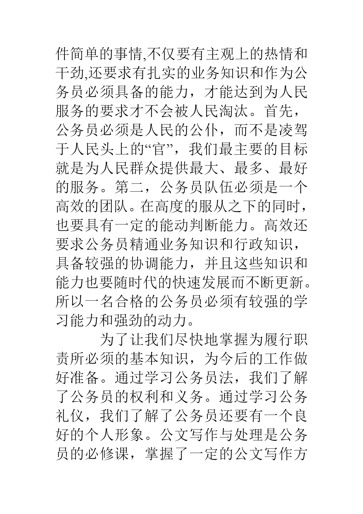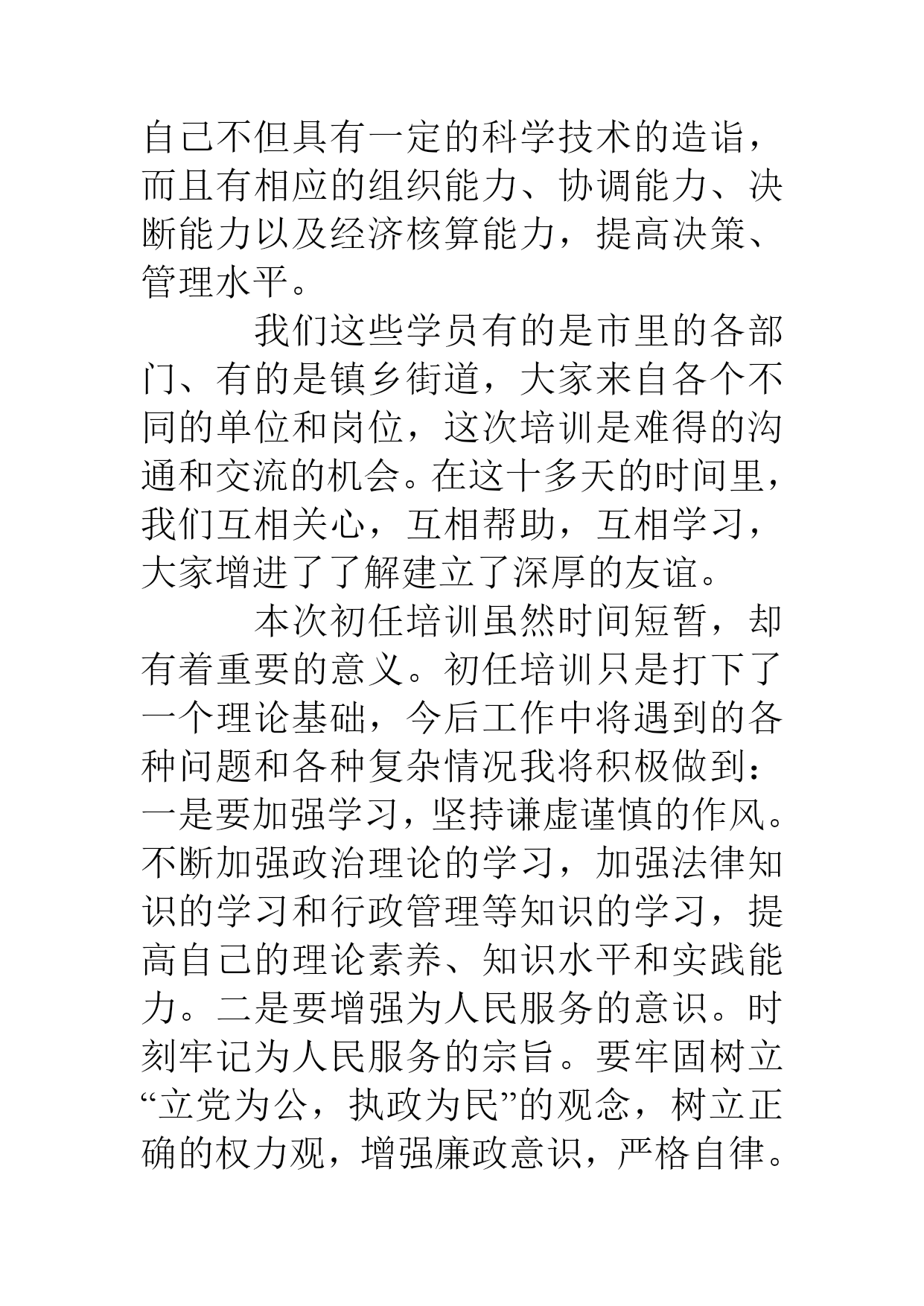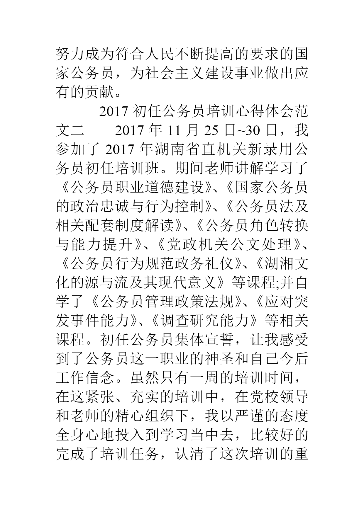 2017初任公务员培训心得体会初任公务员应具备的基本素养和具体能力。作为一名初任的基层公务员,必须要不断提高科学判断能力、驾驭市场经济能力、依法行政能力、应对复杂局面能力和总揽全局能力,从而加强自身的基本素养。下面是qc99整理的关于2017初任公务员培训心得体会范文,欢迎借鉴!2017初任公务员培训心得体会范文一在公务员初任培训这段时间里,在培训学校领导和老师的精心组织下,我始终以高昂的热情、严谨的态度全身心地投入到学习当中去,比较好的完成了培训任务,培训之后收获很多。通过学习培训,我深刻认识到作为一个国家公务员为人民服务并不是一件简单的事情,不仅要有主观上的热情和干劲,还要求有扎实的业务知识和作为公务员必须具备的能力,才能达到为人民服务的要求才不会被人民淘汰。首先,公务员必须是人民的公仆,而不是凌驾于人民头上的“官”,我们最主要的目标就是为人民群众提供最大、最多、最好的服务。第二,公务员队伍必须是一个高效的团队。在高度的服从之下的同时,也要具有一定的能动判断能力。高效还要求公务员精通业务知识和行政知识,具备较强的协调能力,并且这些知识和能力也要随时代的快速发展而不断更新。所以一名合格的公务员必须有较强的学习能力和强劲的动力。为了让我们尽快地掌握为履行职责所必须的基本知识,为今后的工作做好准备。通过学习公务员法,我们了解了公务员的权利和义务。通过学习公务礼仪,我们了解了公务员还要有一个良好的个人形象。公文写作与处理是公务员的必修课,掌握了一定的公文写作方法和技巧……在学习之余大家认真整理笔记、相互交流学习心得,巩固了学习成果。当然我们不能把学习的知识仅仅停留在书本上,要理论和实践相结合,做到知行统一,学以致用。为广大人民群众和社会提供优质高效的服务。知识经济是我们面临的机遇和挑战,这对国家公务员提出了更高的要求。知识经济要求我们应当具备1、较高的理论素养,坚定的政治信念和坚强的党性。只有具备了较高的理论素养,才能在当今这个多元化的政治经济格局中把握时代的脉搏,不被表面现象所迷惑。2、既有深度又有广度的合理的知识结构。国家公务员要加速更新知识,树立创新意识。国家公务员只有具备创新奋进的精神,不因循守旧,不满足于现状,才能及时吸收、消化新知识,适应新情况,否则有可能被甩在时代的后面。3、国家公务员要不断提高决策水平和管理水平。为了适应四个现代化的要求,国家公务员应努力学习现代管理理论和方法,使自己不但具有一定的科学技术的造诣,而且有相应的组织能力、协调能力、决断能力以及经济核算能力,提高决策、管理水平。我们这些学员有的是市里的各部门、有的是镇乡街道,大家来自各个不同的单位和岗位,这次培训是难得的沟通和交流的机会。在这十多天的时间里,我们互相关心,互相帮助,互相学习,大家增进了了解建立了深厚的友谊。本次初任培训虽然时间短暂,却有着重要的意义。初任培训只是打下了一个理论基础,今后工作中将遇到的各种问题和各种复杂情况我将积极做到:一是要加强学习,坚持谦虚谨慎的作风。不断加强政治理论的学习,加强法律知识的学习和行政管理等知识的学习,提高自己的理论素养、知识水平和实践能力。二是要增强为人民服务的意识。时刻牢记为人民服务的宗旨。要牢固树立“立党为公,执政为民”的观念,树立正确的权力观,增强廉政意识,严格自律。努力成为符合人民不断提高的要求的国家公务员,为社会主义建设事业做出应有的贡献。2017初任公务员培训心得体会范文二2017年11月25日~30日,我参加了2017年湖南省直机关新录用公务员初任培训班。期间老师讲解学习了《公务员职业道德建设》、《国家公务员的政治忠诚与行为控制》、《公务员法及相关配套制度解读》、《公务员角色转换与能力提升》、《党政机关公文处理》、《公务员行为规范政务礼仪》、《湖湘文化的源与流及其现代意义》等课程;并自学了《公务员管理政策法规》、《应对突发事件能力》、《调查研究能力》等相关课程。初任公务员集体宣誓,让我感受到了公务员这一职业的神圣和自己今后工作信念。虽然只有一周的培训时间,在这紧张、充实的培训中,在党校领导和老师的精心组织下,我以严谨的态度全身心地投入到学习当中去,比较好的完成了培训任务,认清了这次培训的重大意义、认清了公务员岗位的重要、明确了自身的不足和今后努力方向,更使我深刻的认识到,要成为一名合格的公务员,只有全方位提高自身的素质能力,不断迎接各种挑战。以下是我的几点心得体会。通过《国家公务员的政治忠诚与行为控制》、《公务员法及其配套法规介绍》课程的学习,我明白了作为一名合格的公务员,必须提高自身的政治理论和法律意识素养。应该熟知党的各项方针政策,认清各种当前社会政治、经济形势,要善于把握正确的前进方向,要毫不动摇的坚持社会主义道路。只有首先解决好方向问题我们才能够走的