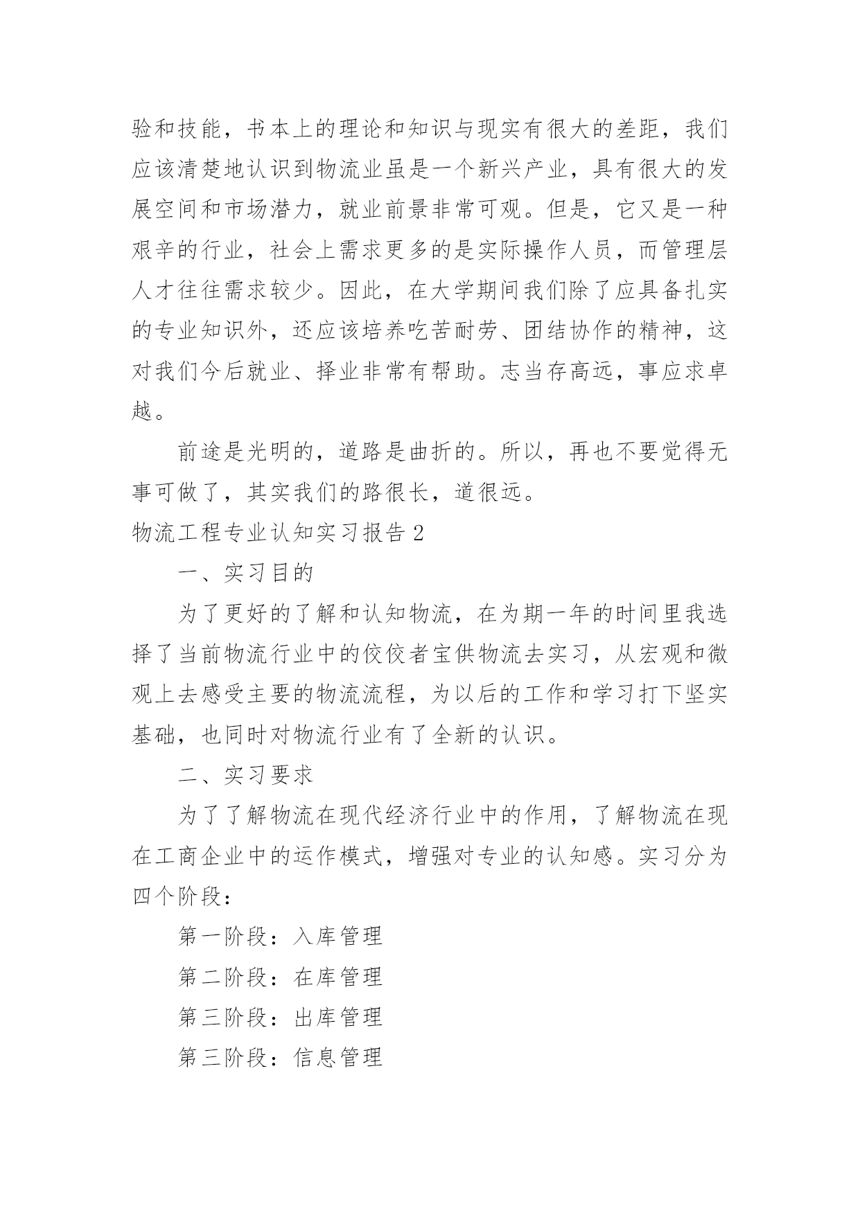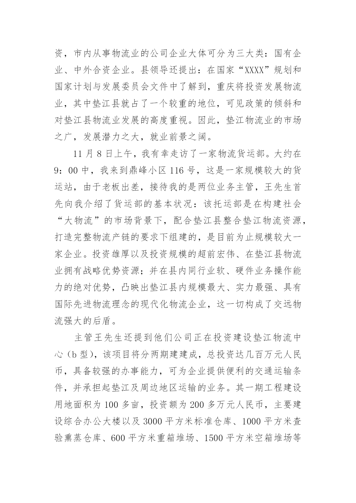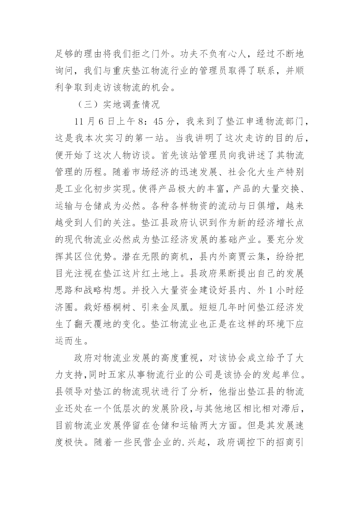 物流工程专业认知实习报告物流工程专业认知实习报告在人们越来越注重自身素养的今天,接触并使用报告的人越来越多,其在写作上具有一定的窍门。你还在对写报告感到一筹莫展吗?下面是小编收集整理的物流工程专业认知实习报告,仅供参考,欢迎大家阅读。物流工程专业认知实习报告1实习目的:选择身边的企业单位为对象,联系课上所学理论,采用实地考察跟踪其物流全过程的方法,对垫江物流业发展现状进行初步了解。培养实际调研能力,尝试检验所学知识,并从实际中进一步学习了解物流的内涵与外延。实习时间:20xx年XX月XX日—XX月XX日实习地点:XX市县实习步骤:一、前期准备工作1、11月2日下午2:00在中色物流公司报道。2、11月3日上午10:00在中色物流公司,听取物流管理的意见,并拟定实习方式、调查对象。3、11月4日下午通过登录网站、查阅报纸、杂志等方式寻找调查对象,并争取专业物流公司或单位的支持和协助。到系办公室开介绍信。4、准备数码相机、笔记本等实习所需物品。二、开展实习活动1、11月6日,走访垫江县物流行业。2、11月7日,参观、调查申通物流公司。3、11月9日,走访垫江县圆通物流部门。三、后期总结工作11月11日—12日收集并整理资料,对物流情况分析并定稿。实习内容:(一)实习准备工作11月4日下午2:00我在明确了这次实习的目的、方法及注意事项后。从摄影、记录、财务、安全保障、撰稿方面进行了详细的部署,确定了实习方式、调查对象,并拟定实习计划。(二)走访调查物流部门11月5日下午我开始寻找调查对象,通过登录网站、查阅报纸、杂志等方式寻找专业物流公司,在垫江物流网上我们搜到几家物流公司,但当我们致电争取公司支持和协助时,却一次次遭到拒绝和打击。其中有的公司很干脆:没时间接待;有的单位老总出差,没人可以做主接待我们;有的要申请总经理的同意,可是就没了答复;还有的是我千辛万苦找到一家老总的手机号码,可是总也打不进去。总之,他们有足够的理由将我们拒之门外。功夫不负有心人,经过不断地询问,我们与重庆垫江物流行业的管理员取得了联系,并顺利争取到走访该物流的机会。(三)实地调查情况11月6日上午8:45分,我来到了垫江申通物流部门,这是我本次实习的第一站。当我讲明了这次走访的目的后,便开始了这次人物访谈。首先该站管理员向我讲述了其物流管理的历程。随着市场经济的迅速发展、社会化大生产特别是工业化初步实现。使得产品极大的丰富,产品的大量交换、运输与仓储成为必然。各种各样物资的流动与日俱增,越来越受到人们的关注。垫江县政府认识到作为新的经济增长点的现代物流业必然成为垫江经济发展的基础产业。要充分发挥其区位优势。潜在无限的商机,县内外商贾云集,纷纷把目光注视在垫江这片红土地上。县政府果断提出自己的发展思路和战略构想。并投入大量资金建设好县内、外1小时经济圈。栽好梧桐树、引来金凤凰。短短几年时间垫江经济发生了翻天覆地的变化。垫江物流业也正是在这样的环境下应运而生。政府对物流业发展的高度重视,对该协会成立给予了大力支持,同时五家从事物流行业的公司是该协会的发起单位。县领导对垫江的物流现状进行了分析,他指出垫江县的物流业还处在一个低层次的发展阶段,与其他地区相比相对滞后,目前物流业发展停留在仓储和运输两大方面。但是其发展速度极快。随着一些民营企业的.兴起,政府调控下的招商引资,市内从事物流业的公司企业大体可分为三大类:国有企业、中外合资企业。县领导还提出:在国家“XXXX”规划和国家计划与发展委员会文件中了解到,重庆将投资发展物流业,其中垫江县就占了一个较重的地位,可见政策的倾斜和对垫江县物流业发展的高度重视。因此,垫江物流业的市场之广,发展潜力之大,就业前景之阔。11月8日上午,我有幸走访了一家物流货运部。大约在9:00中,我来到鼎峰小区116号,这是一家规模较大的货运站,由于老板出差,接待我的是两位业务主管,王先生首先向我介绍了货运部的基本状况:该托运部是在构建社会“大物流”的市场背景下,配合垫江县整合垫江物流资源,打造完整物流产链的要求下组建的,是目前为止规模较大一家企业。投资雄厚以及投资规模的超前宏伟、在垫江县物流业拥有战略优势资源;并在县内同行业软、硬件业务操作能力的绝对优势,凸映出垫江县内规模最大、实力最强、具有国际先进物流理念的现代化物流企业,这一切构成了交远物流强大的后盾。主管王先生还提到他们公司正在投资建设垫江物流中心(b型),该项目将分两期建建成,总投资达几百万元人民币,具备较强的办事能力,可为企业提供便利的交通运输条件,并承担起垫江及周边地区运输的业务。其一期工程建设用地面积为100多亩,投资额为200多万元人民币,主要建设综合办公大楼以及3000平方米标准仓库、1000平方米查验熏蒸仓库、600平方米重箱堆场、1500平方米空箱堆场等基础设