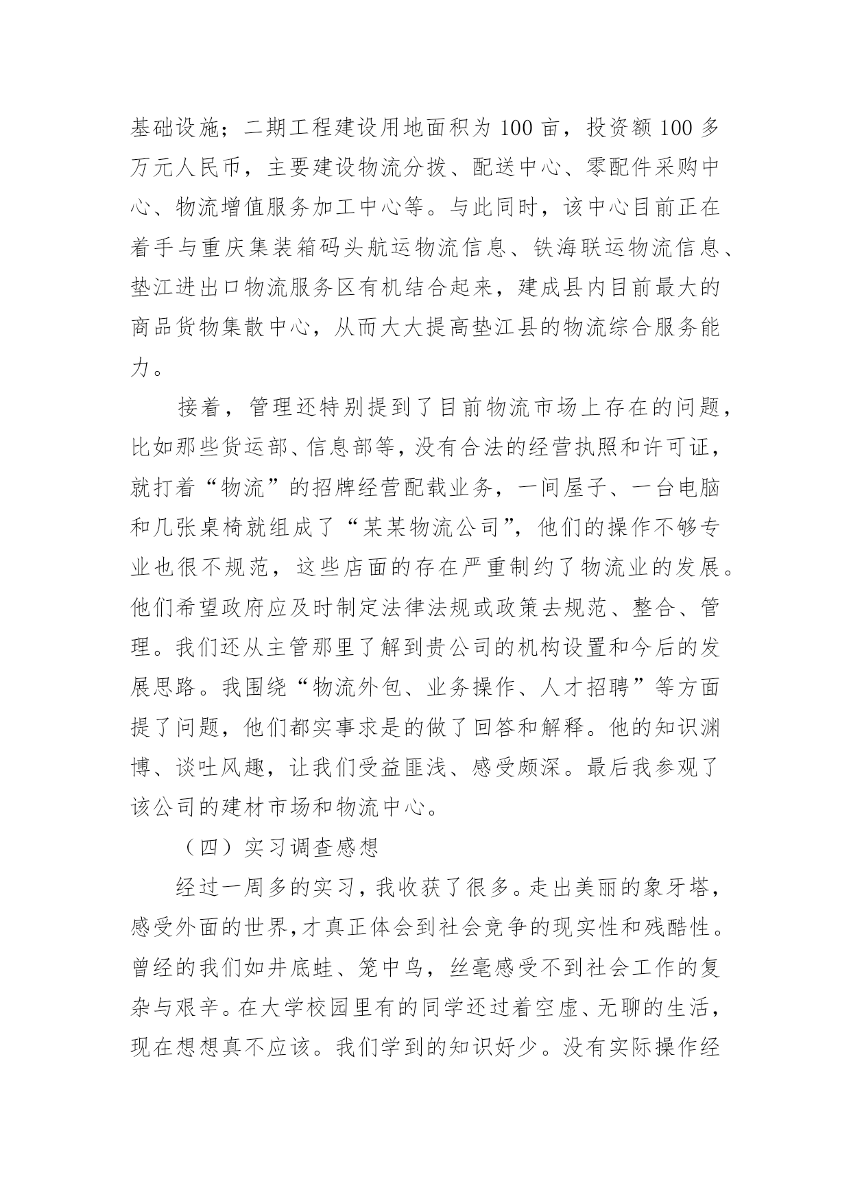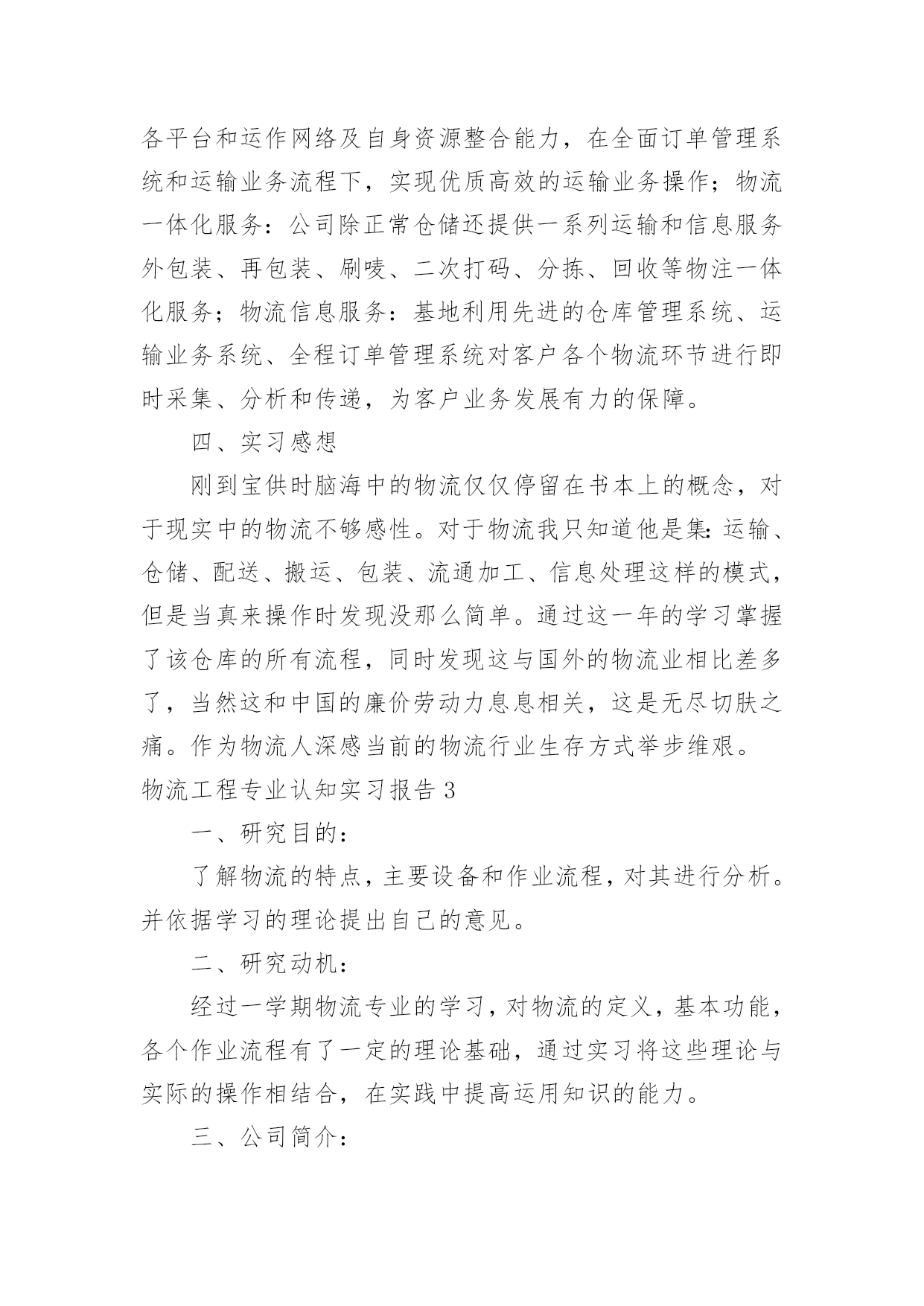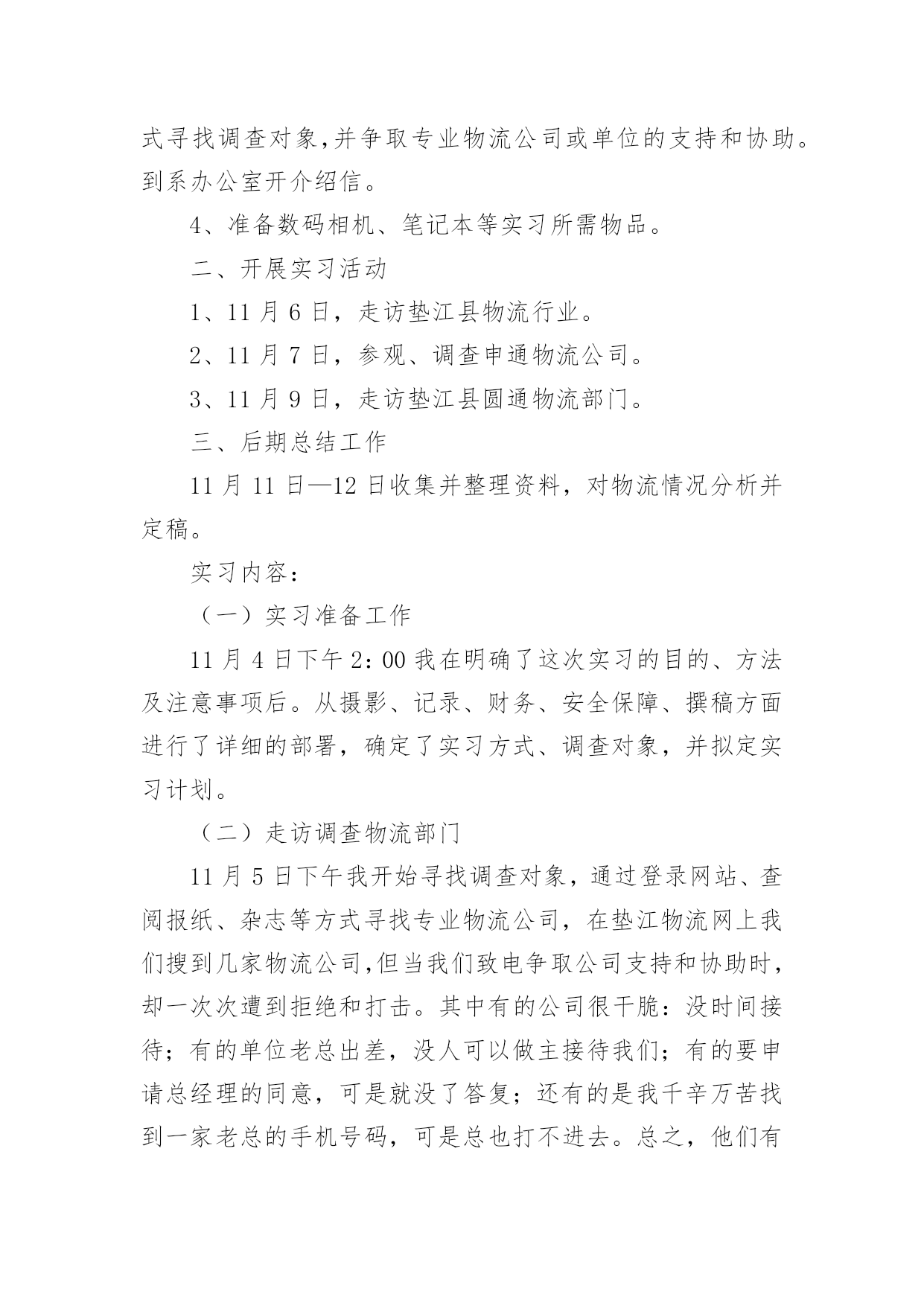 物流工程专业认知实习报告物流工程专业认知实习报告在人们越来越注重自身素养的今天,接触并使用报告的人越来越多,其在写作上具有一定的窍门。你还在对写报告感到一筹莫展吗?下面是小编收集整理的物流工程专业认知实习报告,仅供参考,欢迎大家阅读。物流工程专业认知实习报告1实习目的:选择身边的企业单位为对象,联系课上所学理论,采用实地考察跟踪其物流全过程的方法,对垫江物流业发展现状进行初步了解。培养实际调研能力,尝试检验所学知识,并从实际中进一步学习了解物流的内涵与外延。实习时间:20xx年XX月XX日—XX月XX日实习地点:XX市县实习步骤:一、前期准备工作1、11月2日下午2:00在中色物流公司报道。2、11月3日上午10:00在中色物流公司,听取物流管理的意见,并拟定实习方式、调查对象。3、11月4日下午通过登录网站、查阅报纸、杂志等方式寻找调查对象,并争取专业物流公司或单位的支持和协助。到系办公室开介绍信。4、准备数码相机、笔记本等实习所需物品。二、开展实习活动1、11月6日,走访垫江县物流行业。2、11月7日,参观、调查申通物流公司。3、11月9日,走访垫江县圆通物流部门。三、后期总结工作11月11日—12日收集并整理资料,对物流情况分析并定稿。实习内容:(一)实习准备工作11月4日下午2:00我在明确了这次实习的目的、方法及注意事项后。从摄影、记录、财务、安全保障、撰稿方面进行了详细的部署,确定了实习方式、调查对象,并拟定实习计划。(二)走访调查物流部门11月5日下午我开始寻找调查对象,通过登录网站、查阅报纸、杂志等方式寻找专业物流公司,在垫江物流网上我们搜到几家物流公司,但当我们致电争取公司支持和协助时,却一次次遭到拒绝和打击。其中有的公司很干脆:没时间接待;有的单位老总出差,没人可以做主接待我们;有的要申请总经理的同意,可是就没了答复;还有的是我千辛万苦找到一家老总的手机号码,可是总也打不进去。总之,他们有足够的理由将我们拒之门外。功夫不负有心人,经过不断地询问,我们与重庆垫江物流行业的管理员取得了联系,并顺利争取到走访该物流的机会。(三)实地调查情况11月6日上午8:45分,我来到了垫江申通物流部门,这是我本次实习的第一站。当我讲明了这次走访的目的后,便开始了这次人物访谈。首先该站管理员向我讲述了其物流管理的历程。随着市场经济的迅速发展、社会化大生产特别是工业化初步实现。使得产品极大的丰富,产品的大量交换、运输与仓储成为必然。各种各样物资的流动与日俱增,越来越受到人们的关注。垫江县政府认识到作为新的经济增长点的现代物流业必然成为垫江经济发展的基础产业。要充分发挥其区位优势。潜在无限的商机,县内外商贾云集,纷纷把目光注视在垫江这片红土地上。县政府果断提出自己的发展思路和战略构想。并投入大量资金建设好县内、外1小时经济圈。栽好梧桐树、引来金凤凰。短短几年时间垫江经济发生了翻天覆地的变化。垫江物流业也正是在这样的环境下应运而生。政府对物流业发展的高度重视,对该协会成立给予了大力支持,同时五家从事物流行业的公司是该协会的发起单位。县领导对垫江的物流现状进行了分析,他指出垫江县的物流业还处在一个低层次的发展阶段,与其他地区相比相对滞后,目前物流业发展停留在仓储和运输两大方面。但是其发展速度极快。随着一些民营企业的.兴起,政府调控下的招商引资,市内从事物流业的公司企业大体可分为三大类:国有企业、中外合资企业。县领导还提出:在国家“XXXX”规划和国家计划与发展委员会文件中了解到,重庆将投资发展物流业,其中垫江县就占了一个较重的地位,可见政策的倾斜和对垫江县物流业发展的高度重视。因此,垫江物流业的市场之广,发展潜力之大,就业前景之阔。11月8日上午,我有幸走访了一家物流货运部。大约在9:00中,我来到鼎峰小区116号,这是一家规模较大的货运站,由于老板出差,接待我的是两位业务主管,王先生首先向我介绍了货运部的基本状况:该托运部是在构建社会“大物流”的市场背景下,配合垫江县整合垫江物流资源,打造完整物流产链的要求下组建的,是目前为止规模较大一家企业。投资雄厚以及投资规模的超前宏伟、在垫江县物流业拥有战略优势资源;并在县内同行业软、硬件业务操作能力的绝对优势,凸映出垫江县内规模最大、实力最强、具有国际先进物流理念的现代化物流企业,这一切构成了交远物流强大的后盾。主管王先生还提到他们公司正在投资建设垫江物流中心(b型),该项目将分两期建建成,总投资达几百万元人民币,具备较强的办事能力,可为企业提供便利的交通运输条件,并承担起垫江及周边地区运输的业务。其一期工程建设用地面积为100多亩,投资额为200多万元人民币,主要建设综合办公大楼以及3000平方米标准仓库、1000平方米查验熏蒸仓库、600平方米重箱堆场、1500平方米空箱堆场等基础设