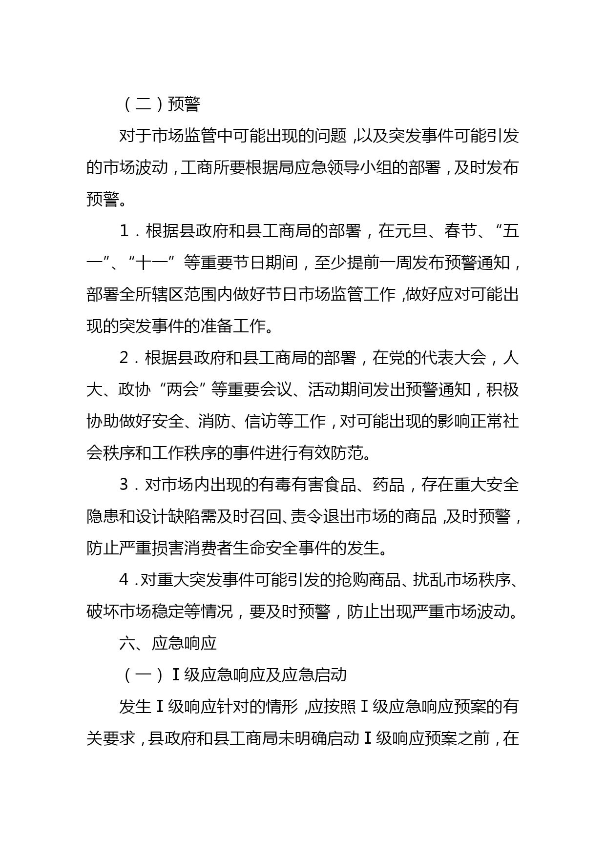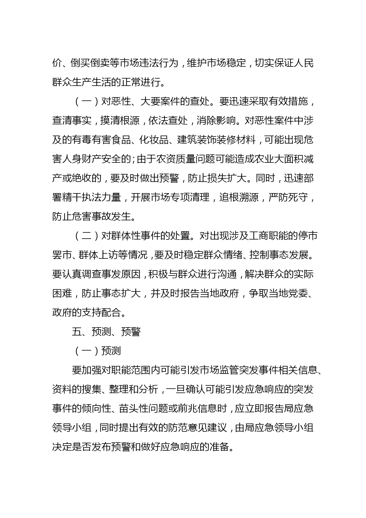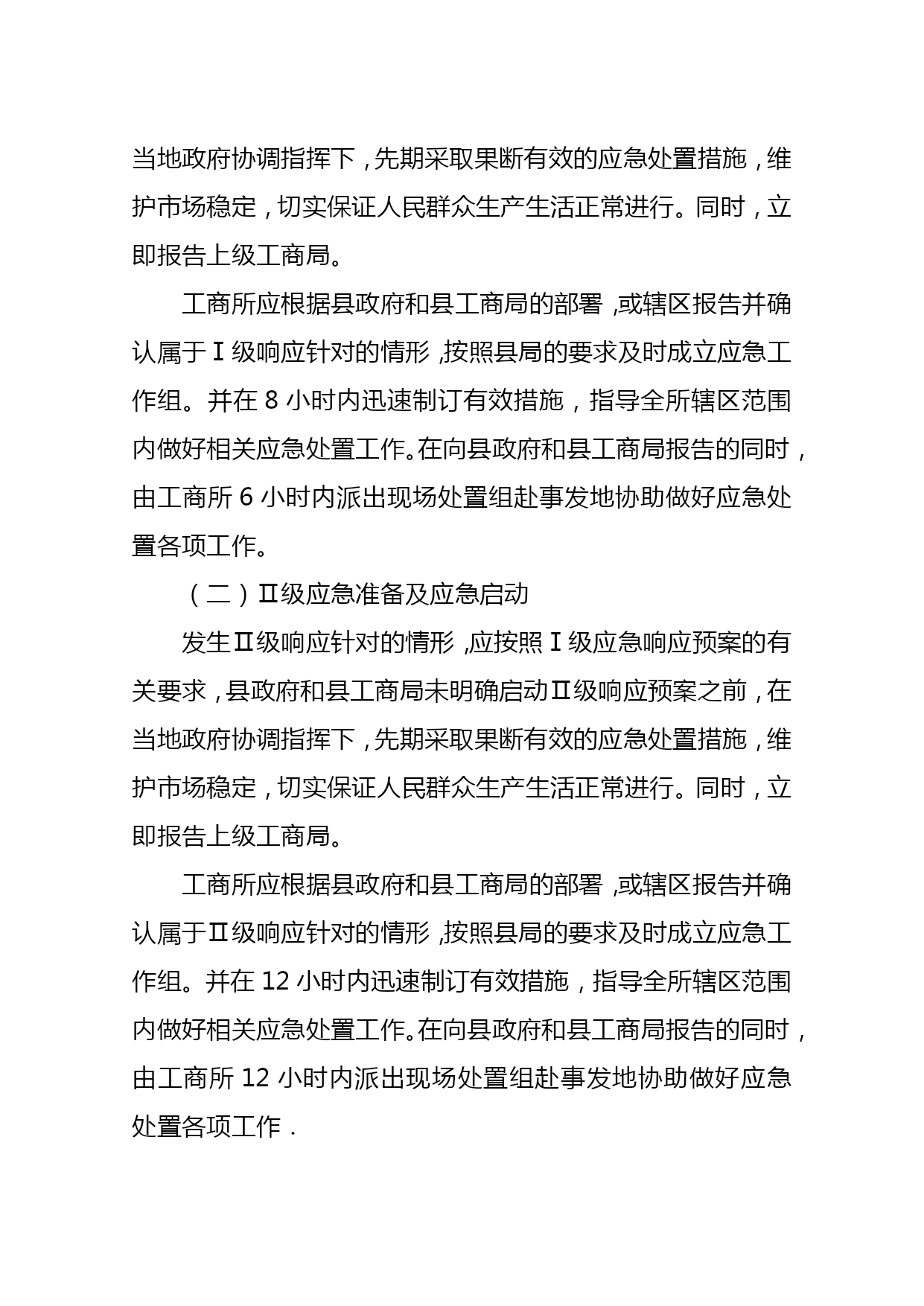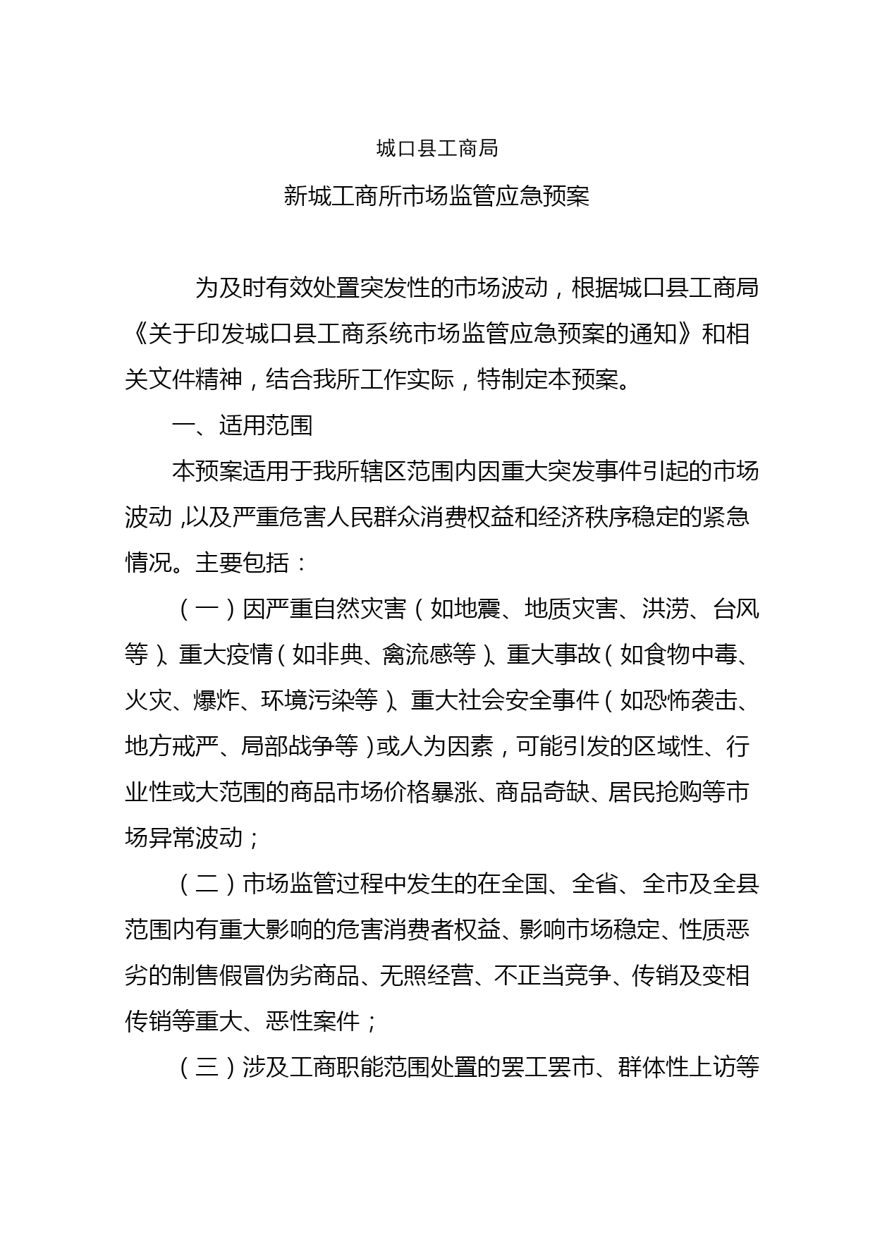 新城工商所市场监管应急预案(完整版)资料(可以直接使用,可编辑优秀版资料,欢迎下载)城口县工商局新城工商所市场监管应急预案为及时有效处置突发性的市场波动,根据城口县工商局《关于印发城口县工商系统市场监管应急预案的通知》和相关文件精神,结合我所工作实际,特制定本预案。一、适用范围本预案适用于我所辖区范围内因重大突发事件引起的市场波动,以及严重危害人民群众消费权益和经济秩序稳定的紧急情况。主要包括:(一)因严重自然灾害(如地震、地质灾害、洪涝、台风等)、重大疫情(如非典、禽流感等)、重大事故(如食物中毒、火灾、爆炸、环境污染等)、重大社会安全事件(如恐怖袭击、地方戒严、局部战争等)或人为因素,可能引发的区域性、行业性或大范围的商品市场价格暴涨、商品奇缺、居民抢购等市场异常波动;(二)市场监管过程中发生的在全国、全省、全市及全县范围内有重大影响的危害消费者权益、影响市场稳定、性质恶劣的制售假冒伪劣商品、无照经营、不正当竞争、传销及变相传销等重大、恶性案件;(三)涉及工商职能范围处置的罢工罢市、群体性上访等事件;(四)节假日期间以及国际国内重大活动、会议期间,可能引发市场波动、投诉高峰、市场安全事故等事件;(五)其他具有群体性、苗头性、倾向性的严重危及市场经营秩序和消费安全的事件。二、响应标准市场监管突发事件应急响应分为四级,标准如下:Ⅰ级响应:适用于因全国范围内大面积爆发的疫情、严重灾害、重大社会安全事件,可能引发的在跨2个以上省(区、市),或在2个以上省会城市或计划单列市,或在相邻省份的相邻区域有2个以上市(地),或在数个省(区、市)内呈多发态势的重要生活必需品市场异常波动,供应短缺。Ⅱ级响应:适用于因食物中毒、火灾、爆炸、环境污染等重大事故,以及爆发地区性疫情和一般性灾害,在1个省会城市或计划单列市,或在1个省内2个市(地)发生重要生活必需品市场异常波动,供应短缺。Ⅲ级响应:适用于市场监管过程中发生的在全国范围内有重大影响的恶性案件,涉及工商职能的罢工罢市、群体性上访等事件,以及因地区性疫情和一般性灾害,在全市3个以上(含3个)县区(管委会)发生重要生活必需品市场异常波动,供应短缺。Ⅳ级响应:适用于个别地区出现的危害消费者权益、影响市场稳定、性质恶劣的制售假冒伪劣商品、不正当竞争、传销及变相传销等重大案件,以及因地区性疫情和一般性灾害,在全县个别乡镇(居委会)发生重要生活必需品市场异常波动,供应短缺;并适用于对节假日期间以及国际国内重大活动、会议期间,可能发生的市场波动、投诉高峰、市场交易秩序紊乱等异常状态,进行预警。三、组织领导和职责分工应急工作小组工商所成立市场监管应急工作小组(以下简称应急领导小组),所长为组长,副所长为副组长,全所干部职工为成员。工商所应急小组负责宣布启动应急程序,对我所辖区范围内应对市场突发事件进行领导和指挥,并根据突发事件的具体情况,及时研究相关情况,制定应急措施,指挥各成员及时、稳妥地处置突发事件,及时向县政府和县工商局应急指挥工作机构报告突发事件处置情况。对各类市场监管突发事件按照职责分工明确具体牵头单位,各成员按照下去负责制的要求,既有分工又密切协作的原则,共同处置市场监管突发事件。四、应急措施市场监管应急工作小组组织各严厉打击囤积居奇、哄抬物价、倒买倒卖等市场违法行为,维护市场稳定,切实保证人民群众生产生活的正常进行。(一)对恶性、大要案件的查处。要迅速采取有效措施,查清事实,摸清根源,依法查处,消除影响。对恶性案件中涉及的有毒有害食品、化妆品、建筑装饰装修材料,可能出现危害人身财产安全的;由于农资质量问题可能造成农业大面积减产或绝收的,要及时做出预警,防止损失扩大。同时,迅速部署精干执法力量,开展市场专项清理,追根溯源,严防死守,防止危害事故发生。(二)对群体性事件的处置。对出现涉及工商职能的停市罢市、群体上访等情况,要及时稳定群众情绪、控制事态发展。要认真调查事发原因,积极与群众进行沟通,解决群众的实际困难,防止事态扩大,并及时报告当地政府,争取当地党委、政府的支持配合。五、预测、预警(一)预测要加强对职能范围内可能引发市场监管突发事件相关信息、资料的搜集、整理和分析,一旦确认可能引发应急响应的突发事件的倾向性、苗头性问题或前兆信息时,应立即报告局应急领导小组,同时提出有效的防范意见建议,由局应急领导小组决定是否发布预警和做好应急响应的准备。(二)预警对于市场监管中可能出现的问题,以及突发事件可能引发的市场波动,工商所要根据局应急领导小组的部署,及时发布预警。1.根据县政府和县工商局的部署,在元旦、春节、“五一”、“十一”等重要节日期间,至少提前一周发布预警通知,部署全所辖区范围内做好节日市场监管工作,做好应对可能出现的突发事