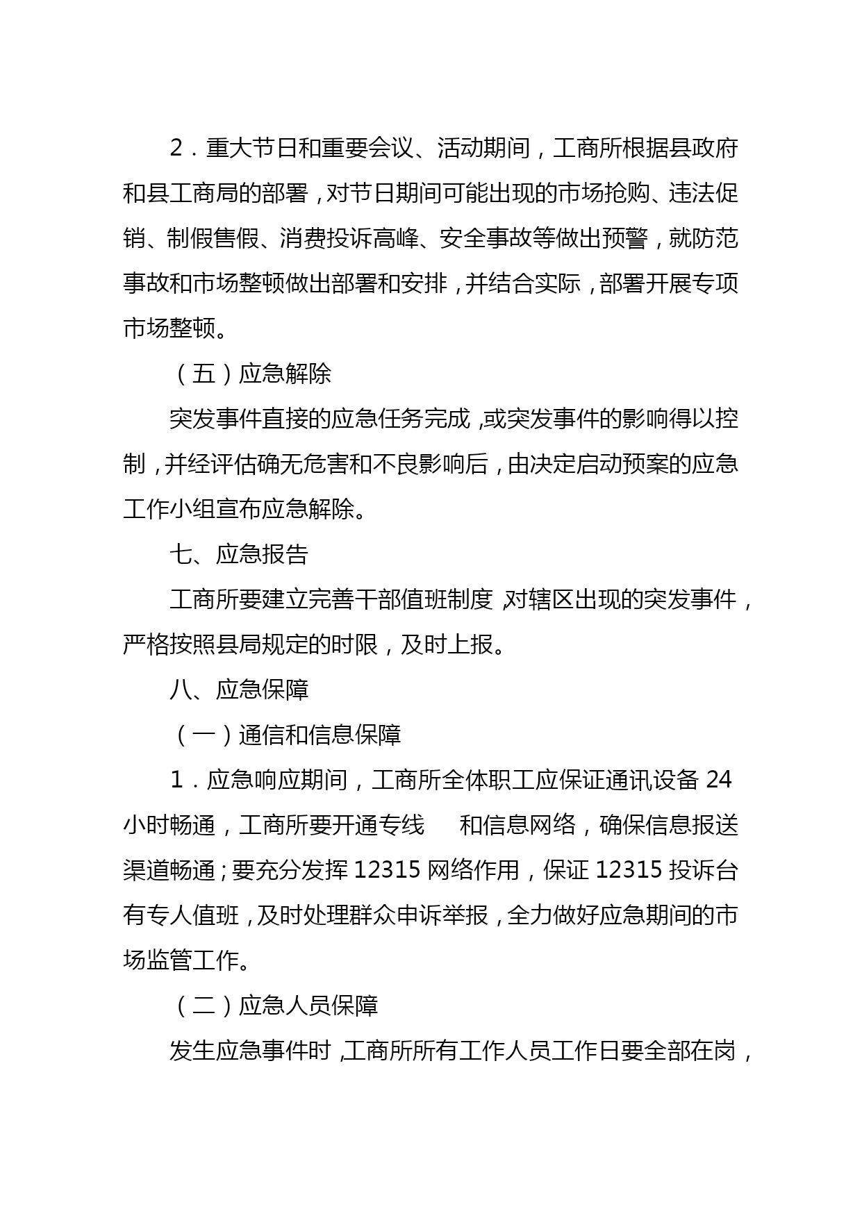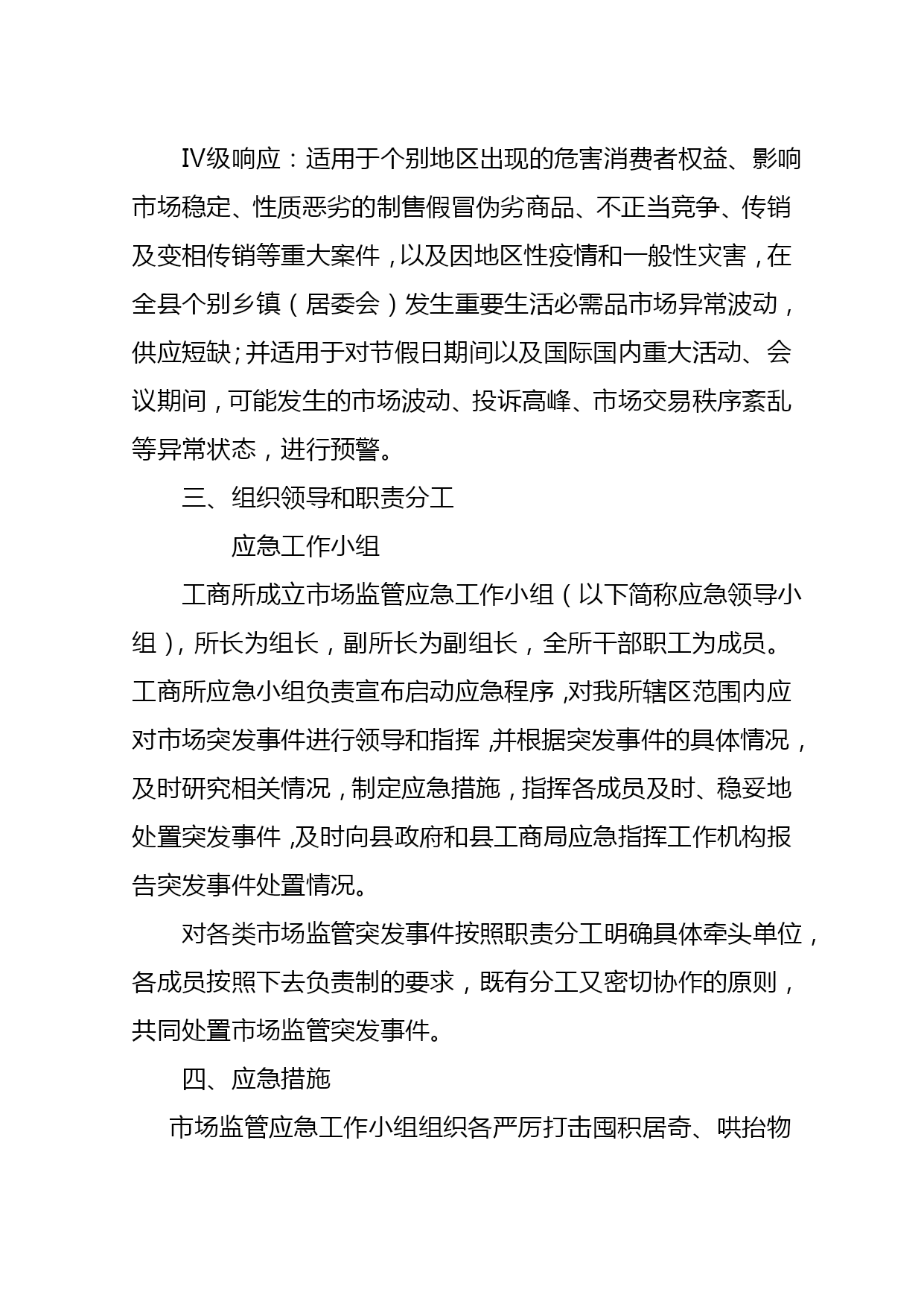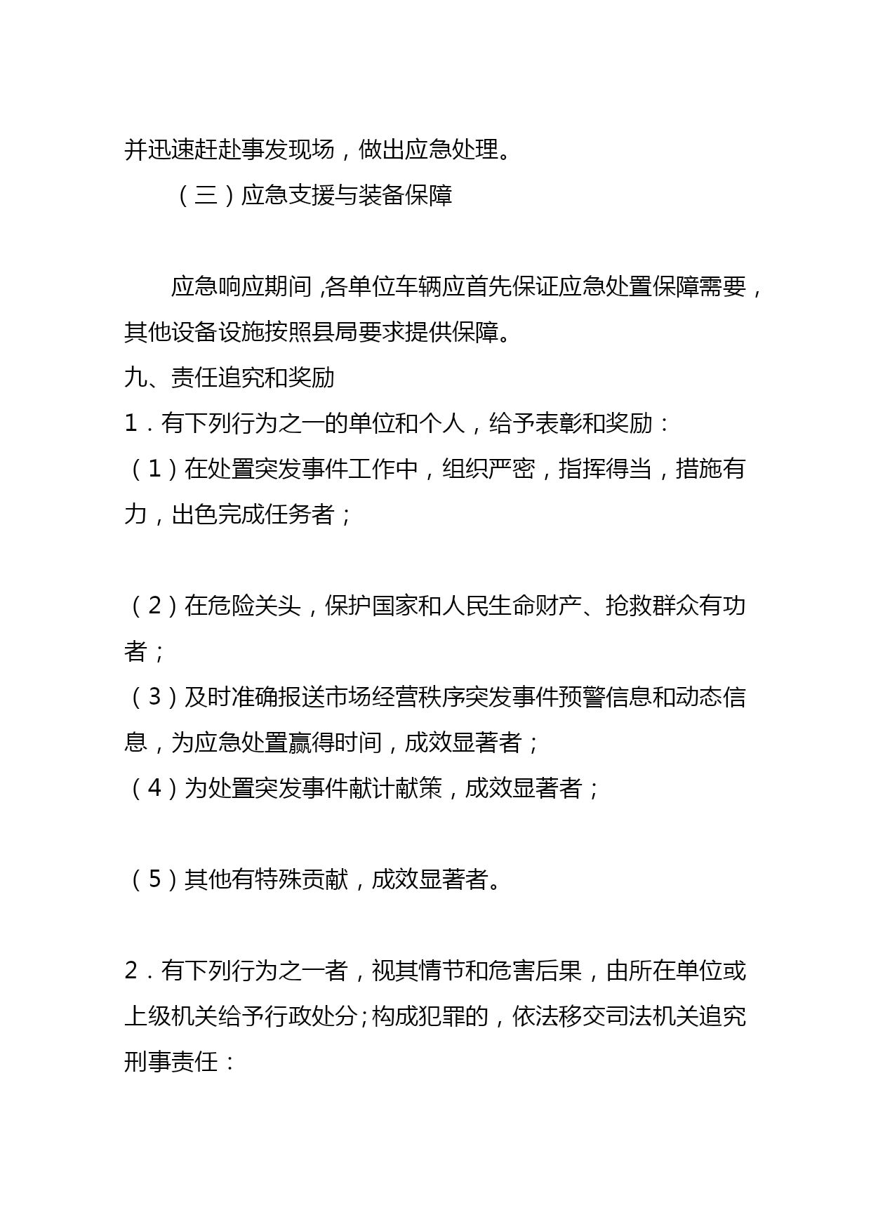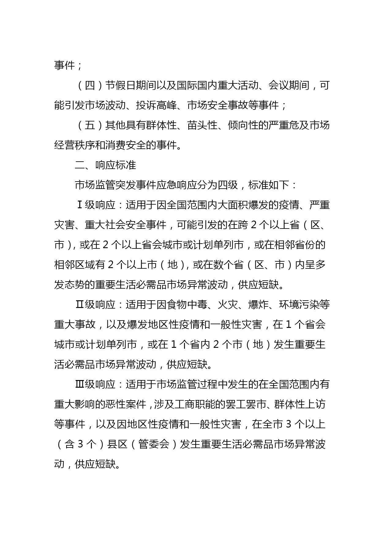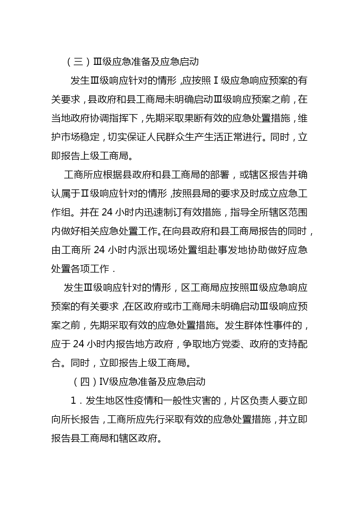 新城工商所市场监管应急预案(完整版)资料(可以直接使用,可编辑优秀版资料,欢迎下载)城口县工商局新城工商所市场监管应急预案为及时有效处置突发性的市场波动,根据城口县工商局《关于印发城口县工商系统市场监管应急预案的通知》和相关文件精神,结合我所工作实际,特制定本预案。一、适用范围本预案适用于我所辖区范围内因重大突发事件引起的市场波动,以及严重危害人民群众消费权益和经济秩序稳定的紧急情况。主要包括:(一)因严重自然灾害(如地震、地质灾害、洪涝、台风等)、重大疫情(如非典、禽流感等)、重大事故(如食物中毒、火灾、爆炸、环境污染等)、重大社会安全事件(如恐怖袭击、地方戒严、局部战争等)或人为因素,可能引发的区域性、行业性或大范围的商品市场价格暴涨、商品奇缺、居民抢购等市场异常波动;(二)市场监管过程中发生的在全国、全省、全市及全县范围内有重大影响的危害消费者权益、影响市场稳定、性质恶劣的制售假冒伪劣商品、无照经营、不正当竞争、传销及变相传销等重大、恶性案件;(三)涉及工商职能范围处置的罢工罢市、群体性上访等事件;(四)节假日期间以及国际国内重大活动、会议期间,可能引发市场波动、投诉高峰、市场安全事故等事件;(五)其他具有群体性、苗头性、倾向性的严重危及市场经营秩序和消费安全的事件。二、响应标准市场监管突发事件应急响应分为四级,标准如下:Ⅰ级响应:适用于因全国范围内大面积爆发的疫情、严重灾害、重大社会安全事件,可能引发的在跨2个以上省(区、市),或在2个以上省会城市或计划单列市,或在相邻省份的相邻区域有2个以上市(地),或在数个省(区、市)内呈多发态势的重要生活必需品市场异常波动,供应短缺。Ⅱ级响应:适用于因食物中毒、火灾、爆炸、环境污染等重大事故,以及爆发地区性疫情和一般性灾害,在1个省会城市或计划单列市,或在1个省内2个市(地)发生重要生活必需品市场异常波动,供应短缺。Ⅲ级响应:适用于市场监管过程中发生的在全国范围内有重大影响的恶性案件,涉及工商职能的罢工罢市、群体性上访等事件,以及因地区性疫情和一般性灾害,在全市3个以上(含3个)县区(管委会)发生重要生活必需品市场异常波动,供应短缺。Ⅳ级响应:适用于个别地区出现的危害消费者权益、影响市场稳定、性质恶劣的制售假冒伪劣商品、不正当竞争、传销及变相传销等重大案件,以及因地区性疫情和一般性灾害,在全县个别乡镇(居委会)发生重要生活必需品市场异常波动,供应短缺;并适用于对节假日期间以及国际国内重大活动、会议期间,可能发生的市场波动、投诉高峰、市场交易秩序紊乱等异常状态,进行预警。三、组织领导和职责分工应急工作小组工商所成立市场监管应急工作小组(以下简称应急领导小组),所长为组长,副所长为副组长,全所干部职工为成员。工商所应急小组负责宣布启动应急程序,对我所辖区范围内应对市场突发事件进行领导和指挥,并根据突发事件的具体情况,及时研究相关情况,制定应急措施,指挥各成员及时、稳妥地处置突发事件,及时向县政府和县工商局应急指挥工作机构报告突发事件处置情况。对各类市场监管突发事件按照职责分工明确具体牵头单位,各成员按照下去负责制的要求,既有分工又密切协作的原则,共同处置市场监管突发事件。四、应急措施市场监管应急工作小组组织各严厉打击囤积居奇、哄抬物价、倒买倒卖等市场违法行为,维护市场稳定,切实保证人民群众生产生活的正常进行。(一)对恶性、大要案件的查处。要迅速采取有效措施,查清事实,摸清根源,依法查处,消除影响。对恶性案件中涉及的有毒有害食品、化妆品、建筑装饰装修材料,可能出现危害人身财产安全的;由于农资质量问题可能造成农业大面积减产或绝收的,要及时做出预警,防止损失扩大。同时,迅速部署精干执法力量,开展市场专项清理,追根溯源,严防死守,防止危害事故发生。(二)对群体性事件的处置。对出现涉及工商职能的停市罢市、群体上访等情况,要及时稳定群众情绪、控制事态发展。要认真调查事发原因,积极与群众进行沟通,解决群众的实际困难,防止事态扩大,并及时报告当地政府,争取当地党委、政府的支持配合。五、预测、预警(一)预测要加强对职能范围内可能引发市场监管突发事件相关信息、资料的搜集、整理和分析,一旦确认可能引发应急响应的突发事件的倾向性、苗头性问题或前兆信息时,应立即报告局应急领导小组,同时提出有效的防范意见建议,由局应急领导小组决定是否发布预警和做好应急响应的准备。(二)预警对于市场监管中可能出现的问题,以及突发事件可能引发的市场波动,工商所要根据局应急领导小组的部署,及时发布预警。1.根据县政府和县工商局的部署,在元旦、春节、“五一”、“十一”等重要节日期间,至少提前一周发布预警通知,部署全所辖区范围内做好节日市场监管工作,做好应对可能出现的突发事